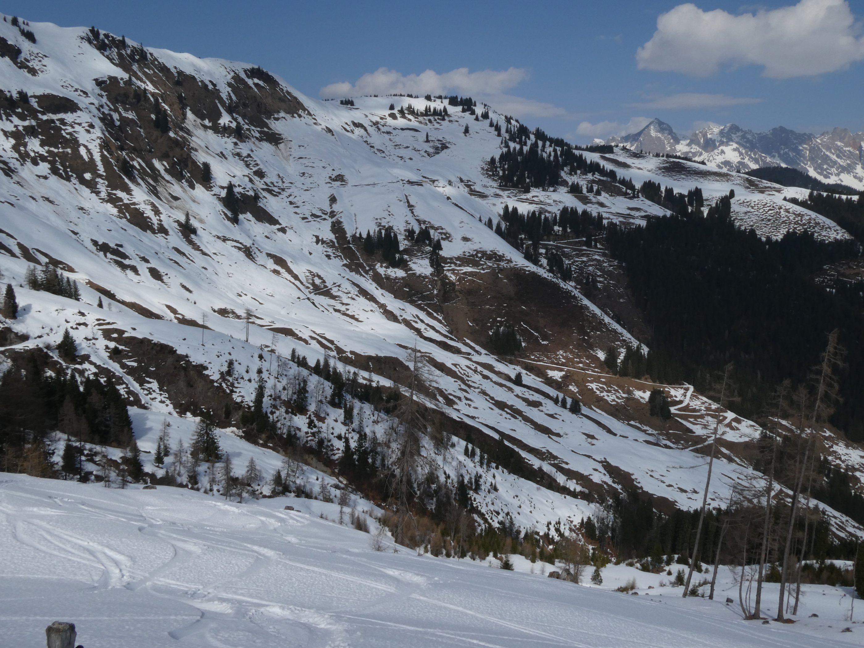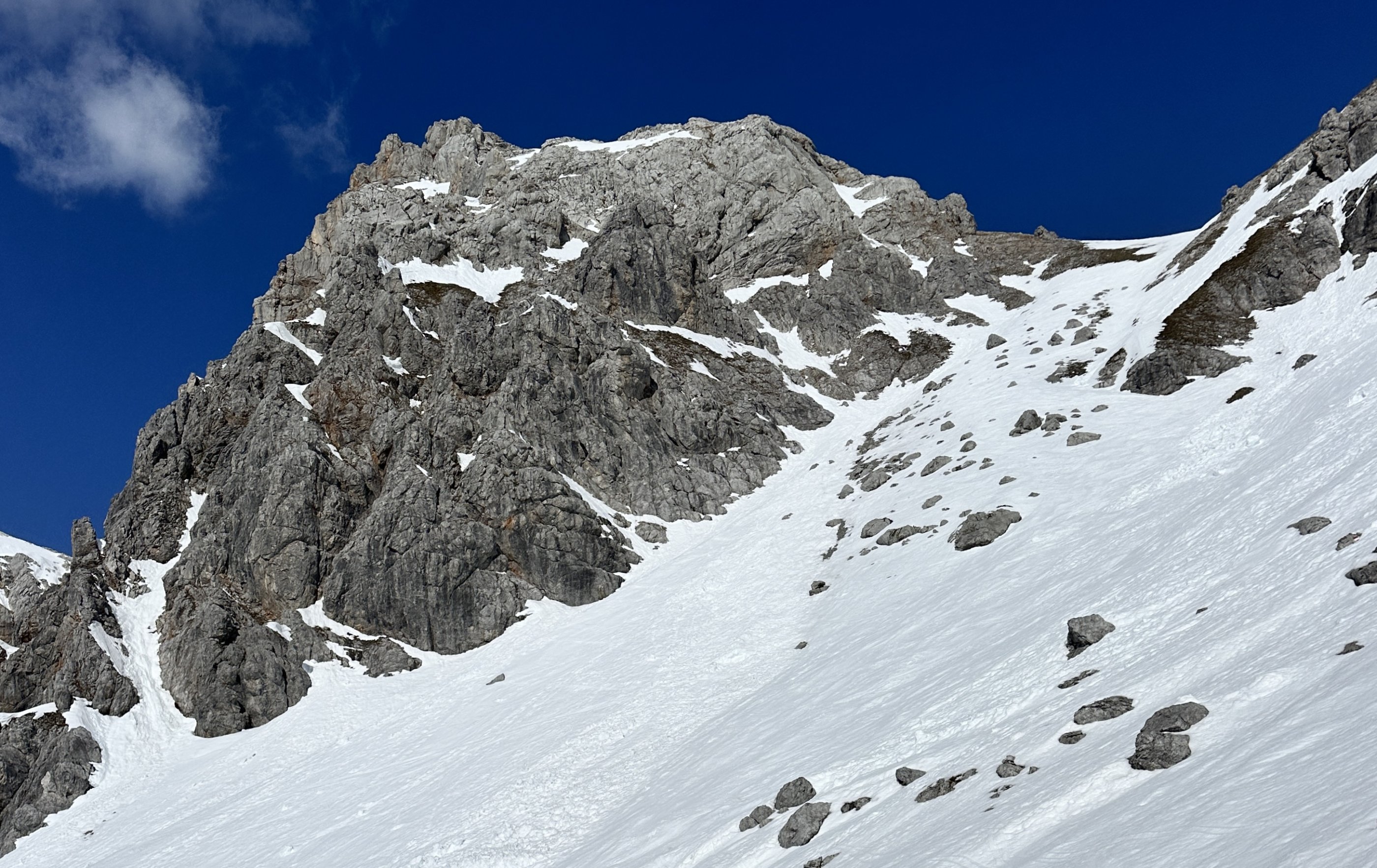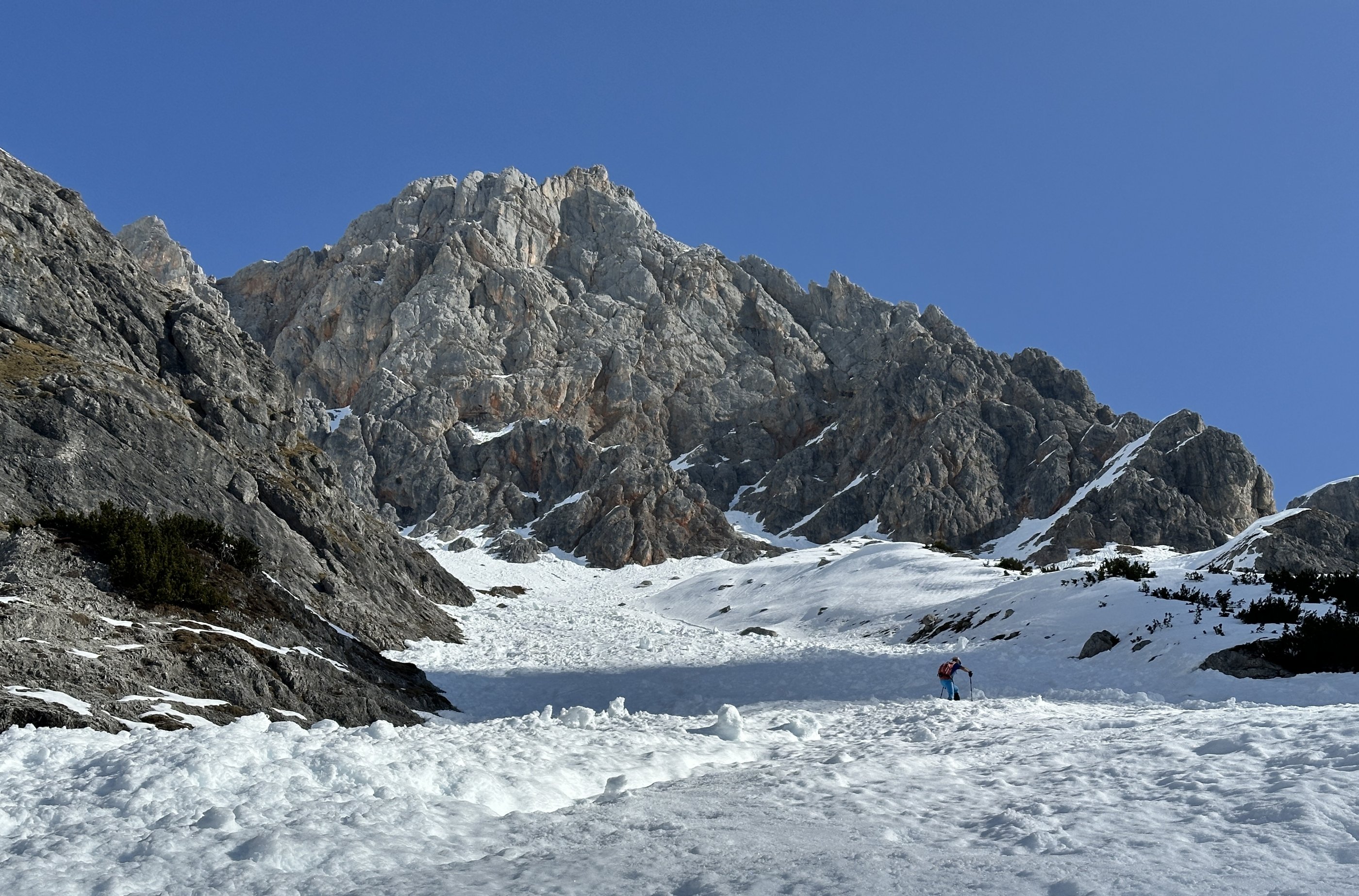 Insgesamt sehr wenig Schnee, auch weit oben unter der Scharte schauen viele Felsen heraus, - weiter unten die Latschen sowieso.
