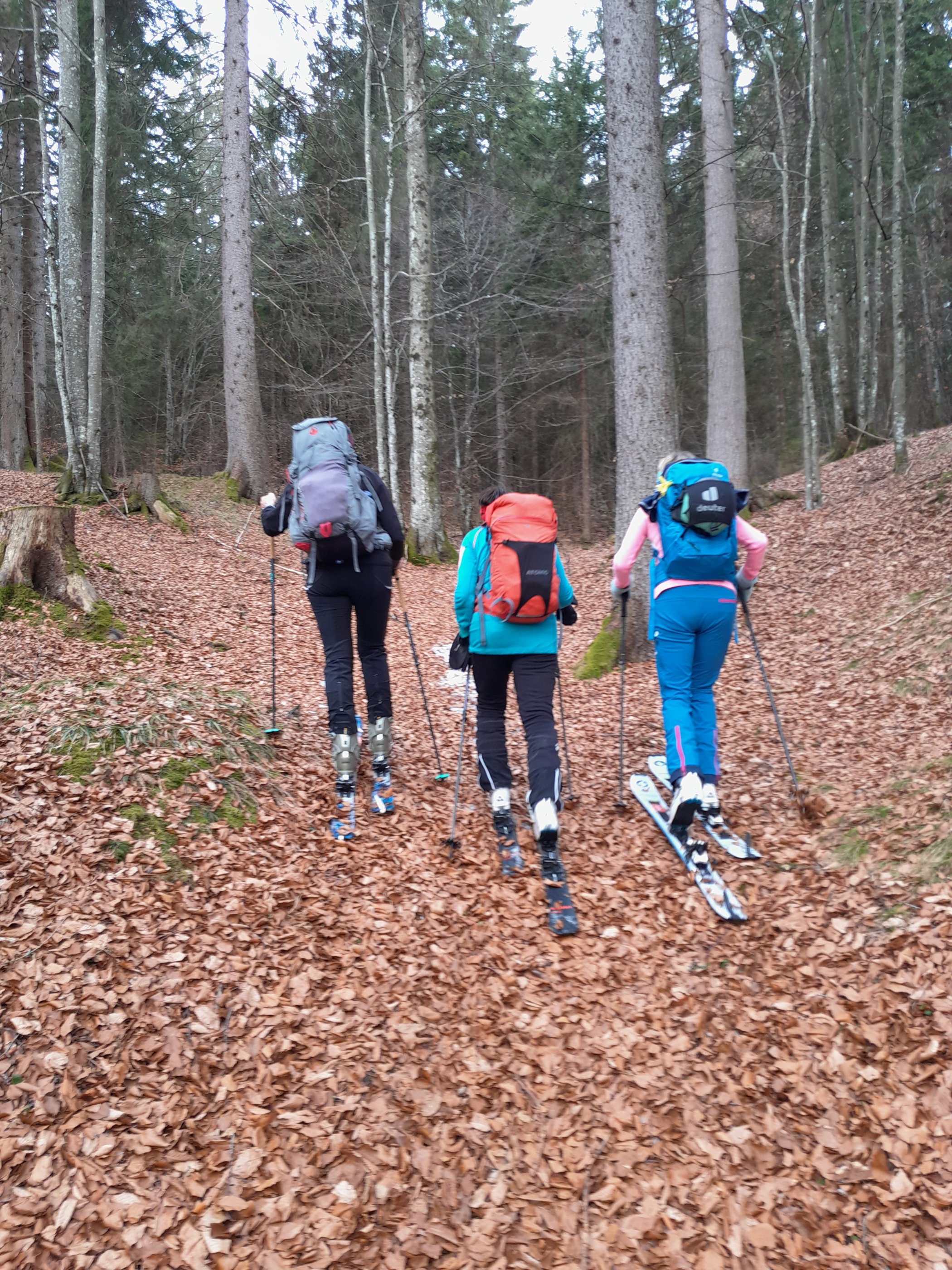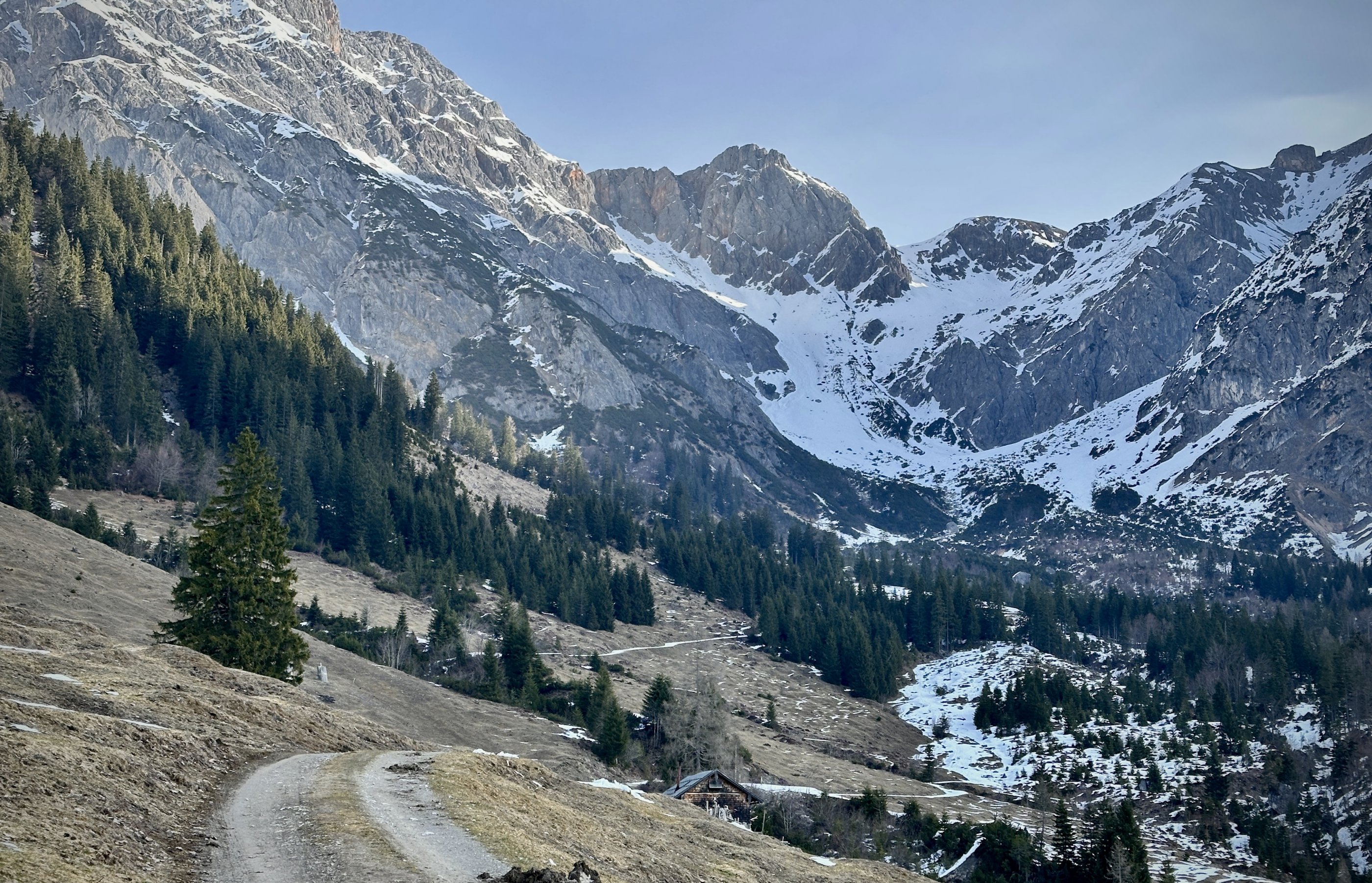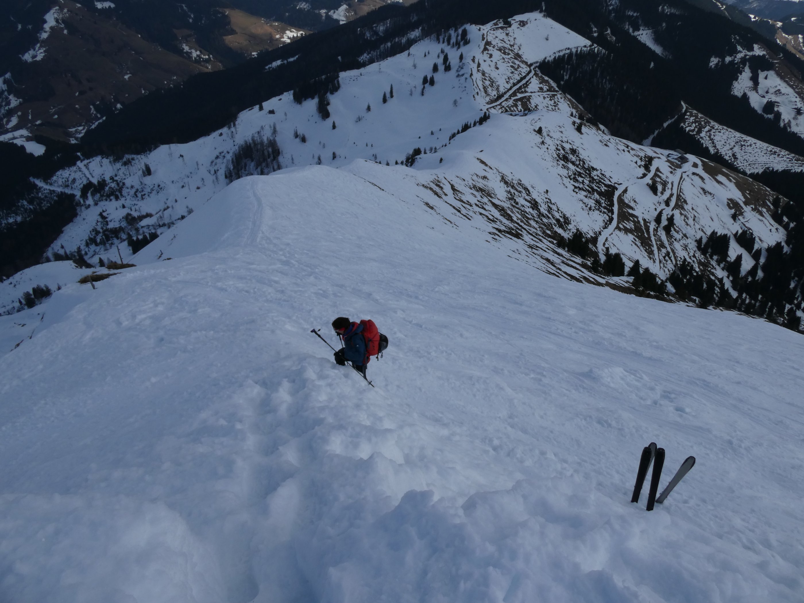 Die Enzenalm ist schon weitgehend aper, bis zur Jagdhütte müssen die Ski getragen werden. Hart gefroren ist es im Schatten hinauf, erst oben unter der Scharte kommt die Sonne.