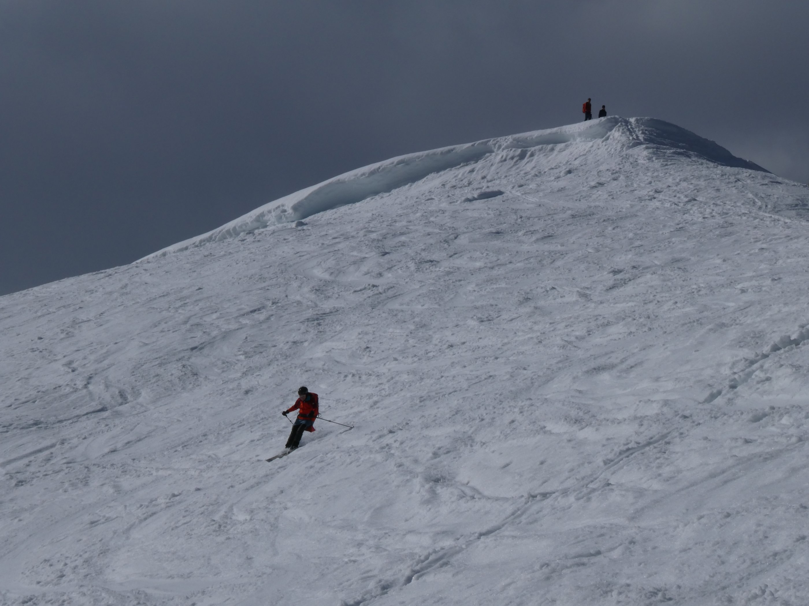 Der Gipfelhang ist zerfurcht und schlecht zu fahren, aber ab der Scharte gibt es (mittags zwischen 12 und 1) zunächst weichen Sulz und im bald wunderschön fahrbaren Firn geht es bis ganz hinunter zur Enzenalm Jagdhütte. Ab hier ist öfter mal Grasskifahren angesagt, wenn man noch bis zur Loipe hinab auf Ski bleiben will!