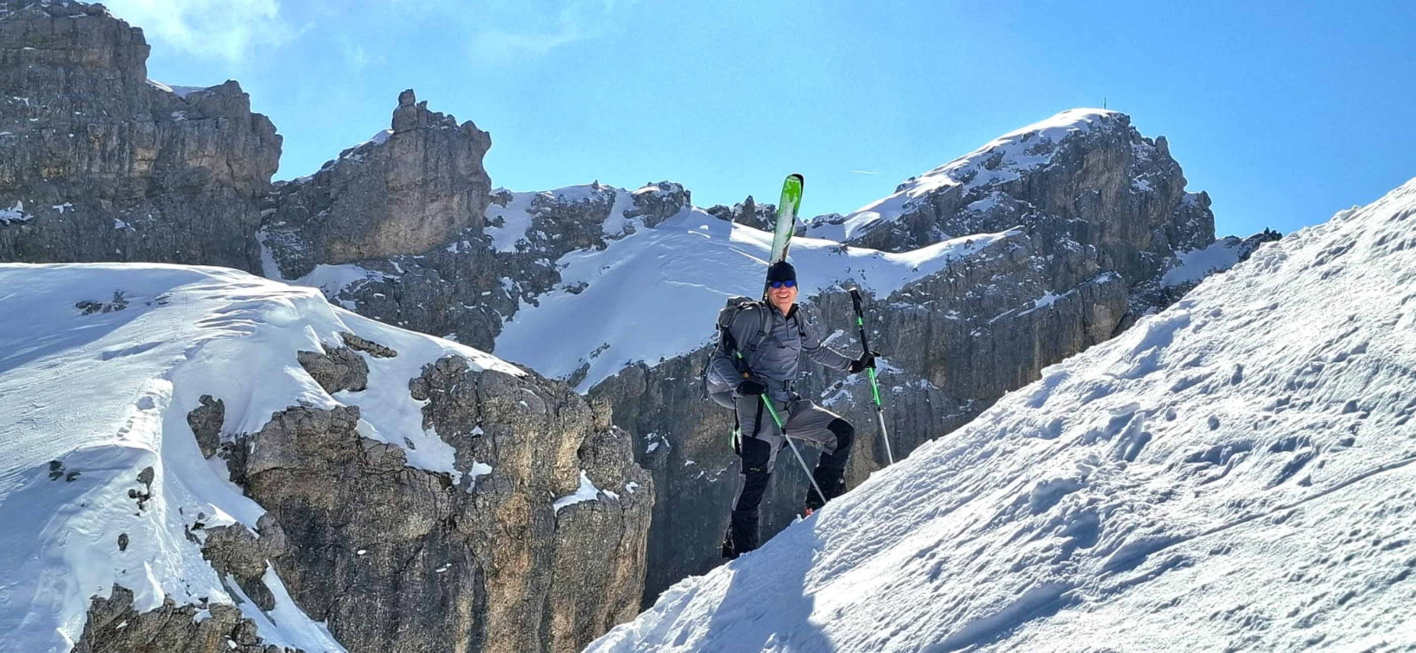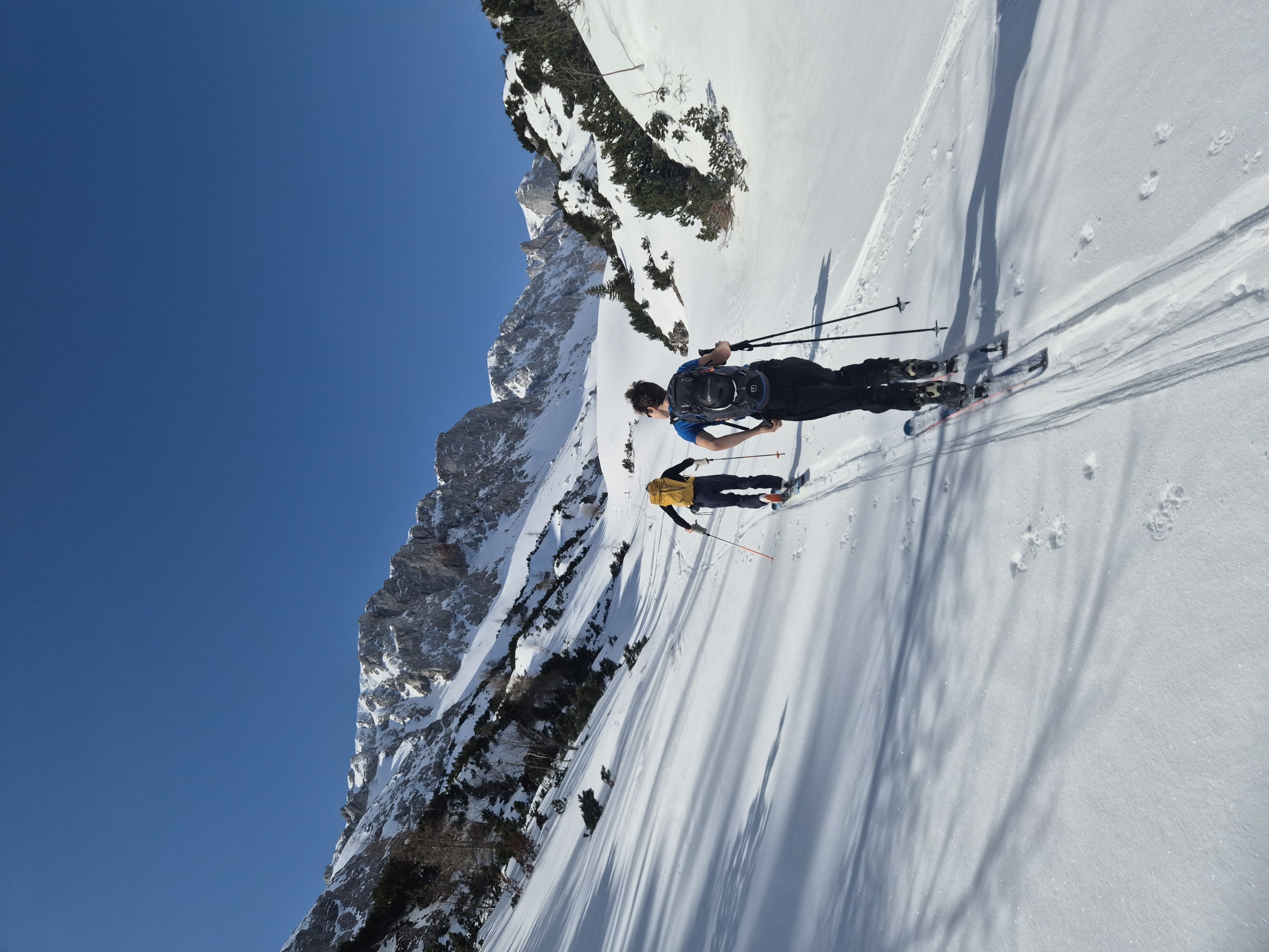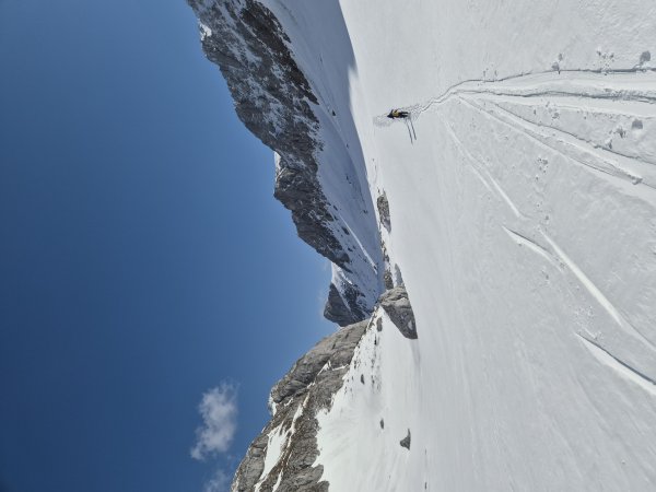 Unser Plan ging voll auf: Etwa 15–20 cm gut gesetzter Pulver auf tragfähiger Unterlage. Hänge, die am Vortag bereits zu viel Sonne abbekommen hatten, waren – besonders bei ungünstiger Ausrichtung – schon verharscht und brüchig.