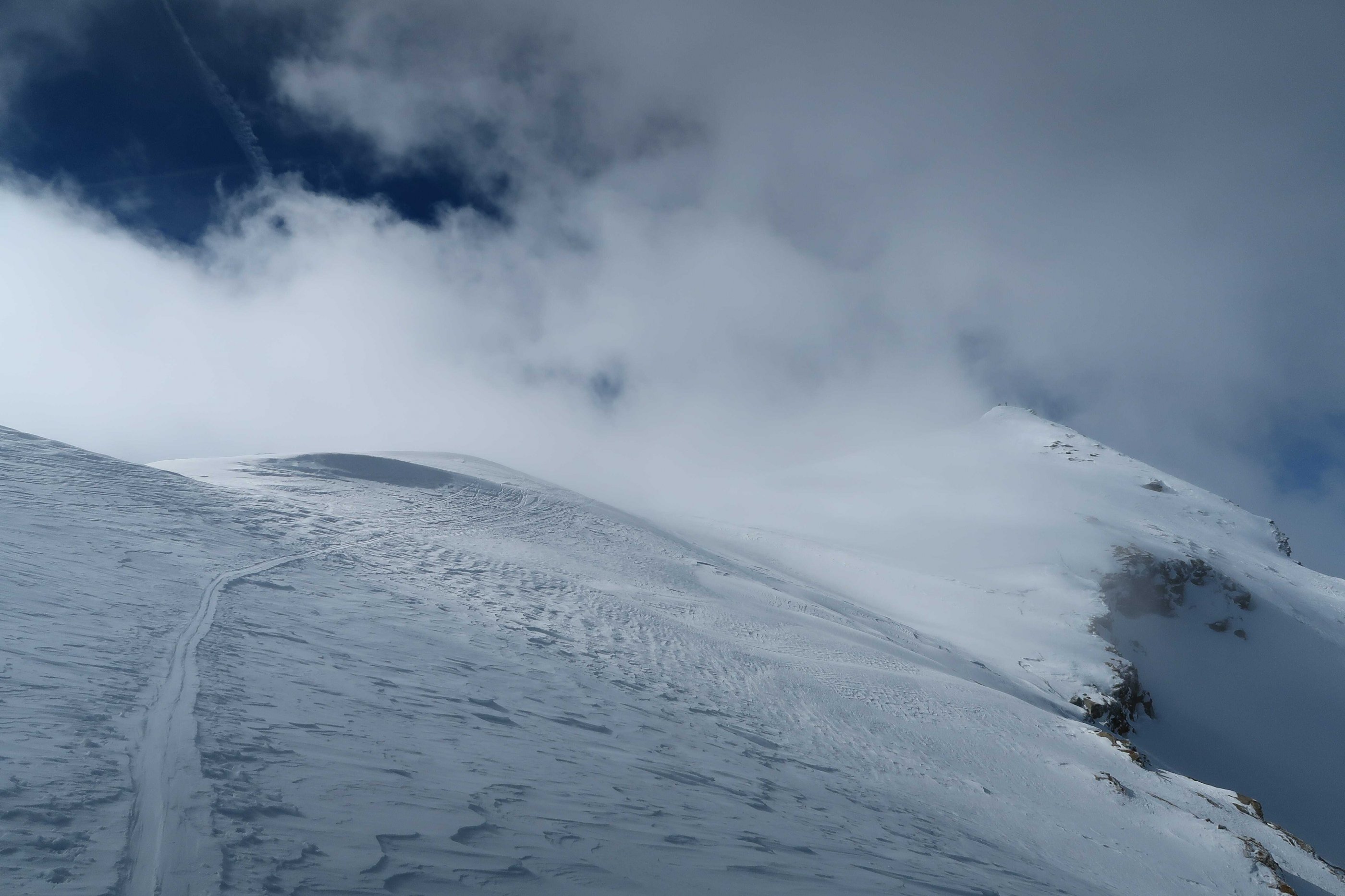 Leider hat sich der Wetterbericht wieder mal völlig geirrt. In der Nacht hat es nicht richtig aufgeklart (wie angekündigt), am Morgen waren schon lockere Quellwolken am Himmel, die sich am Vormittag noch verdichteten. Dadurch war die Schneedecke unter 2000m nicht richtig durchgefroren. Beim Anstieg wechselten Sonnenfenster mit Abschattung. Der angesagte, lebhafte Wind am Gipfelrücken traf zu. Am Gipfel wechselte sonnige Aussicht mit Quellwolken. Bei der Abfahrt wartete ich immer wieder Sonnenfenster ab, da bei Abschattung die Sicht (Kontrast) schlecht war. Unterhalb ca. 2500m wurde der Schnee dann firnig.