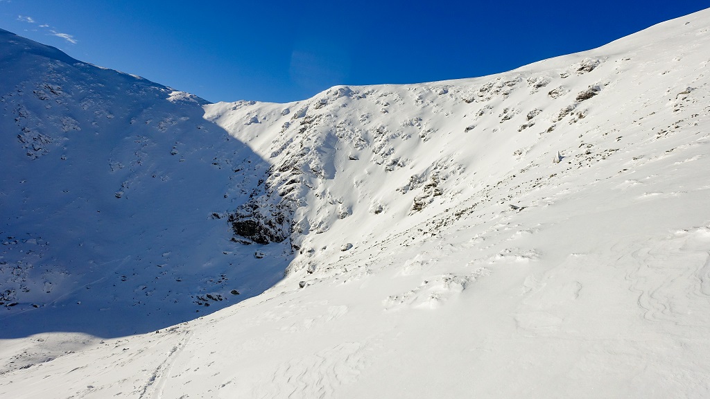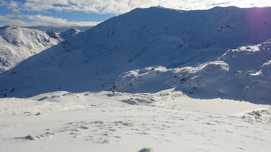 Aufstieg über sie Südflanke, Skidepot kurz unter dem Gipfel. Abfahrt wie Aufstieg bis in den Ochsenboden, dann nochmals angefellt und zum Sattel vom Schloserkogel aufgestiegen. Von dort Abfahrt zum Winterleitensee, Pulver!