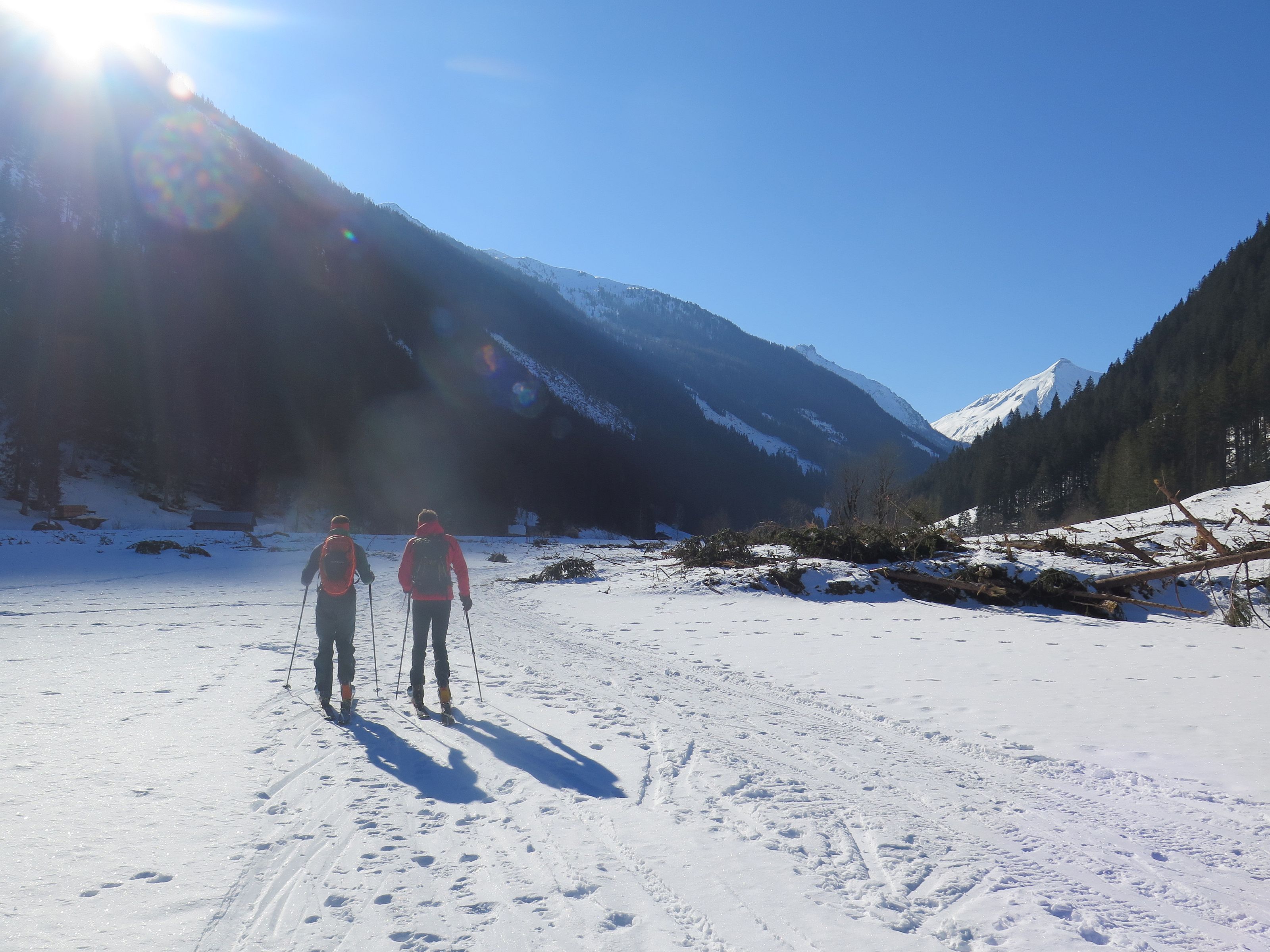 Aufstieg aus dem Preuneggtal. Sonniger, am Start noch recht kalter Wintertag.Gute Schneelage in den Schladmingern.