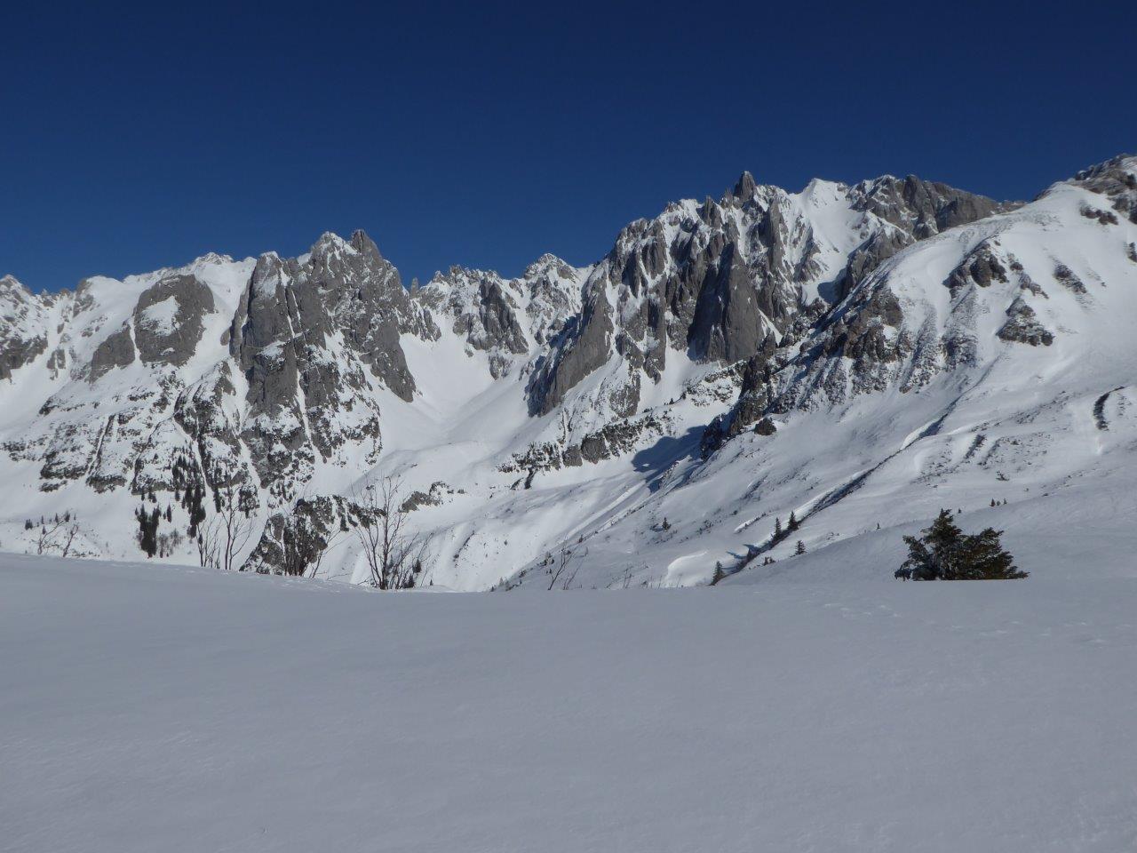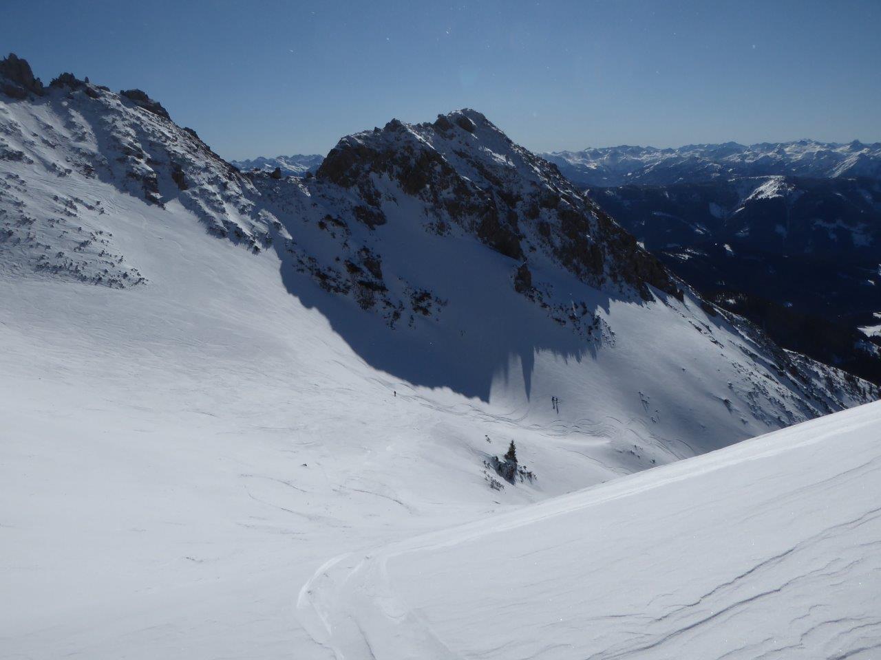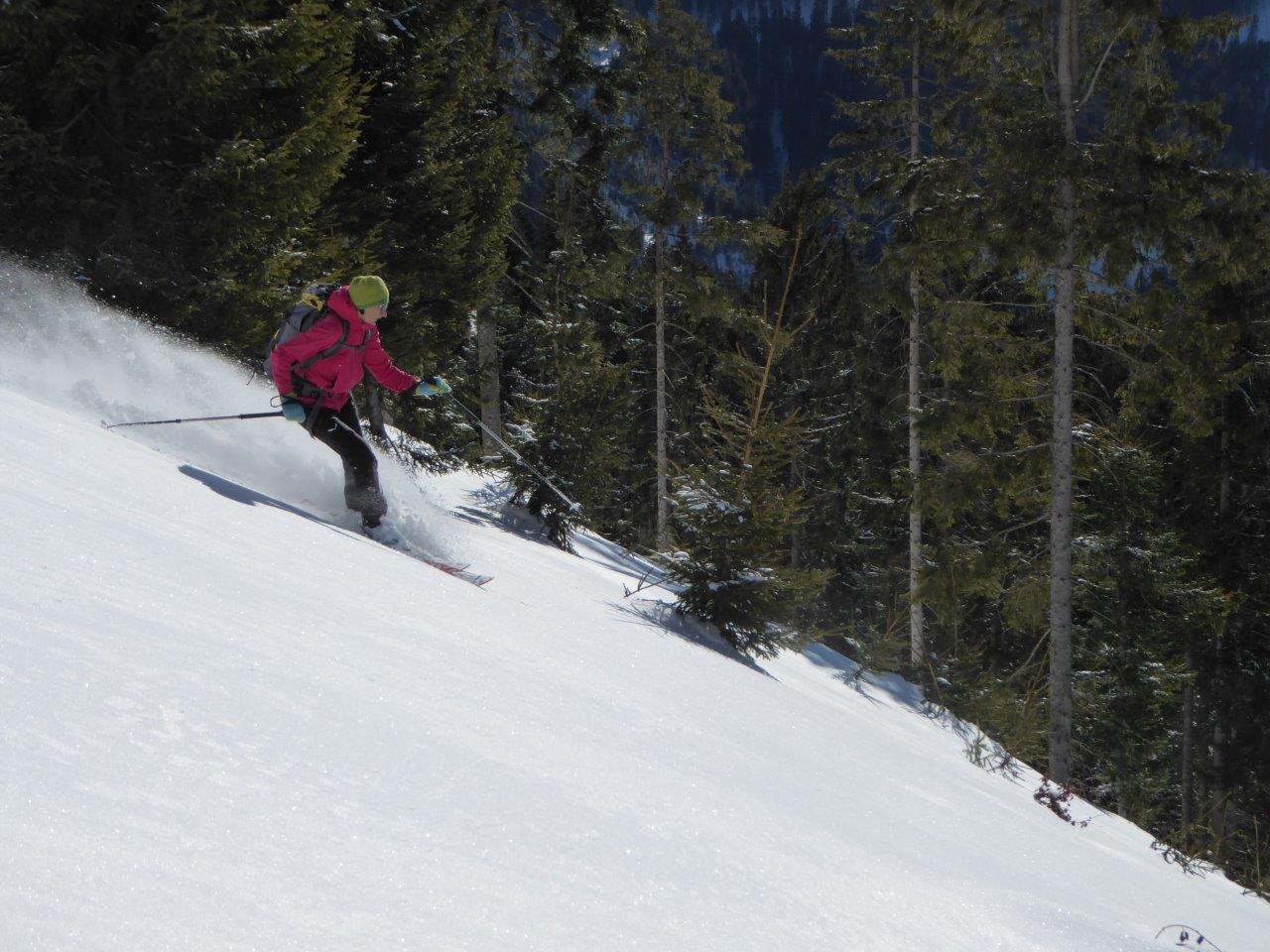 Heute wieder ein Klassiker - eindeutig, wenn um 9:30 schon 30 Autos am Parkplatz stehen. 15 cm Neuschnee sprechen für Spaß, die extremen Windfahnen auf der Bischofsmütze eher dagegen. Zunächst windstiller Aufstieg im Wald, darüber wurde es höchst ungemütlich, gefühlt wie im Windkanal kombiniert mit Schneekanonen. Den Gipfel sparen wir uns deshalb lieber und fahren gleich ins Sulzkar ab, das überraschenderweise noch kaum verspurt ist. Darin finden sich alle Arten von Pulver, alles gut bis super zu fahren, Platz genug für eigene Zöpfchen. Wird auch in den nächsten Tagen noch wunderbar gehen. Die Suzkarhüte ist bis auf den vorderen Teil völlig eingeweht, bietet aber Schutz vor dem Wind und lädt zu einer Pause ein. Danach nochmals anfellen und Aufstieg zum Losegg. Von dort dann tadellose Abfahrt bis zum Parkplatz.