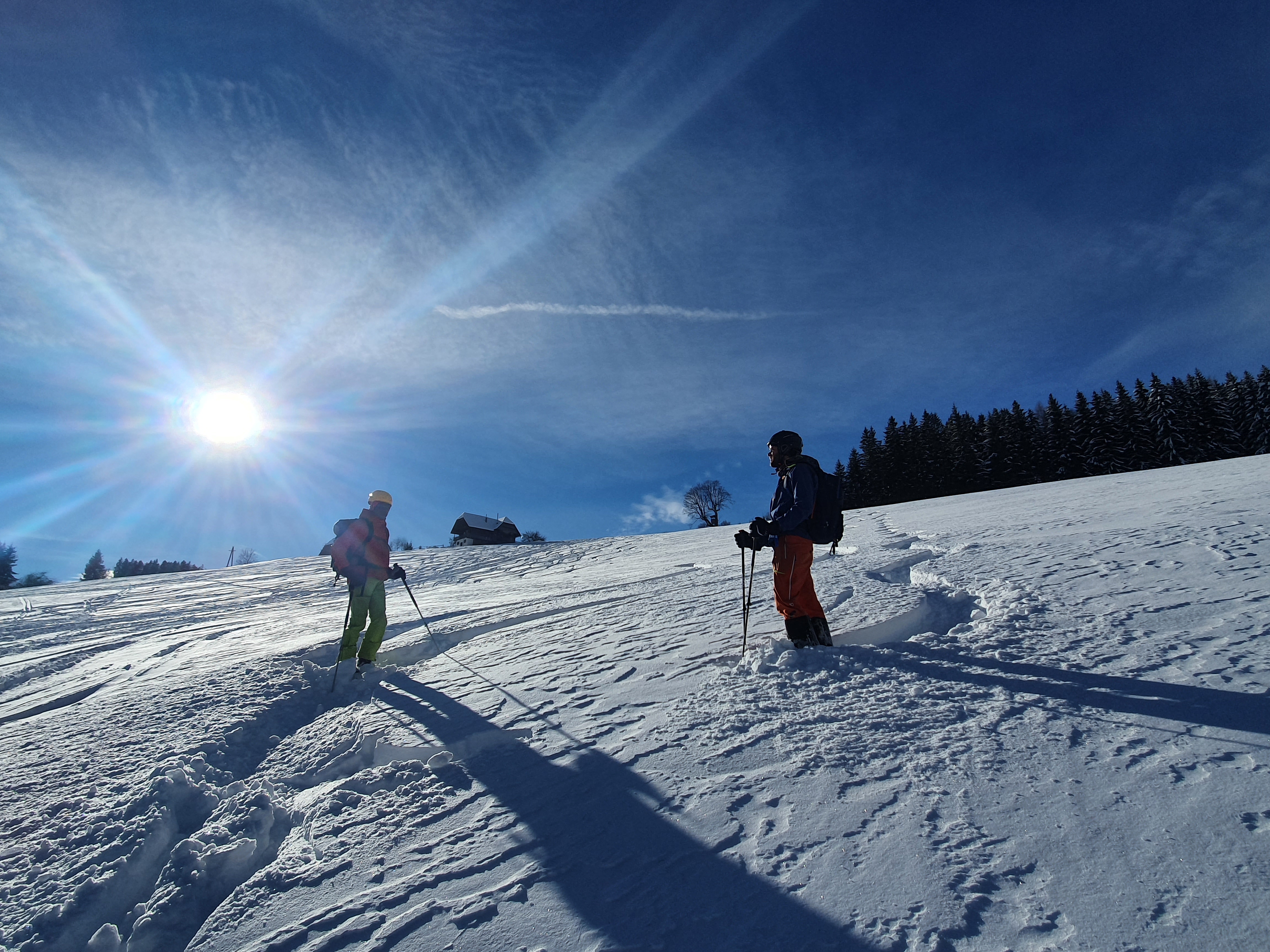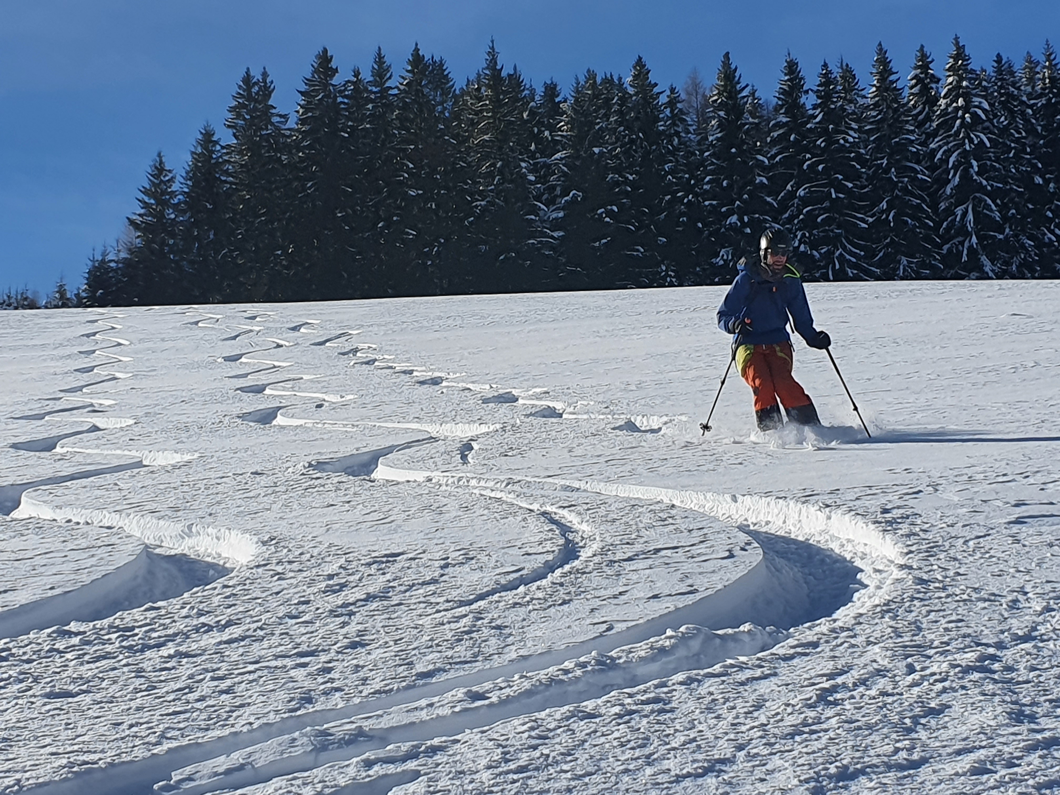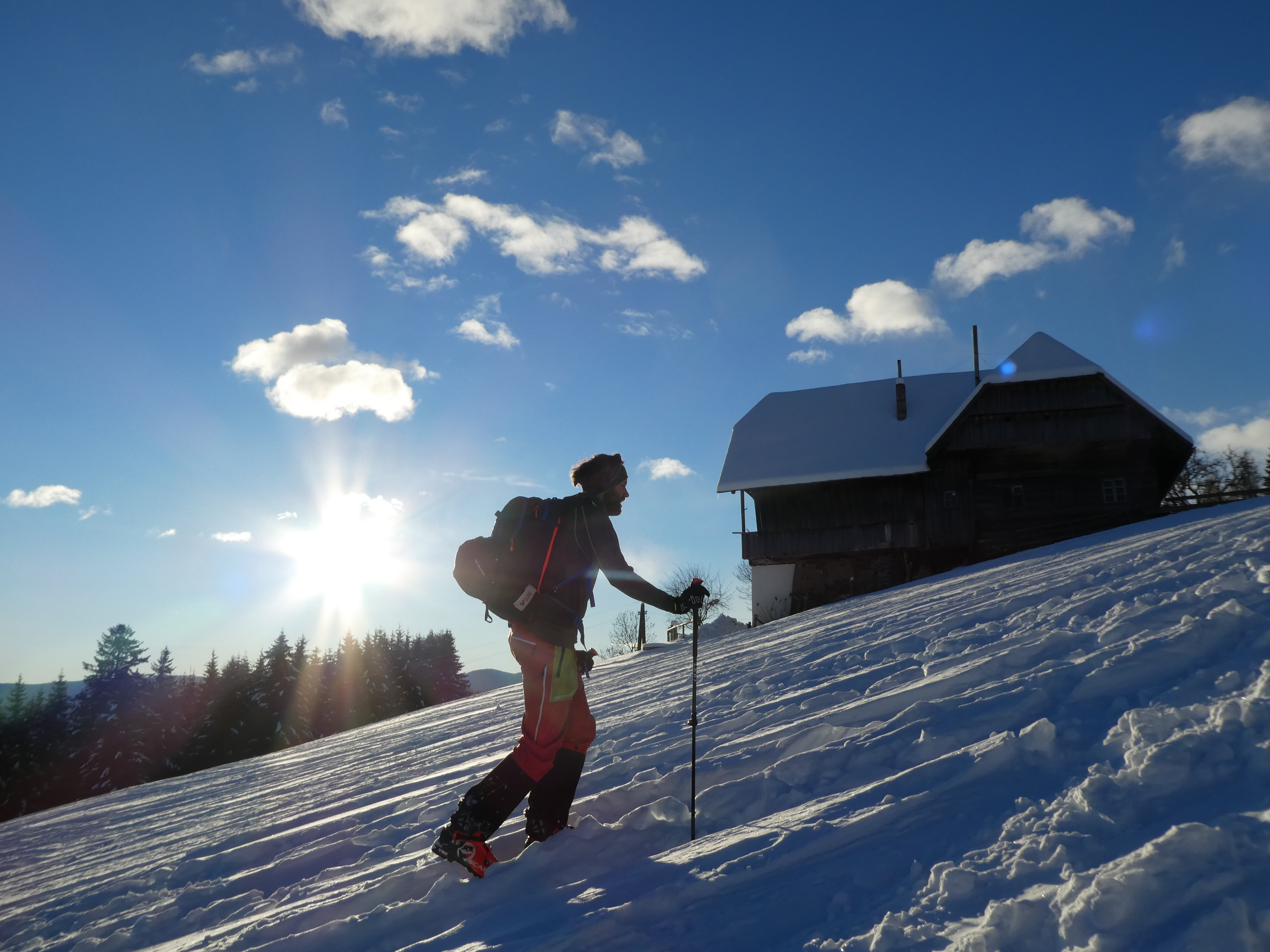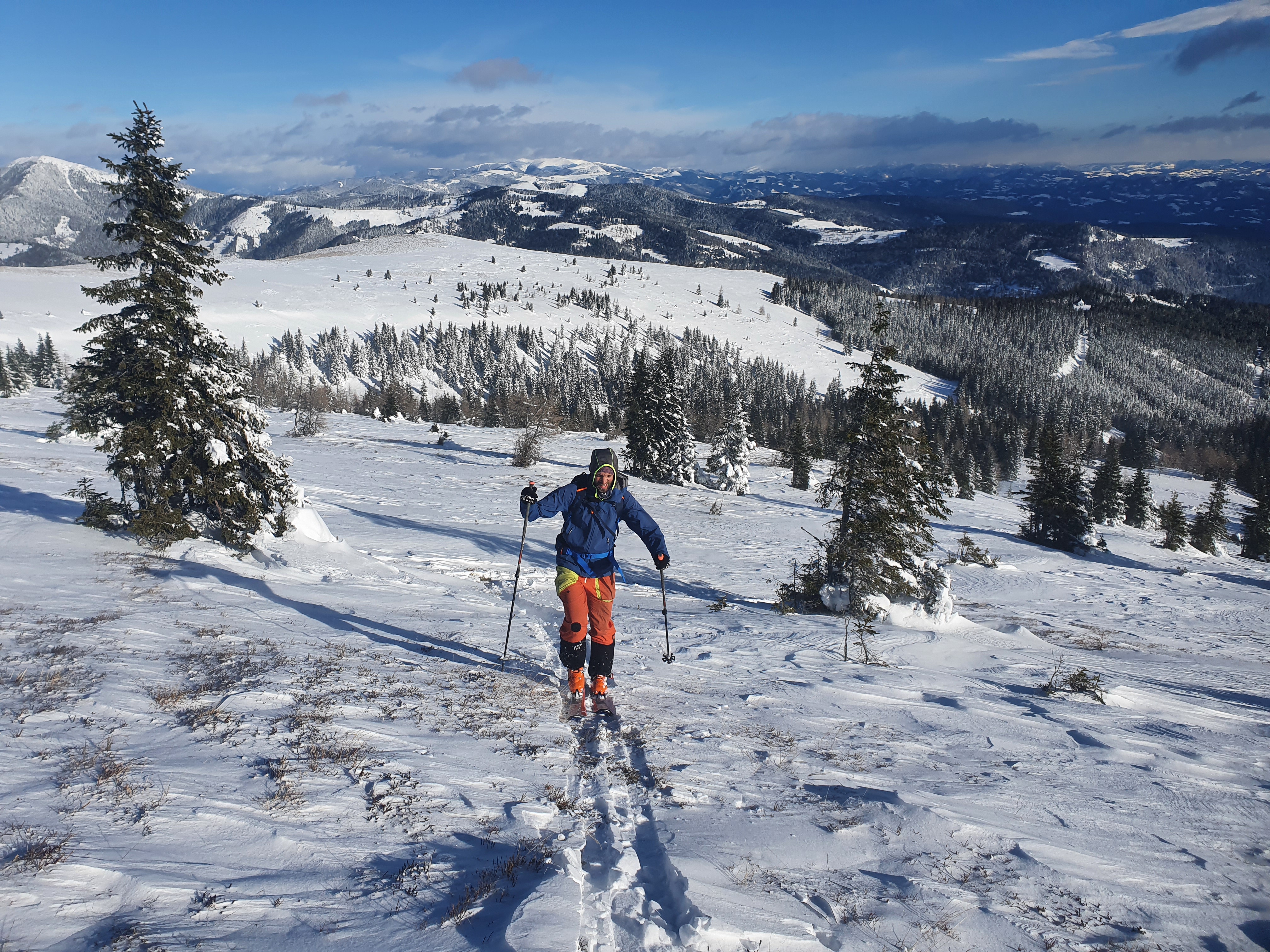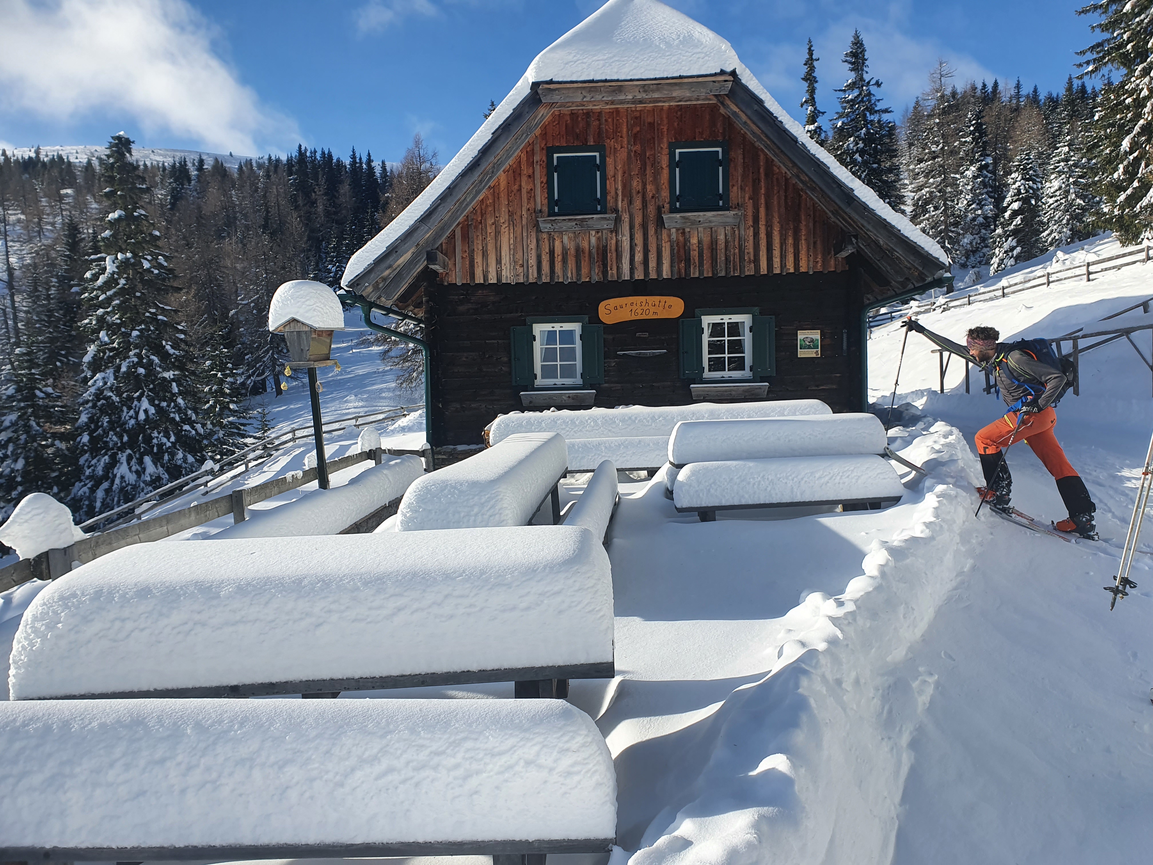 Nette Eingehtour ausgehend vom Spengerwirt über Franzlhütte - Bartholmäkirche - Saureishütte - auf die Hirschegger Alm; geplante Zwischenabfahrt in Richtung Lavanttal wegen Schneemangels und Sturm verworfen; kurzer Wiederanstieg und gleich auf Fellen zum Seinerkreuz (Markierung auf Karte). Das Abfahrtsvergnügen bis zur Baumgrenze überschaubar (Mix aus manchmal tragendem, oft brüchigem Windharsch und stellenweise grundlosem Lockerschnee). Lange Forstwegabfahrt OK, auch die Waldpassage oberhalb der Franzhütte steinfrei; die besten pulvrigen Abfahrtsmeter über die Wiesen vorbei am Gehöft Großofner (Achtung: 1 Stacheldrahtzaun ist noch nicht vollständig geöffnet!) zurück zum Ausgangspunkt, Dort gibt es auch in Zeiten des Lockdowns u.a. sehr gute Schnitzelsemmeln "TO GO" Mehr zur Tour in nächster Zeit unter www.schittertour.at