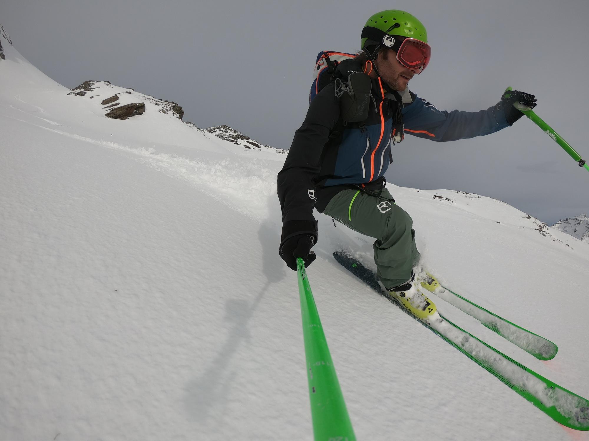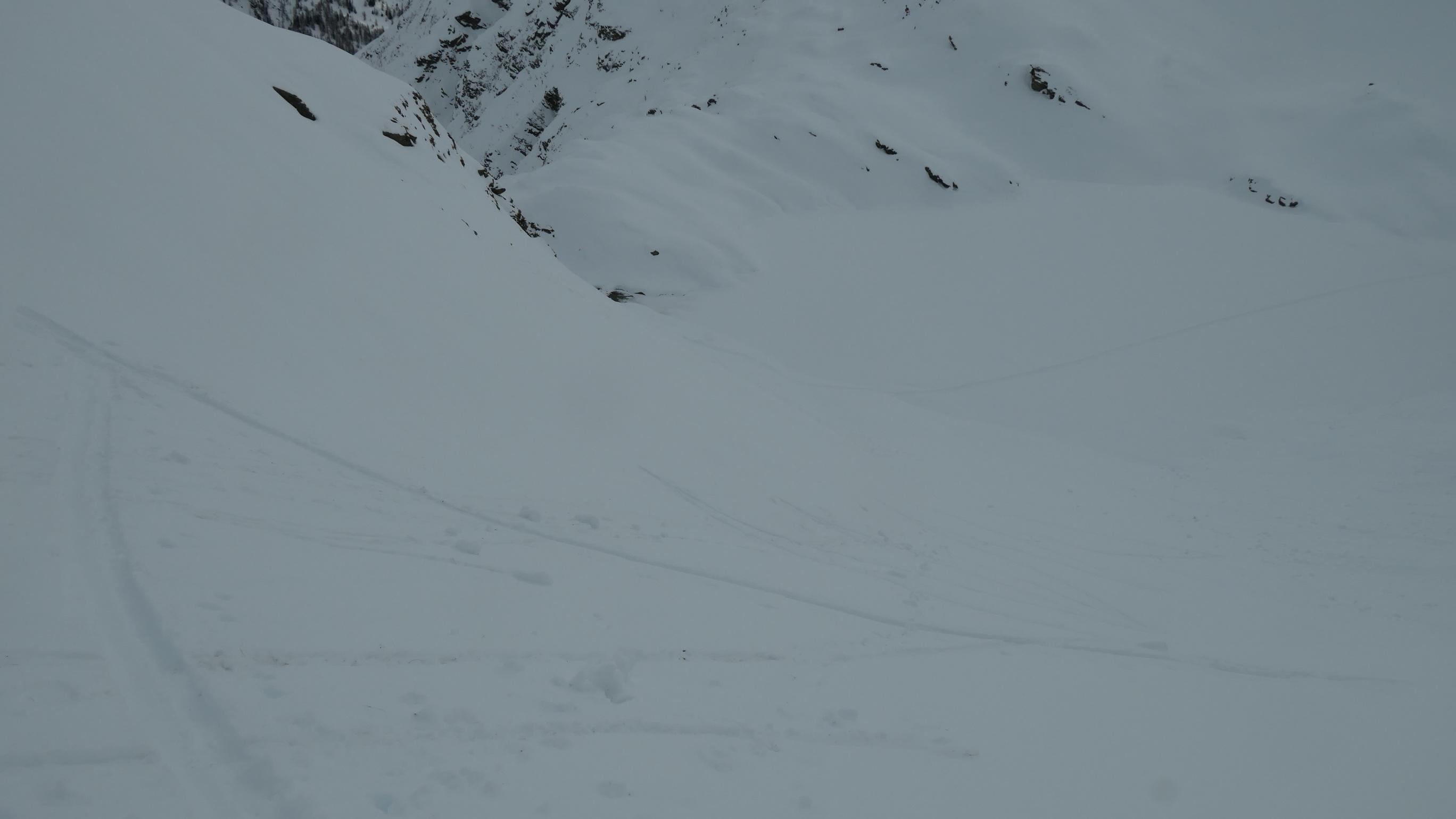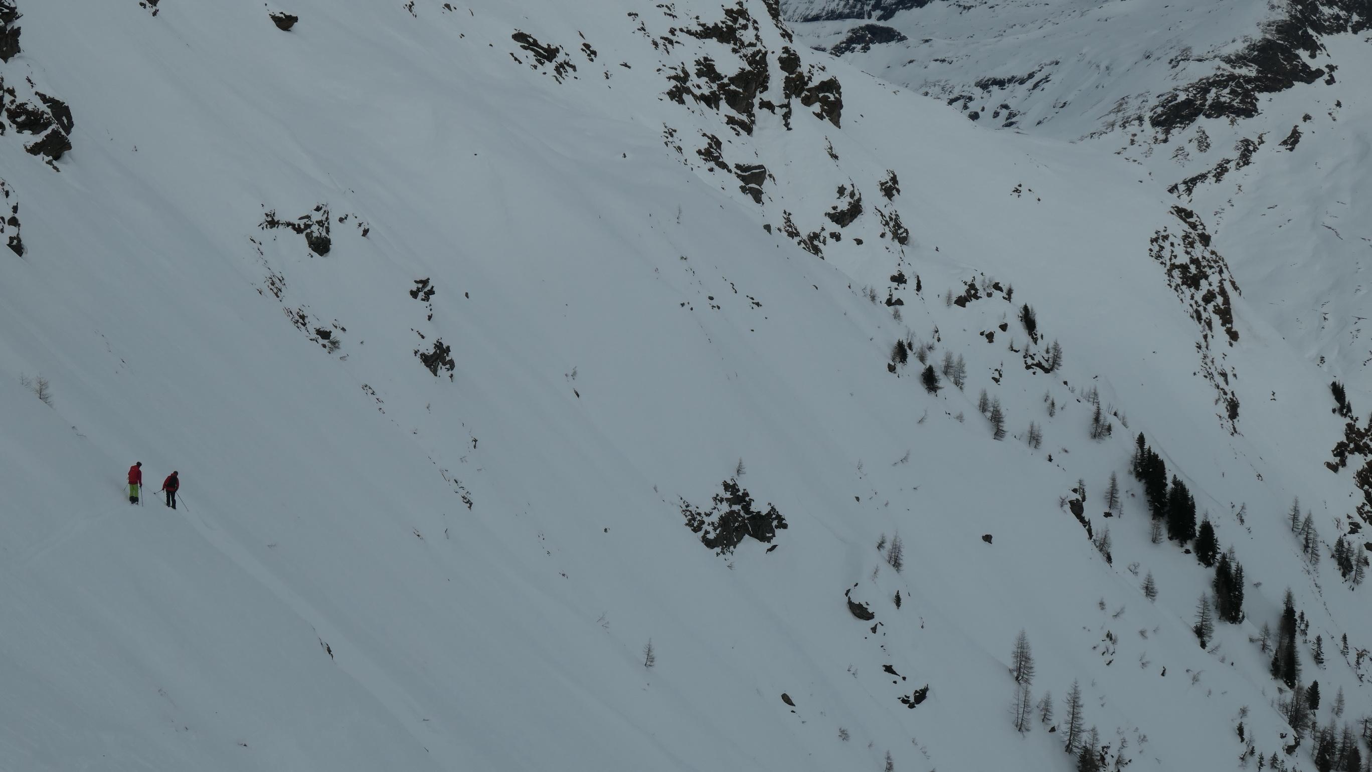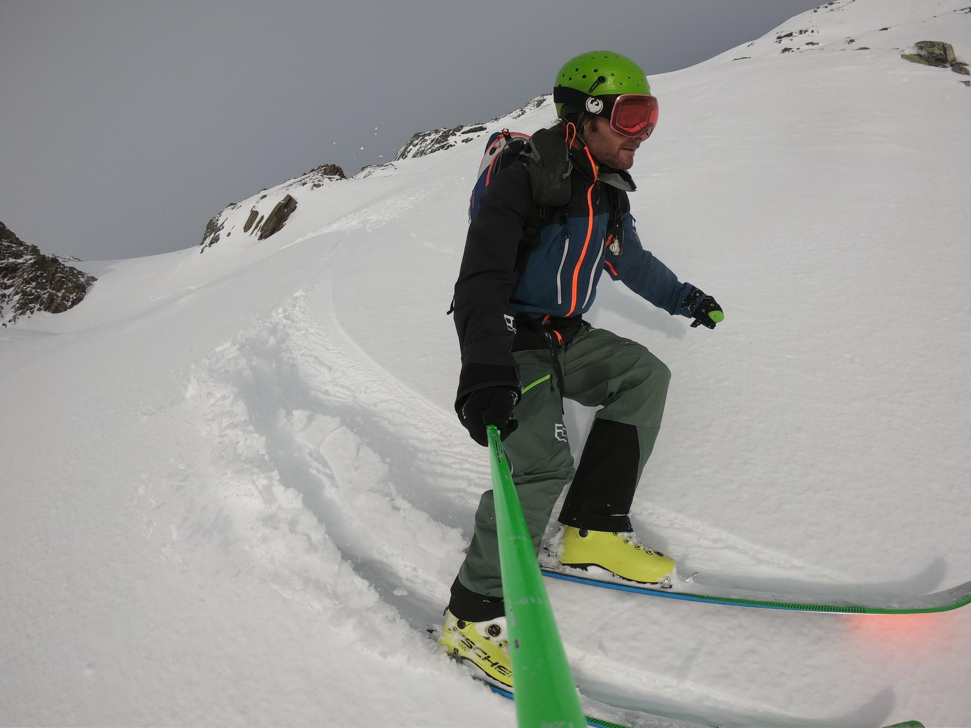 Aufgrund der ganzen Gefahrenzeichen haben wir dann auch unseren Plan von der Abfahrtsvariante verworfen und sind entlang der Aufstiegsspur abgefahren. Und auch hier haben wir noch jede Menge brauchbaren Schnee gefunden. Aufgrund der leichten Durchfeuchtung zwar nicht mehr so leicht wie bei den letzten Touren, allerdings immer noch gut fahrbar.