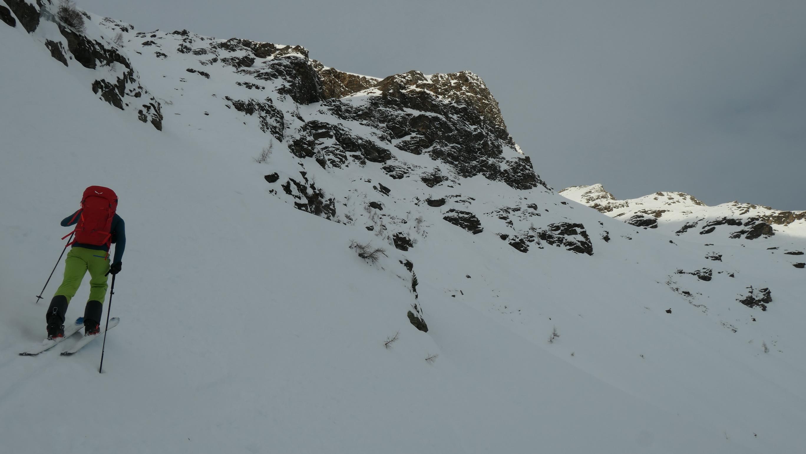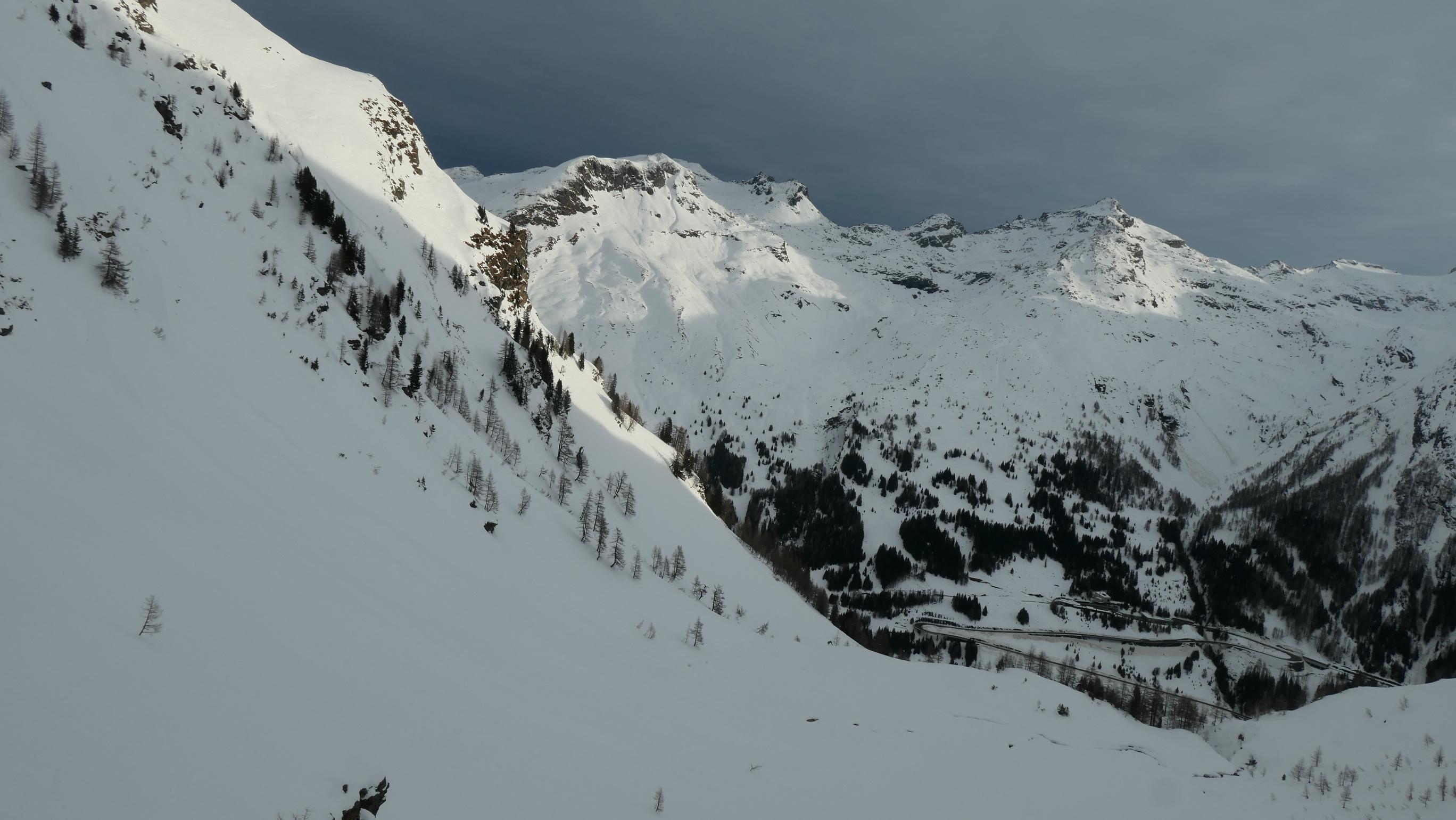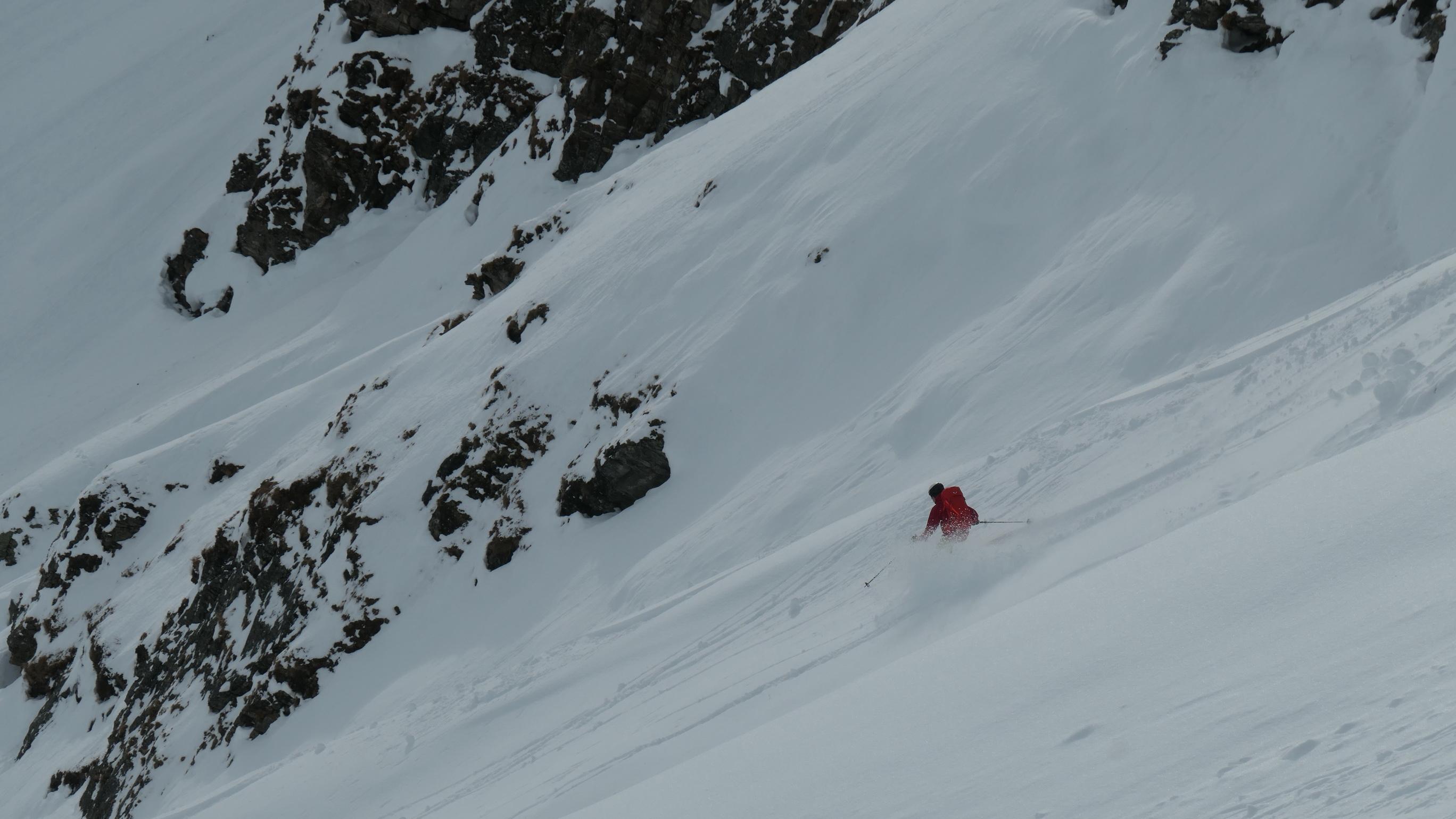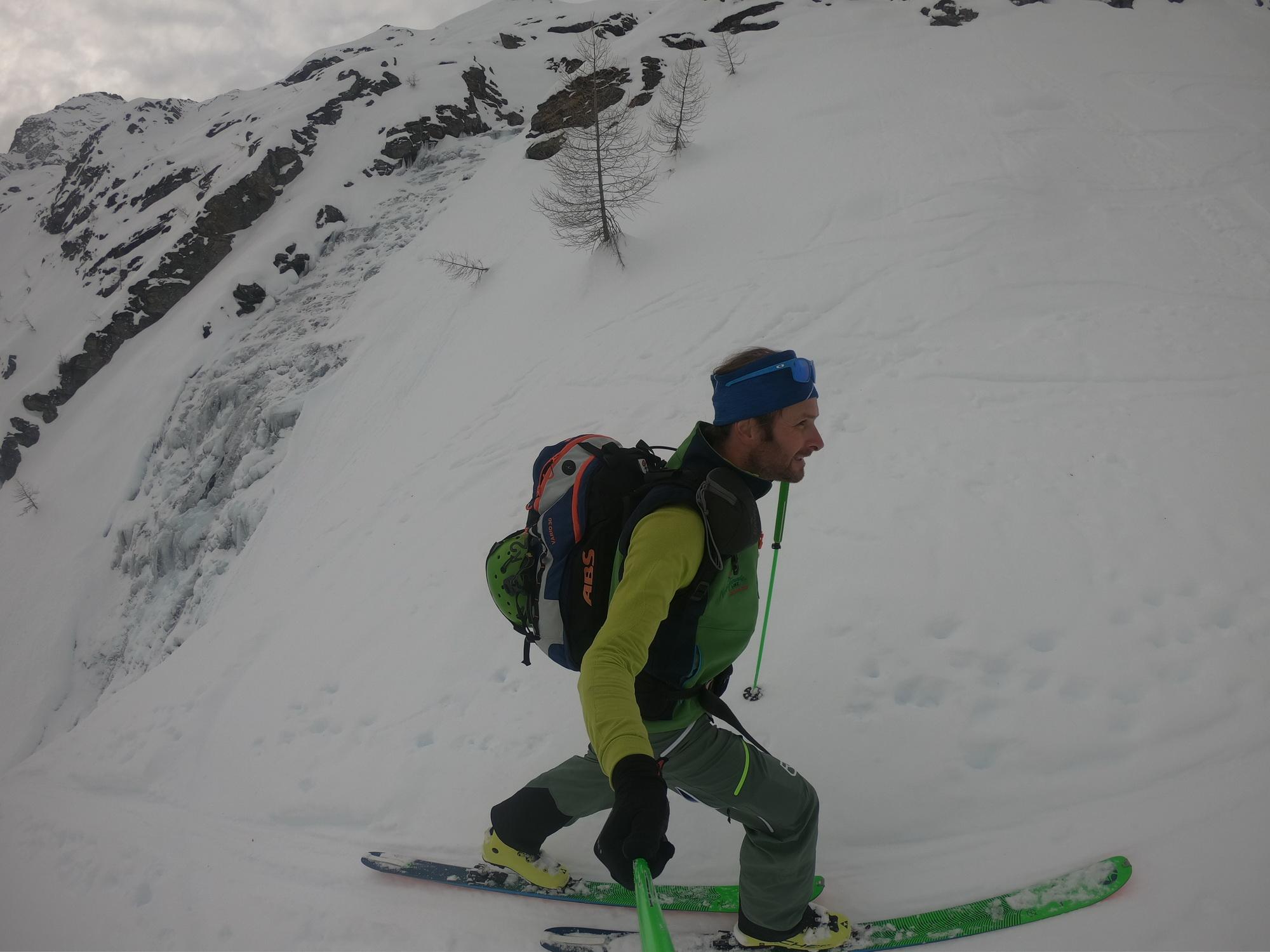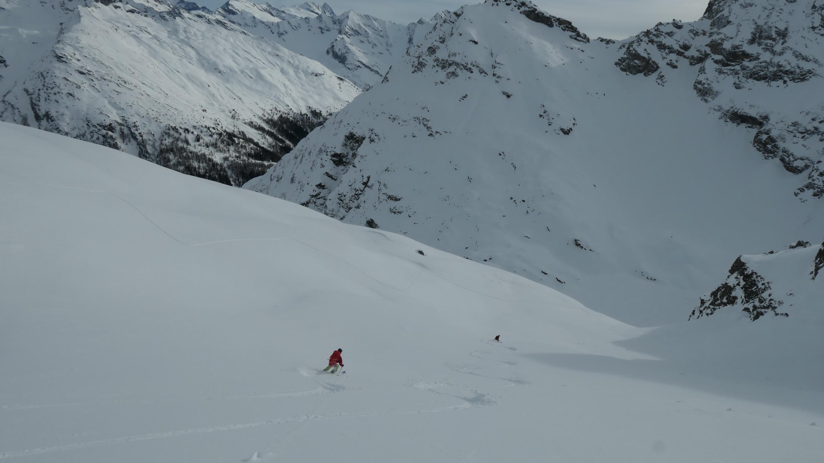 Aufgrund der ganzen Gefahrenzeichen haben wir dann auch unseren Plan von der Abfahrtsvariante verworfen und sind entlang der Aufstiegsspur abgefahren. Und auch hier haben wir noch jede Menge brauchbaren Schnee gefunden. Aufgrund der leichten Durchfeuchtung zwar nicht mehr so leicht wie bei den letzten Touren, allerdings immer noch gut fahrbar.