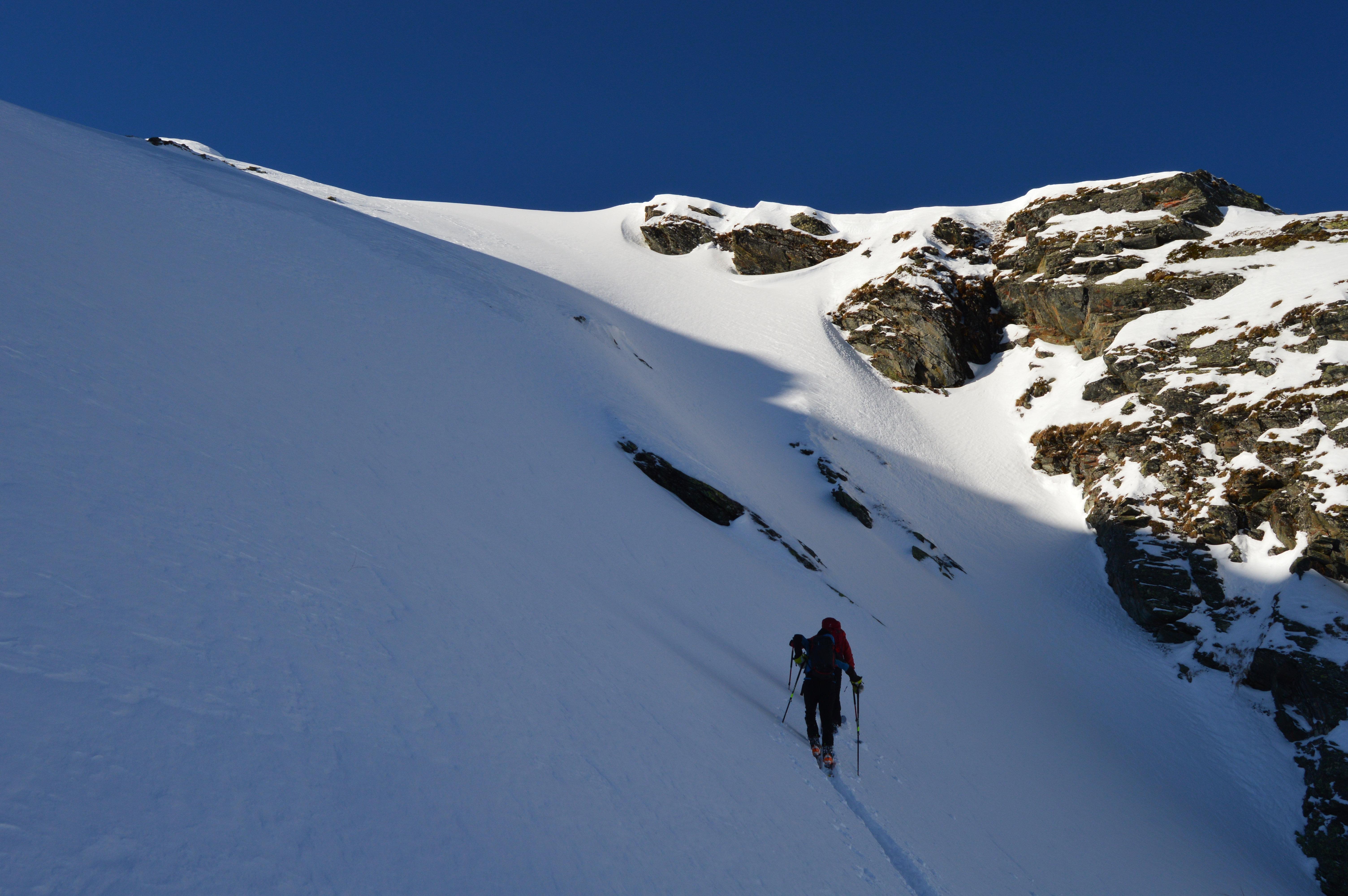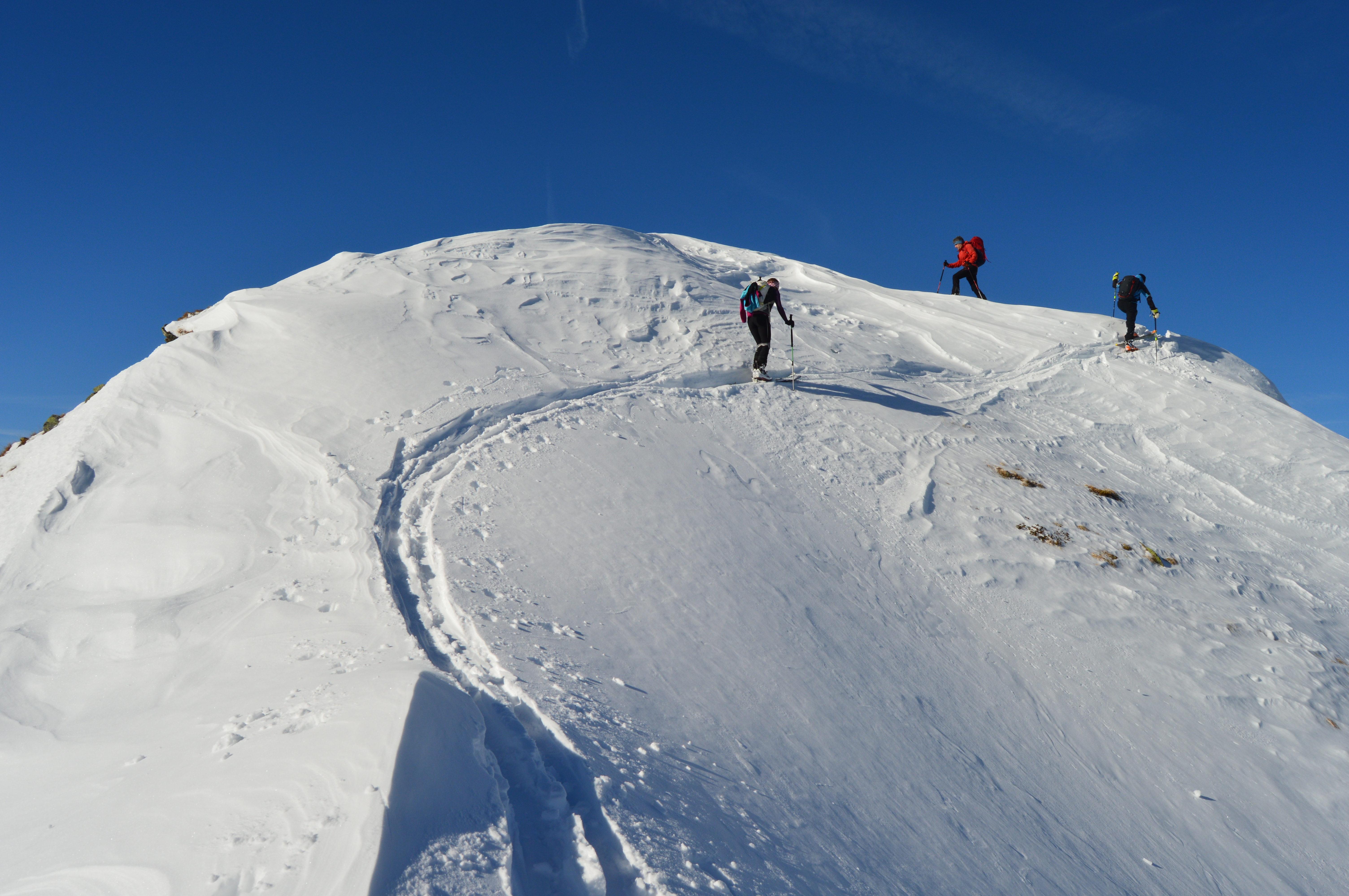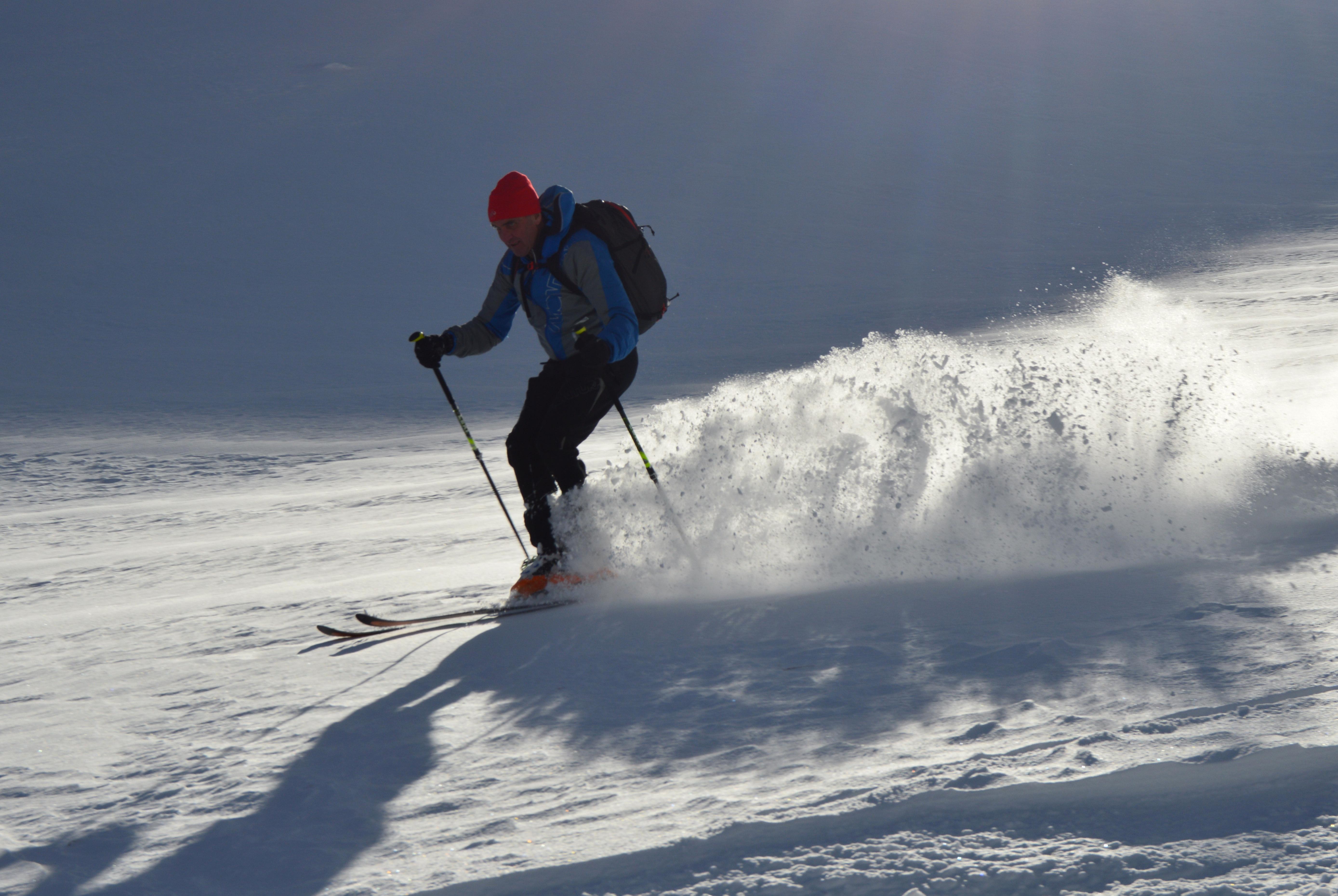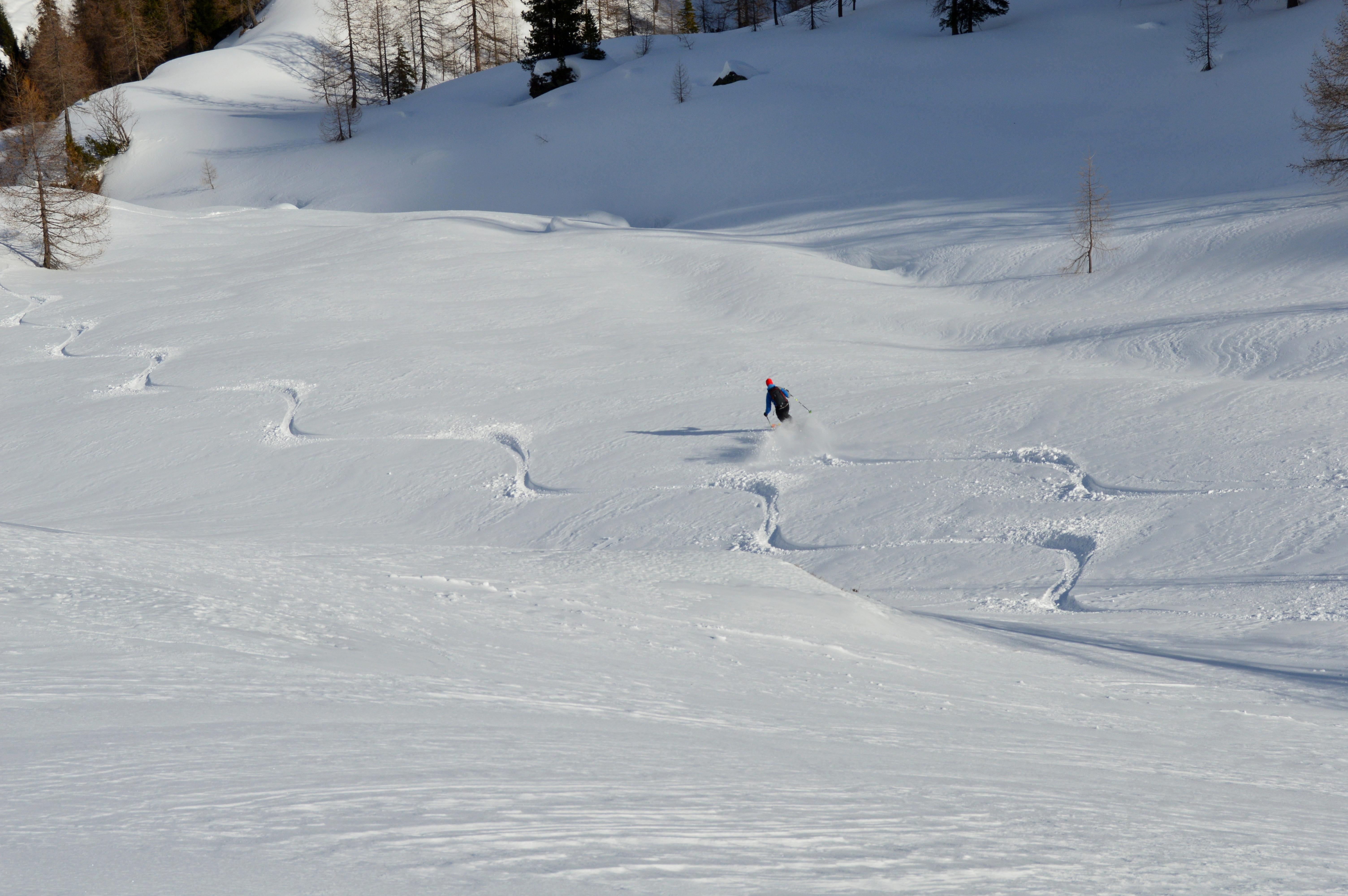Die Westseiten sind komplett ausgeblasen und glänzen teilweise schon vom Tal aus. Sonnseitig ist es einfach zu warm und der Schnee wird sofort schwer. Wir haben uns heute in ein ziemlich geschütztes Nordkar begeben und hatten durchgängig sehr gute Pulverschneeverhältnisse, wenn auch hier der Wind seine deutlichen Spuren und Muster hinterließ.