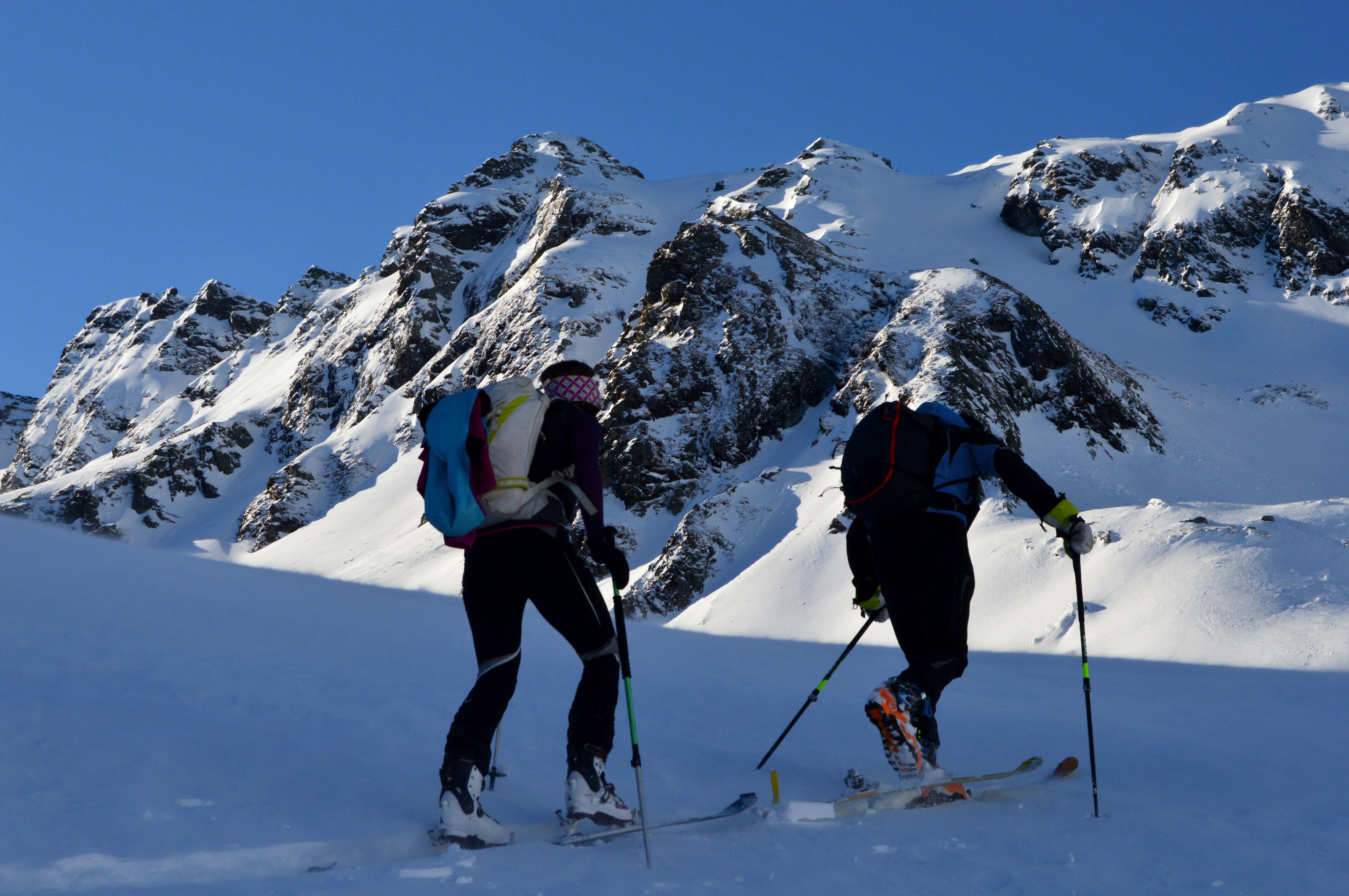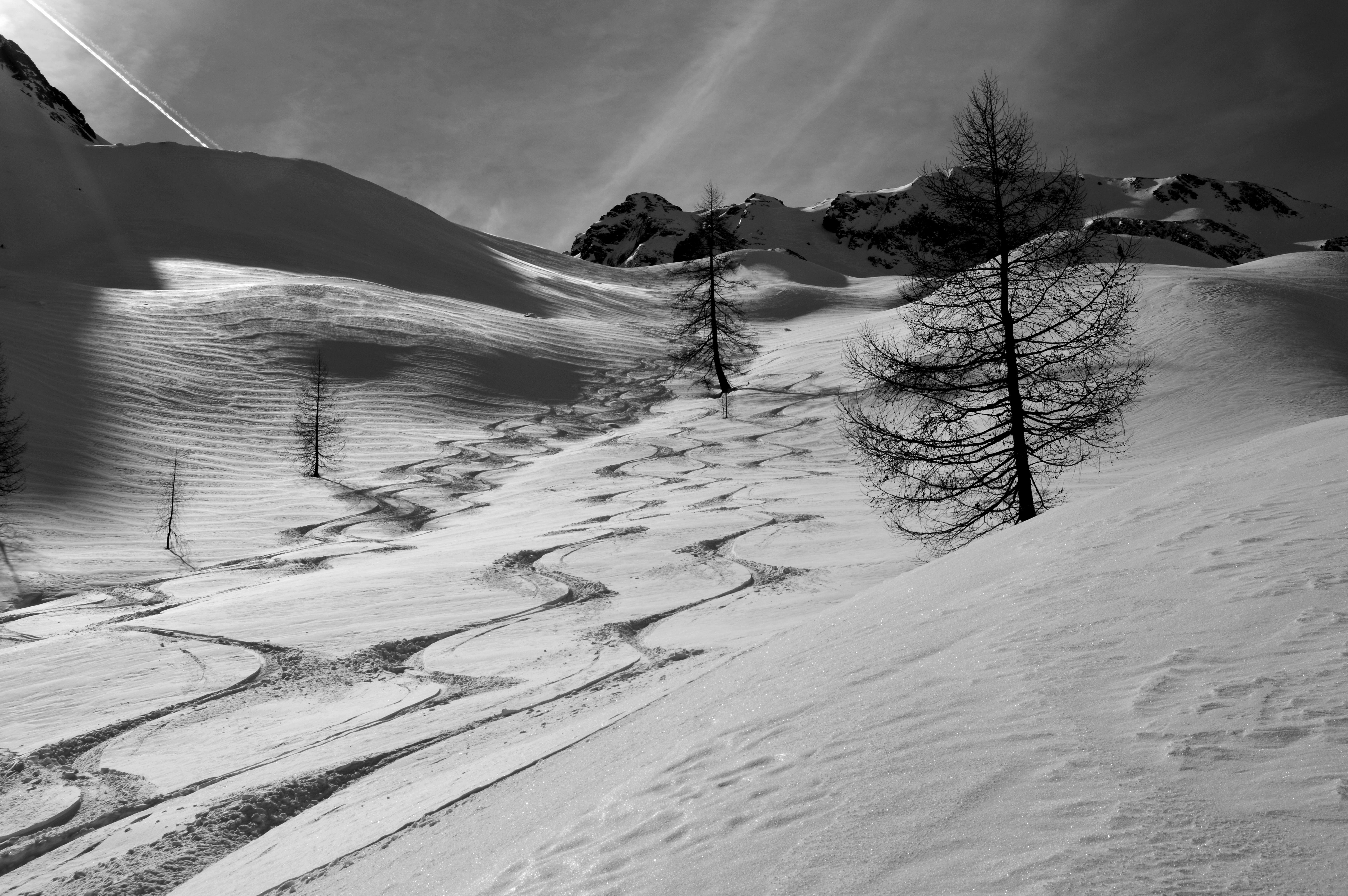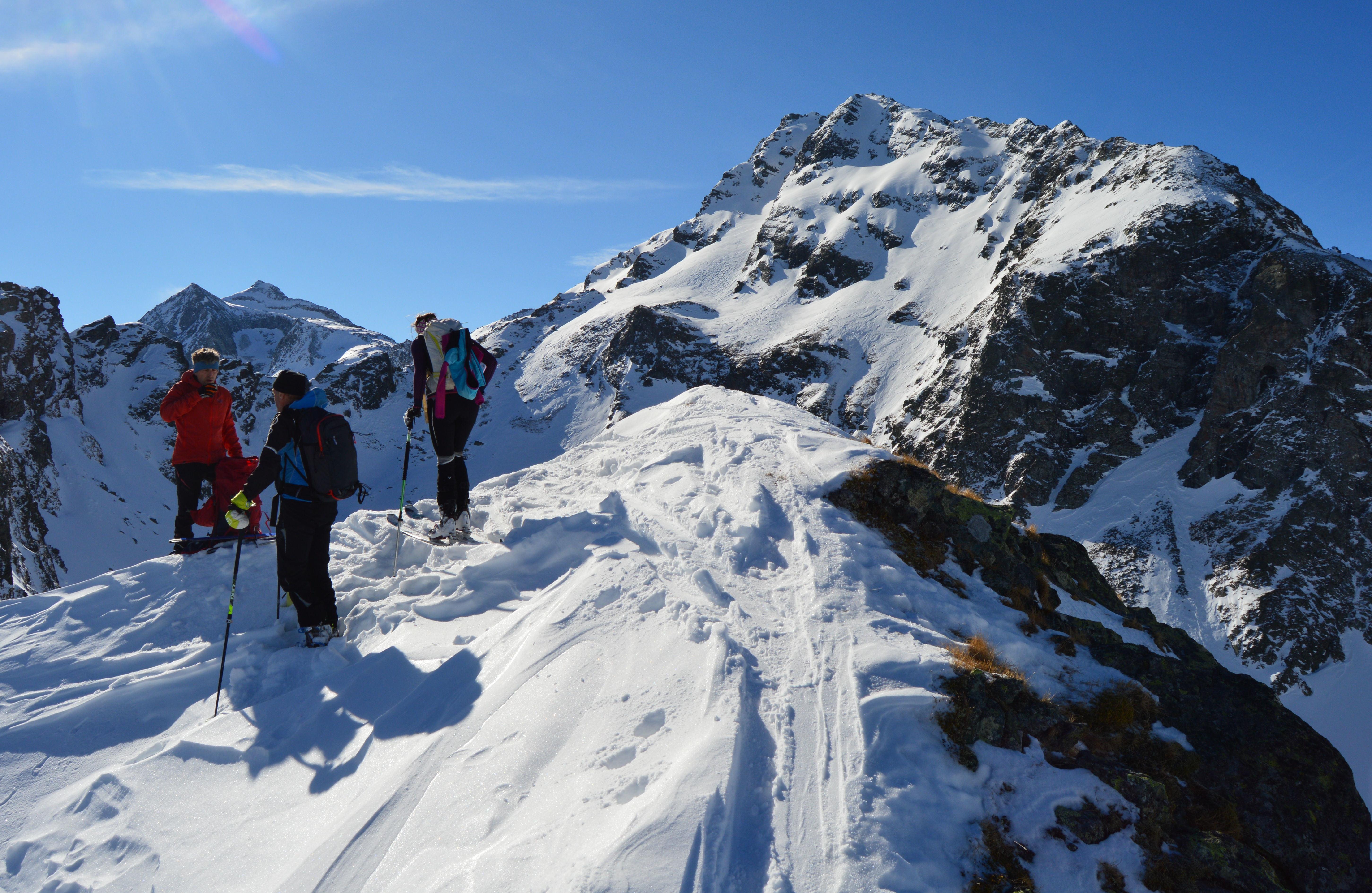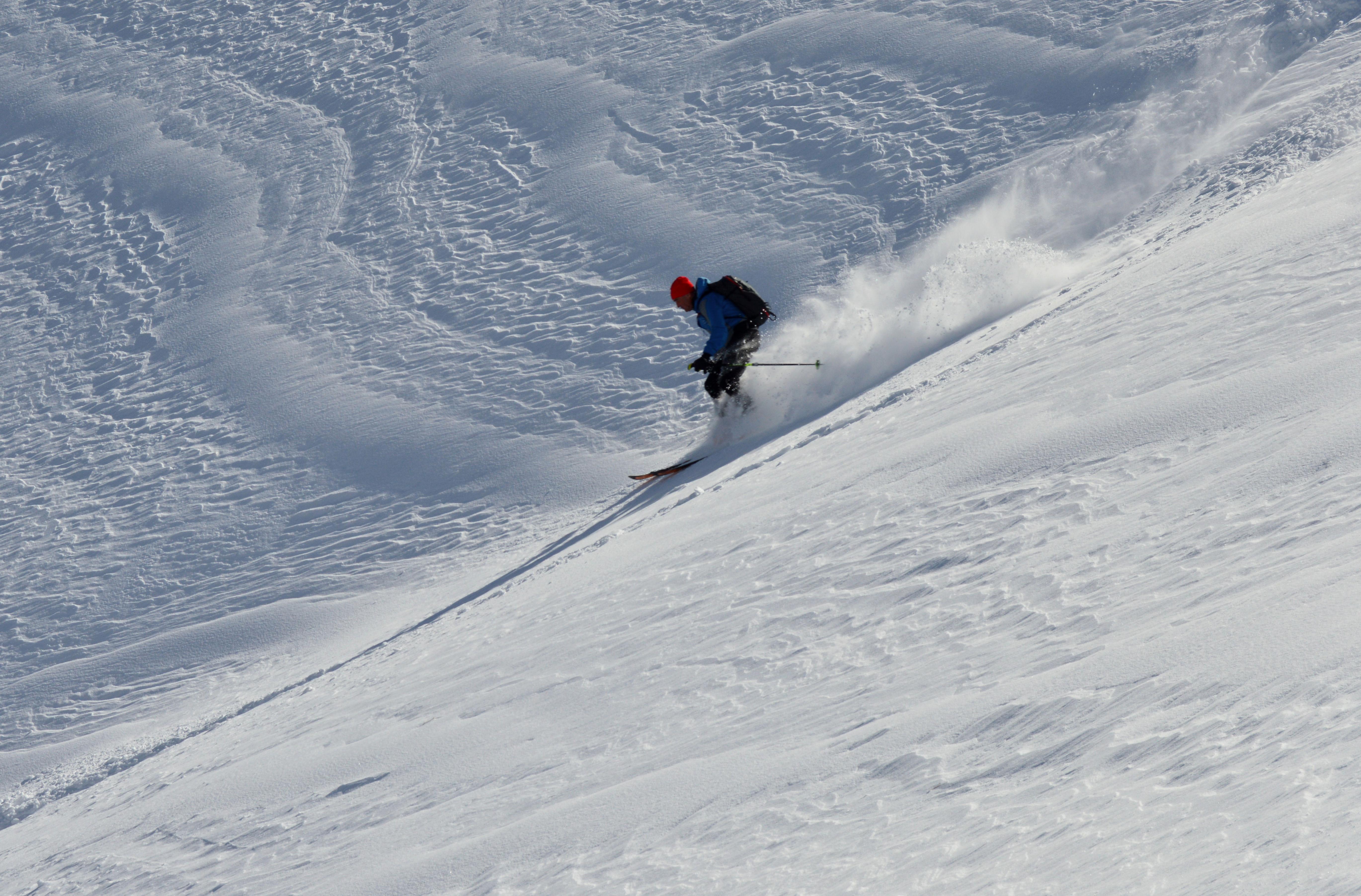 Die Westseiten sind komplett ausgeblasen und glänzen teilweise schon vom Tal aus. Sonnseitig ist es einfach zu warm und der Schnee wird sofort schwer. Wir haben uns heute in ein ziemlich geschütztes Nordkar begeben und hatten durchgängig sehr gute Pulverschneeverhältnisse, wenn auch hier der Wind seine deutlichen Spuren und Muster hinterließ.