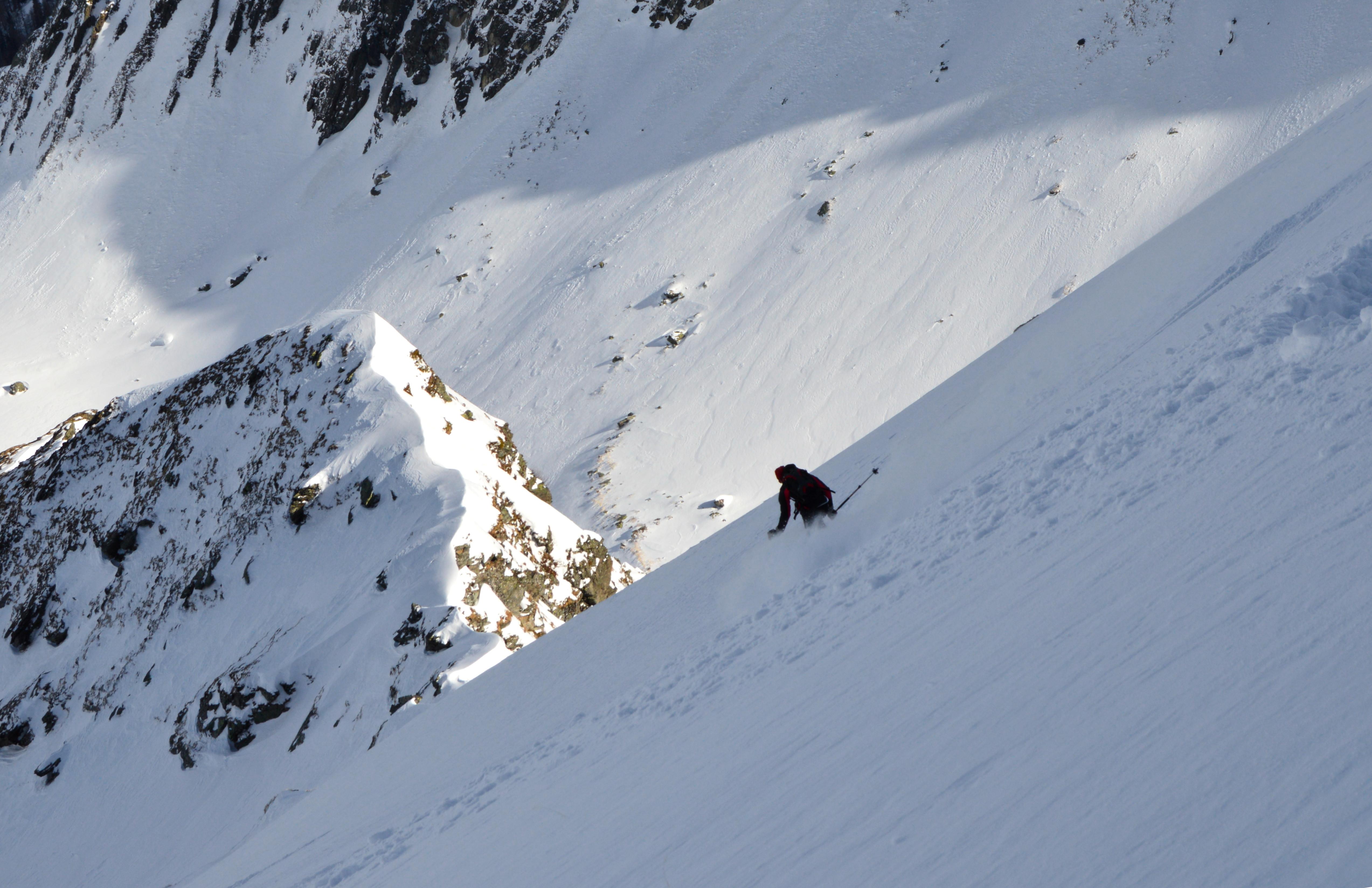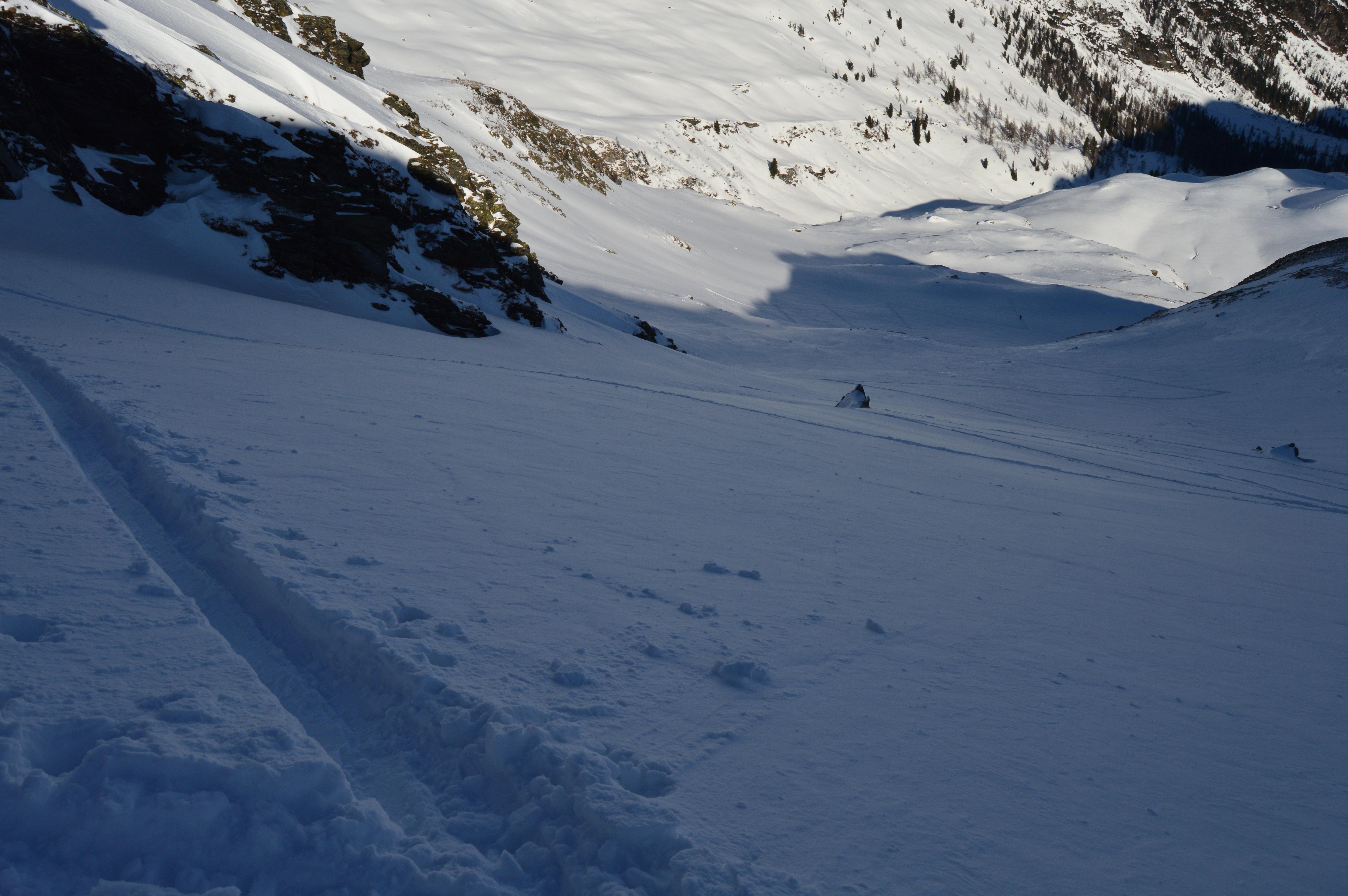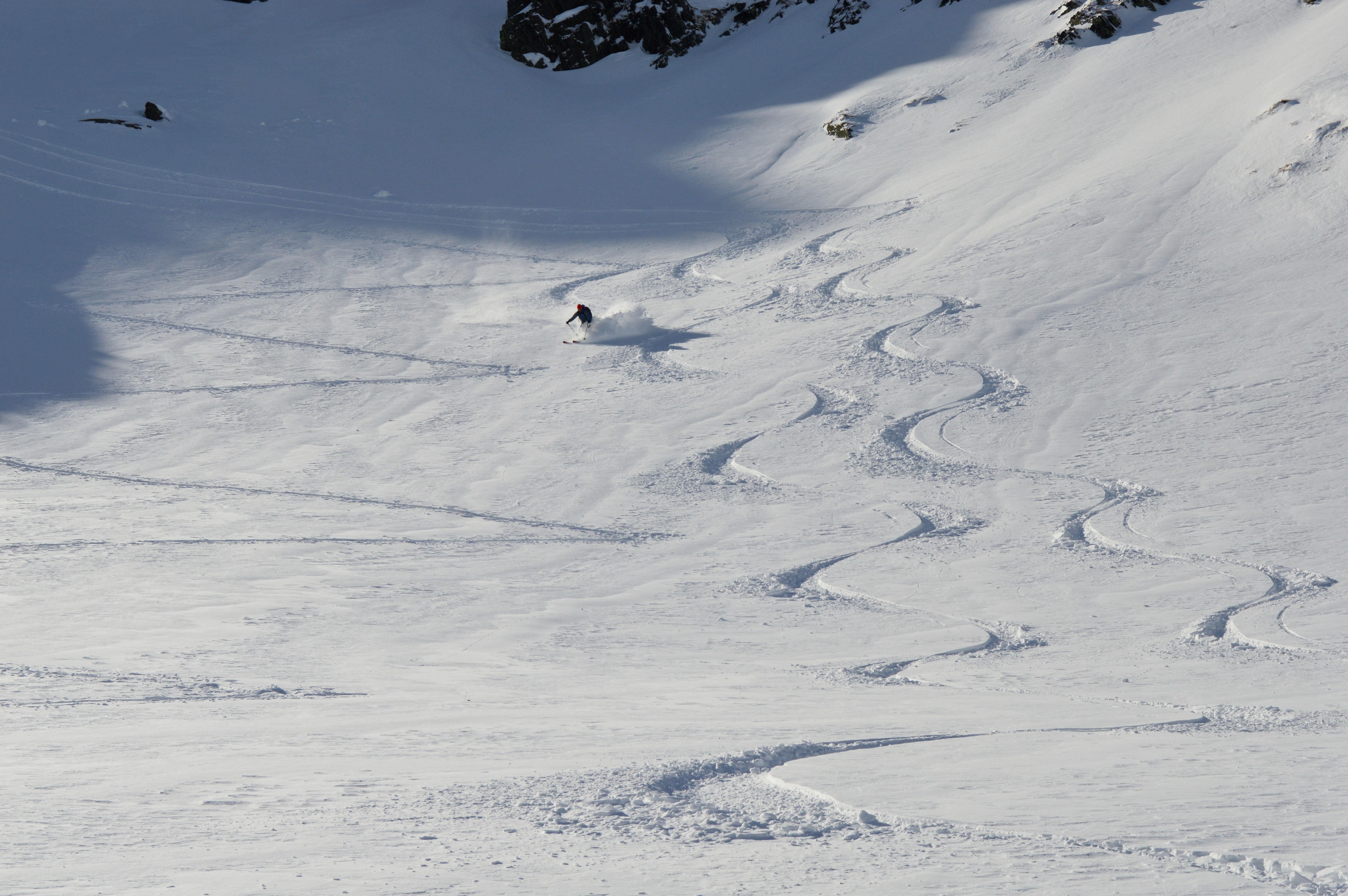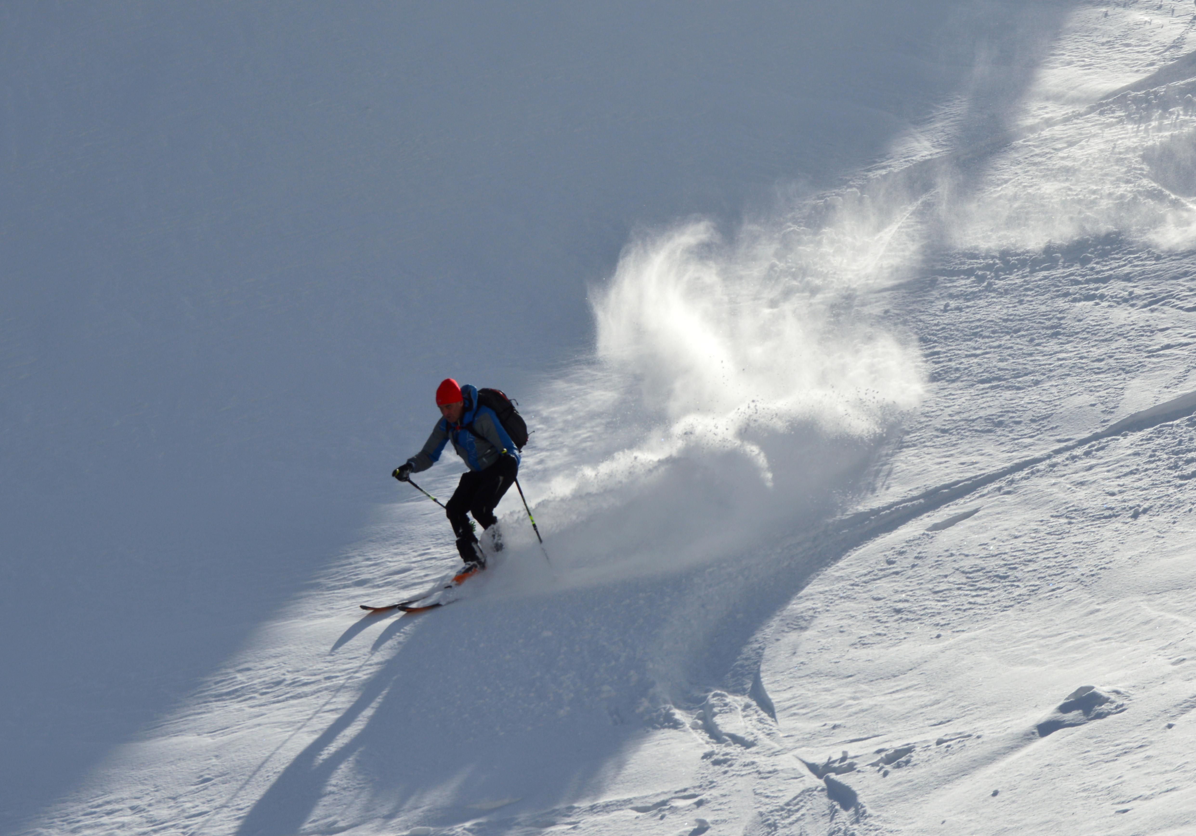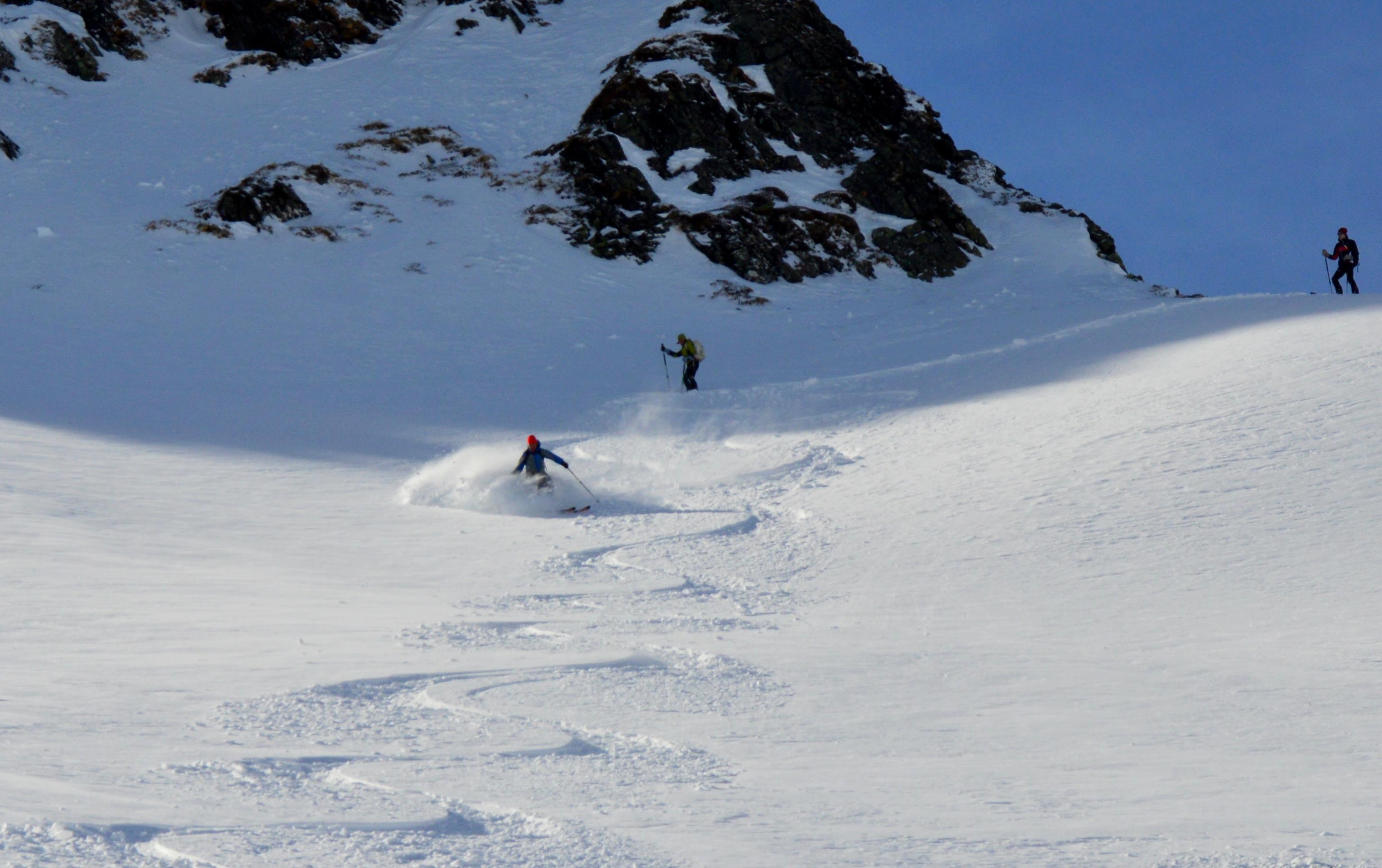 Trotz des Windeinflusses herrschten während der ganzen Abfahrt sehr gute Bedingungen. Oben durch windkomprimierten Pulver ohne Deckel. Nach unten hin wurde der Schnee immer lockerer.