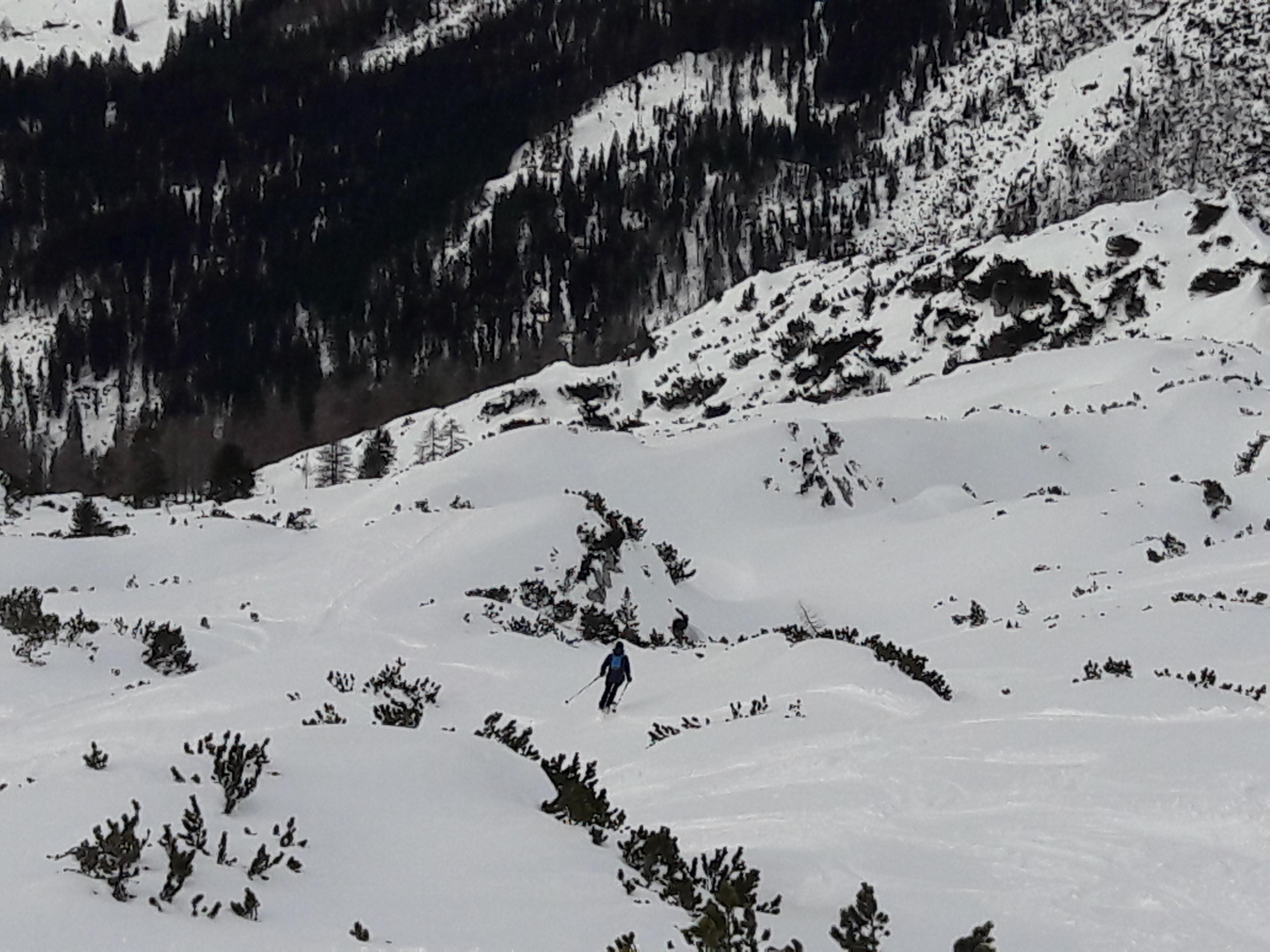 Der Pulver war gestern am SoHo und P-Köpfl noch staubig, heute am Seehorn schon eher zammghockt, aber durchaus schön zu fahren. Die Spur war 1a und hat gepickt - nix eisig, nix abgeweht, kein rutschen, ohne Harscheisen leichten Schrittes hinaufgetänzelt wie selten. Morgens und nachmittags verhüllte die Schleierbewölkung die Sonne, was sich positiv auf die Schneedecke auswirkte. Mittags sassen wir am Gipfel in der Sonne und der Wind machte keinen Mucks. Zauberhafte Lichtstimmungen und Himmelszeichnungen. Ein Hauch von Frühling – spätestens auf der Hausbank vom Lohfeyrer mit Blick auf das emsige Meisenvolk samt Geszwitscher, wo wir das obligate Weissbier zwitscherten. Wia hoasst´s im Volksmund: s´Glück is a Vogerl !