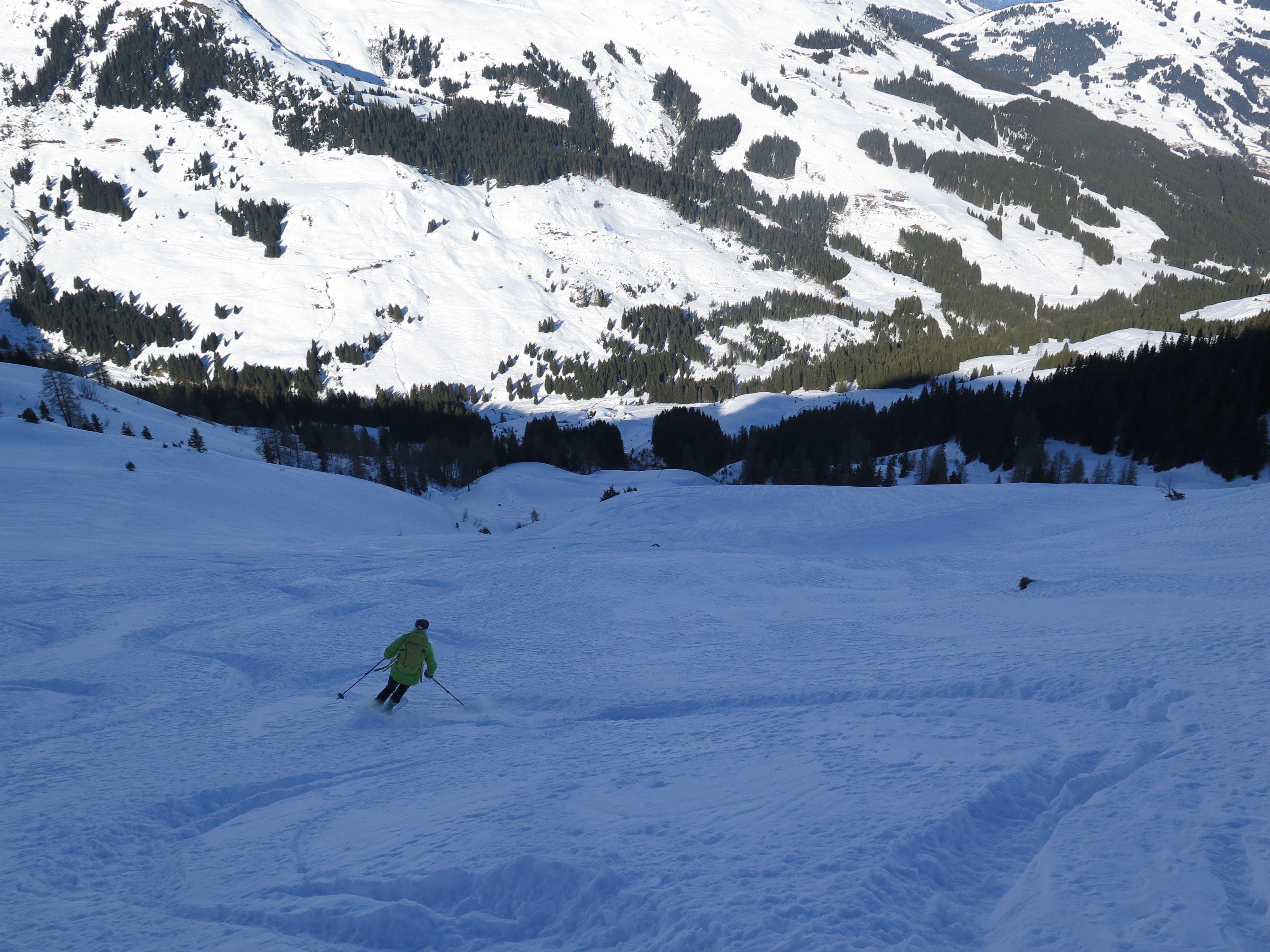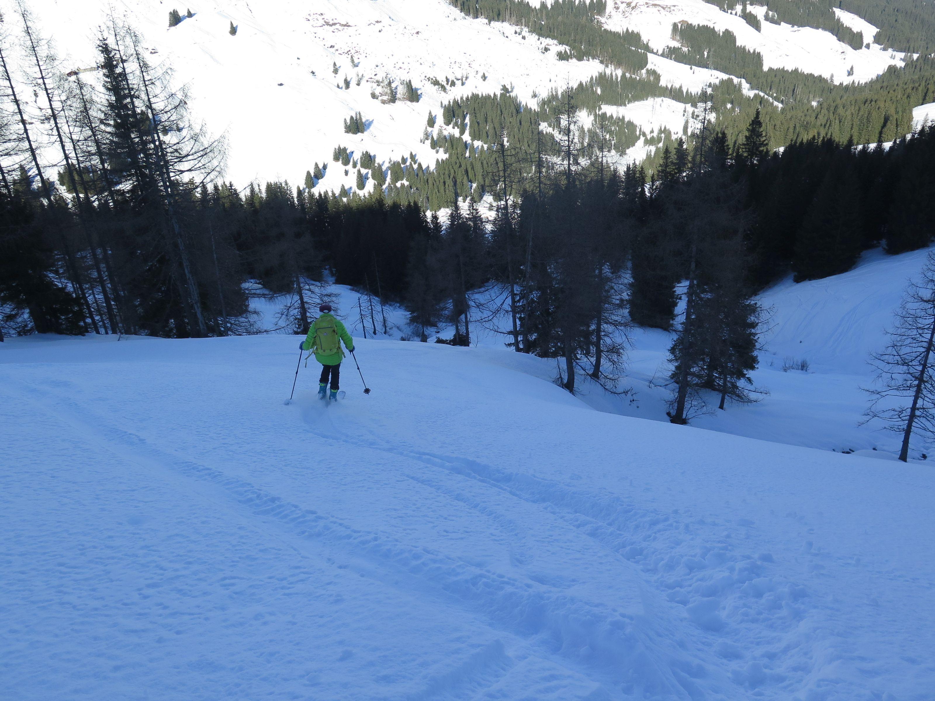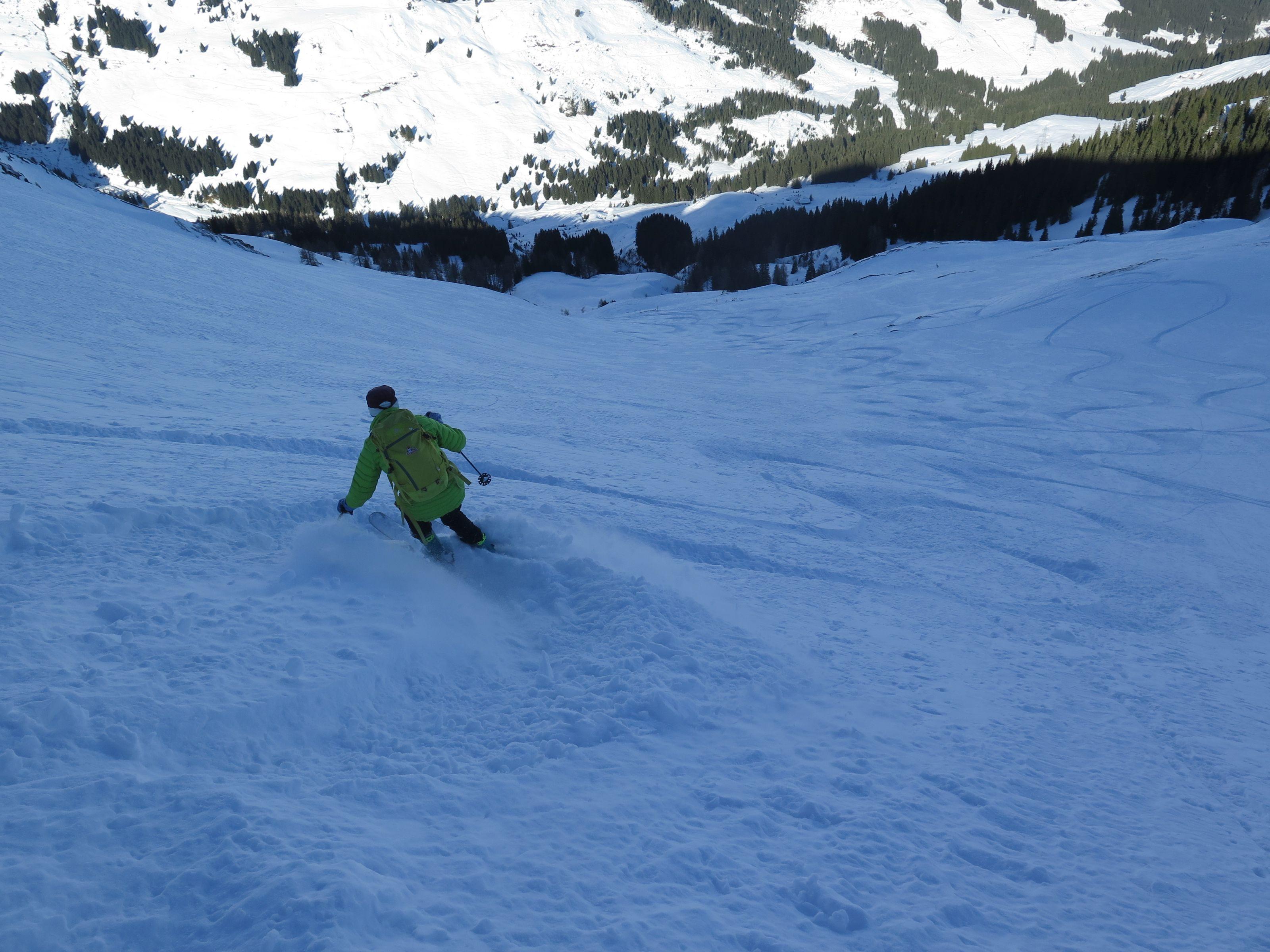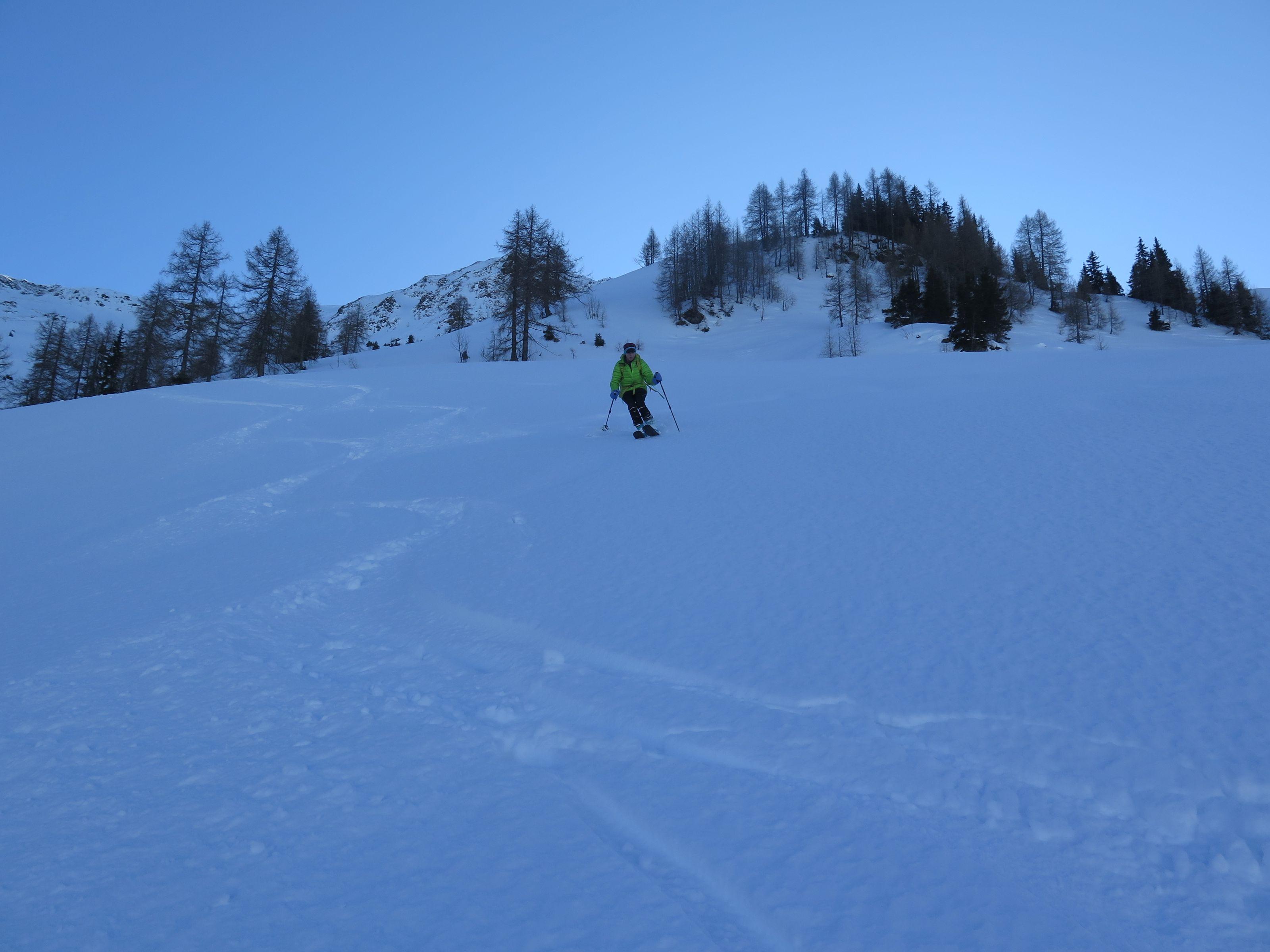 Wetter: Sonne, leichter Wind. Schnee: im Schatten noch Pulverschnee, am Gipfelkamm teilweise Windepreßt und Harsch.