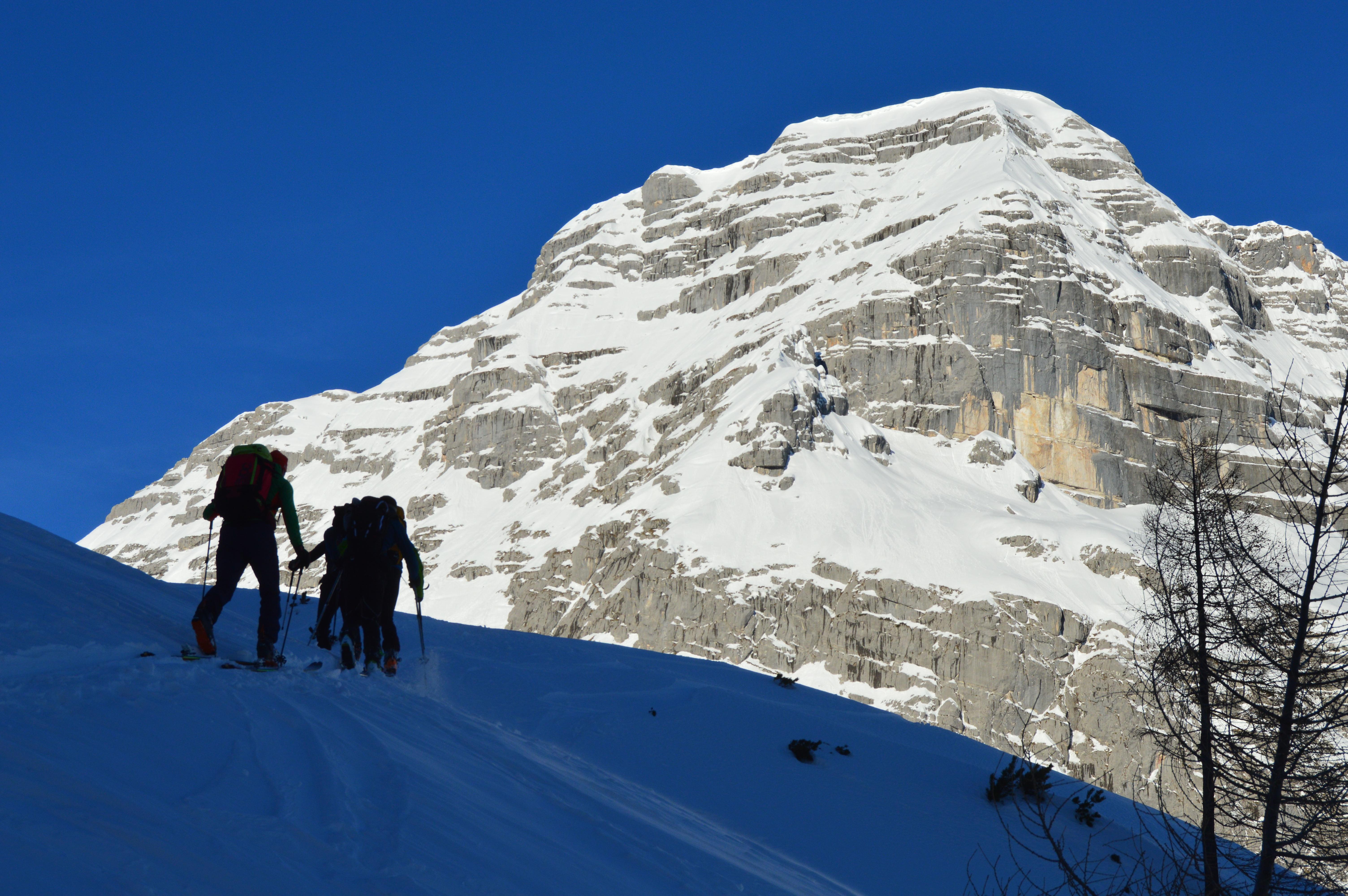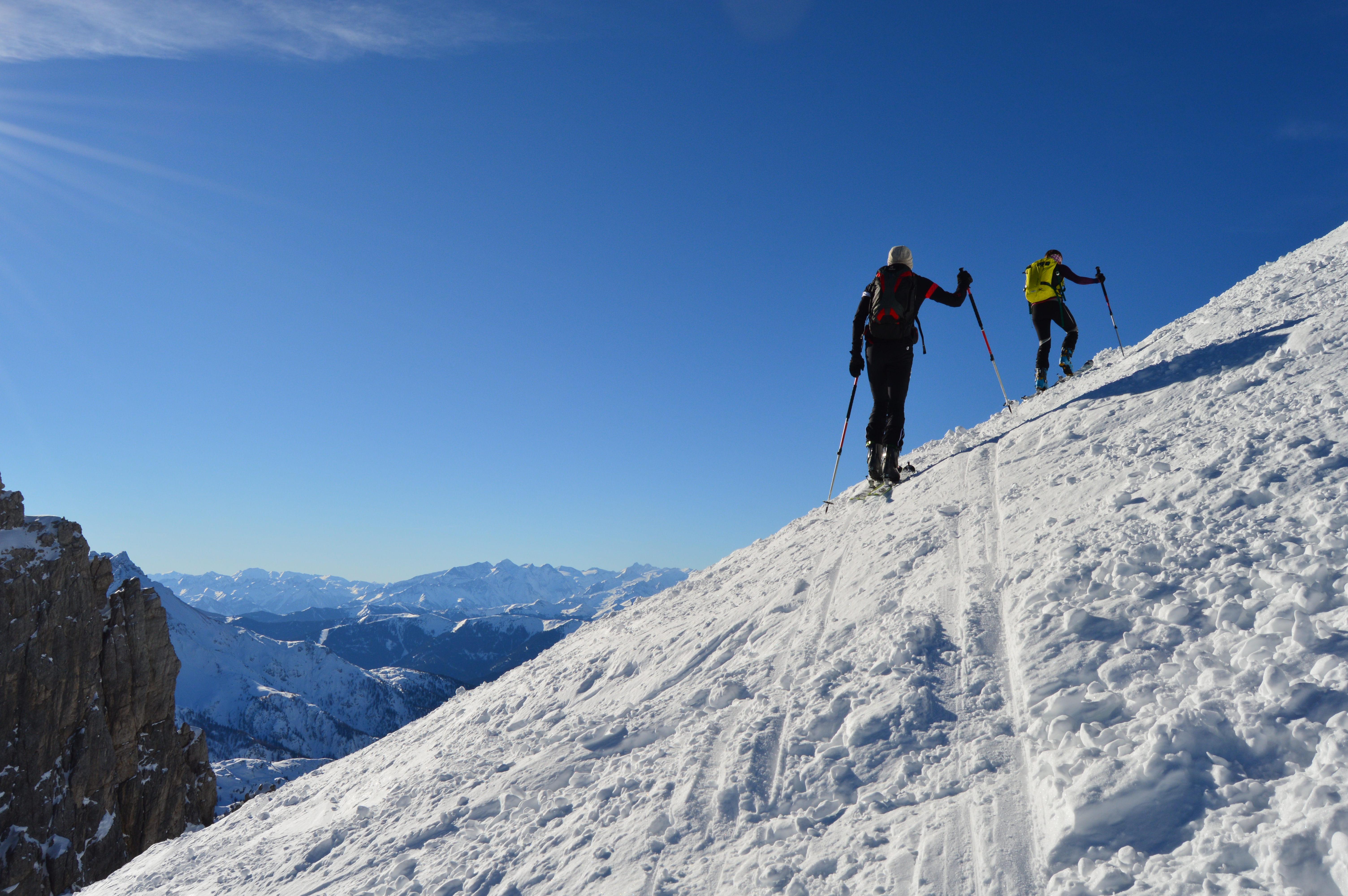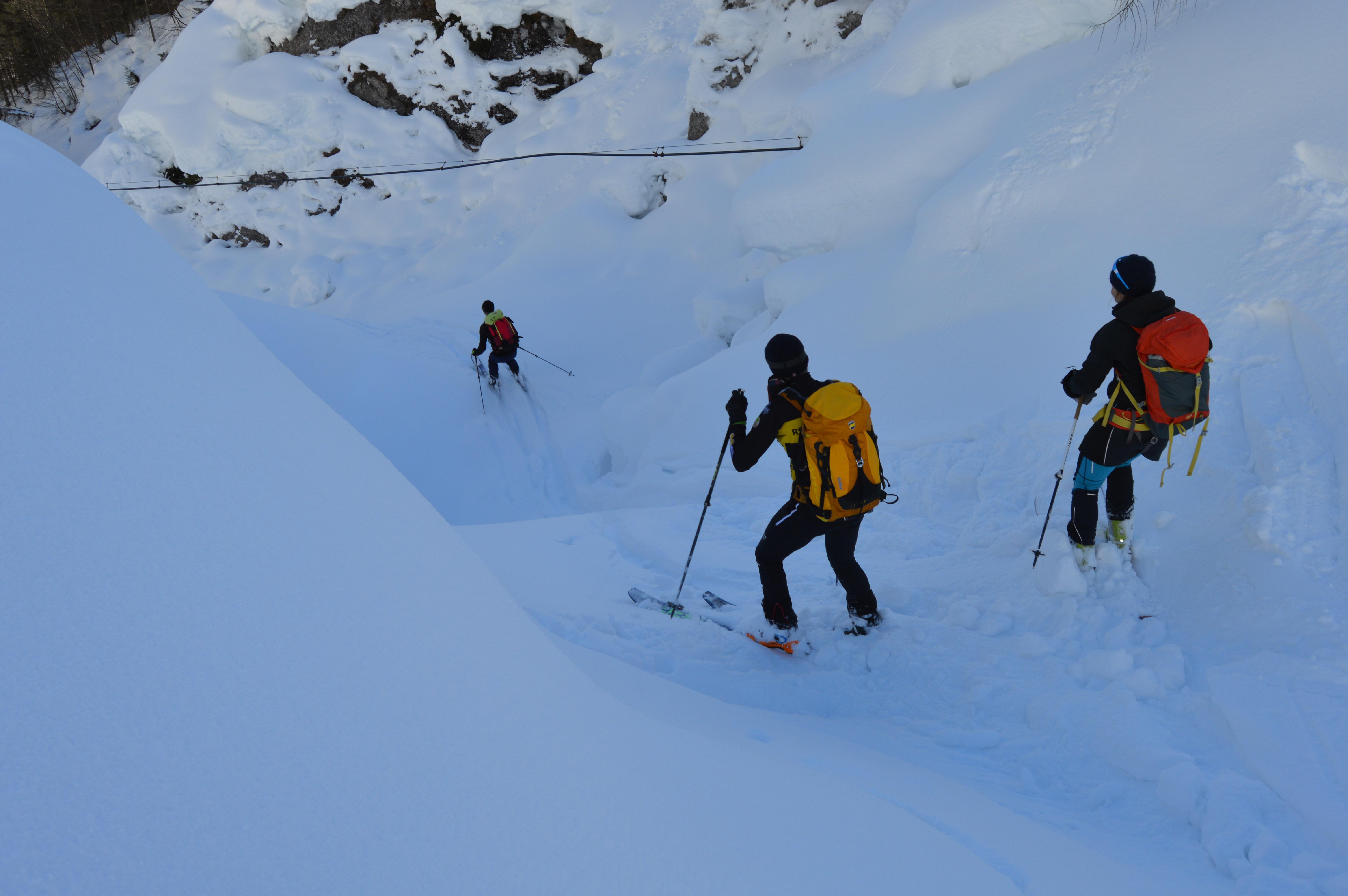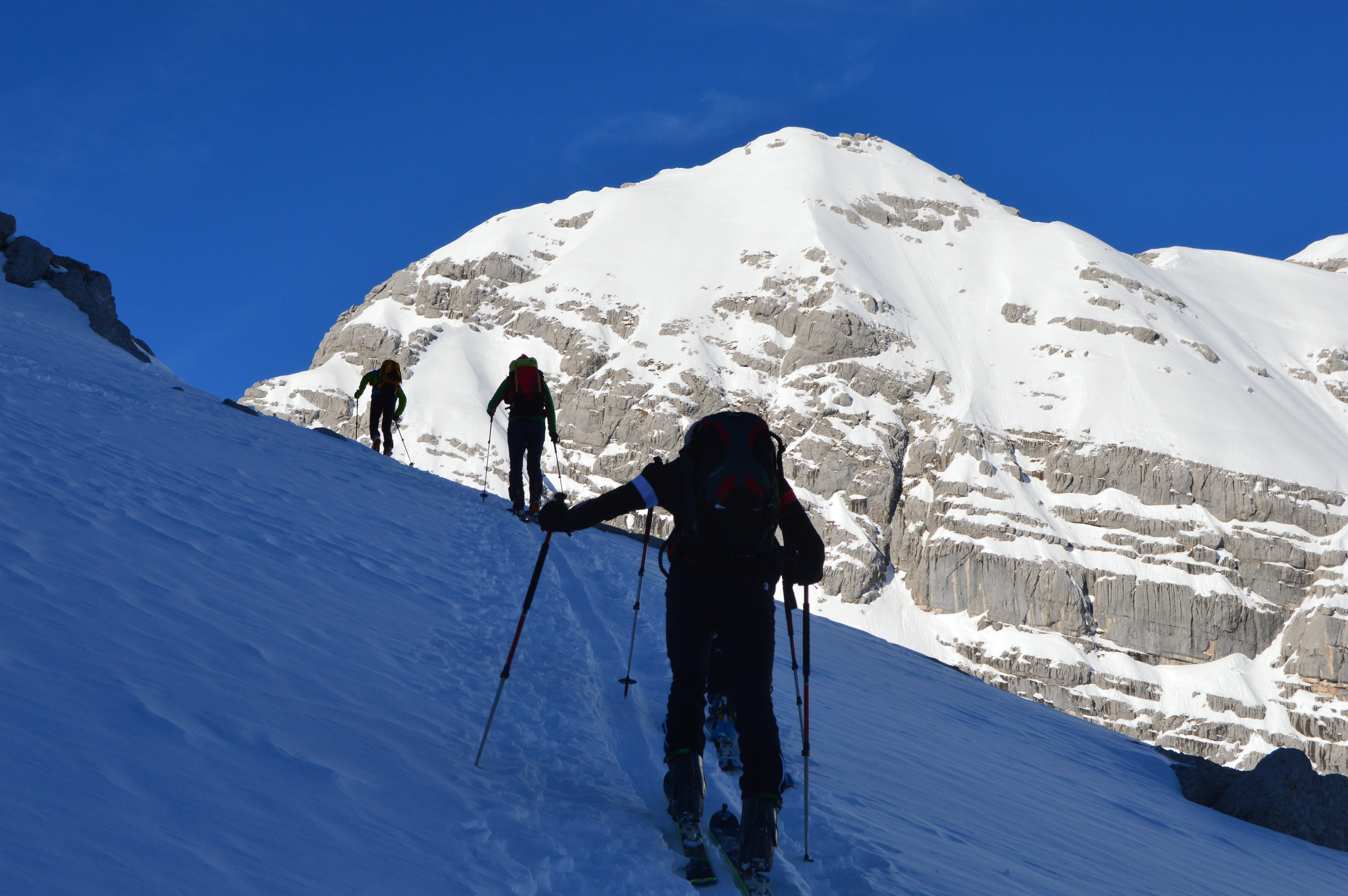 Aufstiegsverhältnisse sind sehr gut. Viel Schnee im unteren Teil, noch ziemlich weich.. nix eisig und ab der Querung noch alles pulvrig. Nur die Spur wird langsam glatter...