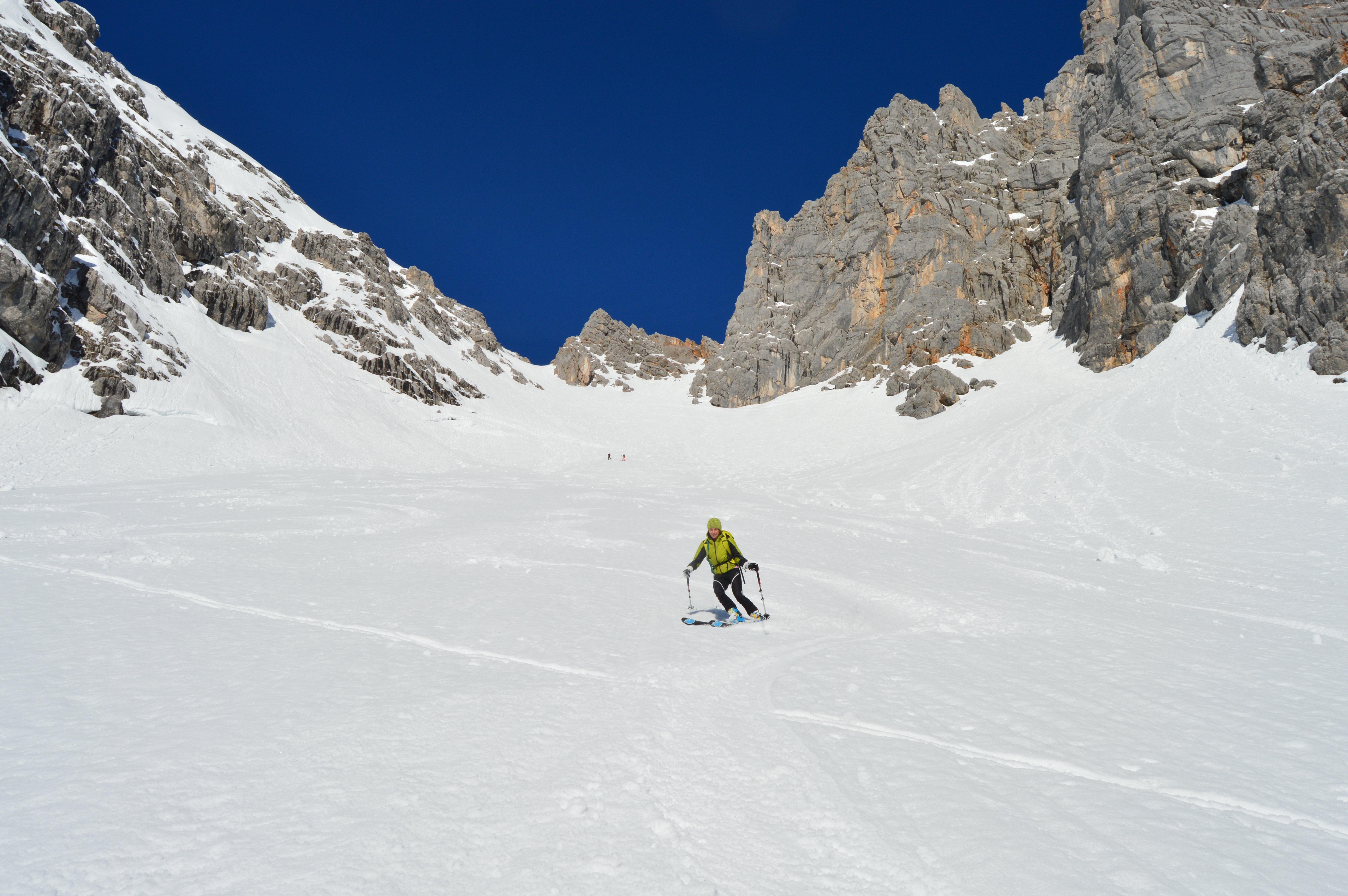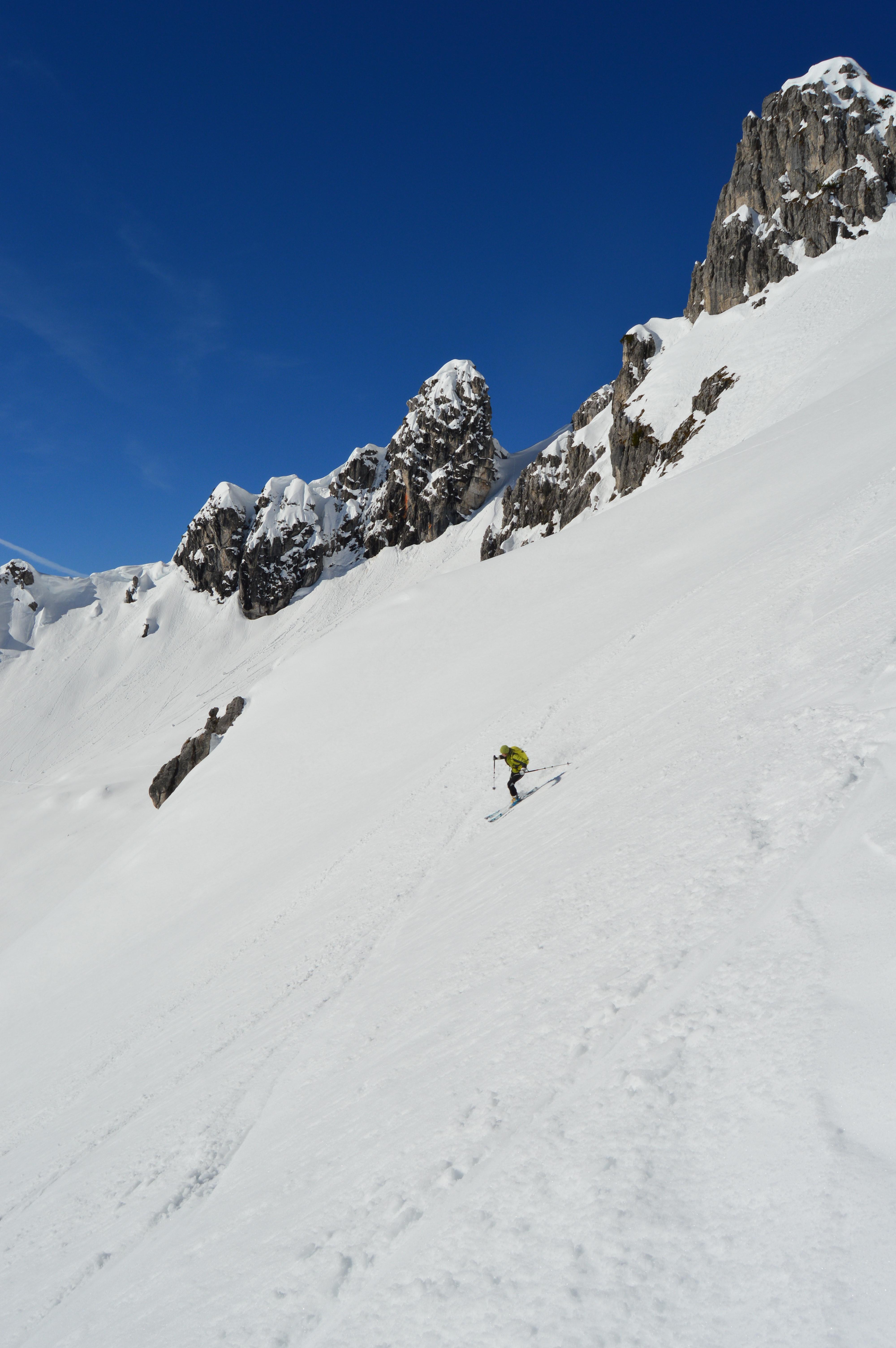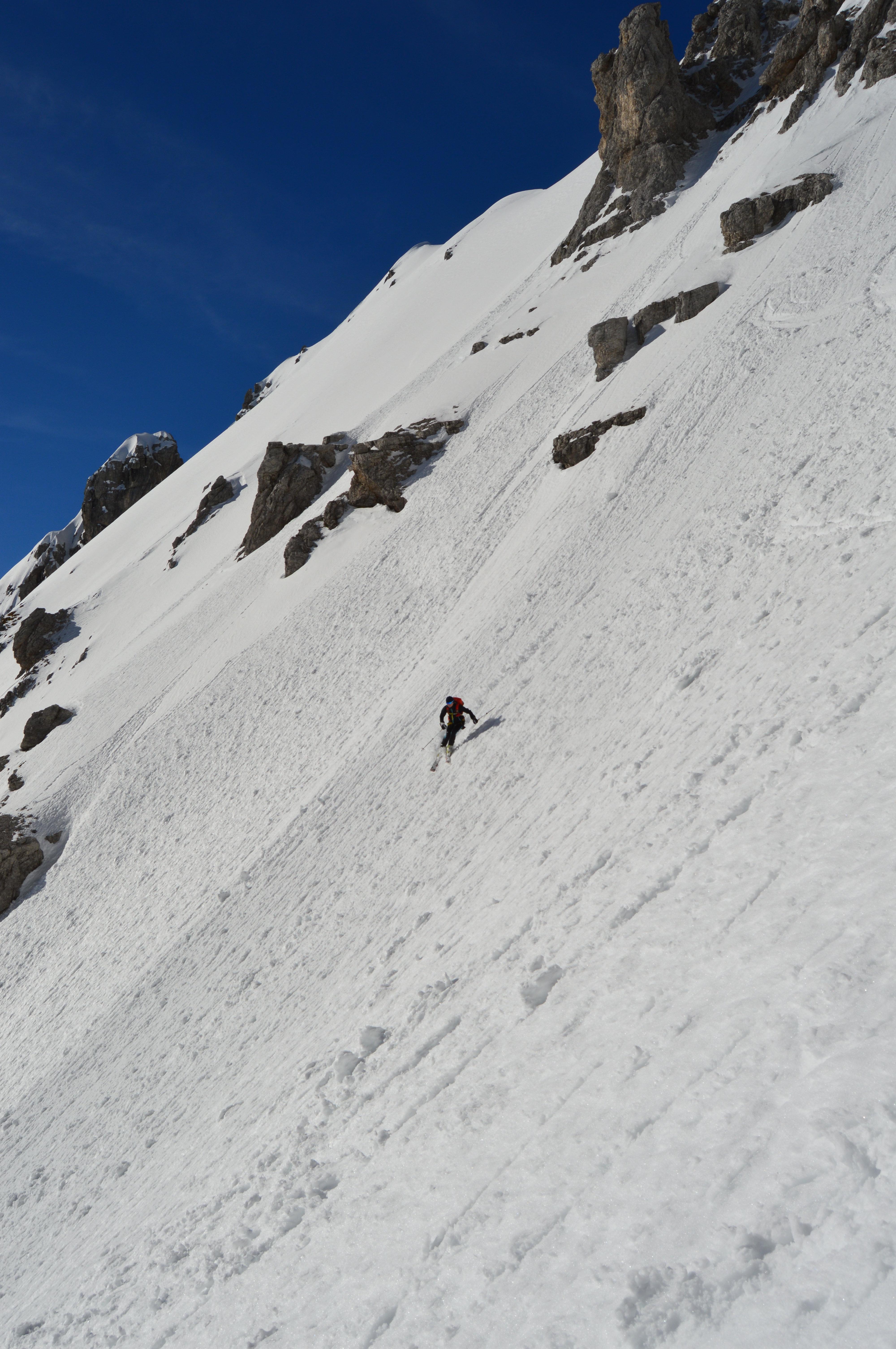 Sonnseitig brauchts noch ein zwei Tage für perfekten Firn. Heute war die Schneedecke noch nicht komplett auf Firn umgestellt, teilweise noch etwas tiefer aber sehr gut zu fahren. Hier im felsigen Kargelände kaum Gleitschneemäuler und noch keine Naßschneerutsche zu sehen.
