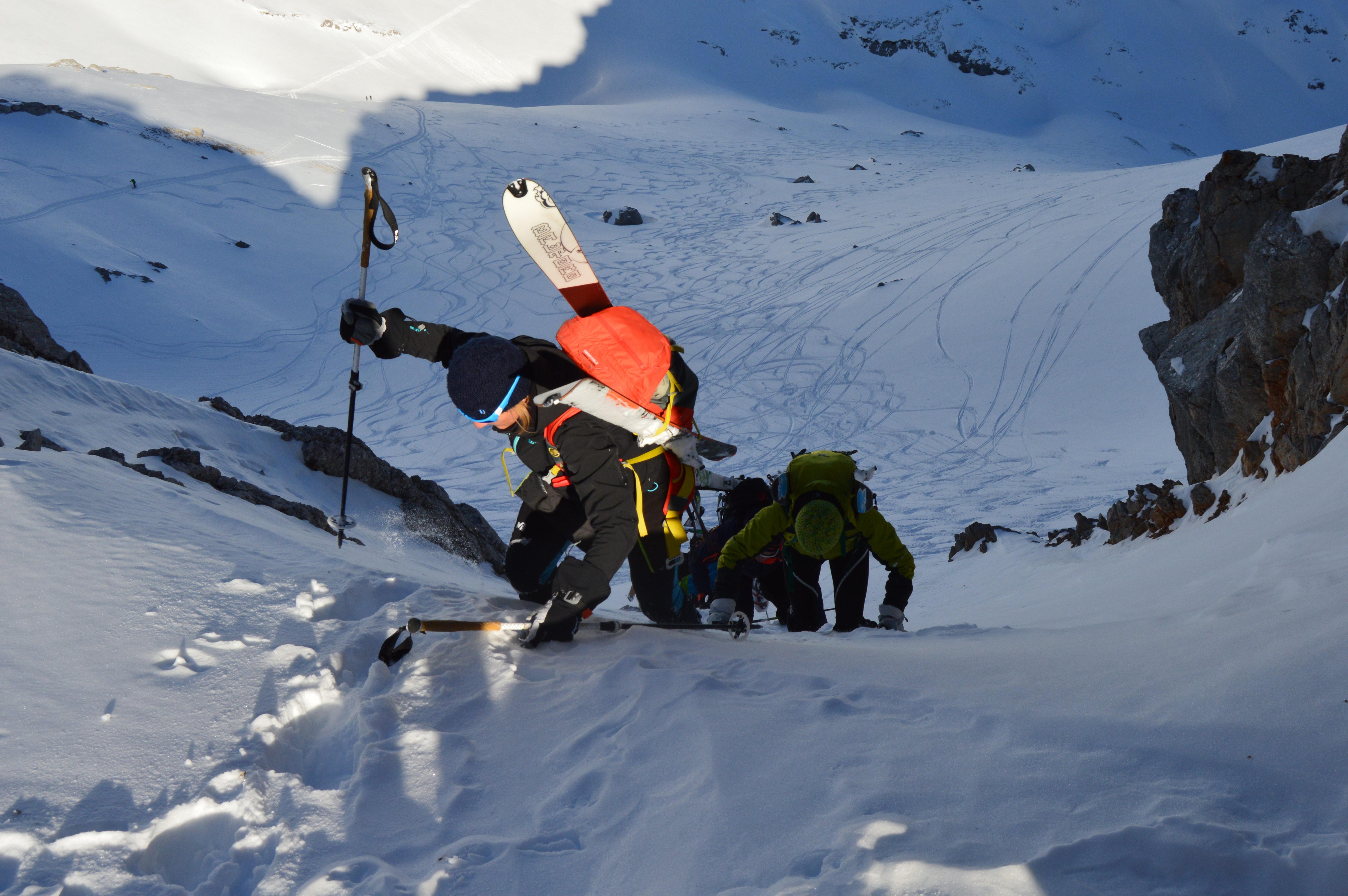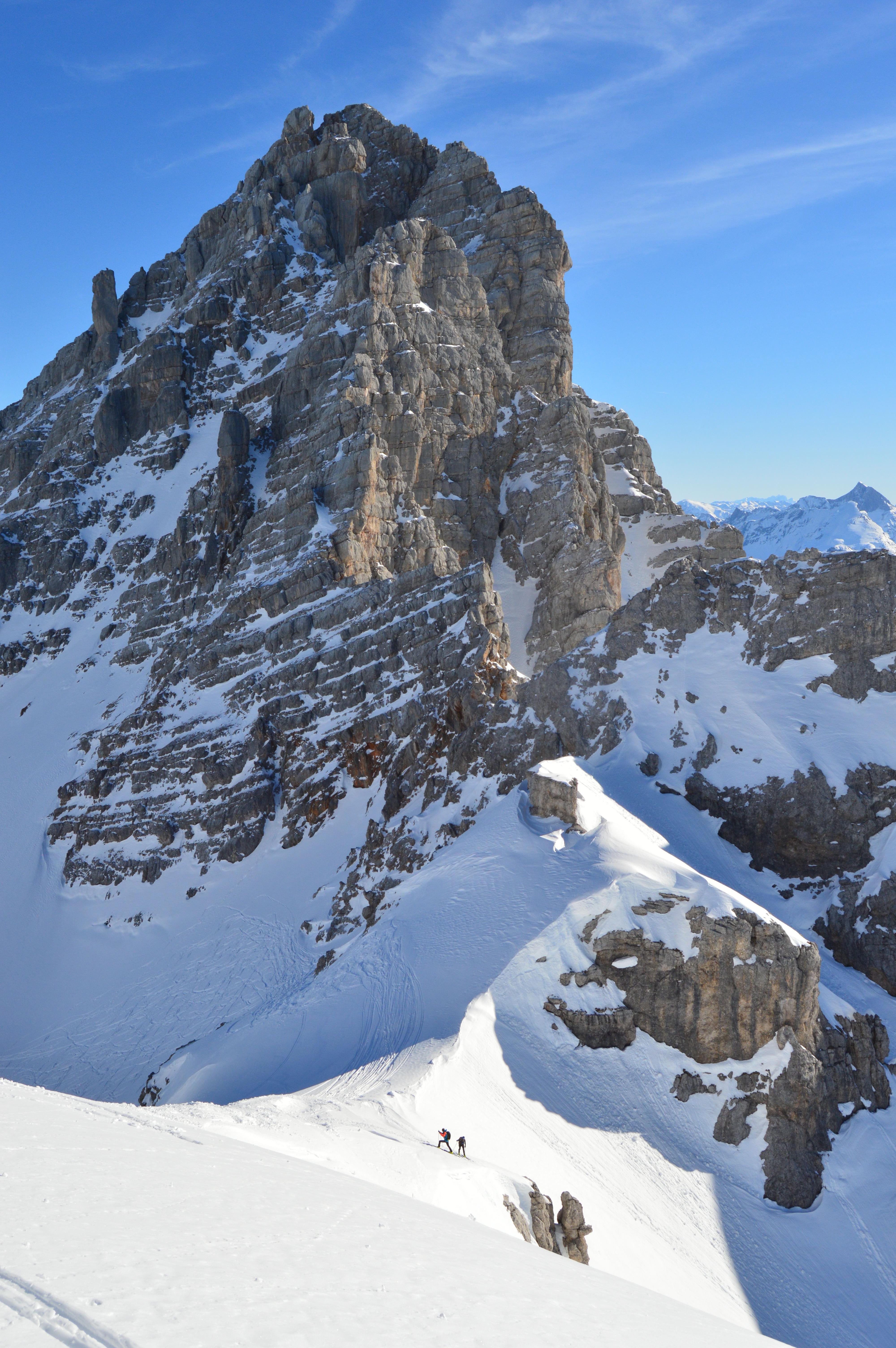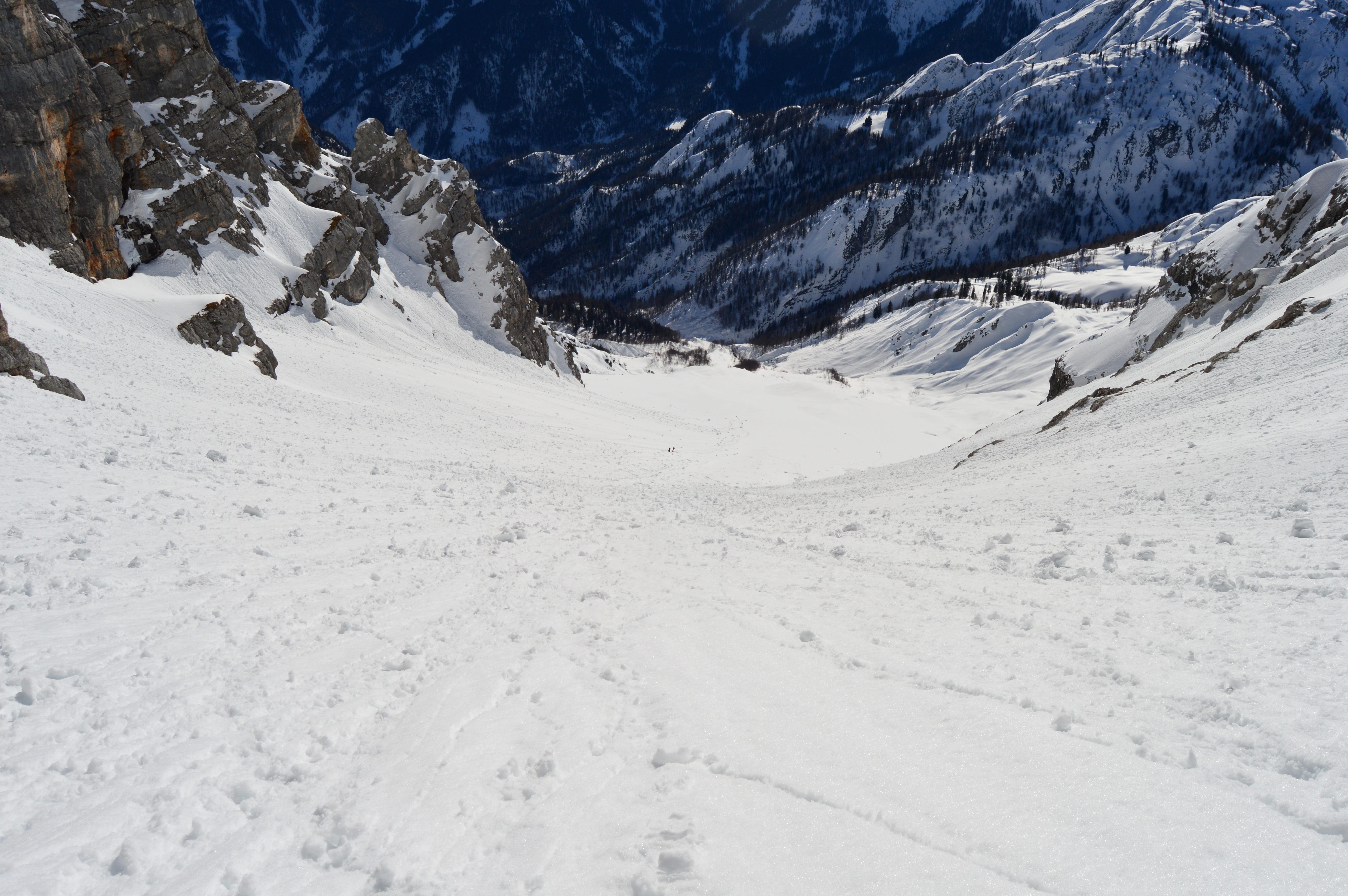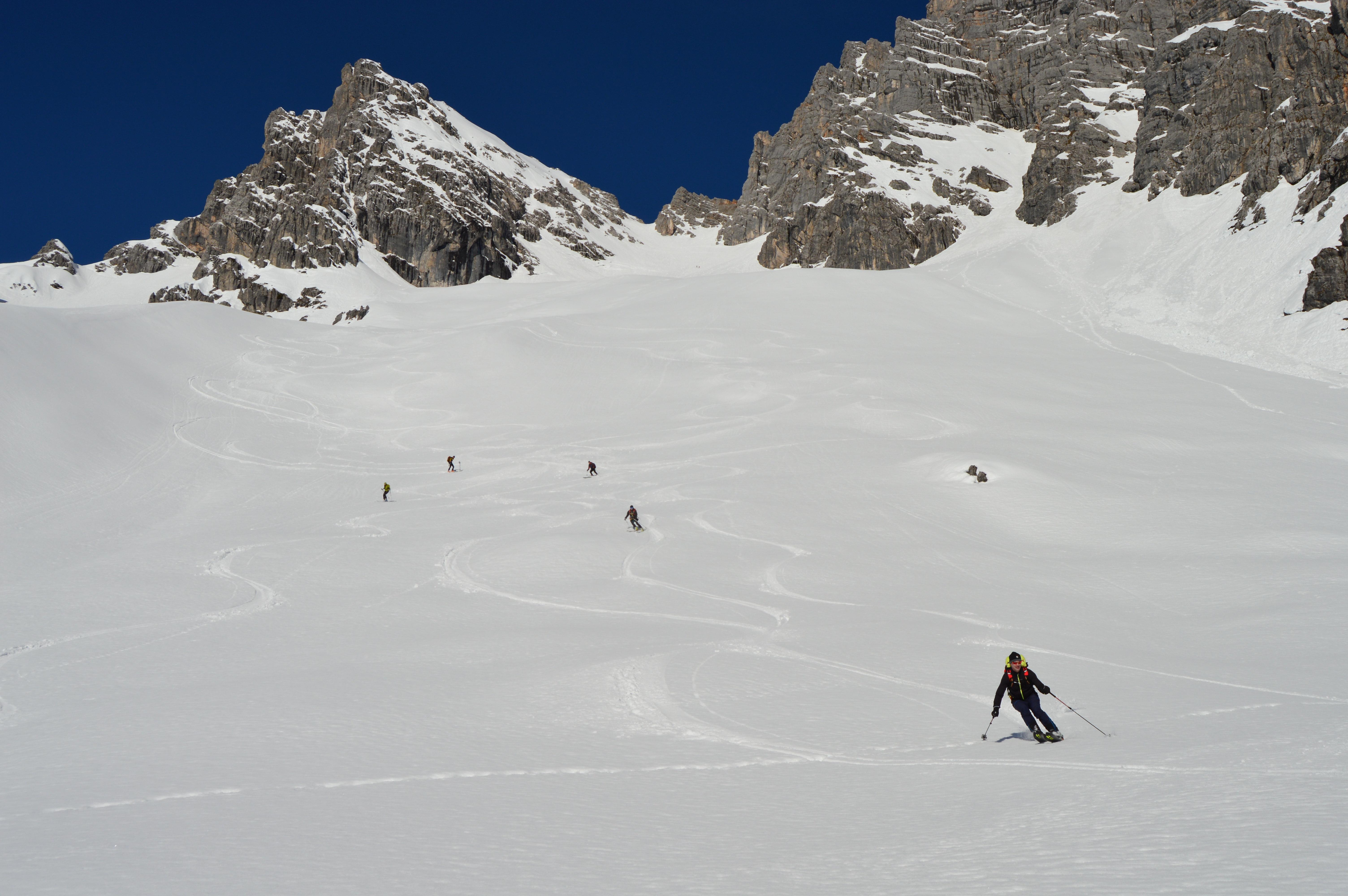 Sonnseitig brauchts noch ein zwei Tage für perfekten Firn. Heute war die Schneedecke noch nicht komplett auf Firn umgestellt, teilweise noch etwas tiefer aber sehr gut zu fahren. Hier im felsigen Kargelände kaum Gleitschneemäuler und noch keine Naßschneerutsche zu sehen.