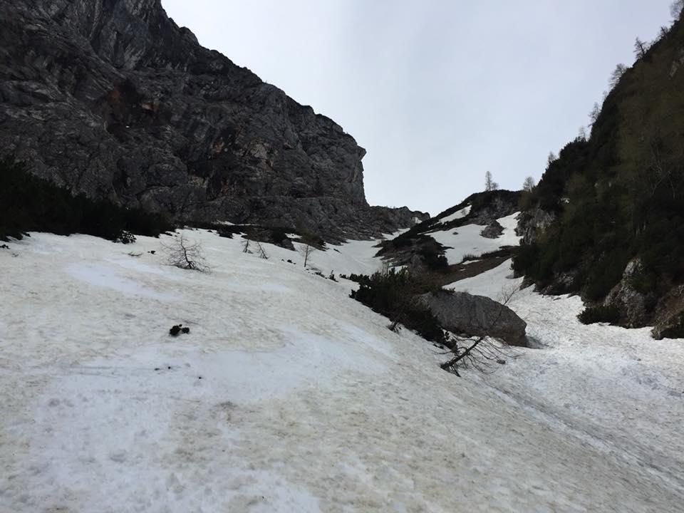 Vom Pötschen über die Nordrinne auf den Sarstein. Schnee ab 1150 m. Schon mit einigen Lücken. Insgesamt schon sehr dürftige Schneelage in der Nordrinne. Empfehlung gibts keine mehr...
