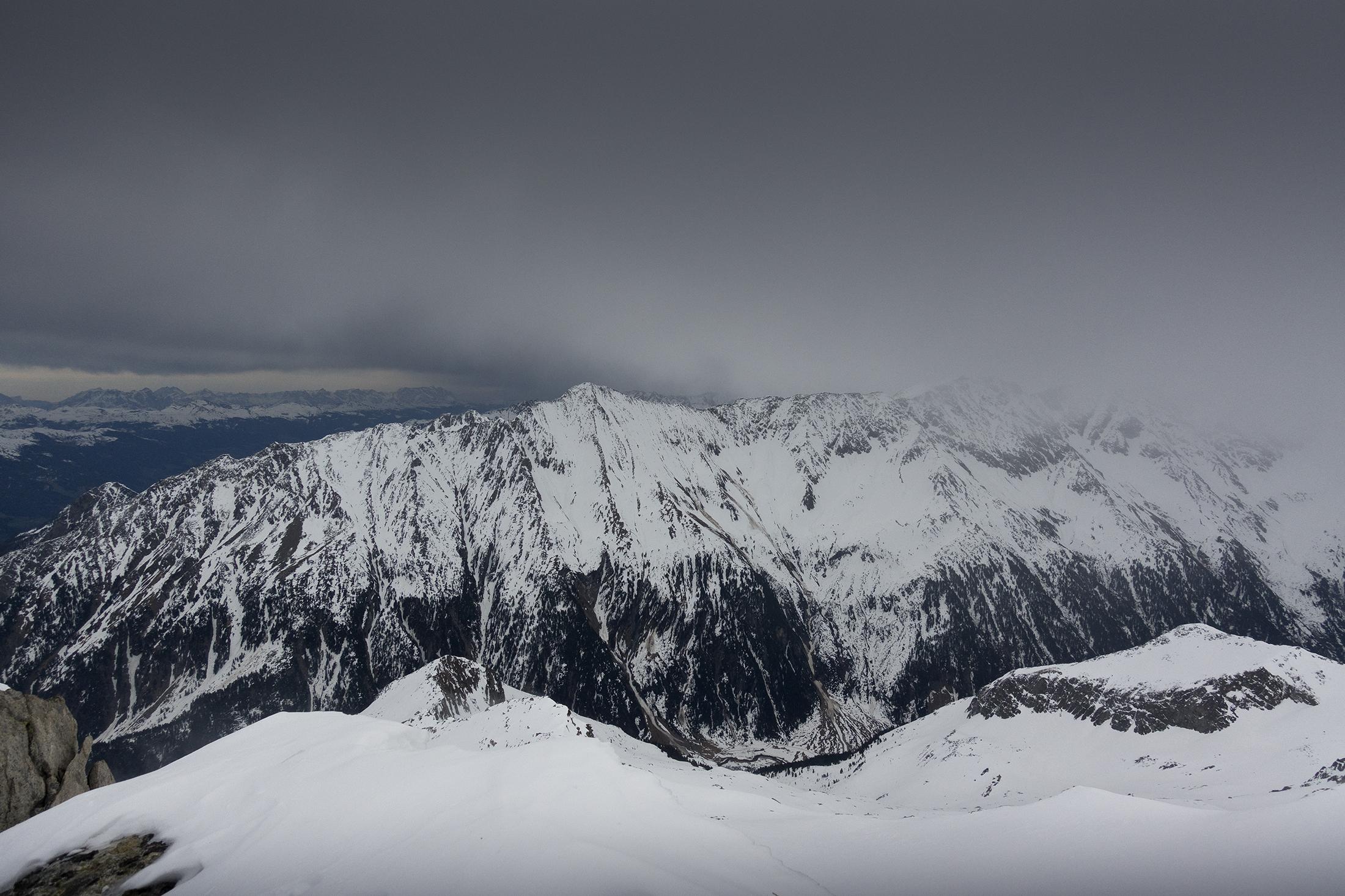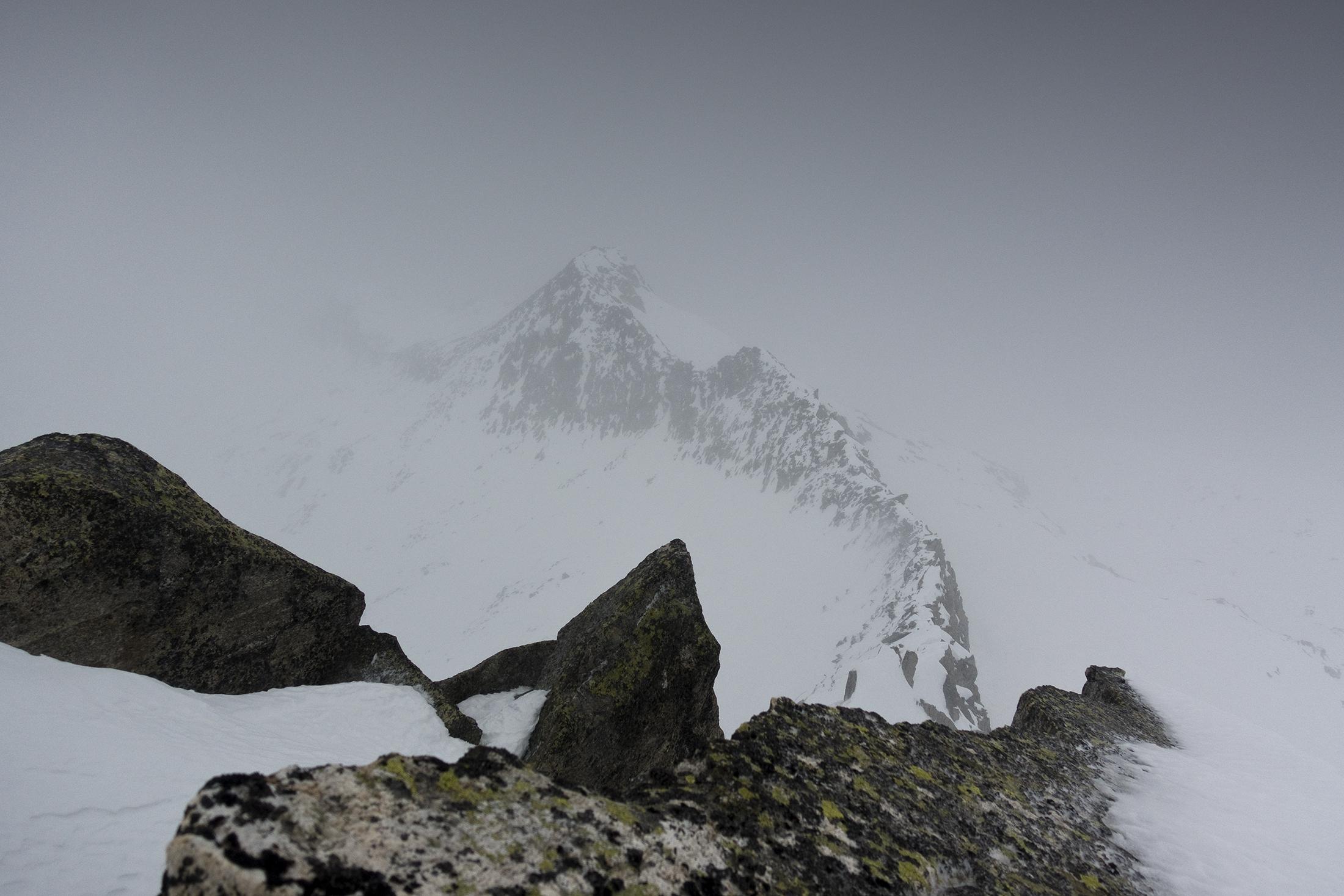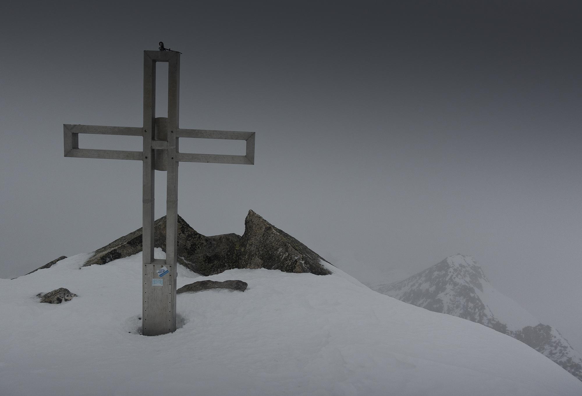 So edles Wetter wie im Rauriser Tal gab es hier heute nicht, der Wetterbericht hat nicht gepasst, es war von der Früh an bedeckt, und (unpassenderweise) am Gipfelgrat hatte ich Windböen, Schneefall und Nebel. Vormittags um 10 Uhr. Eine Stunde später dann blauer Himmel.