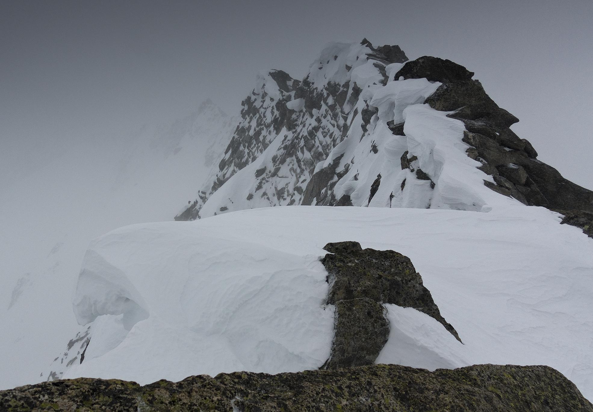 Der Gipfelgrat ist gut begehbar, nur die Schlüsselstelle etwas vereist, da sind Steigeisen angenehm.