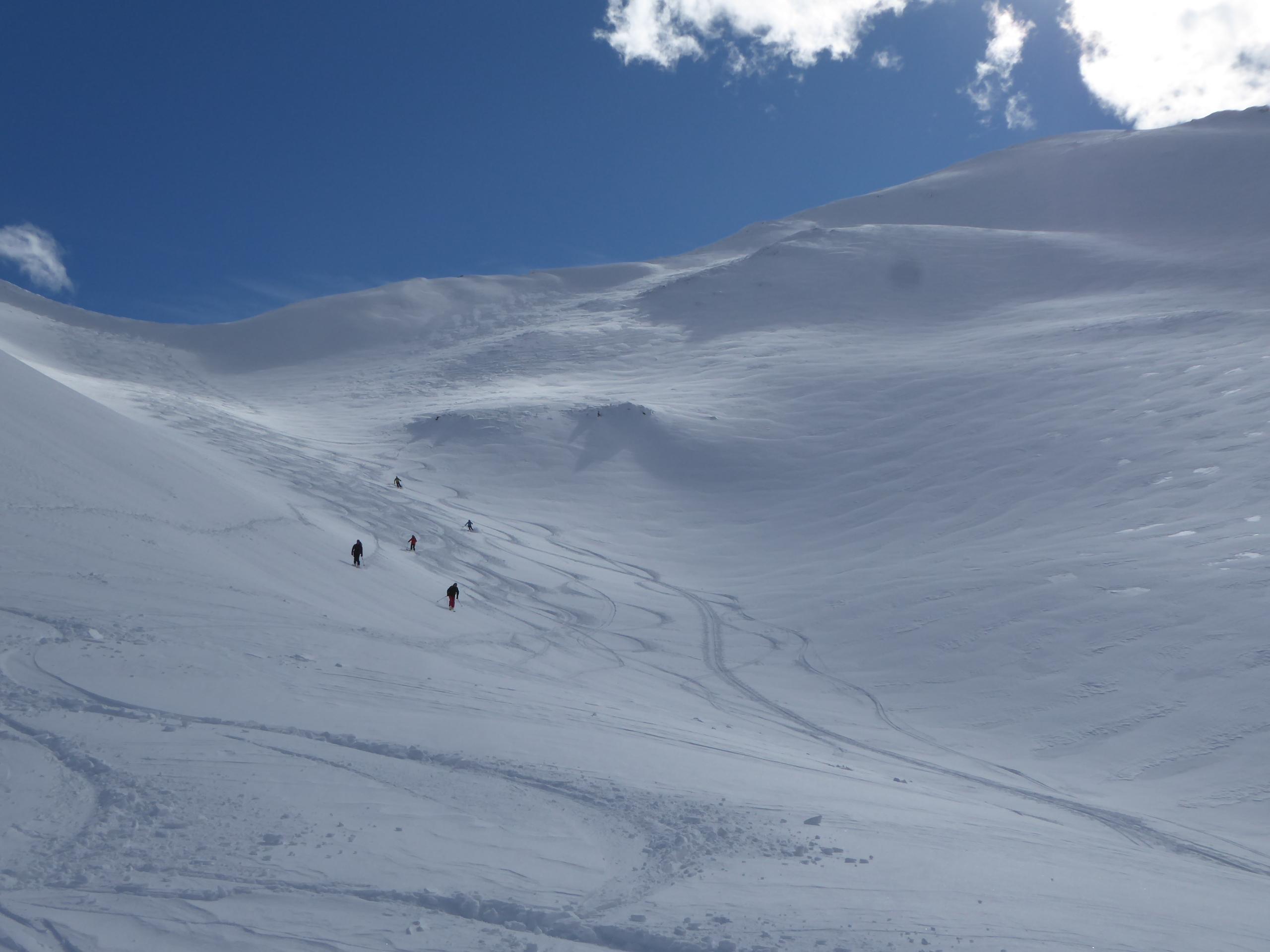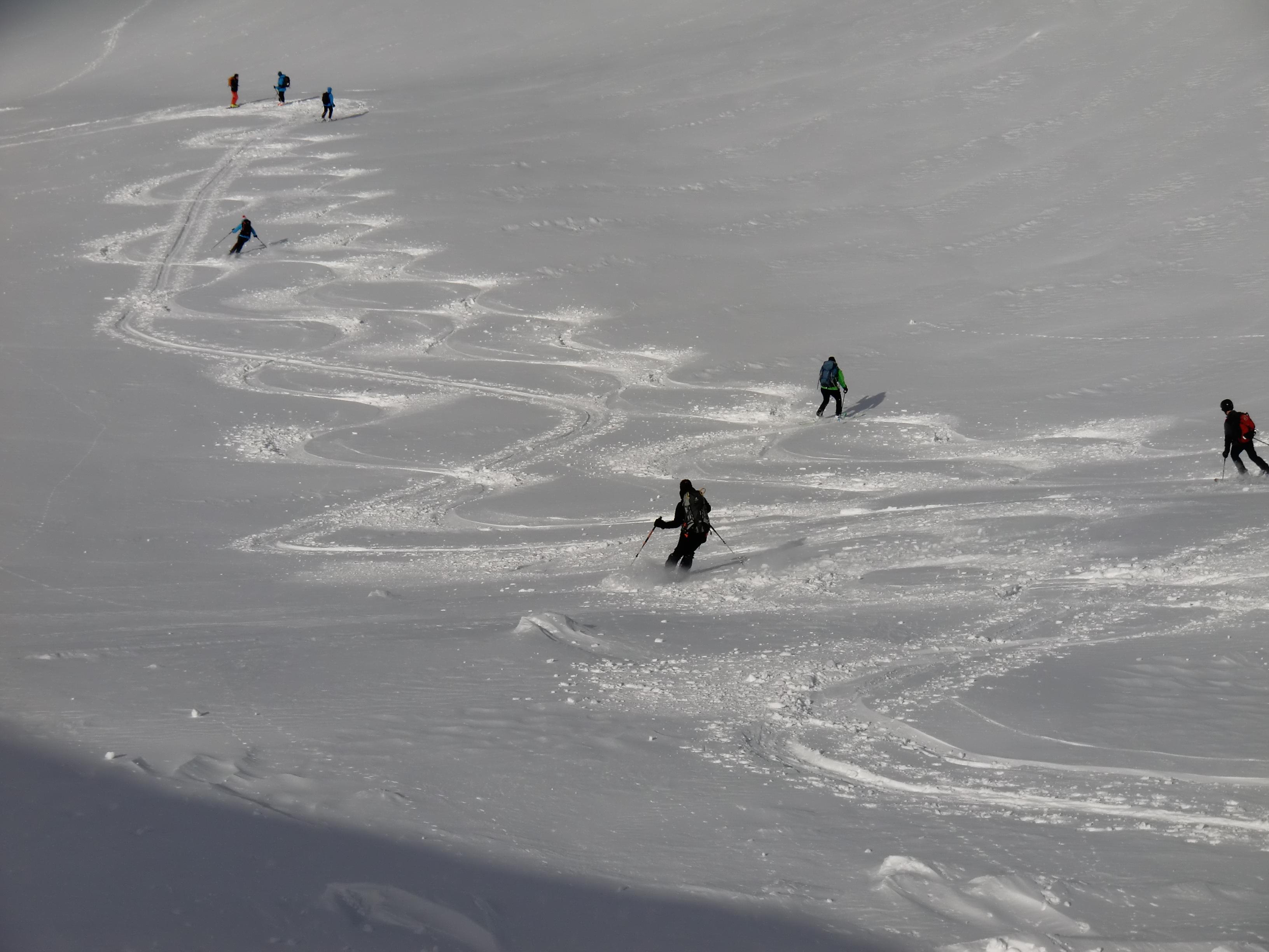 Schnee: Nur geringfügig angefeuchteter Pulver (3-10cm neu) auf tragendem Windharsch. Obwohl stark windbehandelt (Hauptkamm/Brenner-Föhnschneise!) leicht und sehr schön zu fahren.