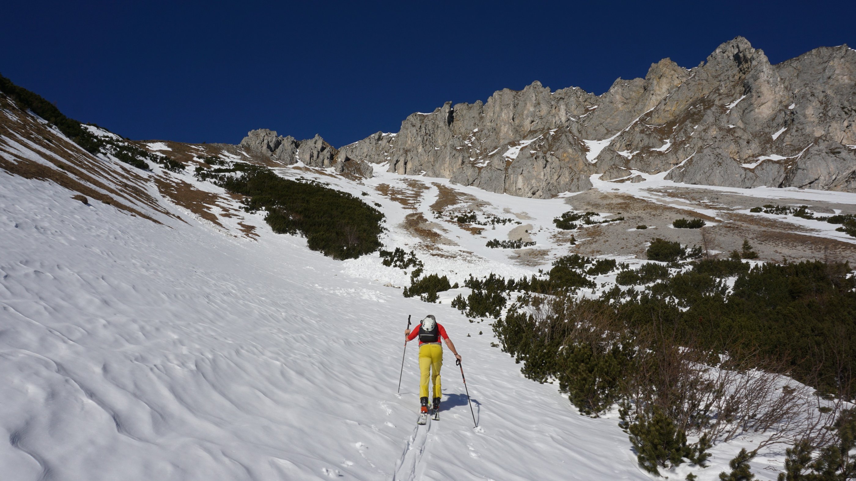 Gutes Zeitmanagement ermöglicht das Ansteigen durch diese steilen Bereiche völlig relaxt- und auf Harscheisen konnte verzichtet werden. Sehr sichere Bedingungen aus Sicht der Lawinenrisikoeinschätzung. Um derartiges aber sicher unternehmen zu können ist eine sehr gute Gebietskenntnis erforderlich und wir steigen an solchen "Märztagen" stets die geplante Abfahrtslinie auch an. Nur dann wissen wir genau was uns wo erwarten wird.