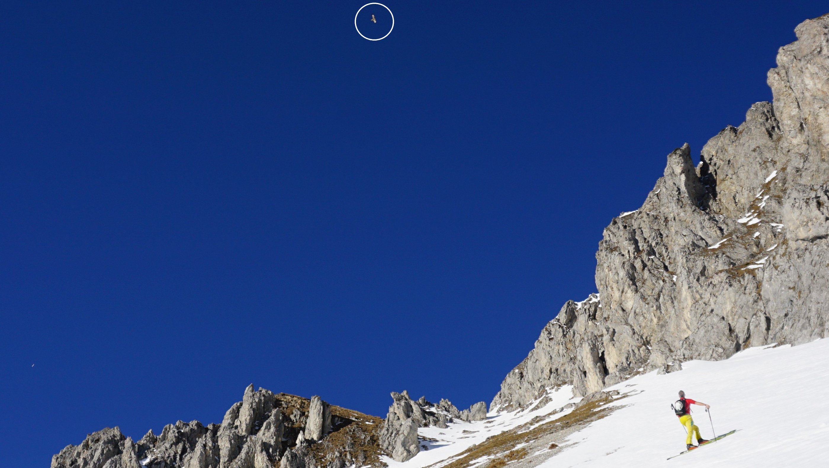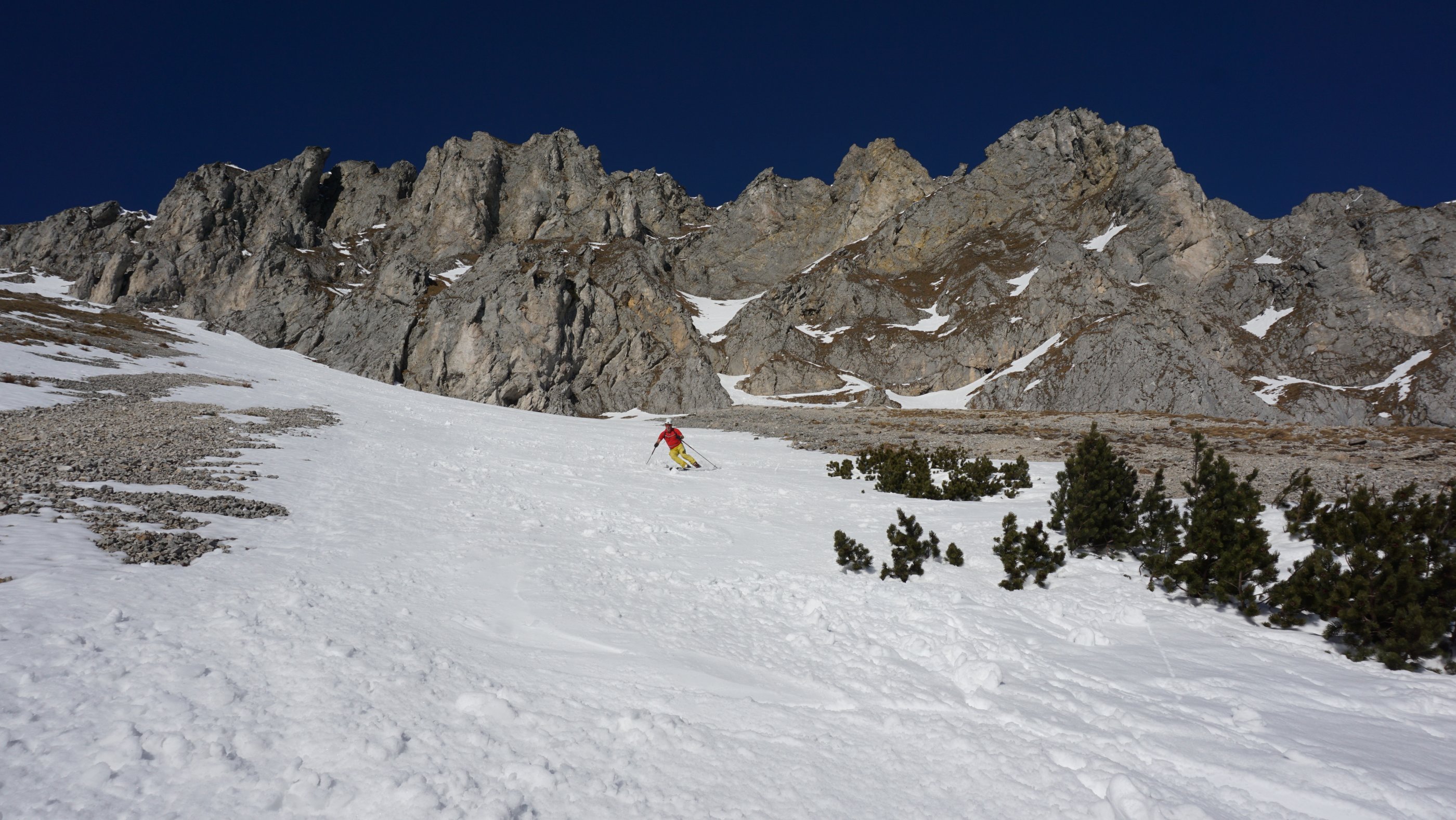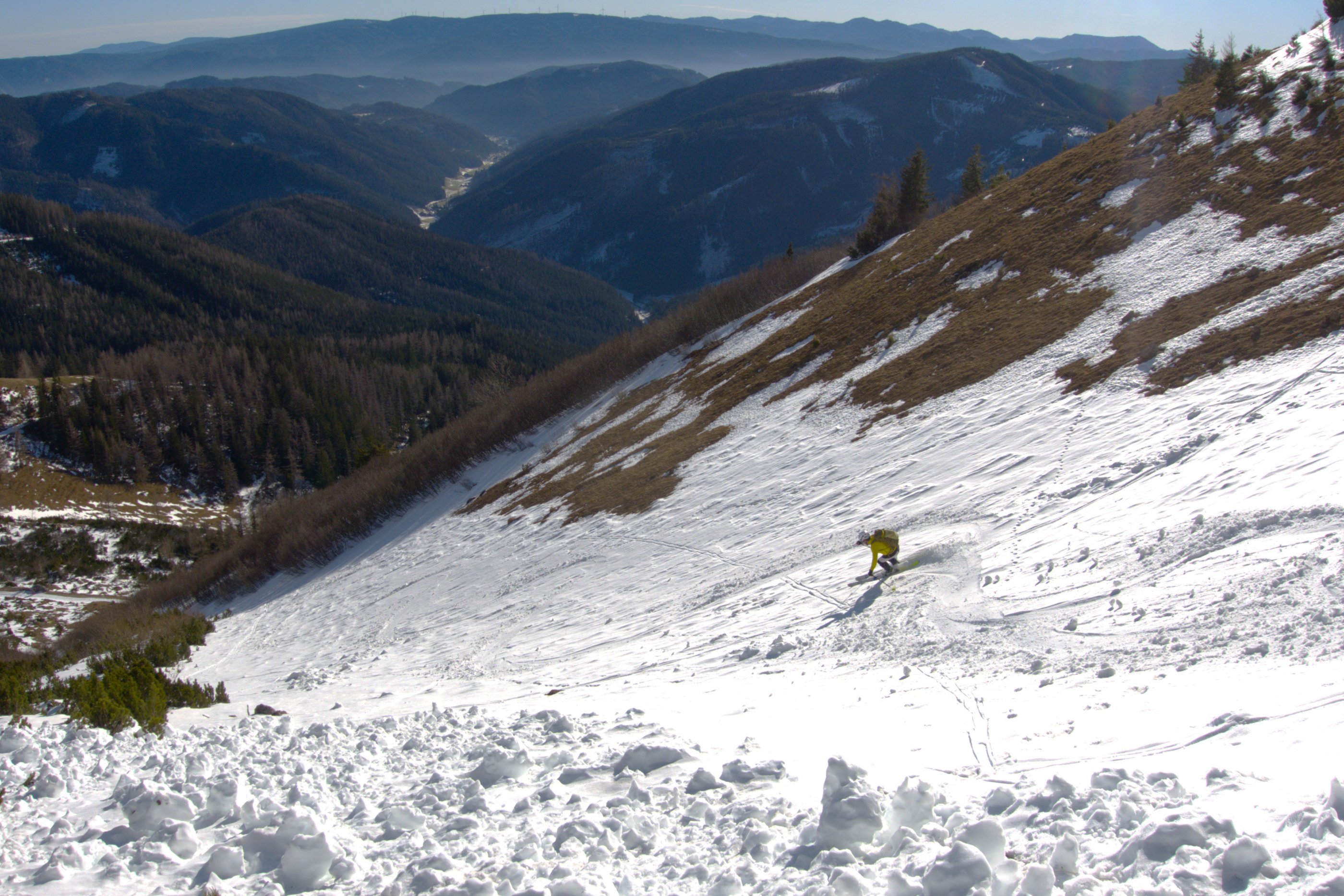 Flexibilität beginnt im Kopf. Wir könnten endlos jammern über die aktuelle Situation mit wenig Schnee- oder uns freuen über das stabile Hoch welches aktuell im Ostalpenraum vorliegt. Seit Tagen schon ist es wolkenlos und selbst unsere "Windberge" im Osten präsentieren sich windstill. Es liegen Märzbedingungen vor und wir haben beschlossen uns darüber zu freuen und dementsprechende Touren zu planen und zu unternehmen. Wie schön wars gestern am Turntaler Kogel und wie schön wars heute in den südseitigen Steilrinnen der Hohen Veitsch. Märzbedingungen: wir starten gemütlich um 09 Uhr am Brunnalmparkplatz und nutzen, wie eben im März durchaus üblich rasch mal nach der Arbeit, unsere Punktekarten und fahren mit dem Sessellift gemütlich hoch zur Bergstation. Es hatte -6°C in der Veitsch und nur noch -2°C auf der Brunnalm. Danach zappeln wir hinüber zum Breitriegel und dort steigen wir den "Erlenschlauch" der Breitriegel Südflanke hinauf. Oben angekommen wird anschließend im besten Firn dieser wieder runtergefahren- bis zum Schneeende. Dann steigen wir zum zweiten Mal am heutigen Tag an. Diesmal zieht es uns in die Breitriegel Ostflanke. Märzbedingungen heißt, dass wir von unten nach oben versuchen eine durchgängig fahrbare Linie zu finden- und das gelingt uns. Im letzten Drittel begleitet uns ein guter alter Bekannter- ein kleine Adler welcher uns heuer öfter beim Klettern genau hier besucht hatte. Wunderschön. Von oben kommt uns dann mit Klaus ein weiterer absoluter Gebietskenner entgegen. Gerne tauscht man sich über die beste Abfahrtsmöglichkeit aus.