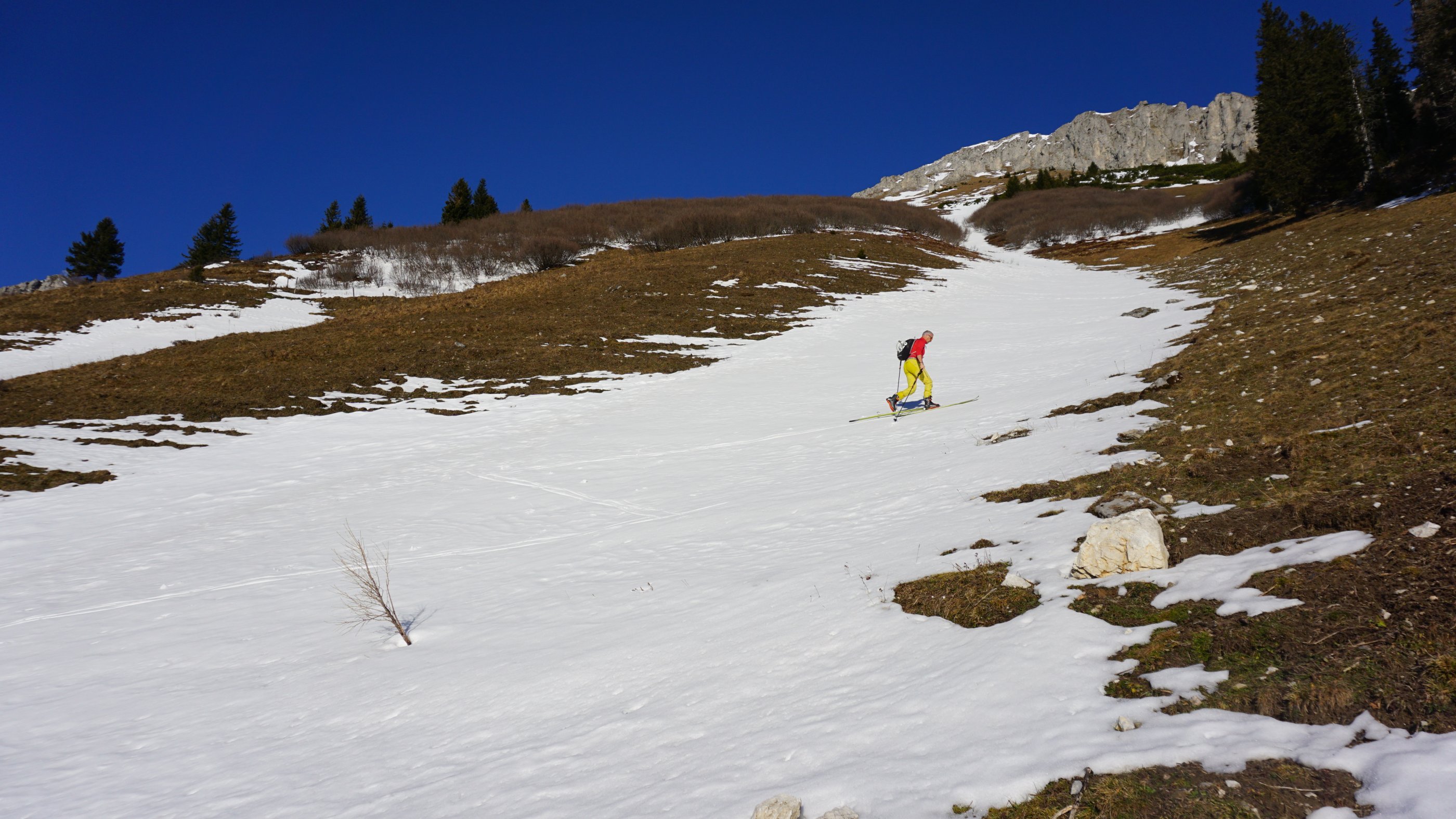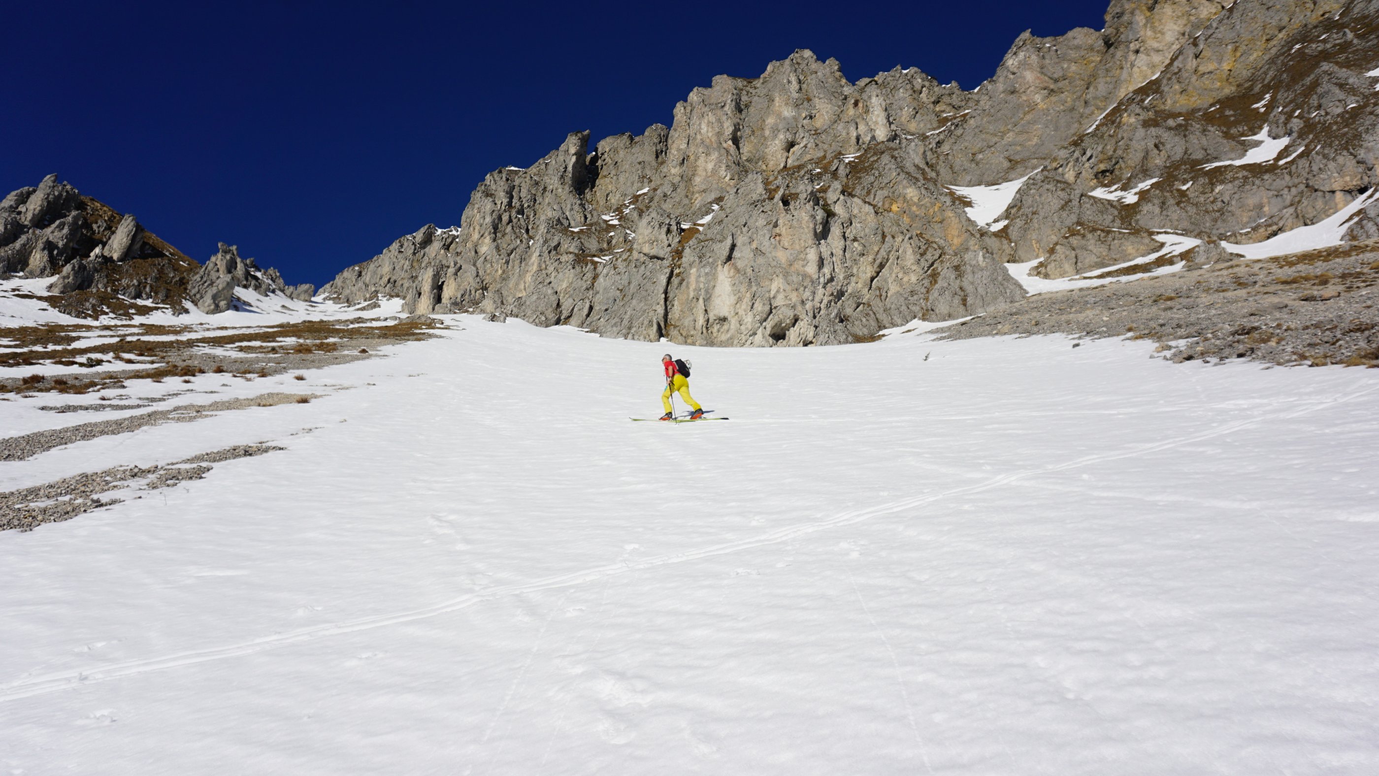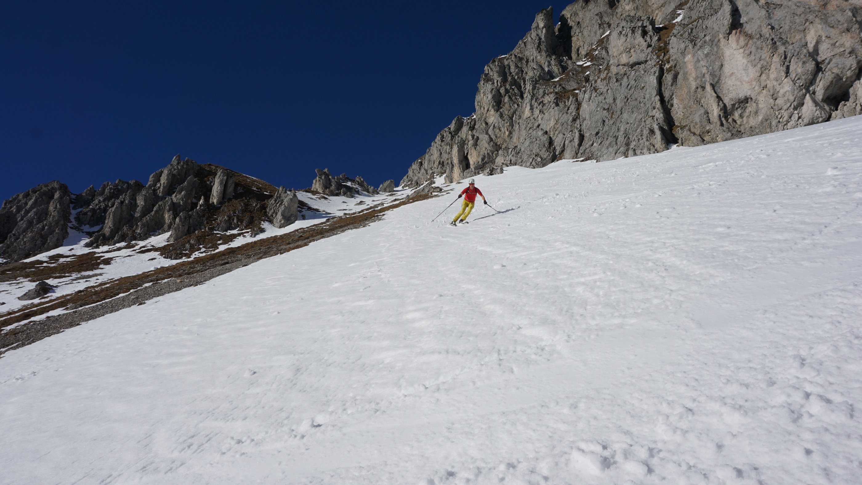 Flexibilität beginnt im Kopf. Wir könnten endlos jammern über die aktuelle Situation mit wenig Schnee- oder uns freuen über das stabile Hoch welches aktuell im Ostalpenraum vorliegt. Seit Tagen schon ist es wolkenlos und selbst unsere "Windberge" im Osten präsentieren sich windstill. Es liegen Märzbedingungen vor und wir haben beschlossen uns darüber zu freuen und dementsprechende Touren zu planen und zu unternehmen. Wie schön wars gestern am Turntaler Kogel und wie schön wars heute in den südseitigen Steilrinnen der Hohen Veitsch. Märzbedingungen: wir starten gemütlich um 09 Uhr am Brunnalmparkplatz und nutzen, wie eben im März durchaus üblich rasch mal nach der Arbeit, unsere Punktekarten und fahren mit dem Sessellift gemütlich hoch zur Bergstation. Es hatte -6°C in der Veitsch und nur noch -2°C auf der Brunnalm. Danach zappeln wir hinüber zum Breitriegel und dort steigen wir den "Erlenschlauch" der Breitriegel Südflanke hinauf. Oben angekommen wird anschließend im besten Firn dieser wieder runtergefahren- bis zum Schneeende. Dann steigen wir zum zweiten Mal am heutigen Tag an. Diesmal zieht es uns in die Breitriegel Ostflanke. Märzbedingungen heißt, dass wir von unten nach oben versuchen eine durchgängig fahrbare Linie zu finden- und das gelingt uns. Im letzten Drittel begleitet uns ein guter alter Bekannter- ein kleine Adler welcher uns heuer öfter beim Klettern genau hier besucht hatte. Wunderschön. Von oben kommt uns dann mit Klaus ein weiterer absoluter Gebietskenner entgegen. Gerne tauscht man sich über die beste Abfahrtsmöglichkeit aus.