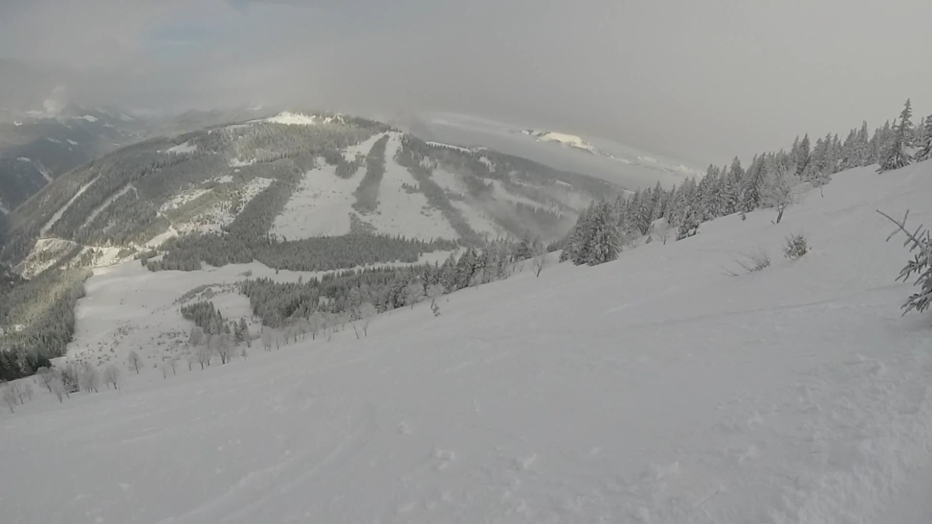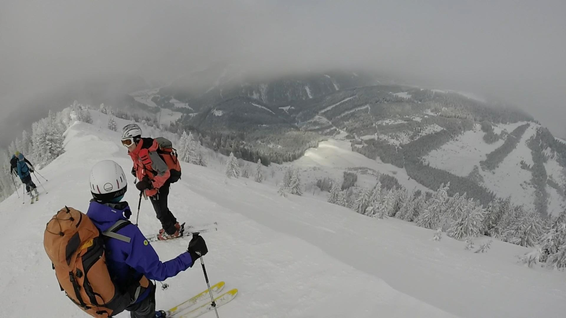 Königsberger Horn Nordhang immer wieder schön zu fahren. Beim Aufstieg war der Nordhang noch im Hochnebel ab 1200m dann starker Ostwind mit Verfrachtungsstärke der auch den Nebel aus der dem Hang vertrieb. Kurz vorm Gipfel und am Gipfel windstill. Bei der Abfahrt gute Sicht und teilweise Sonnenschein.