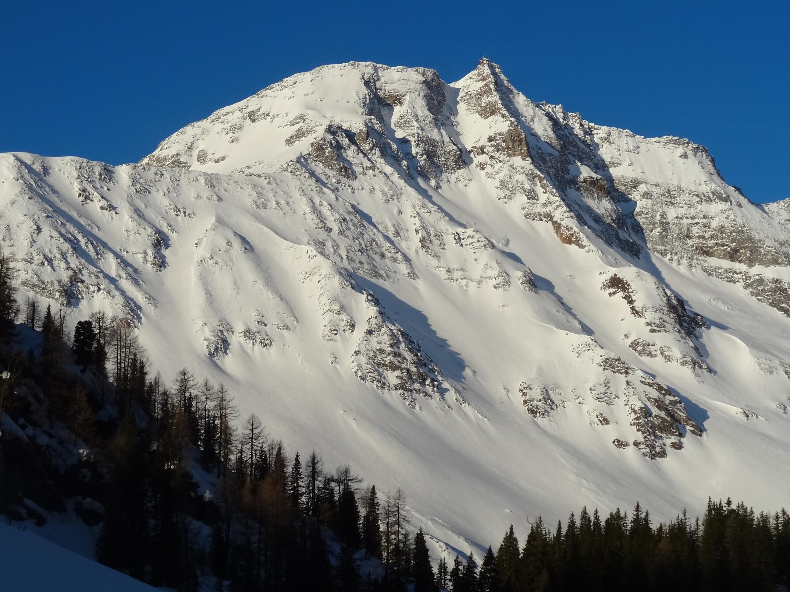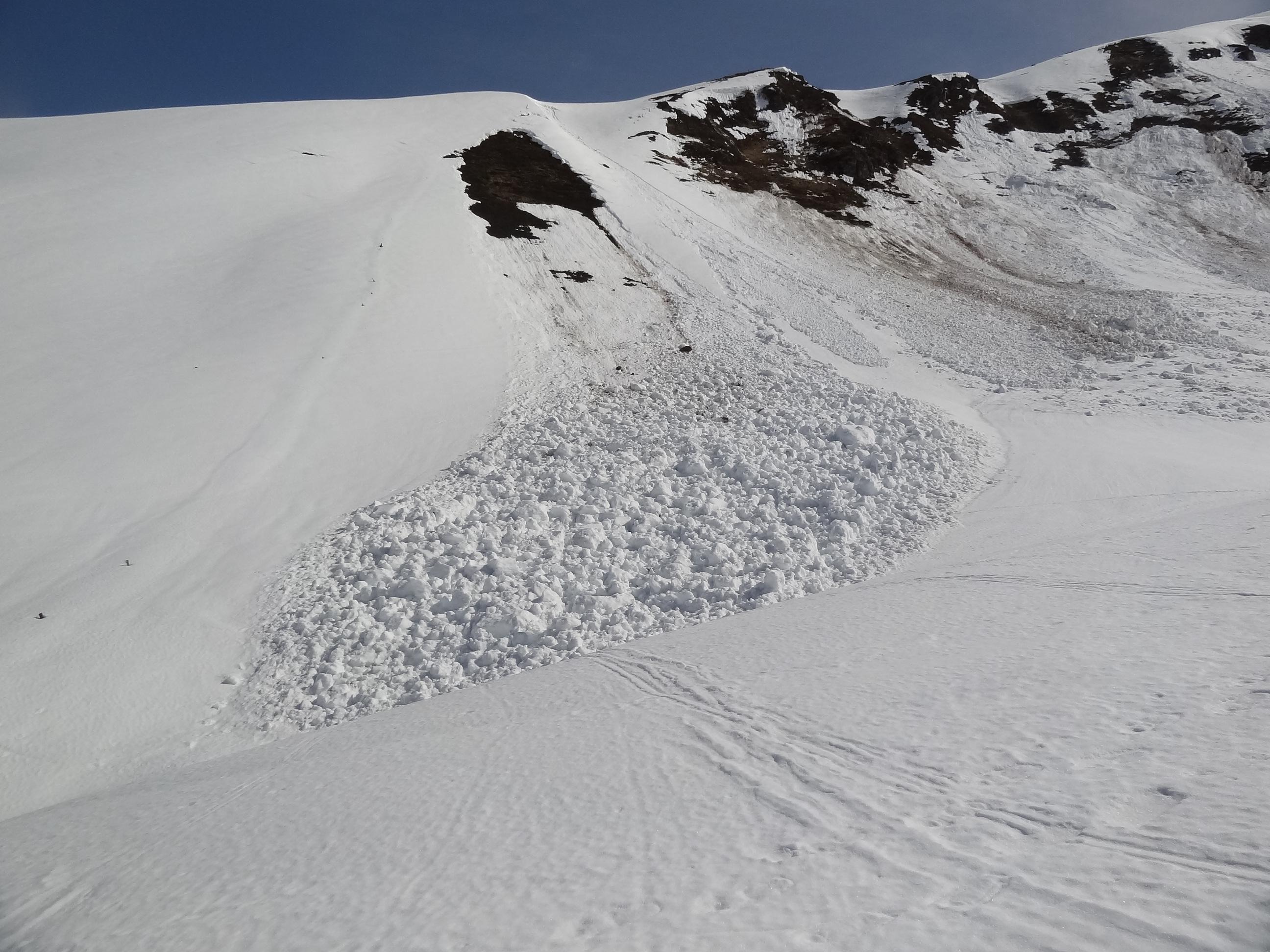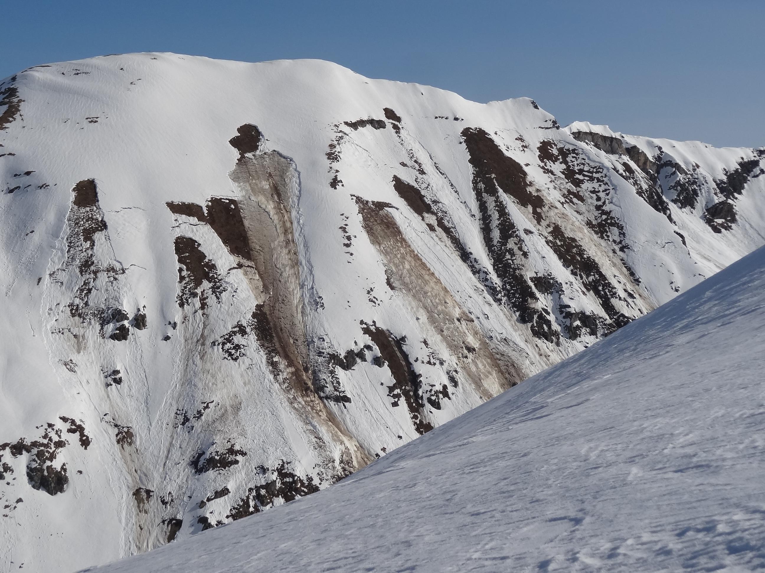 Aus den sehr steilen Westhängen des Silberpfennigs sind am Vortag zahlreiche mittlere und größere Nassschneelawinen abgegangen.