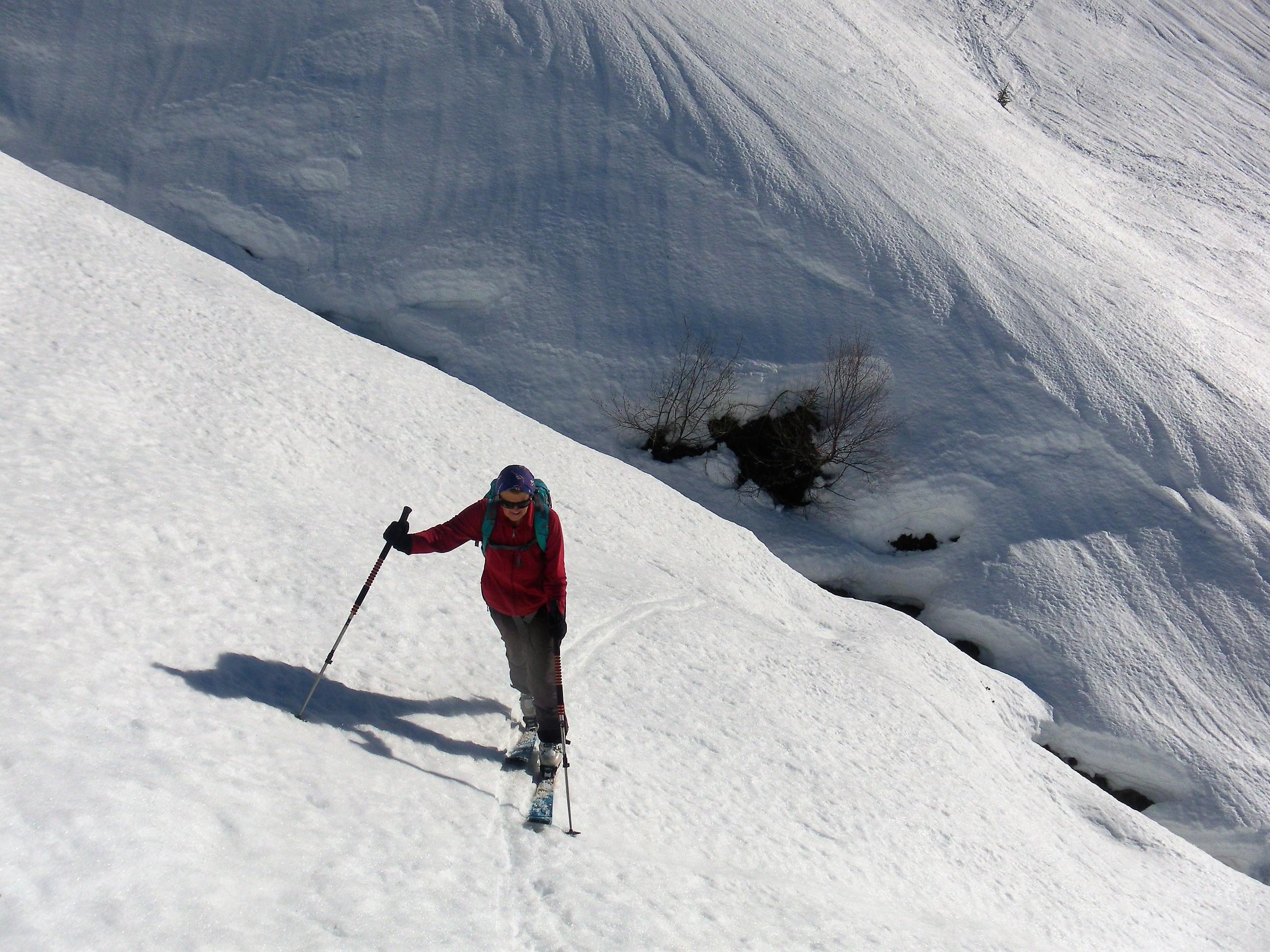 Die Rodelbahn ist bis zur Bochumer Hütte bockhart mit Glatteislinsen. Die Almwiesen und der NW-Rücken zum Rauber und Saalkogel bieten stabilen und kompakten Harsch, der heute nicht so recht aufweichen wollte. Einige Inseln mit wenigen cm Triebschnee ließen kurz Pulverfreude aufkommen. Auch die feinen SW Hänge zur Oberkaseralm blieben hart, ideale Harschabfahrt! (Nani Klapperts herrliche SO Hänge hatten heute deutlich mehr direkte Sonne abbekommen! Uns fehlte Firn, wir dachten es könnte zu tief werden...).