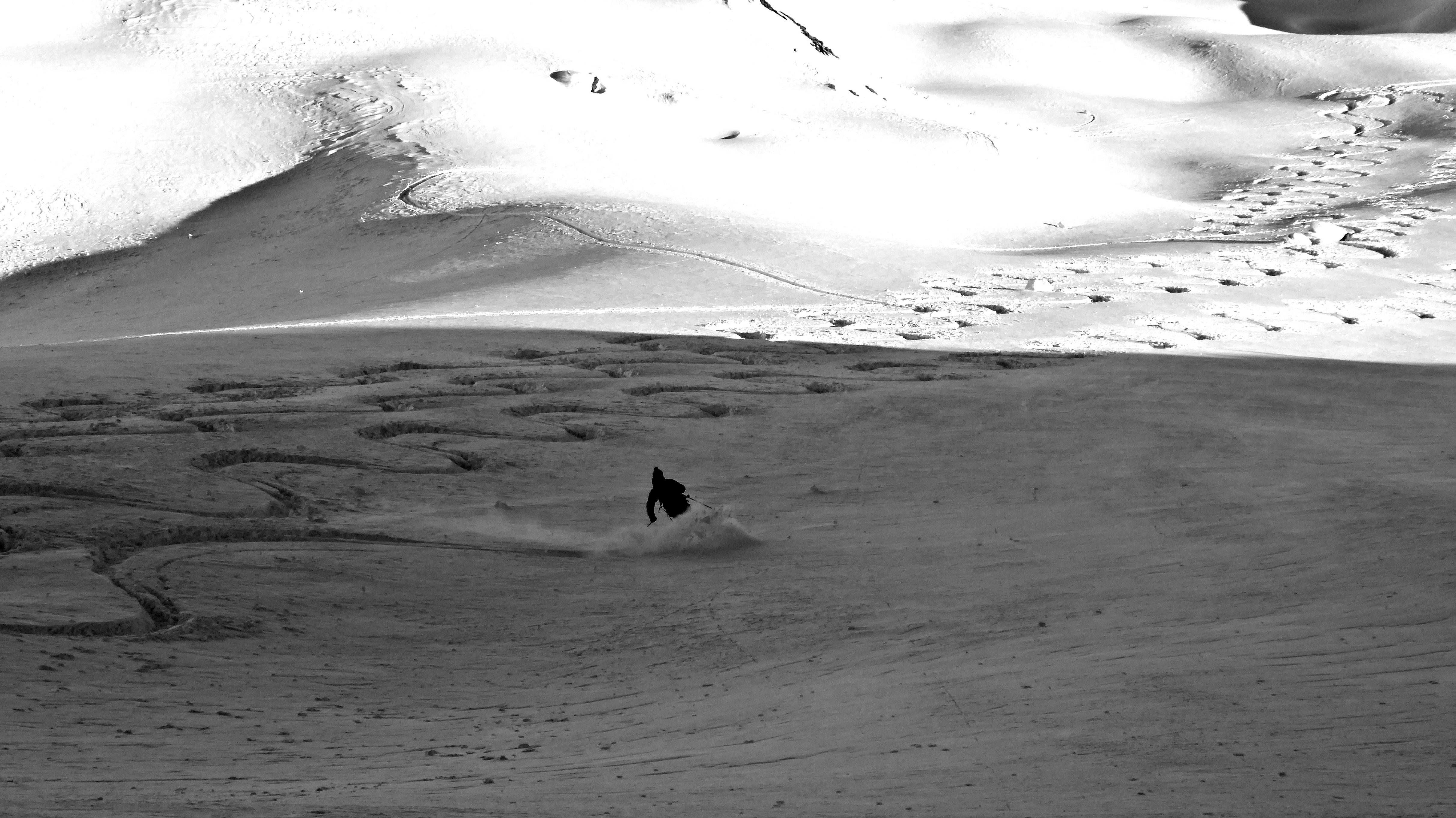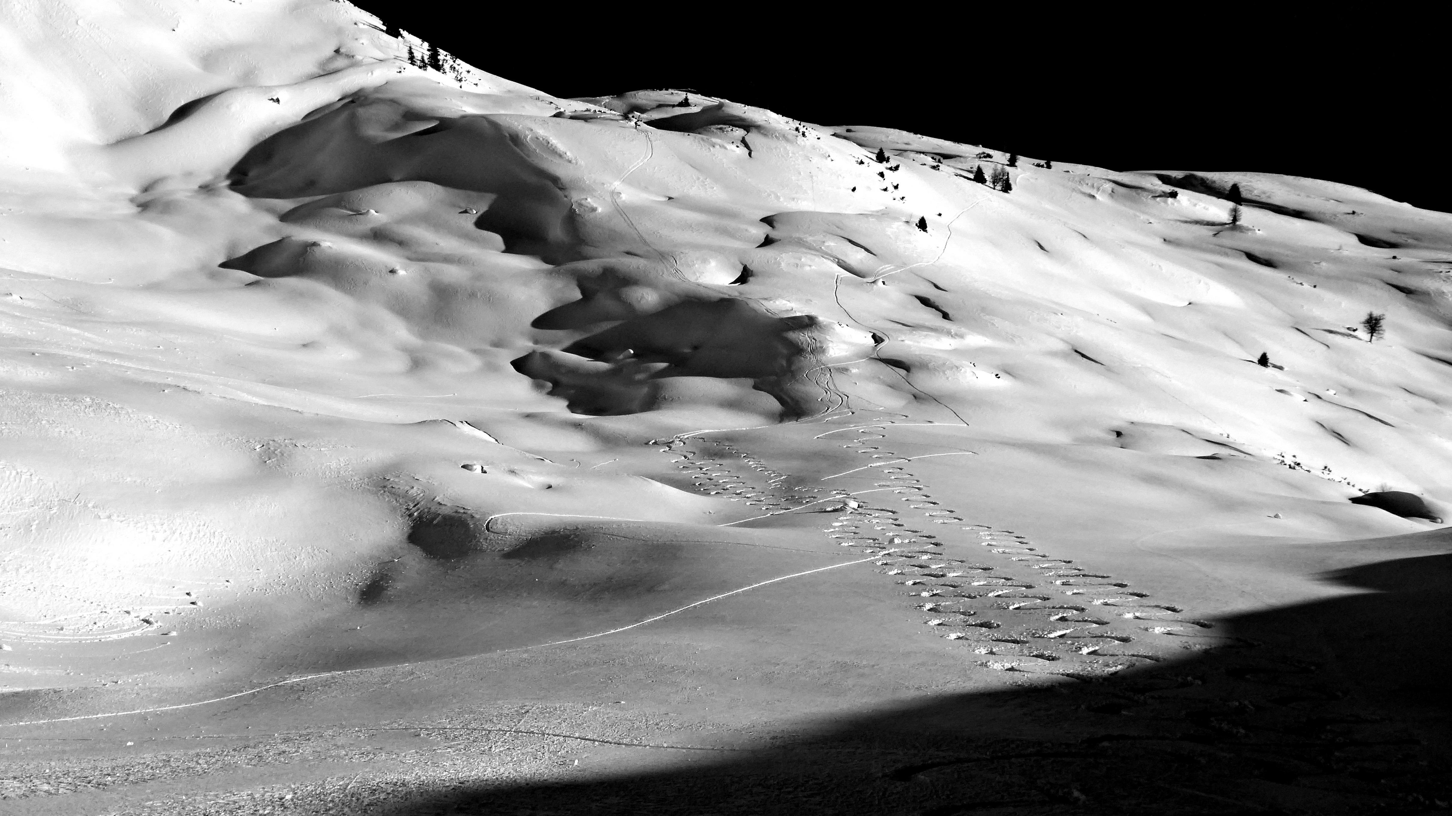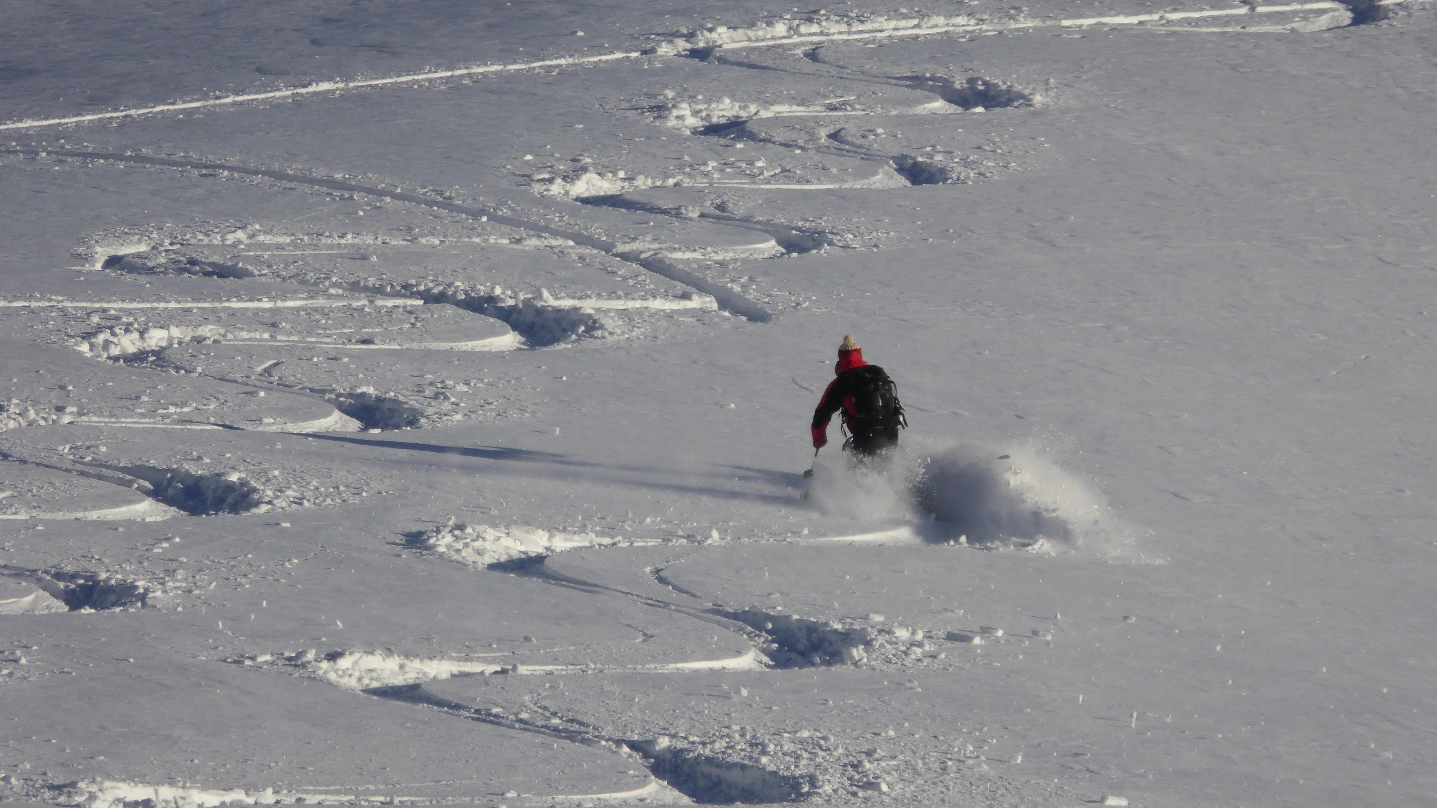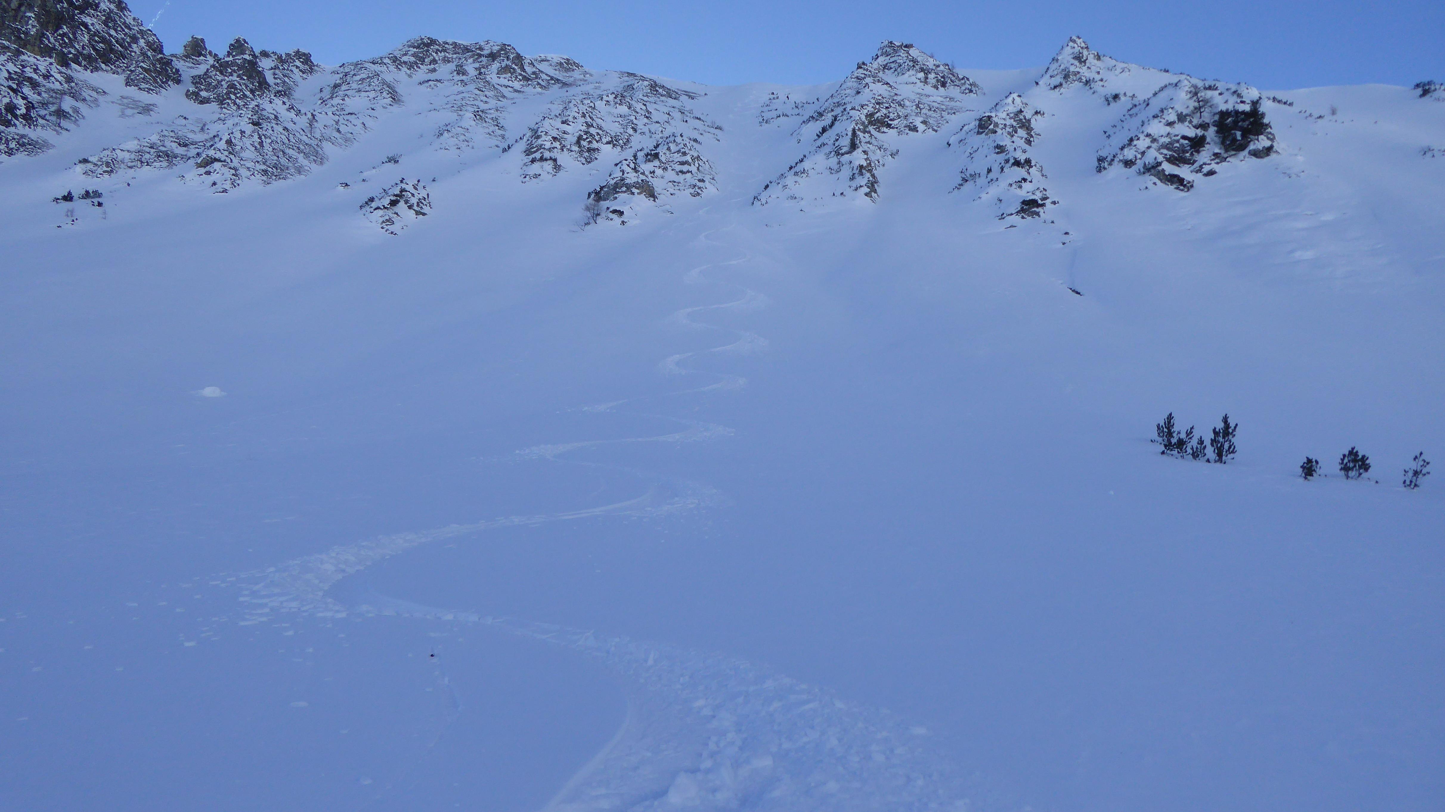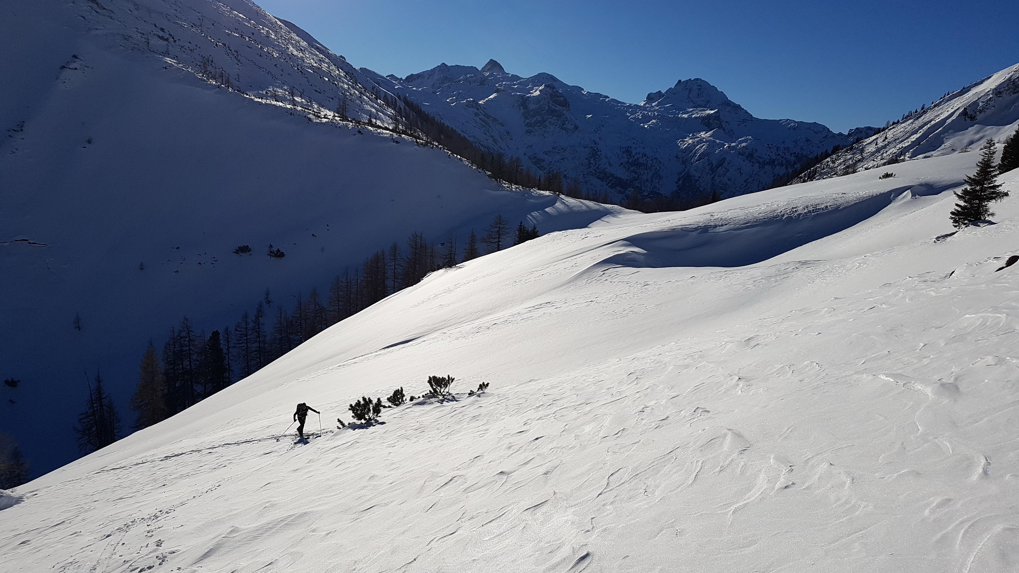 ...die Kammbereiche zwischen 2.000 und 2.200 m deutlich windbeeinflusst, der in den Leelagen befindliche Triebschnee war aber augenscheinlich gut gebunden und zumindest in dieser Höhenlage nicht zu stören. Die steileren sonnseitigen Hänge waren schon etwas "angestochen" und hatten einen leichten Deckel - in geschützteren, schattseitigen Bereichen aber noch jede Menge Powder und...jede Menge Platz ;-)