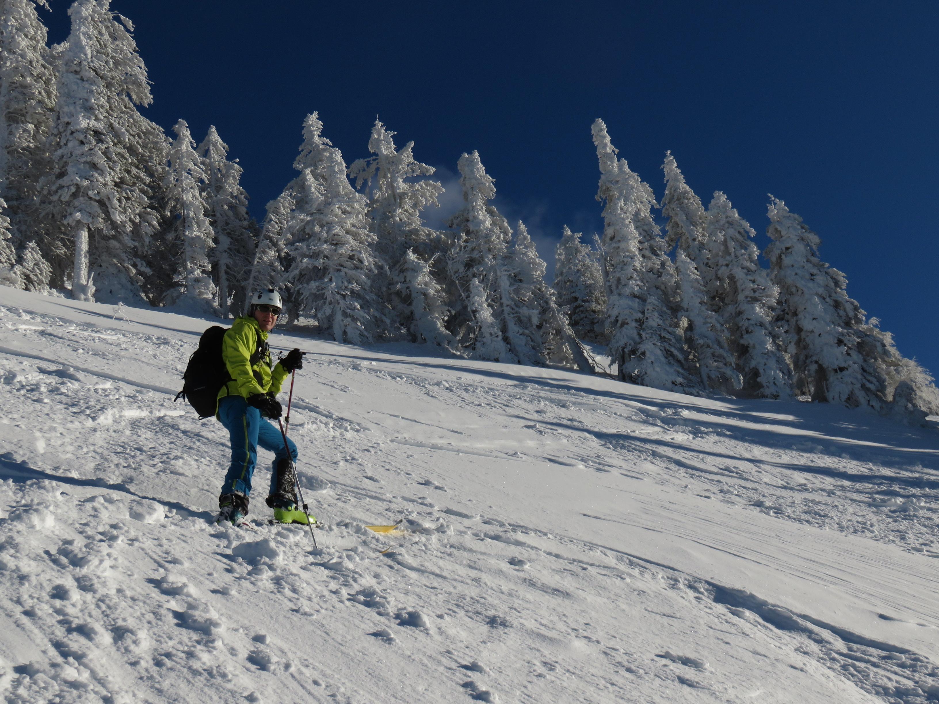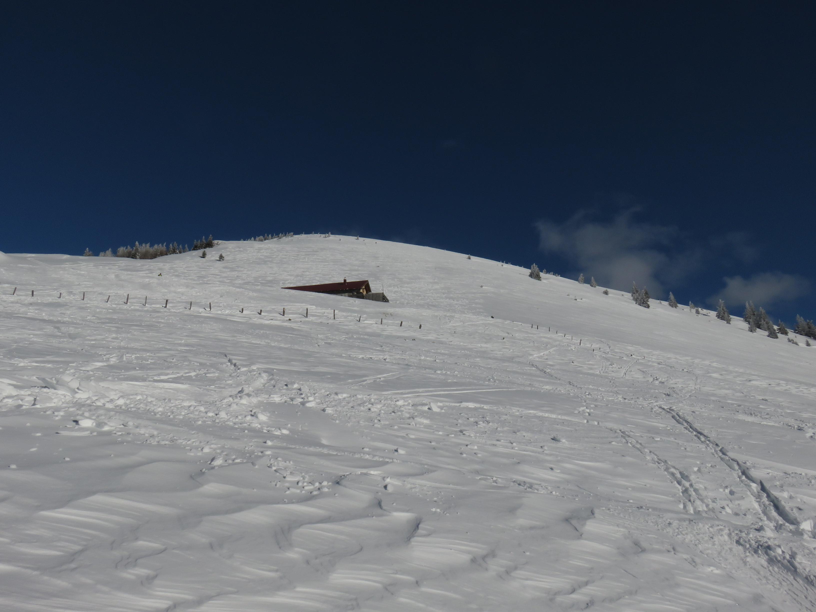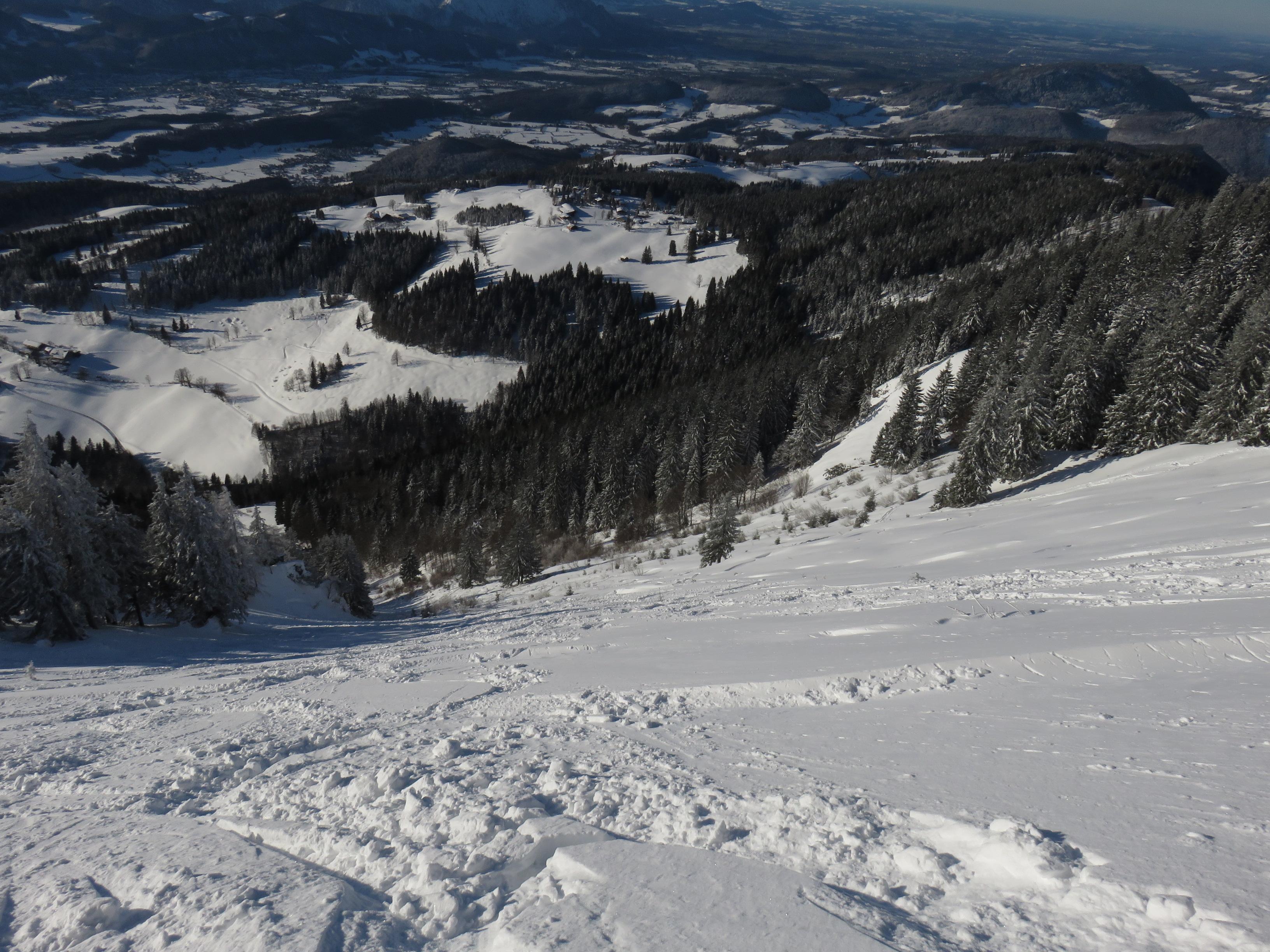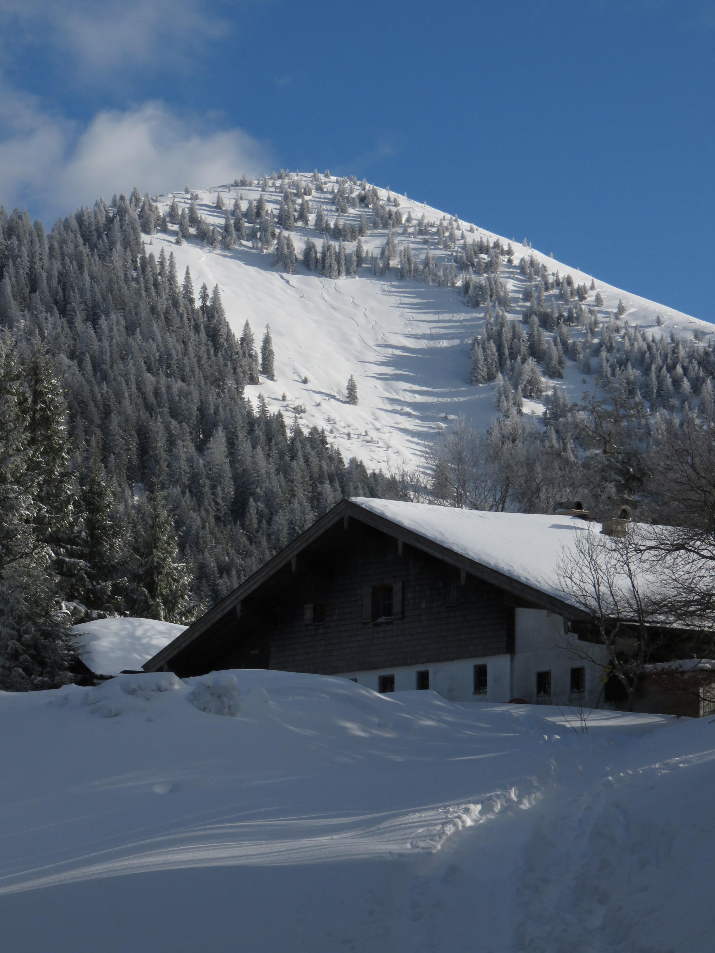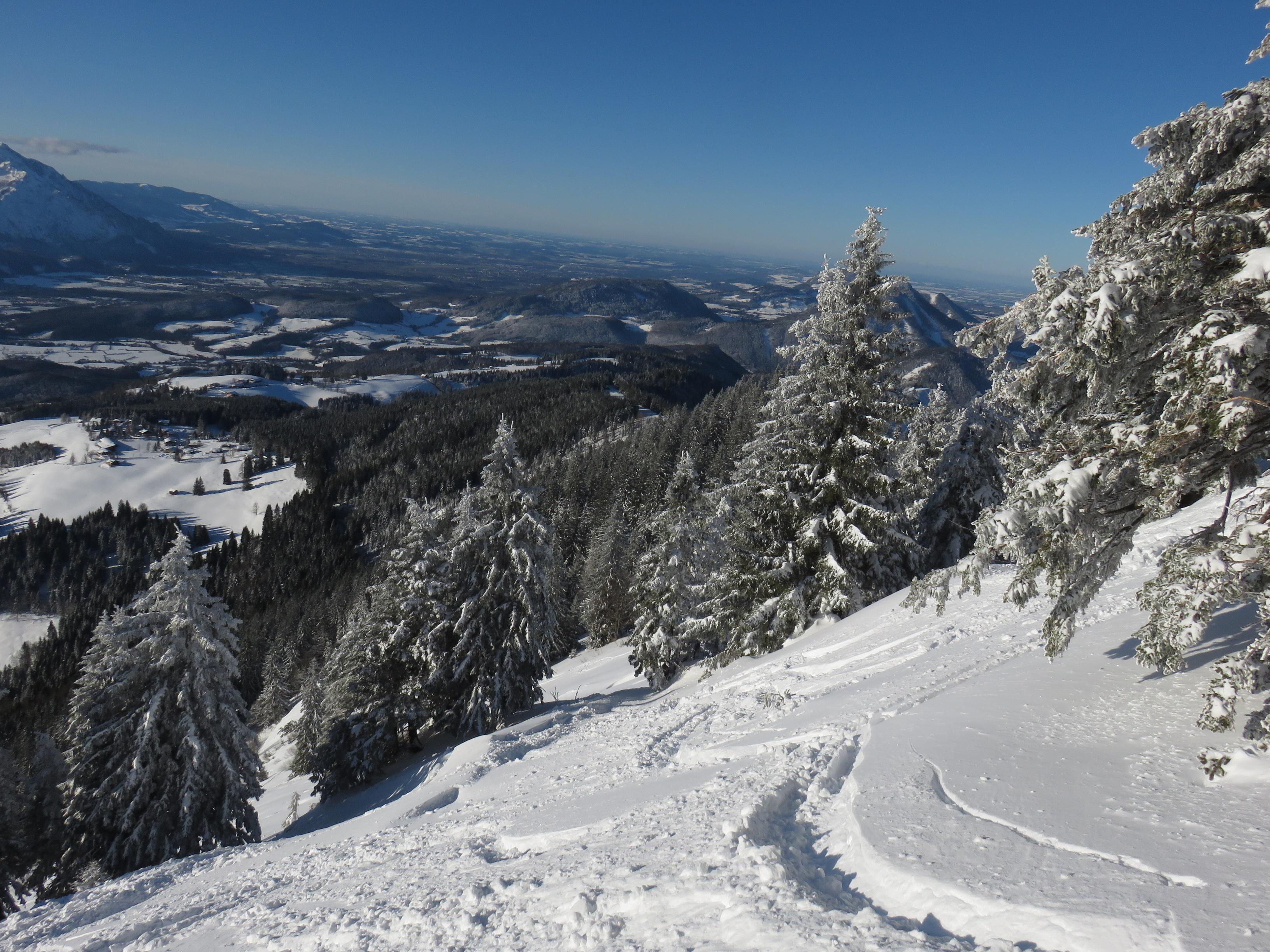 Schnee: Im Wald feiner Pulver ca. 30cm von der Schleckenalm zum Gipfel etwas windbehandelt teils harschige Oberfläche. Bei der Abfahrt in der Schlenkenrinne feiner lockerer Pulver. Bereits viele Abfahrtsspuren in der Schlenkenrinne.