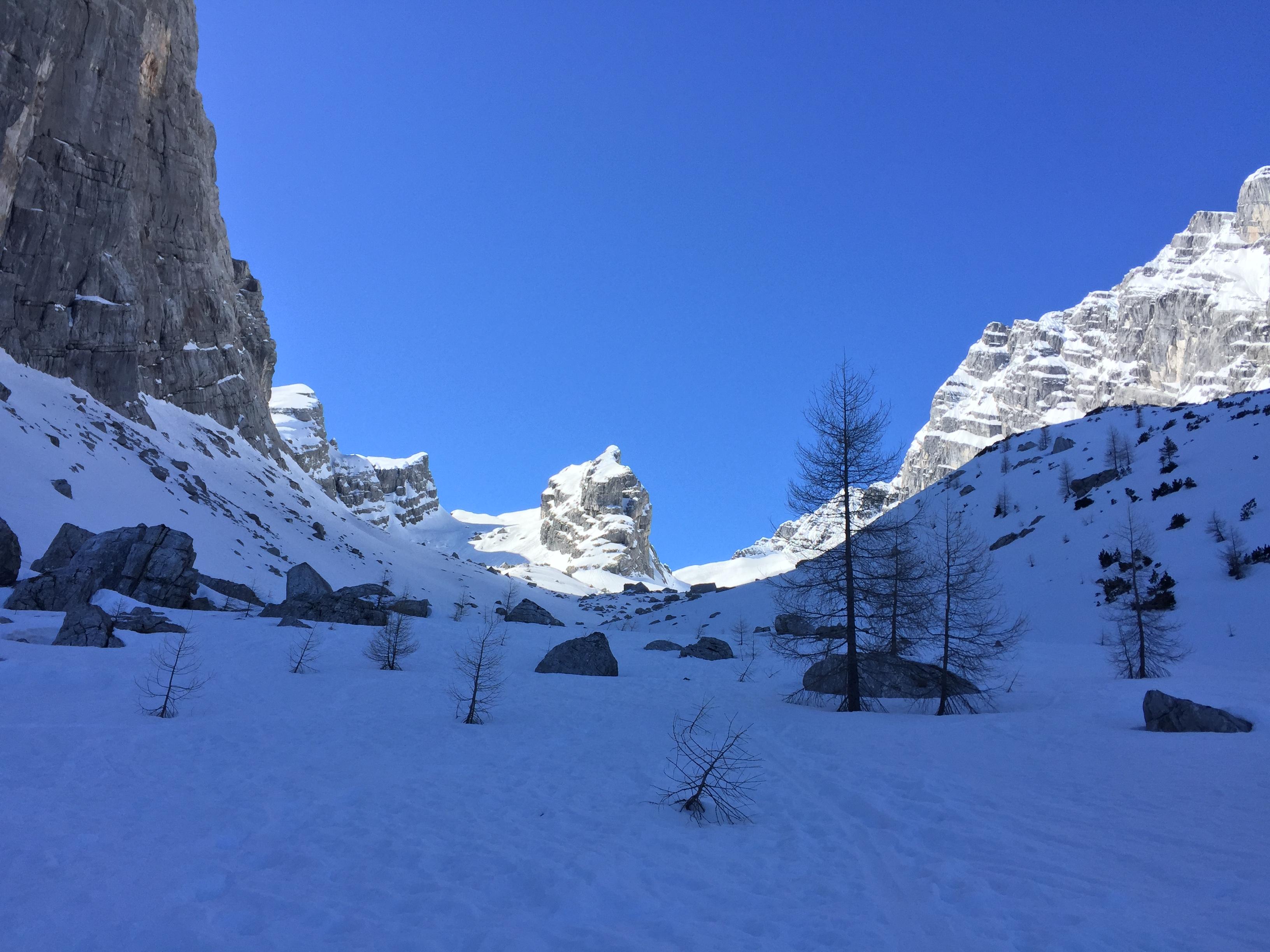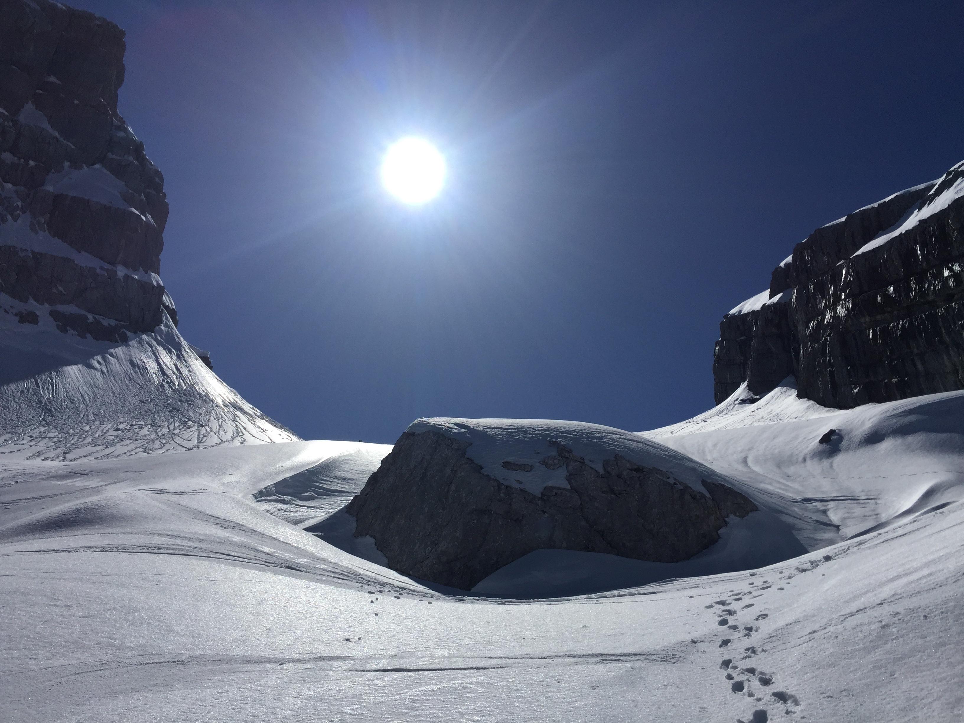 Die noch geschlossene Schneedecke beginnt gut 5 Minuten oberhalb der Bezinkurve, ist unten weich und im oberen Kar vormittags durchgefroren (-> Harscheisen) und später mit Sonenneinwirkung schön aufgefirnt.