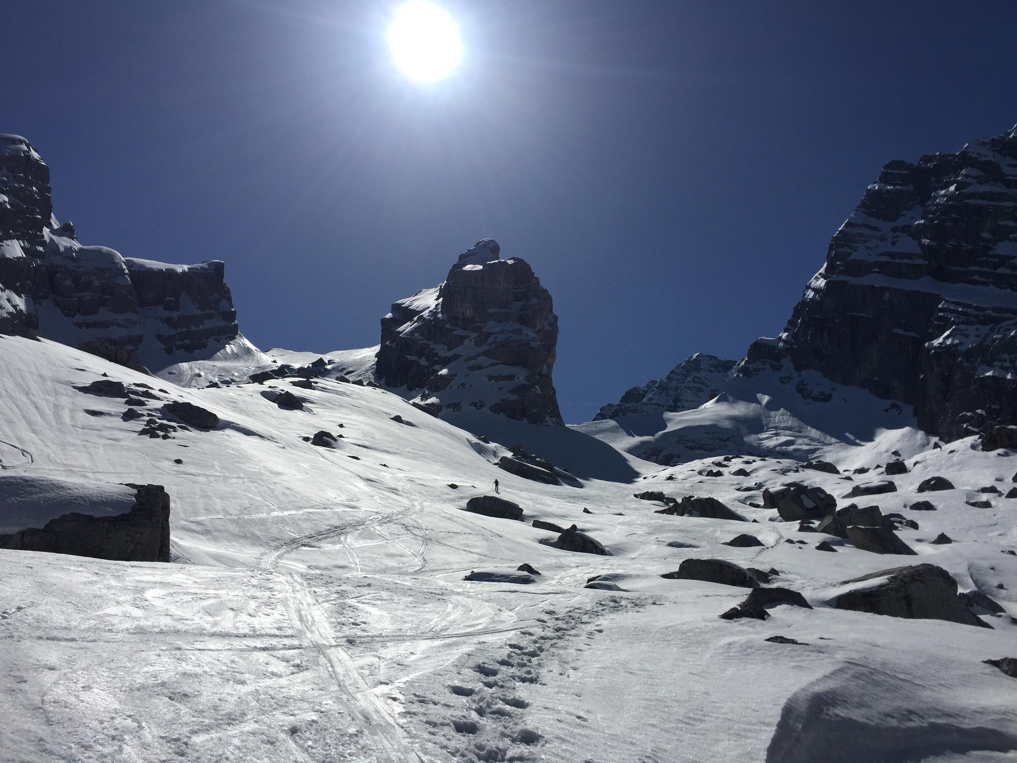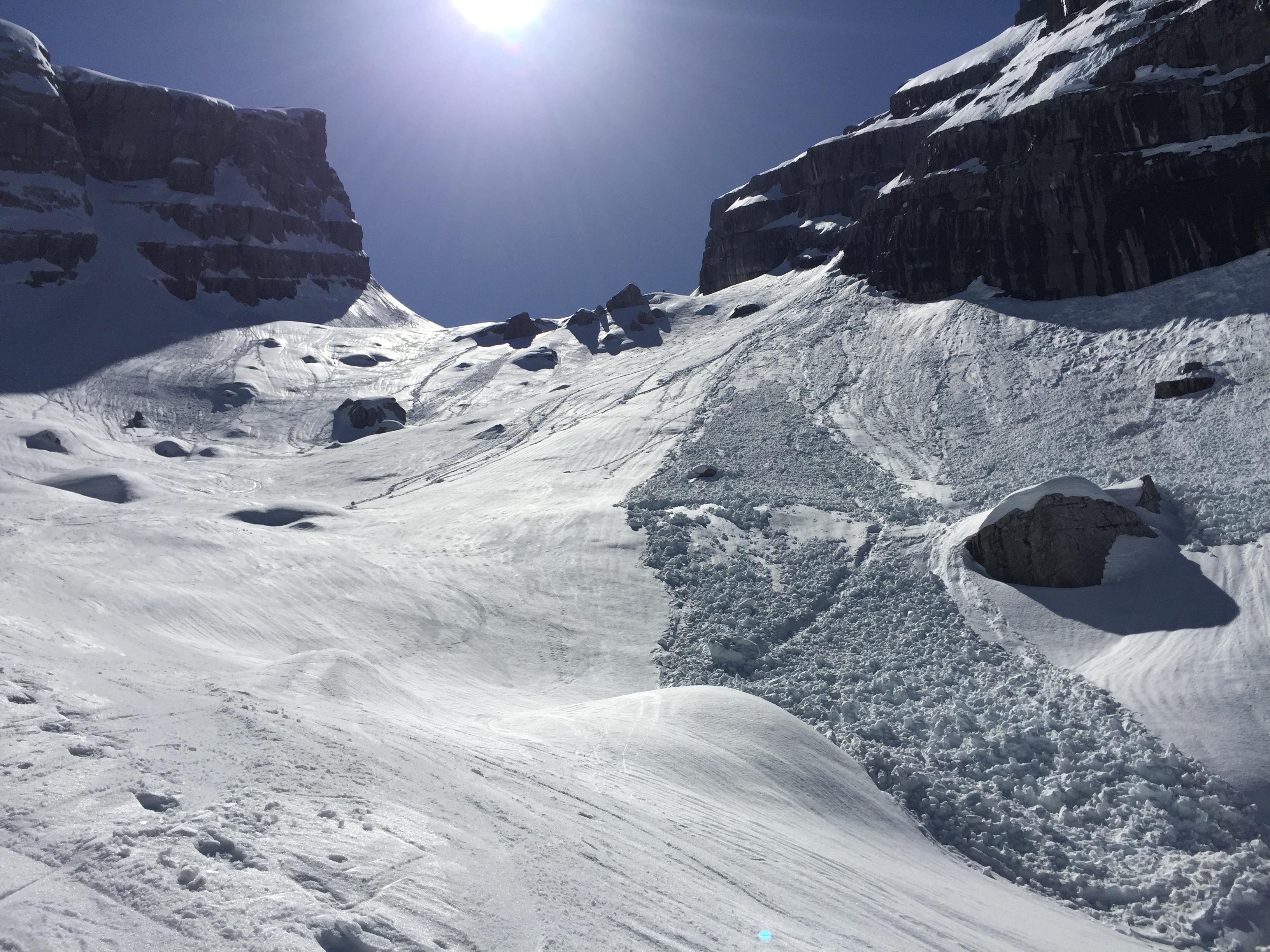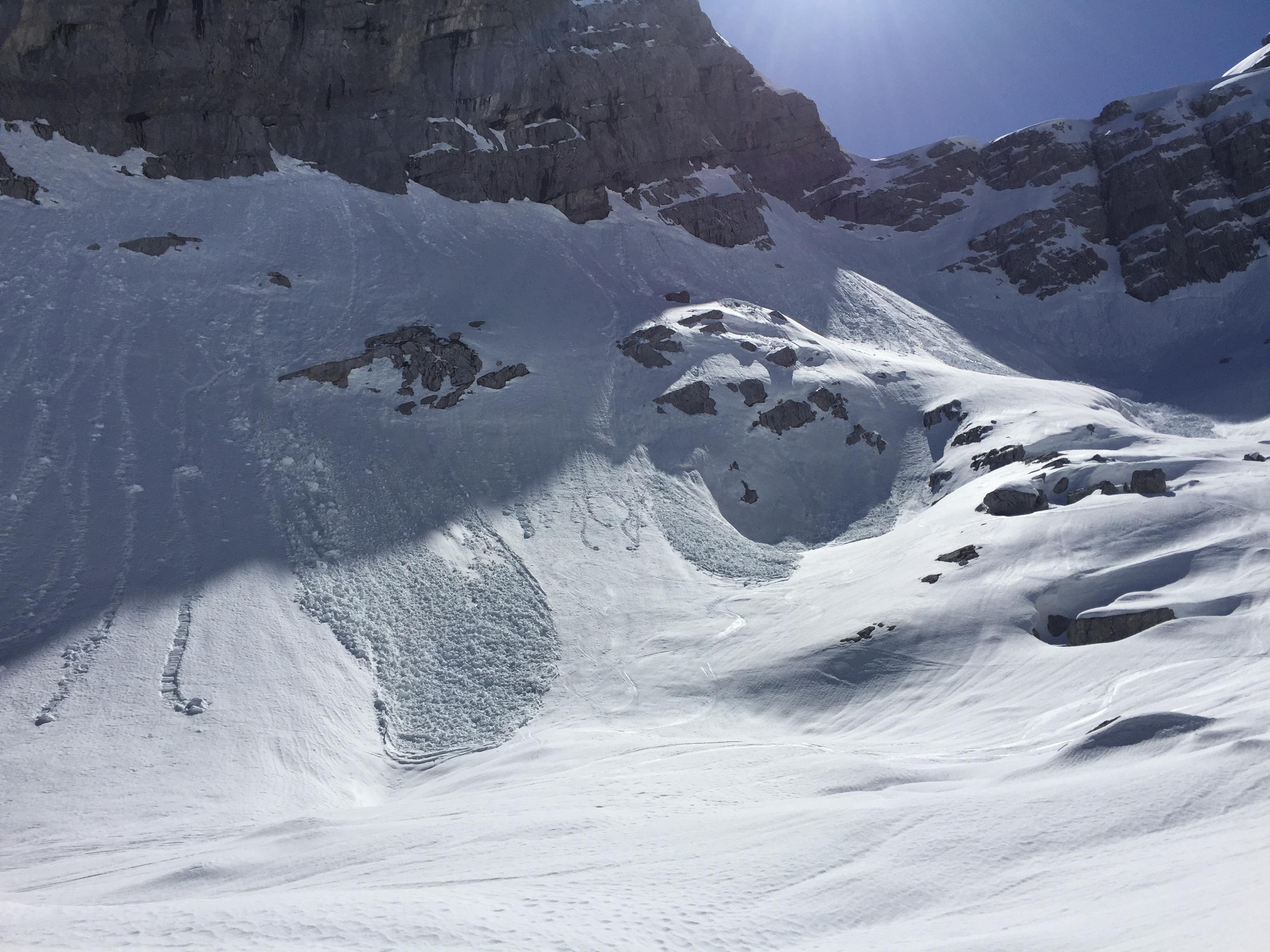 Aus den senkrechten Wänden entluden sich unter Sonneneinwirkung kleinere Lockerschneerutsche, im Tagesverlauf die Wand-nahen Bereiche zu meiden lohnt sich sicher. (Warum die Spurführung über den mittelalten Lawinenekegel am Fuß des 4. Kindes so interessant ist und vielbegangen war obwohl sie etlichen erkennbar Mühe machte, weiß ich auch nicht recht.)