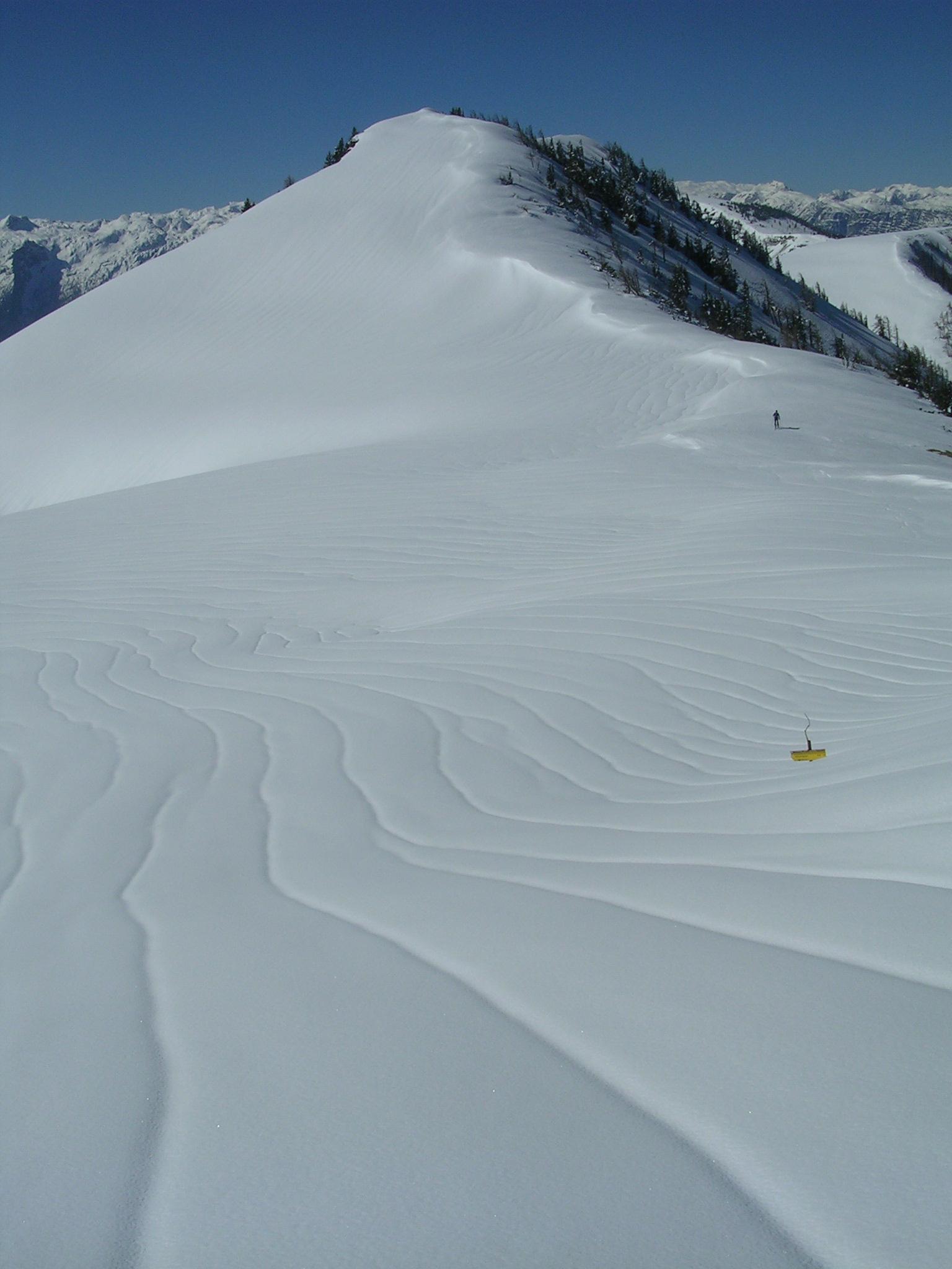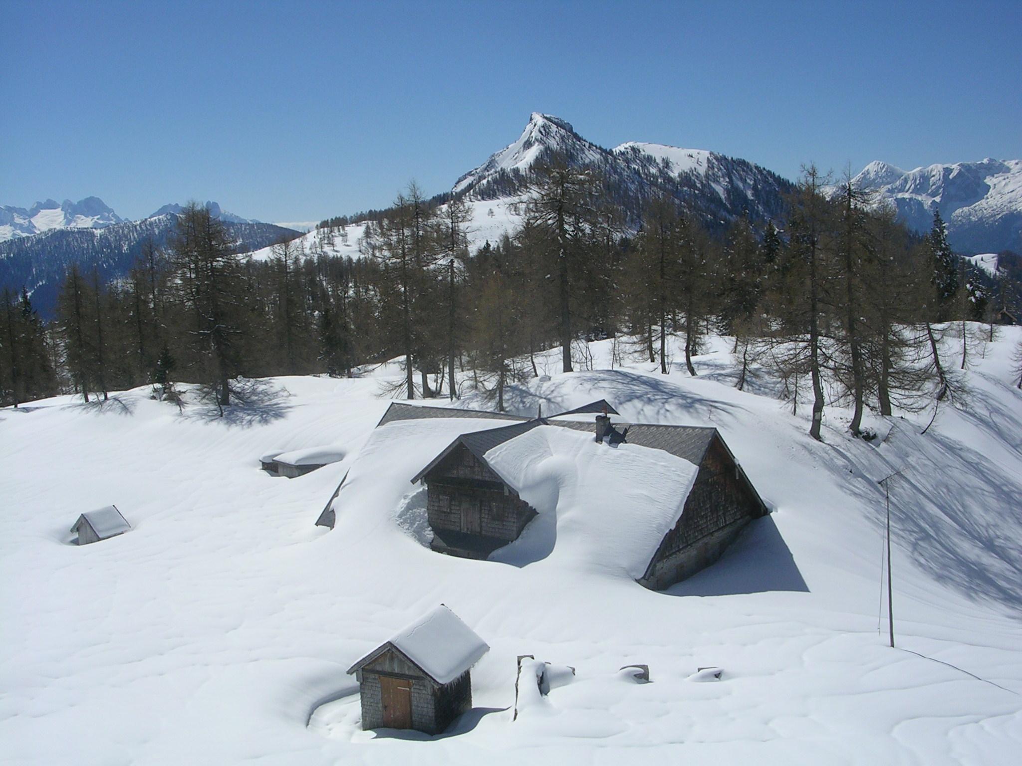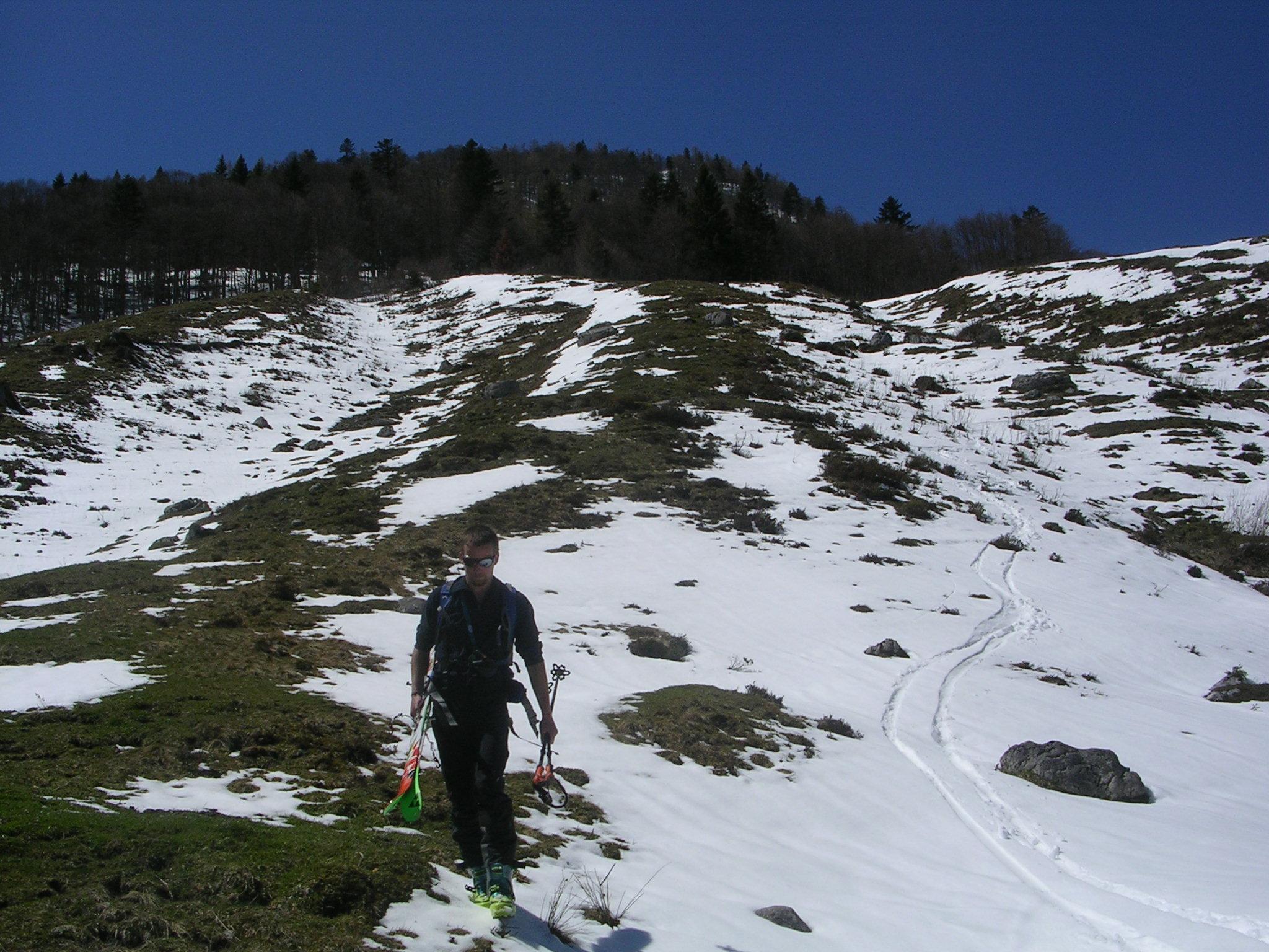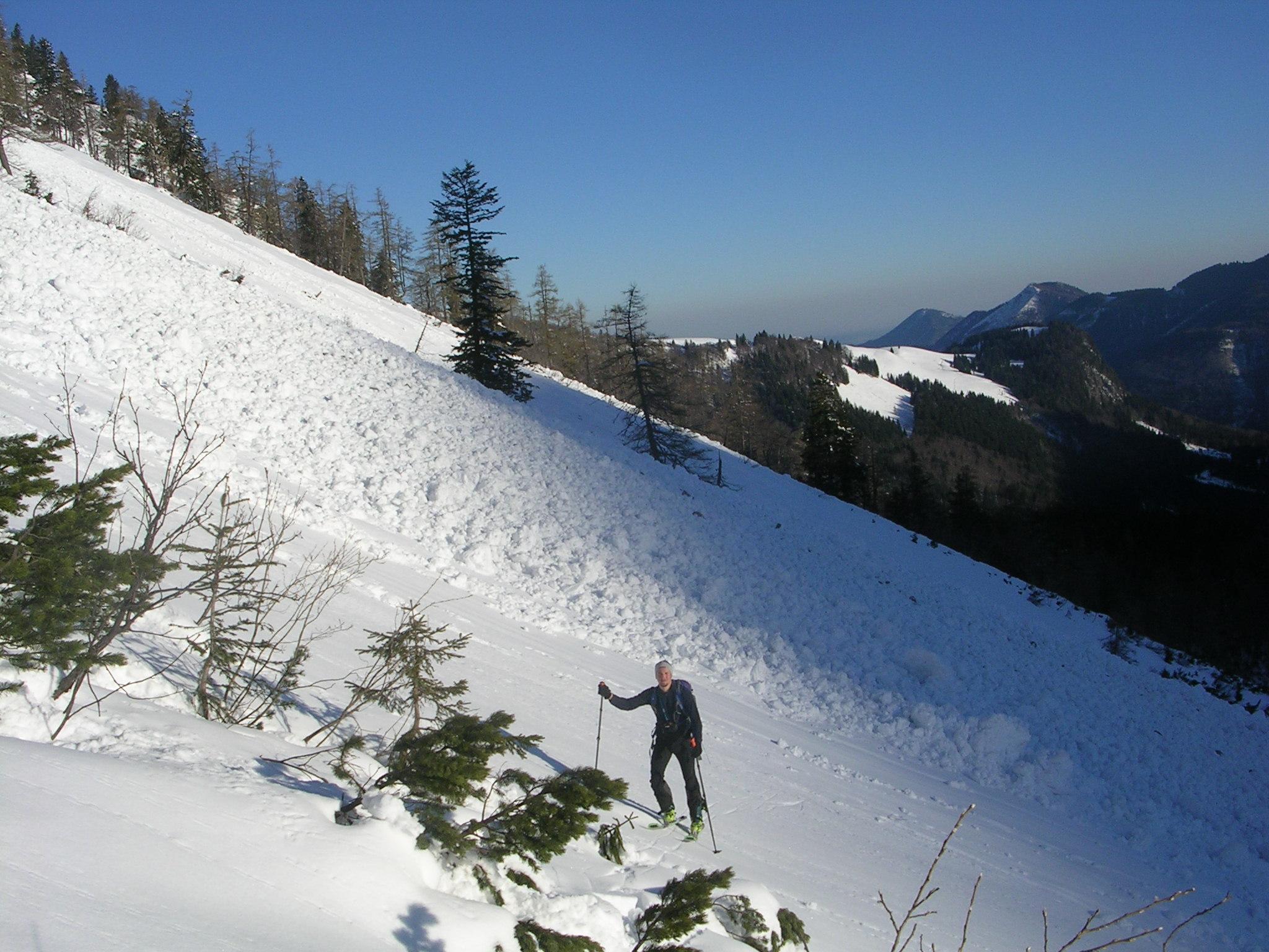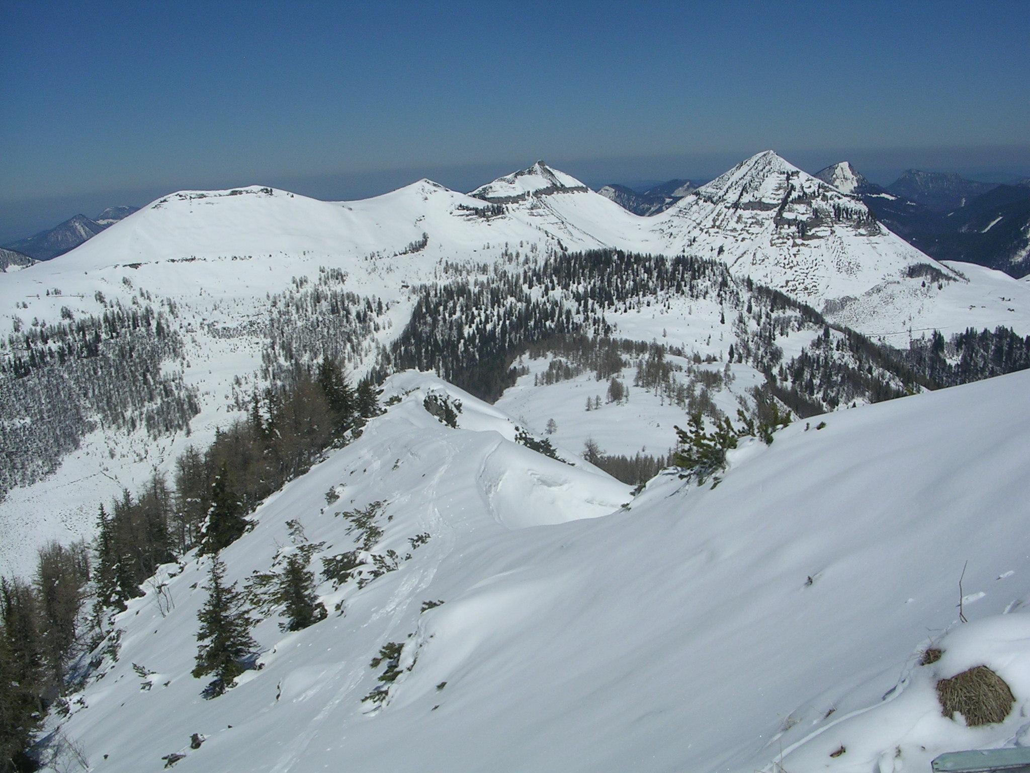 Der Schnee war sehr abwechslungsreich. Tragender Harsch unten, relativ weich oben in der Früh beim Aufstieg auf's Gennerhorn, Abfahrt in den Grubersattel auf harter Harschdecke. Anschließend bis zur Schaflucke immer tiefer einsinkend. Dürlstein, Hoher First Harsch, teilweise brechend. Abfahrt zur Moosangerlalm von tiefem Firn bis Sulz. Bis zum Hochwieskopf wieder abwechselnd Harsch und Pappschnee. Letzterer überwog in den flachen Teilen bei der Ab"fahrt" über die Hochwiesalm bis ins Ackersbachtal, im steilen Teil vom Hochwieskopf brauchbarer gemäßigter Bruchharsch. Die Abfahrt von der Genneralm war schon zur Hälfte aper.