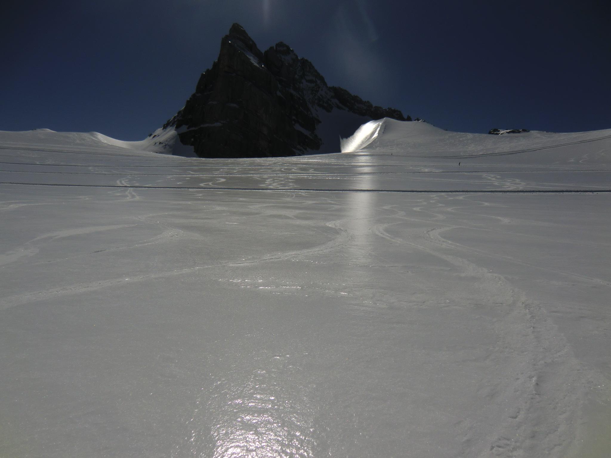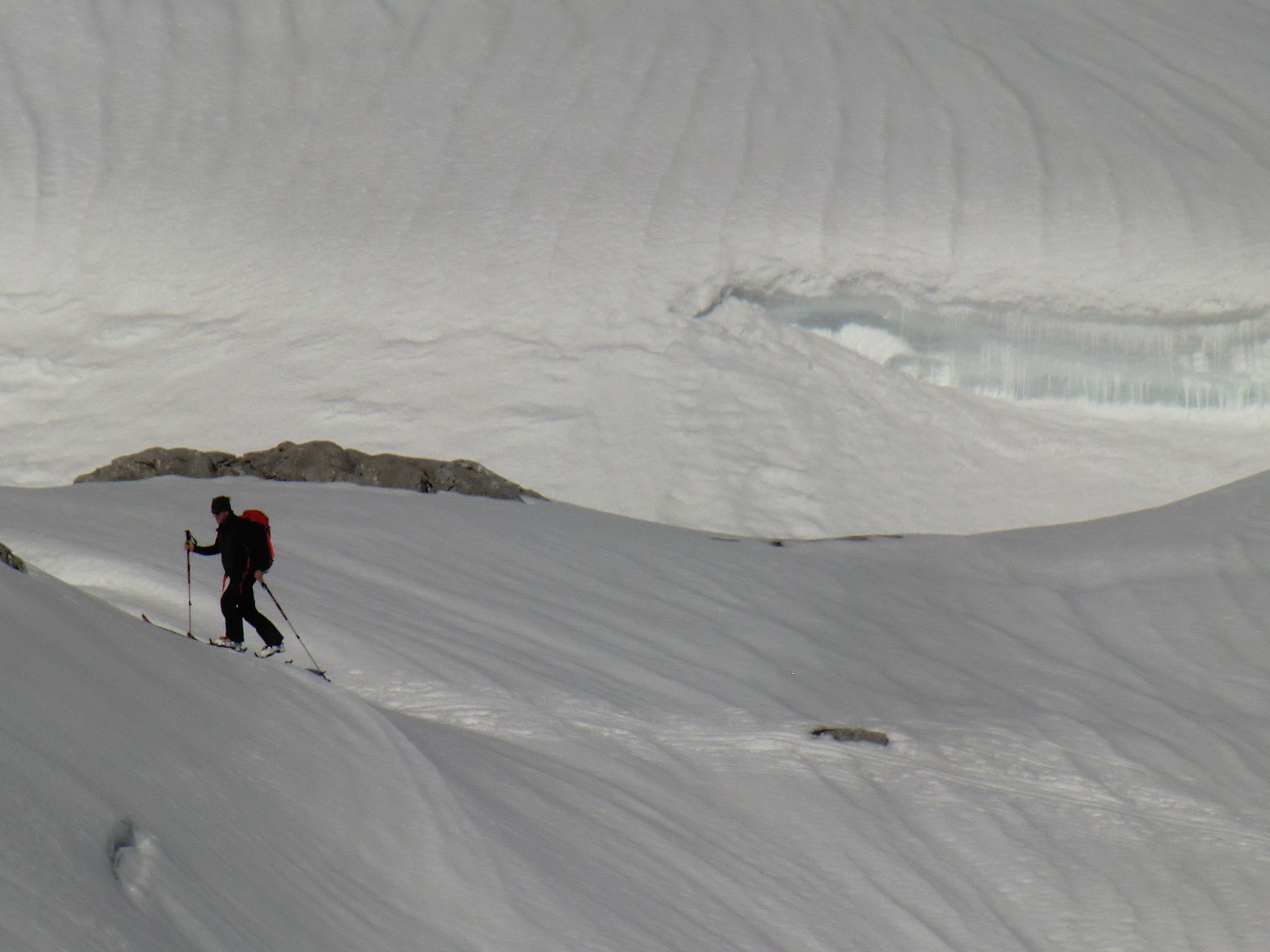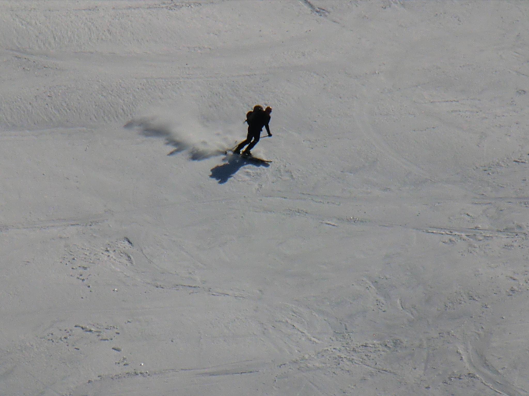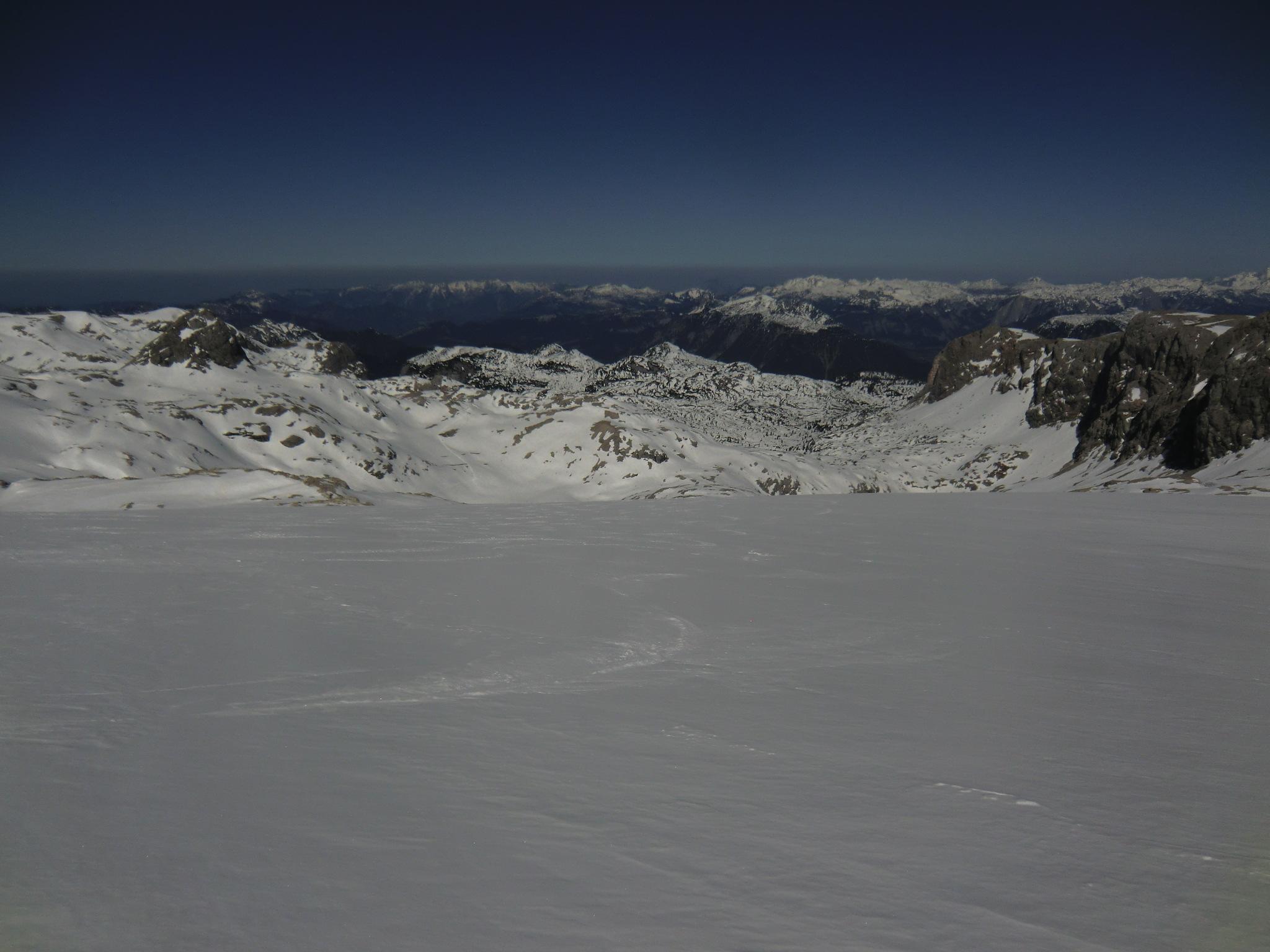 Jetzt war heute schon wieder so ein fulminanter Firn-Fun-Tag mit wenig Leuten am Weg. Dienstagseffekt. Beim Start um 9:30 Uhr war alles noch bockhart – die Kältereserven sollten dann auch über den ganzen Tag halten. Der obere Teil des Hallstädter Gletschers war ein Eisparkett, aber die hauchdünne Glasur war trotzdem gut zu fahren. Weiter unten dann festgepresster kalter „Styroporschnee“ der noch kräftig staubte. Kurz vor dem Eissee gab´s dann Firn. Überall auf der Nordseite hat sich feiner Saharasand über´s weiß gelegt. Die Autobahn von der Simonyhütte zur Gjaidalm rüber war gut aufgefirnt und eine rasante Rennbahn, kein Baatz, kein Sulz. Auch die 11km Abfahrt war bis zum PP gut in Schuß. Diese Woche noch täglicher Seilbahnbetrieb, nach dem 2.4. dann nur noch an Wochenenden, solange die Krippensteinabfahrt noch genug Schnee hat.
