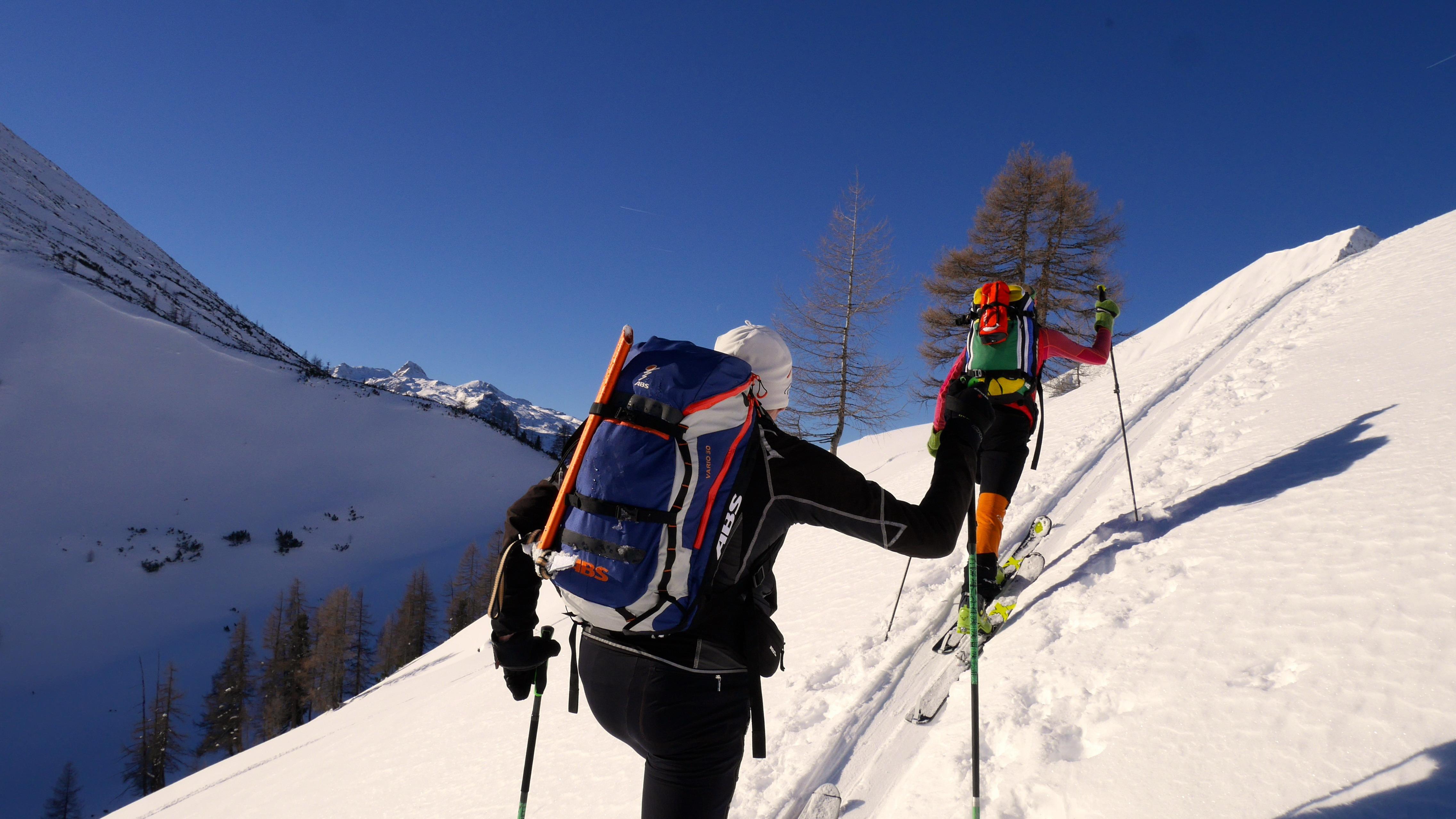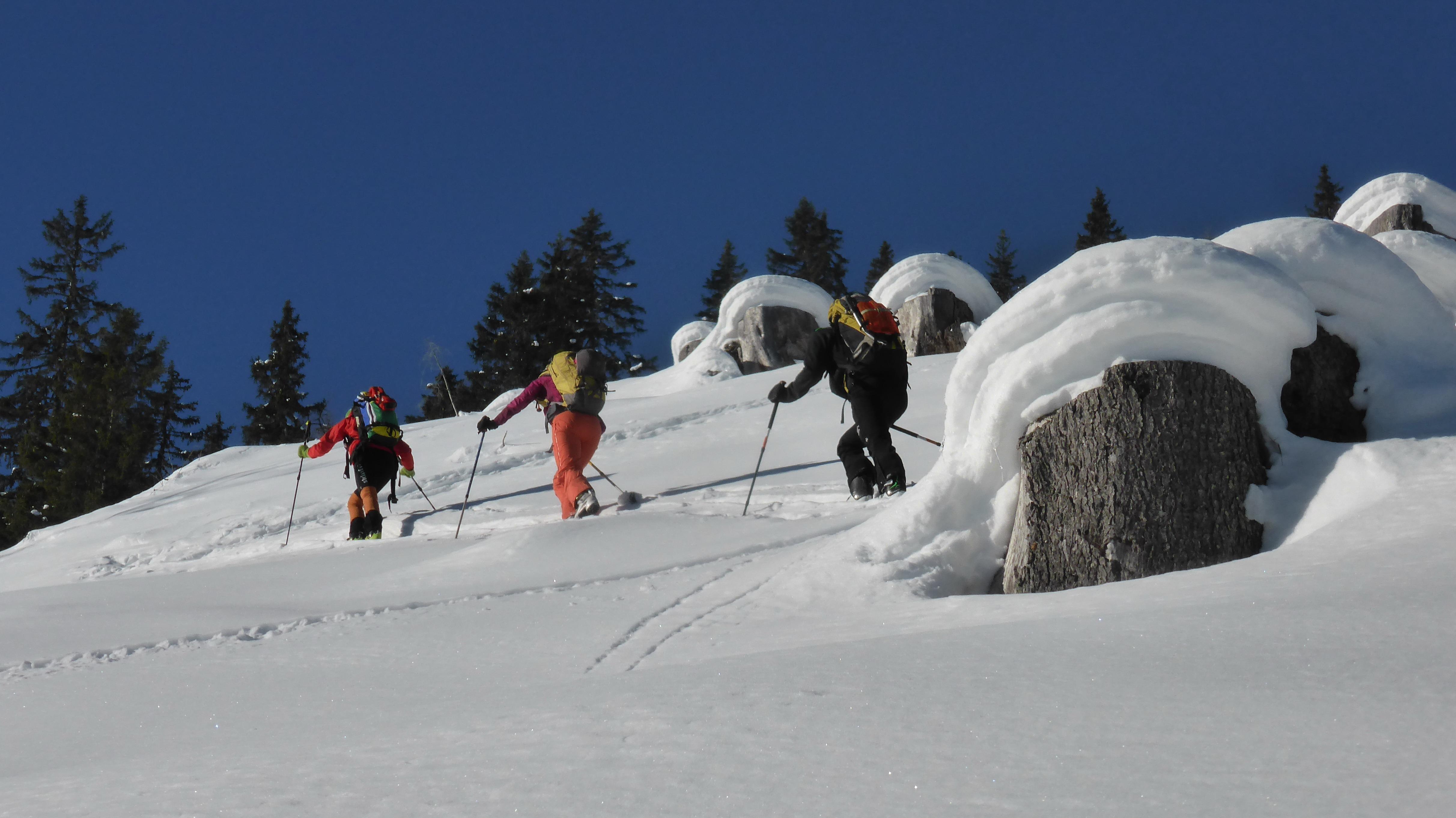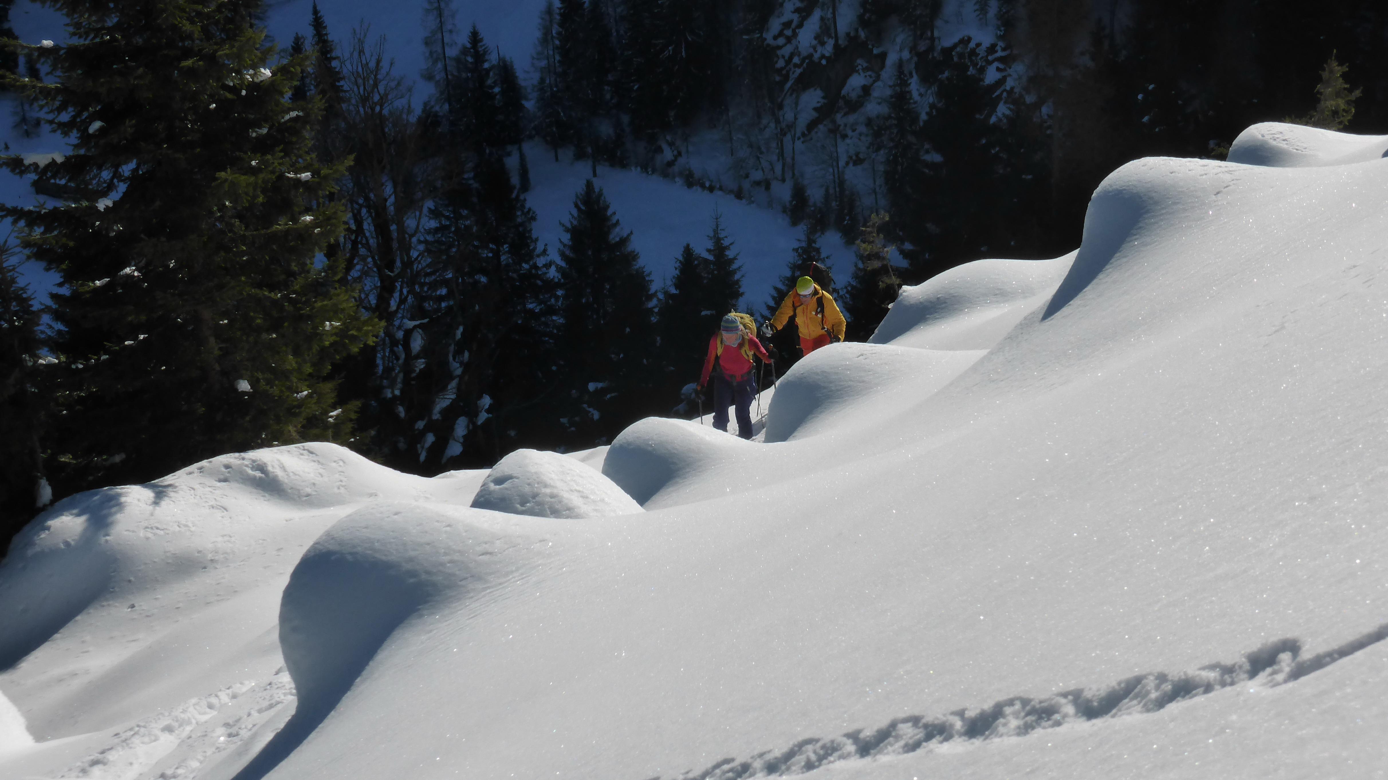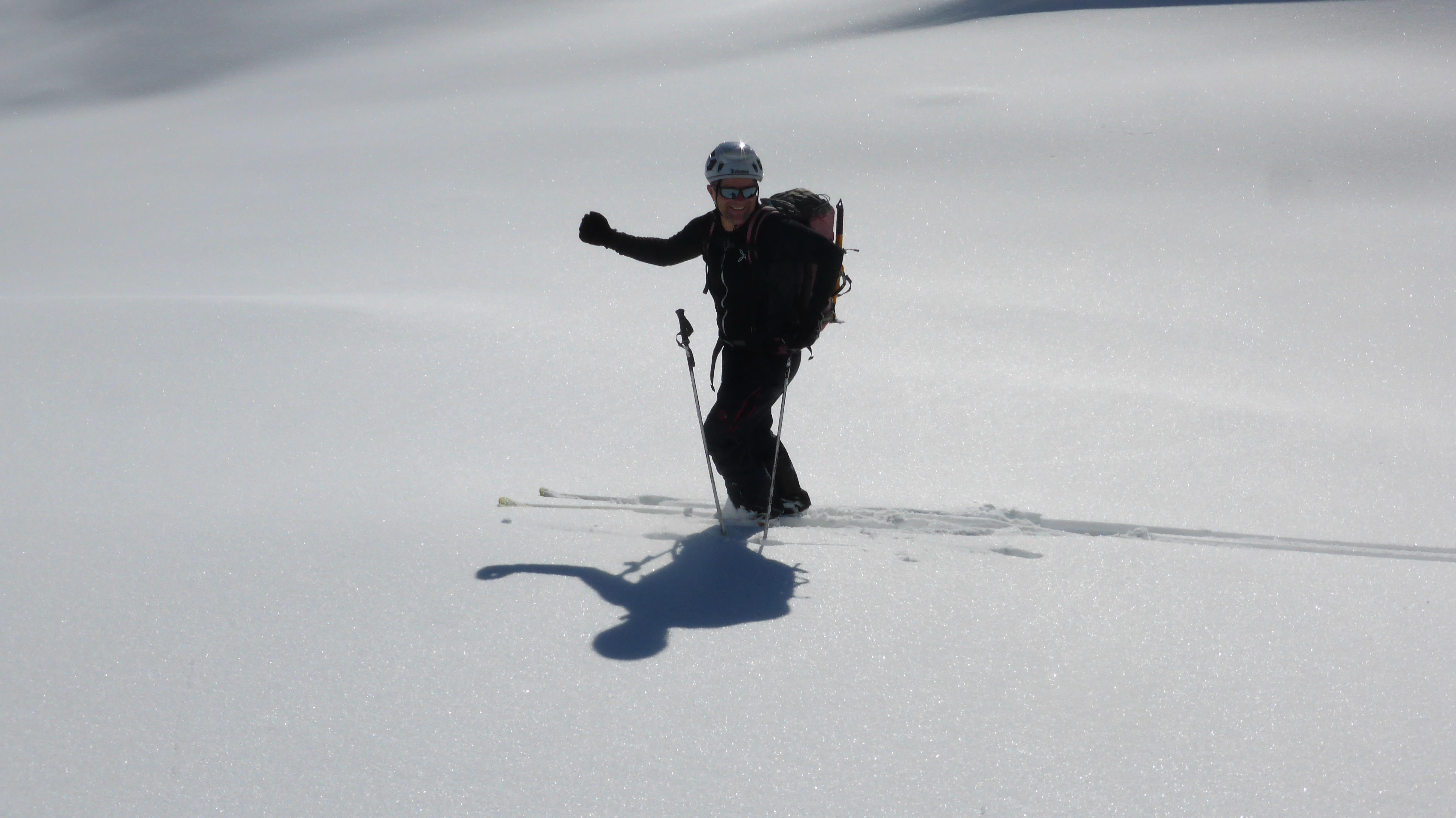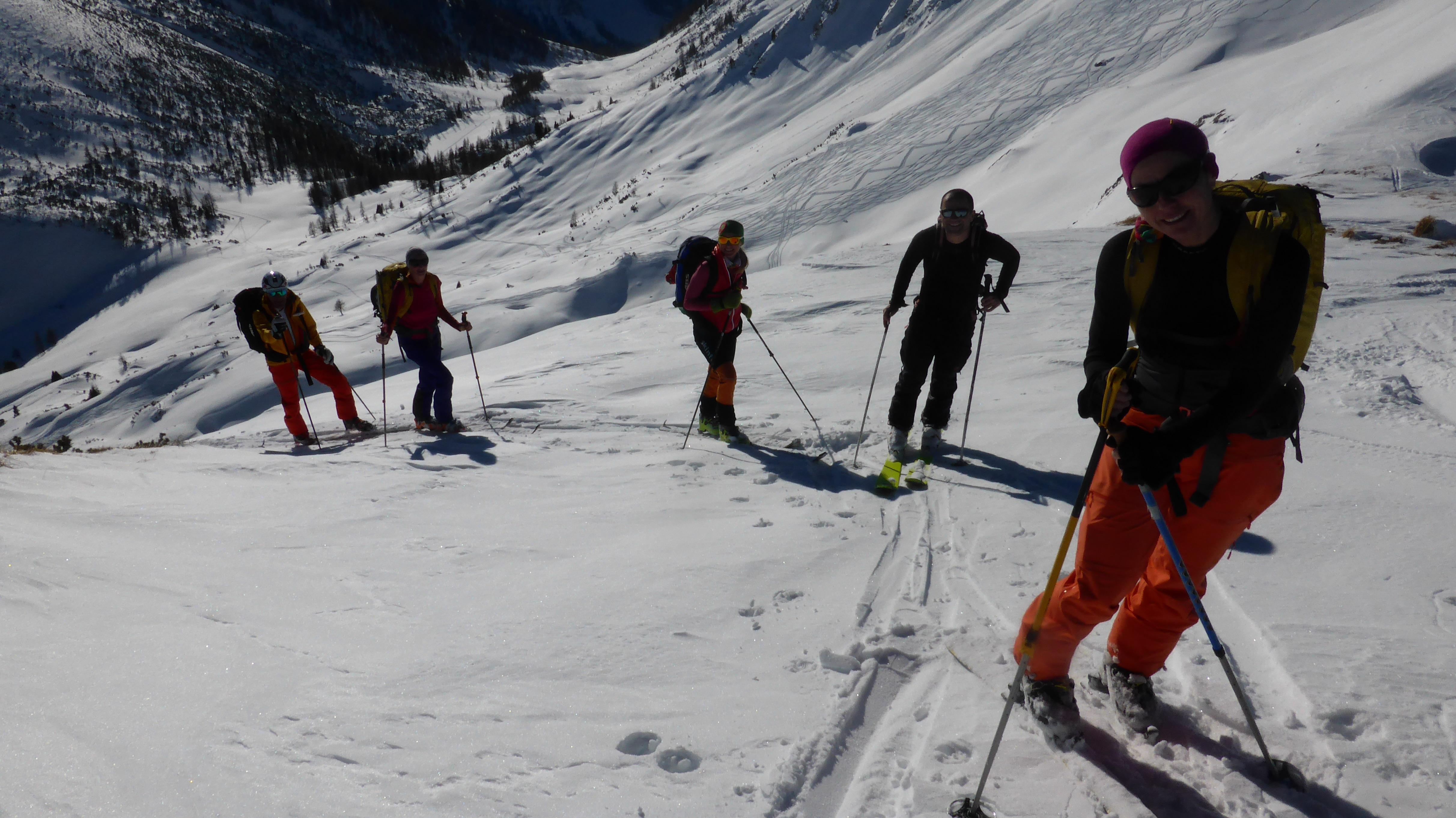 Die angestrebte Tour ist süd- bis ostseitig exponiert, mit durchaus bis zu 40° steilen Passagen im obersten Karbereich bis zum Gipfelgrat. Nach "Stop or Go" also durchaus kritisch zu hinterfragen!