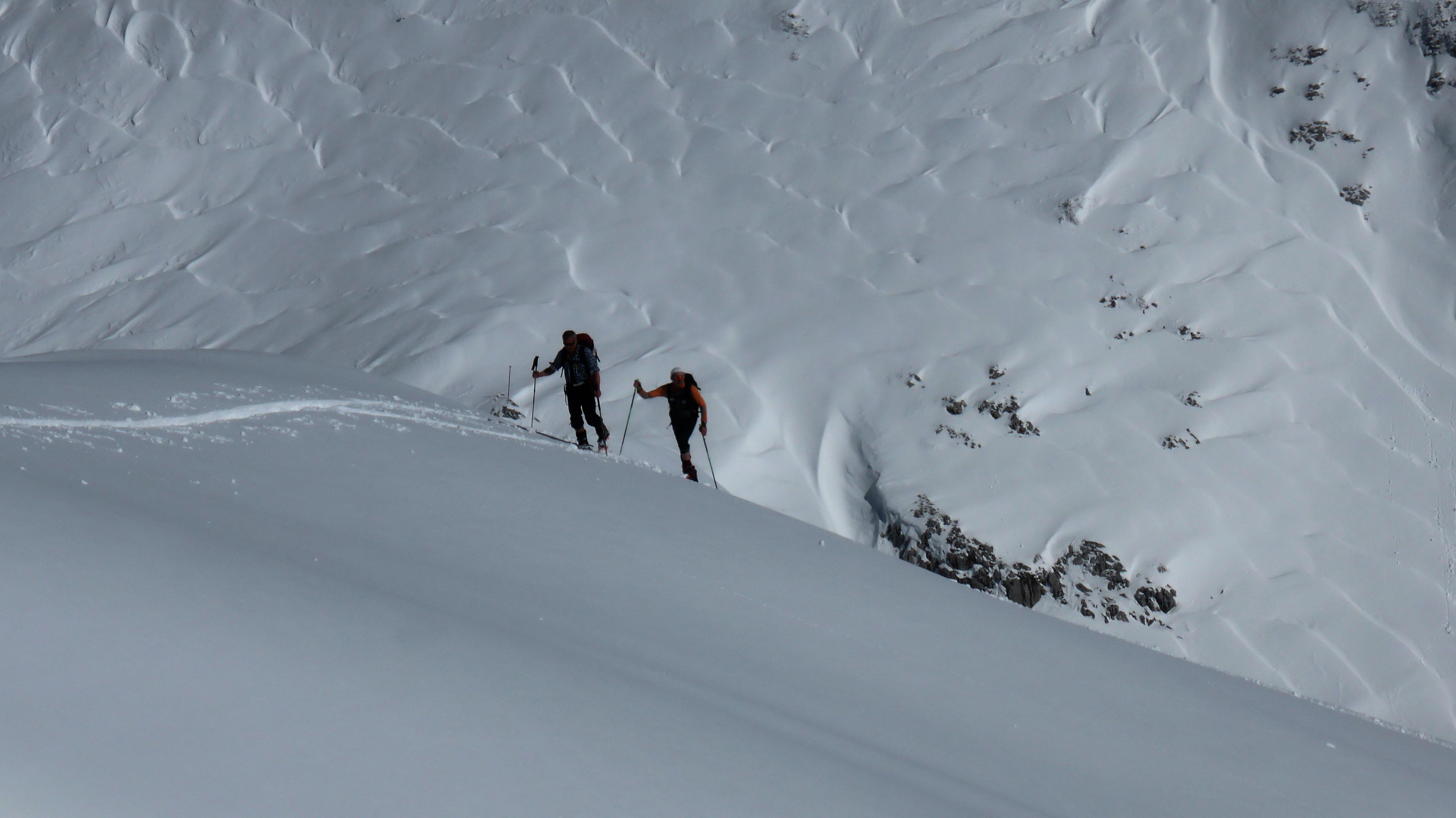 ...dementsprechend immer wieder deutliche "Wumm"-Geräusche beim Gehen....südseitige Steilhänge waren heute absolut zu meiden, da mit der Sonneneinstrahlung etliche feuchte Schneebretter abgingen!