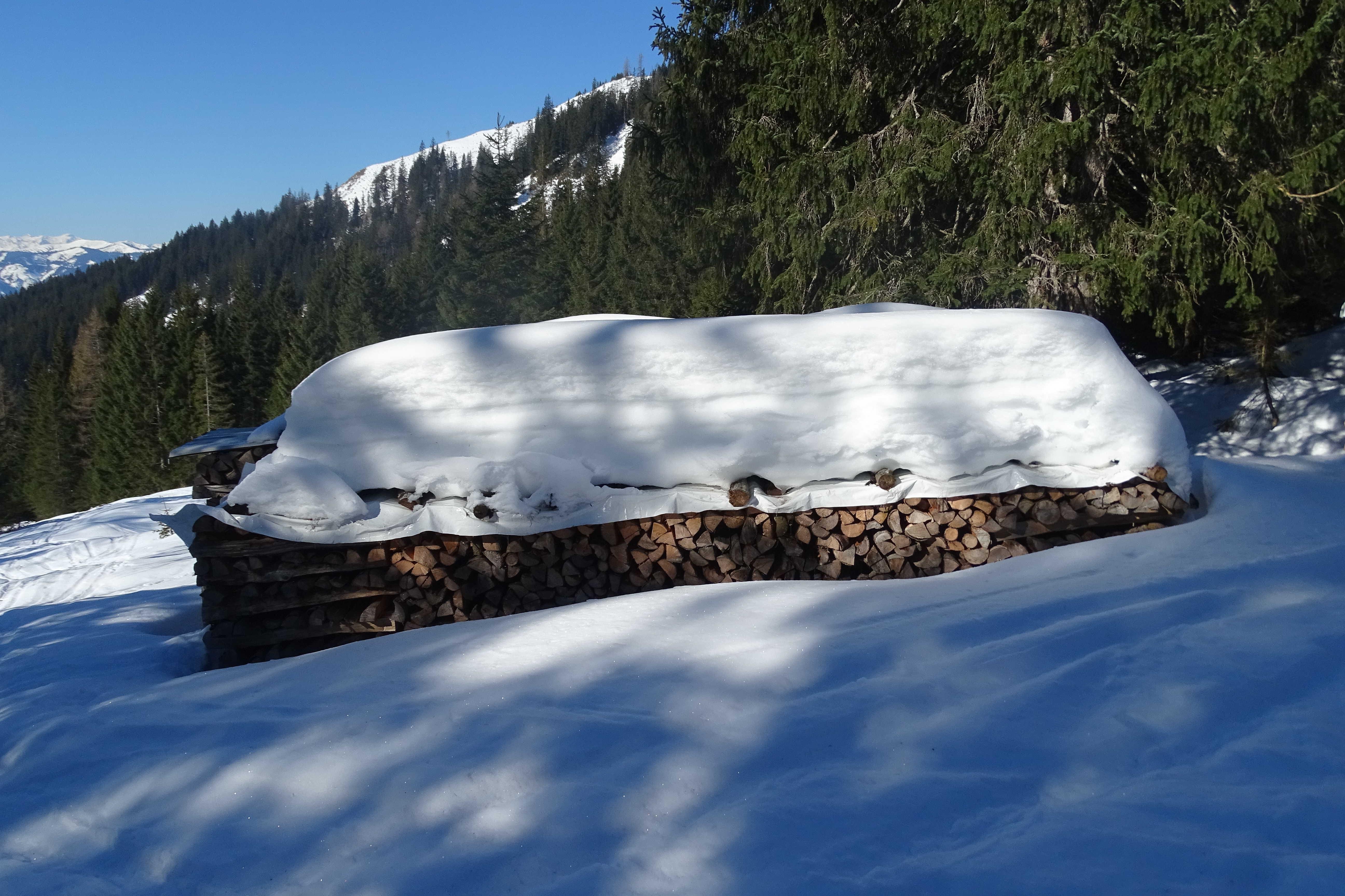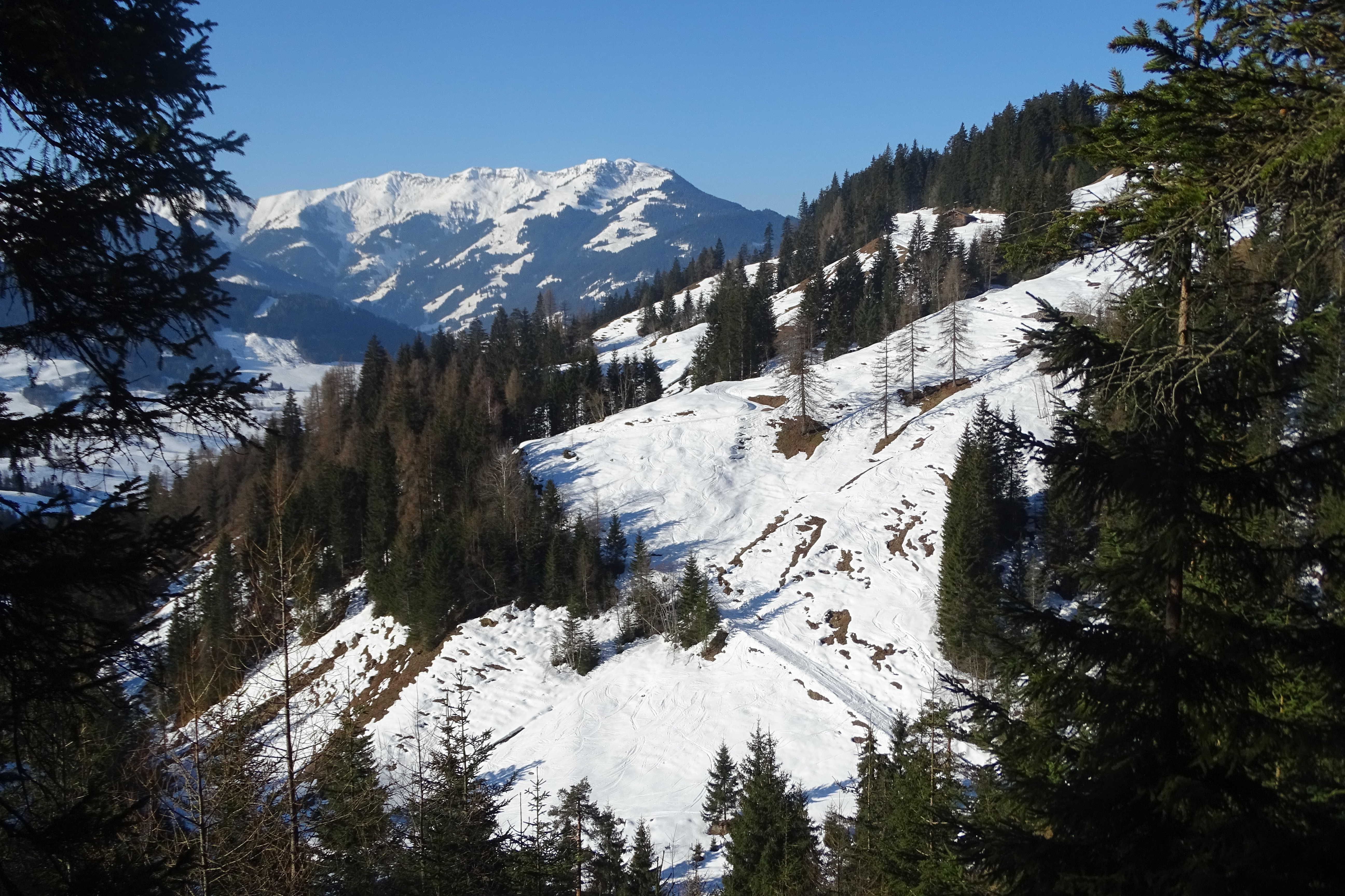Aufstieg: ich wählte die kürzere Variante über die Kasereggkapelle. Da heißt es Ski tragen von der Brücke bis zum ersten Flachstück. Ab hier aber dicke Schneedecke.