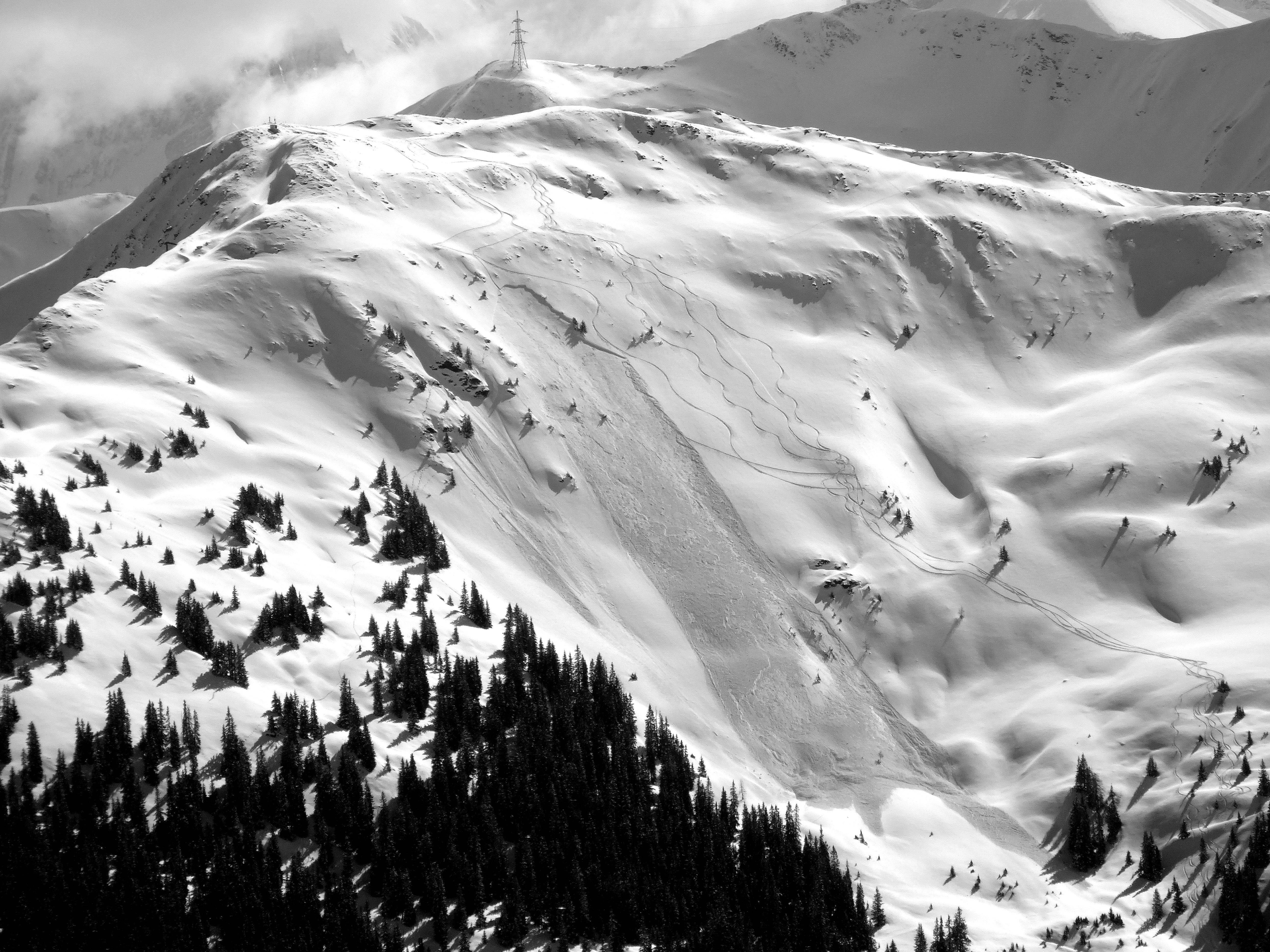 Lawinenbeobachtungen: Außer kleineren Lockerschneerutschen mit punktförmigen Anrissen keine, nur an der Westseite des Penhab im Vogelalmgraben eine relativ große Lawine (siehe die beiden ersten Bilder).