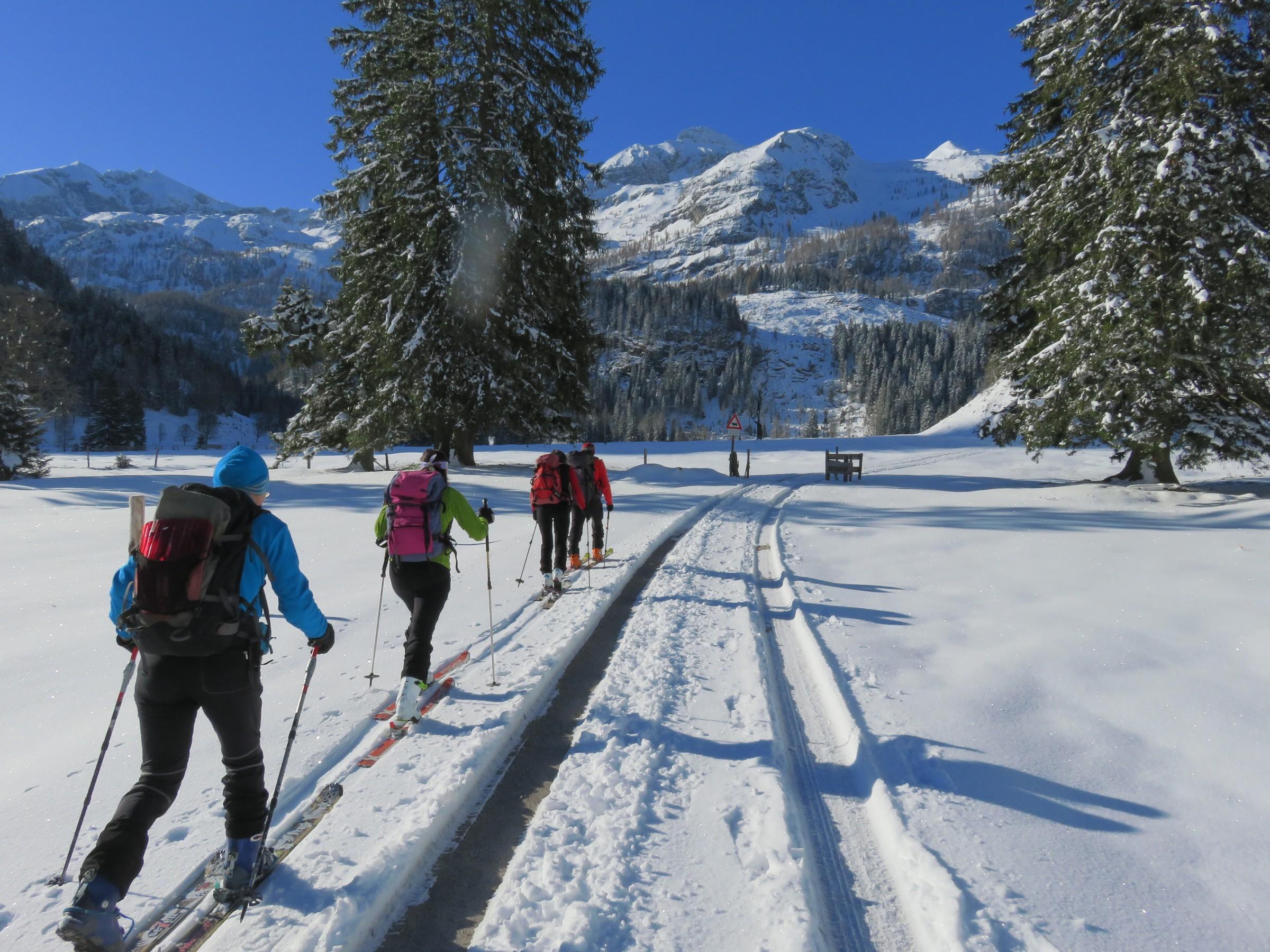 Beim Aufstieg noch durchgehende Schneedecke auf der Forststraße, wie in Zauchensee -7 Grad. In der Sonne sehr angenehm zu gehen, nur kurz unter dem Gipfel unangenehm kalter Südostwind. Neuschneehöhe am PP ca. 10 cm, anwachsend auf ½ m. Es waren außer uns nur noch eine Hand voll Tourengeher unterwegs.