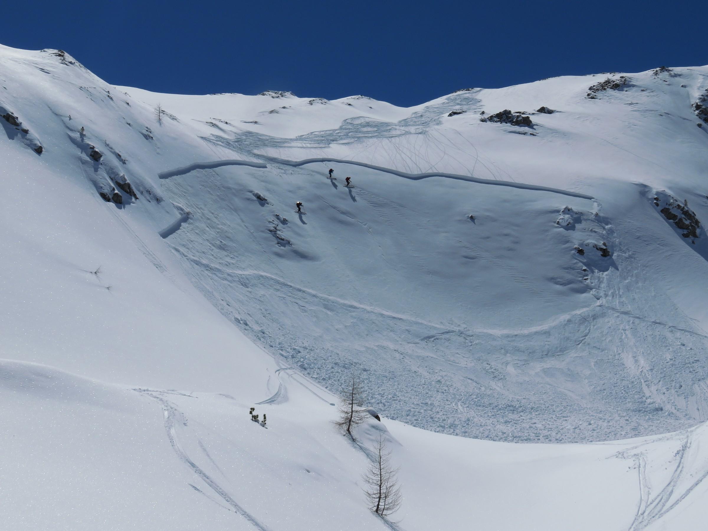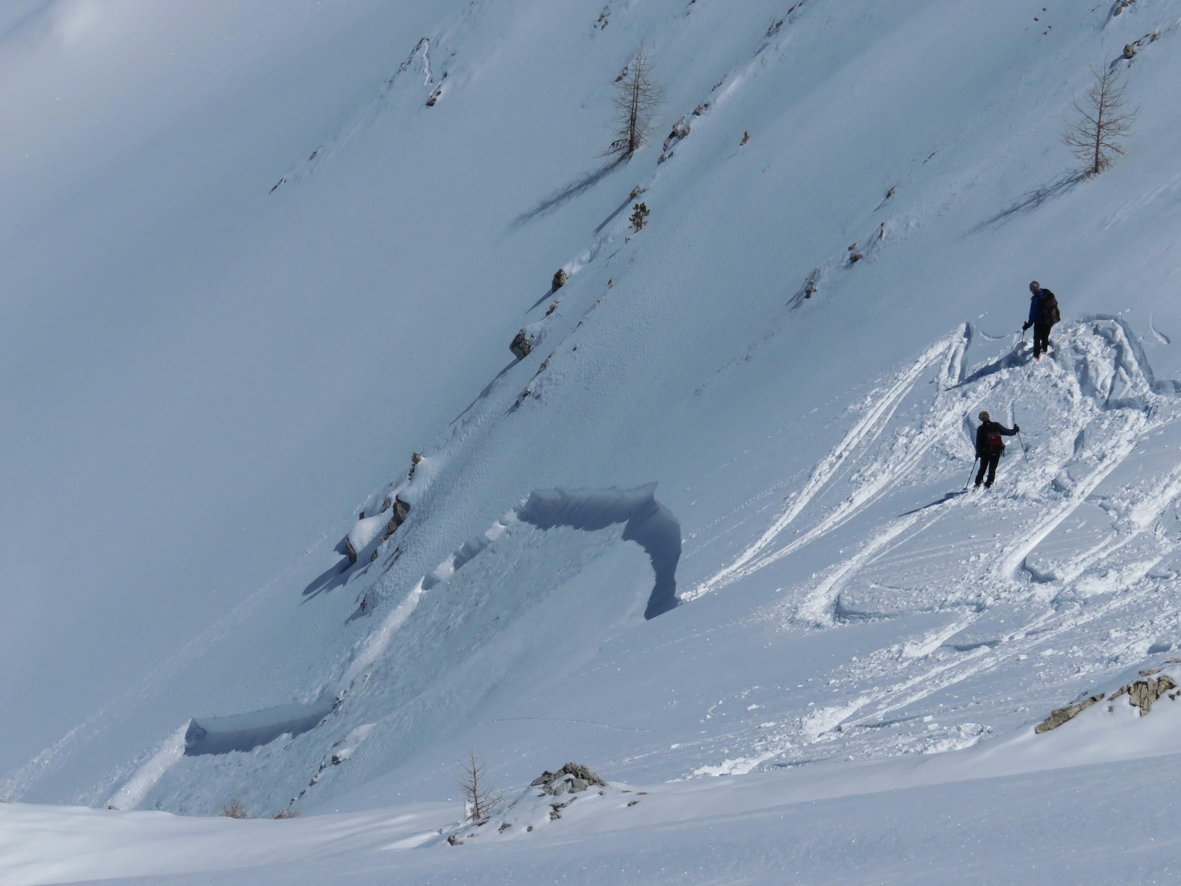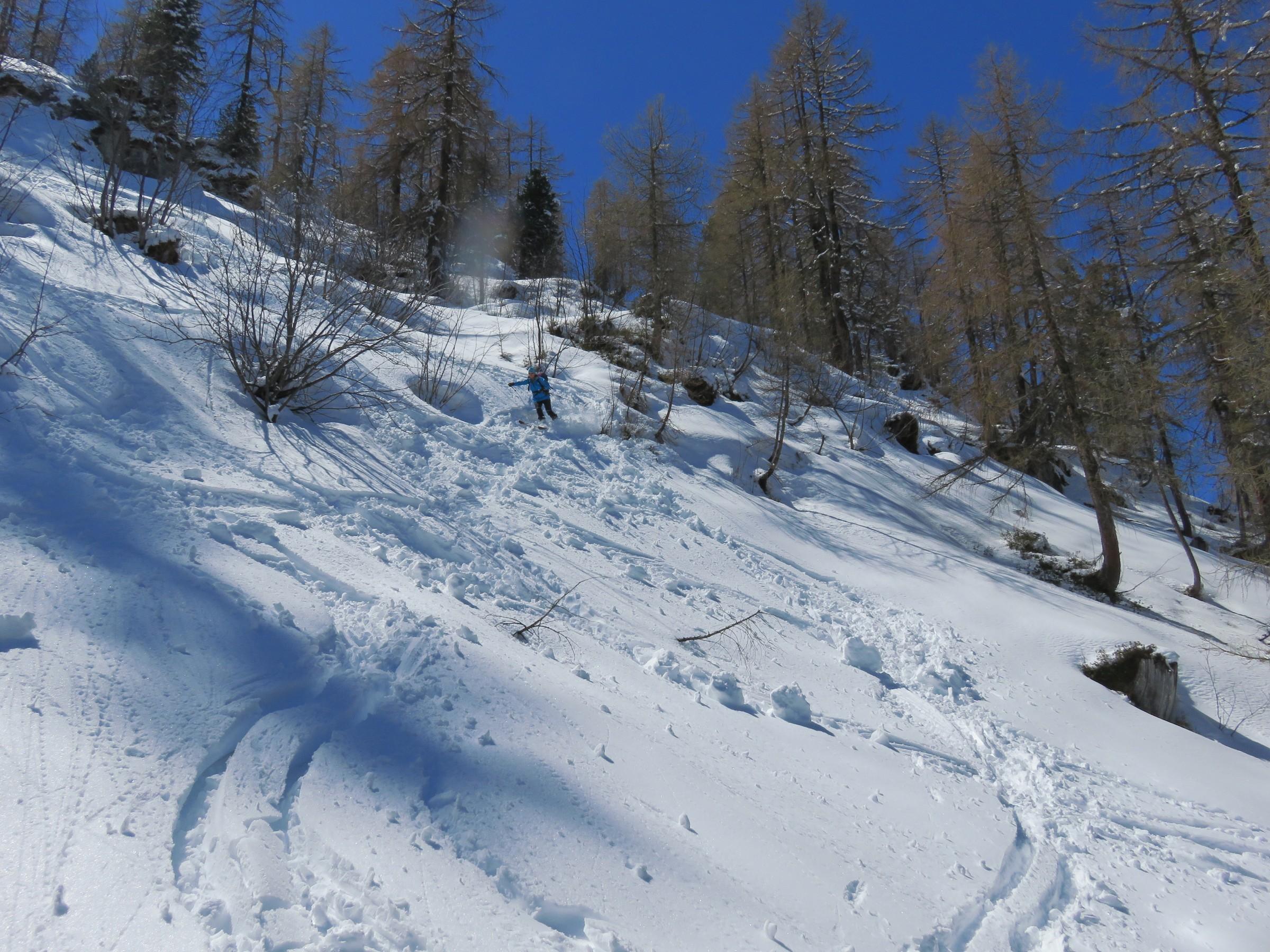 In den nordseitigen Steilstufen viel verfrachteter Pulver, der auf glatter Harschunterlage auf Zusatzbelastung wartete, siehe Bilder!