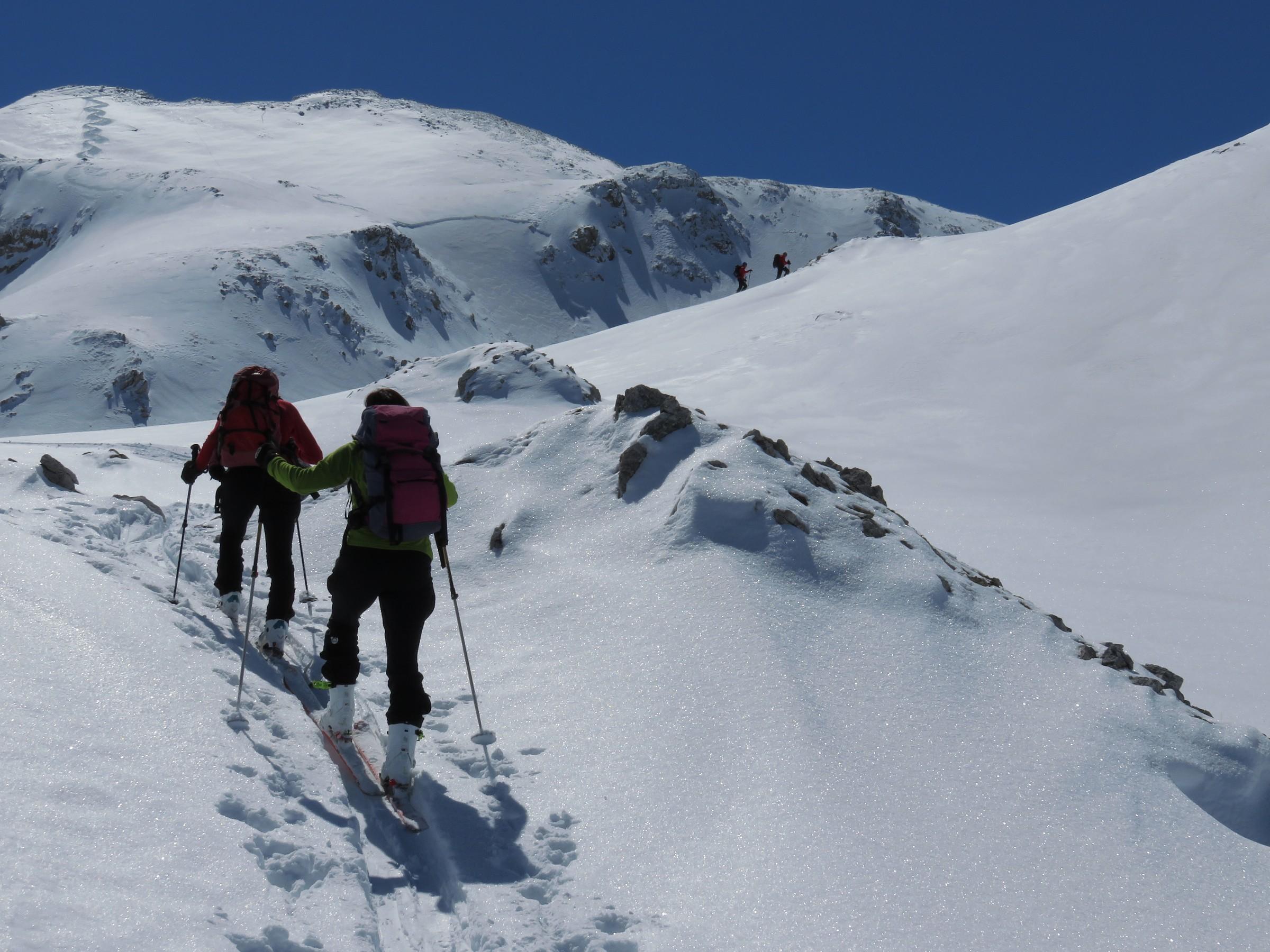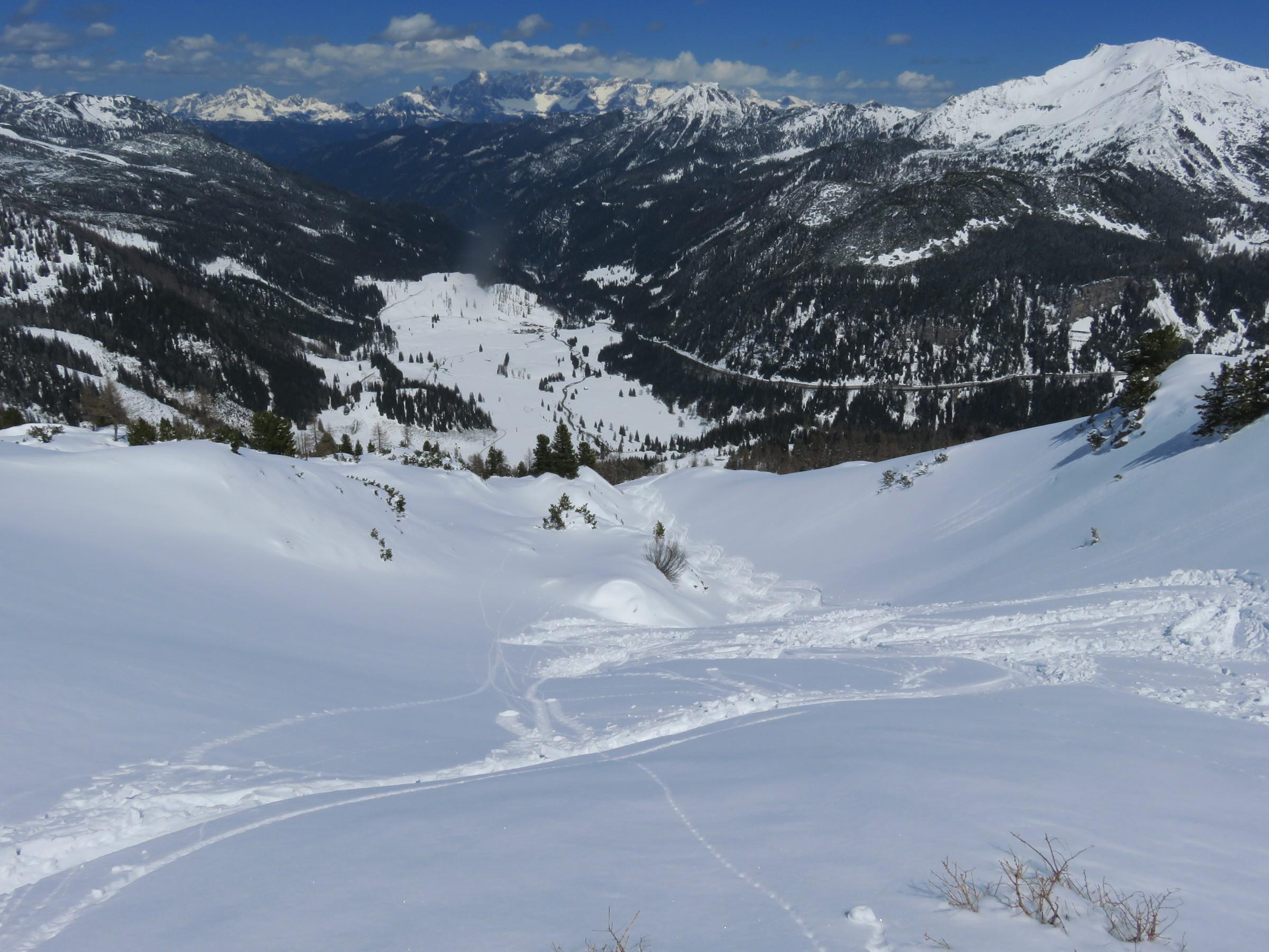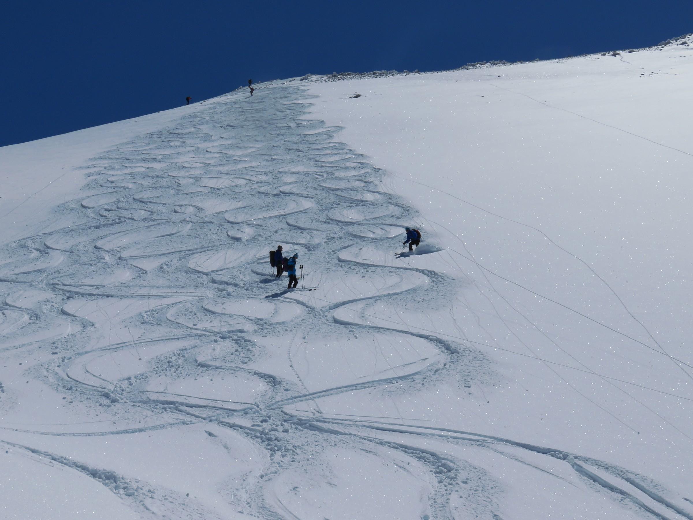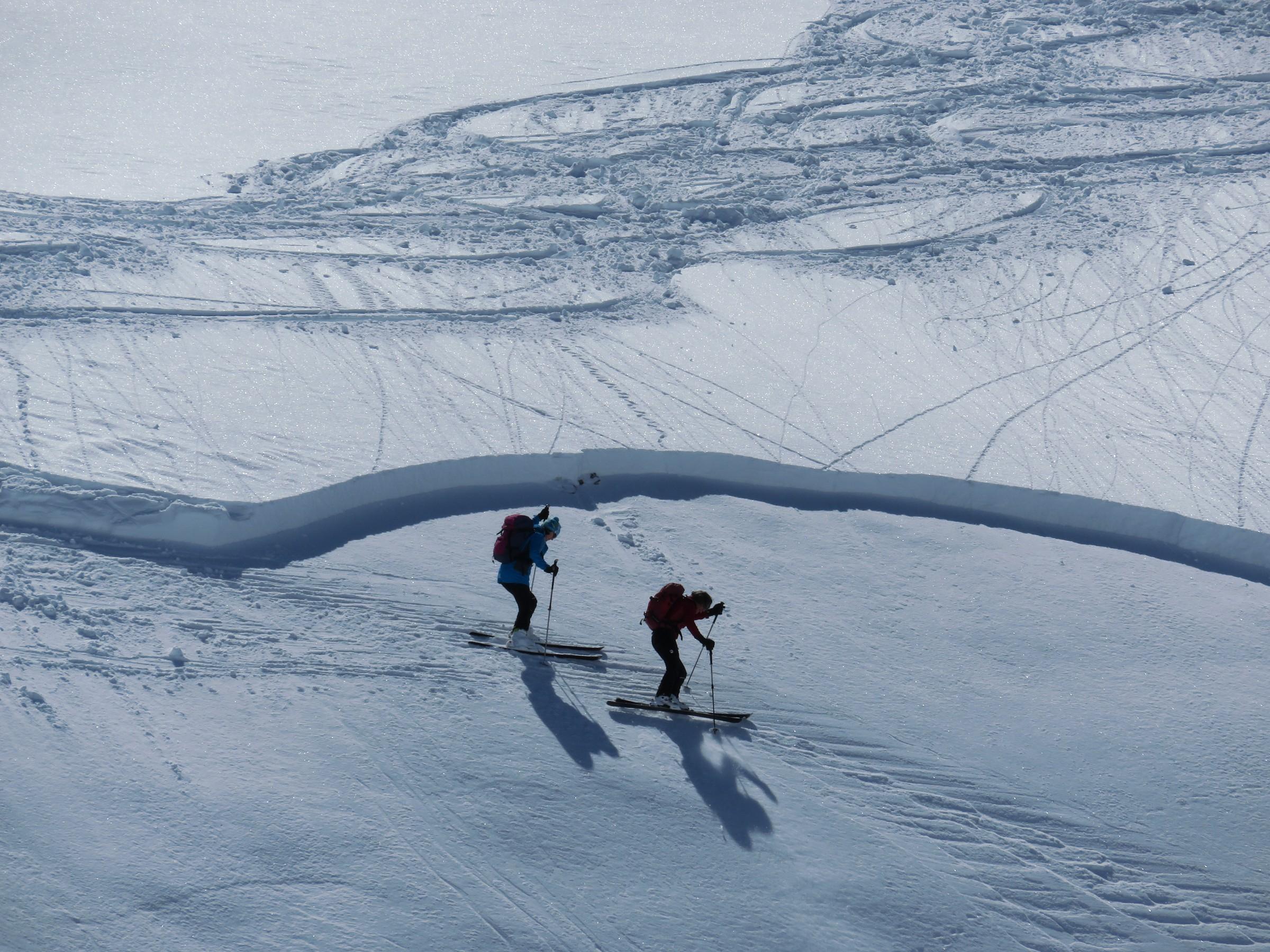 In den nordseitigen Steilstufen viel verfrachteter Pulver, der auf glatter Harschunterlage auf Zusatzbelastung wartete, siehe Bilder!
