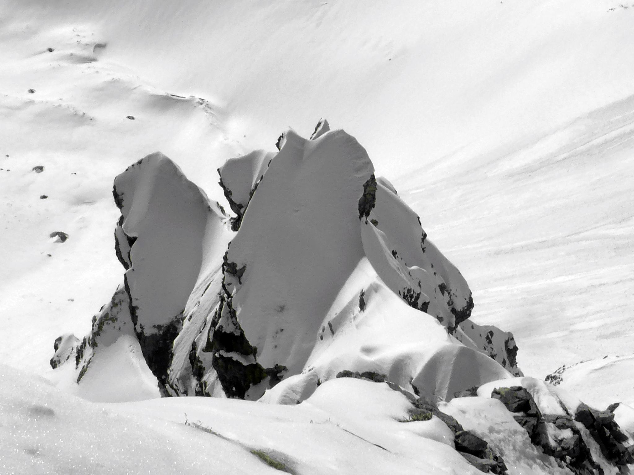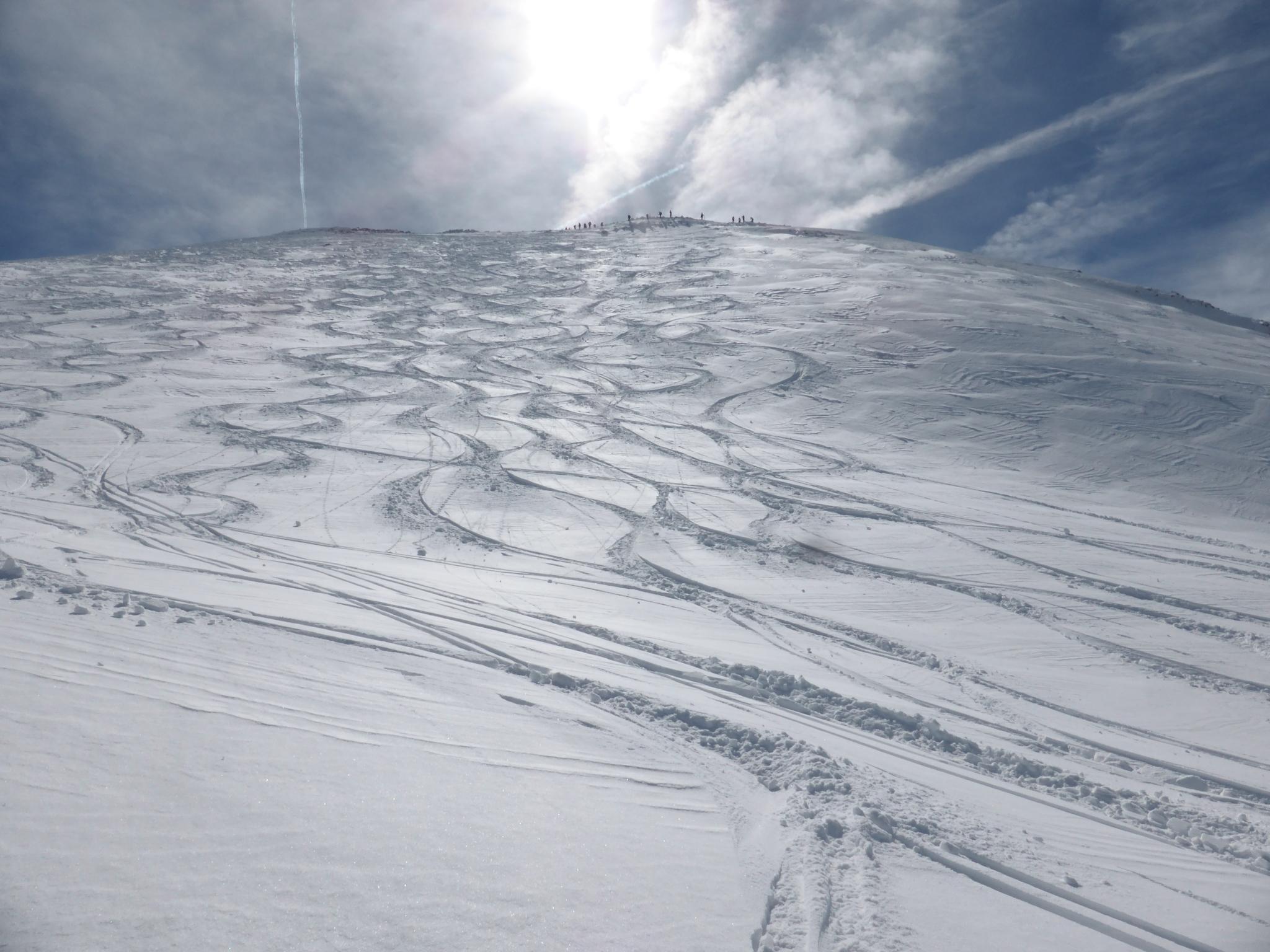 Allgemeine Verhältnisse, Schnee: Beim Aufstieg überwiegend Bruchharsch mit geringer Einsinktiefe, rein schattseitig gesetzter Pulver, tagsüber weicht der Schnee auf, im Pleißlingtal firnig. Gipfelhang sehr gut fahrbar.