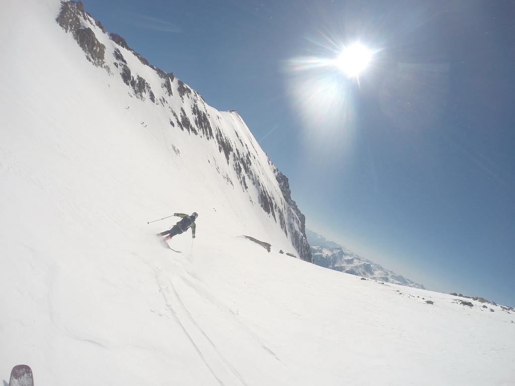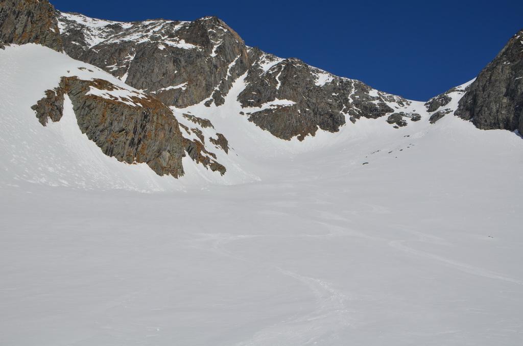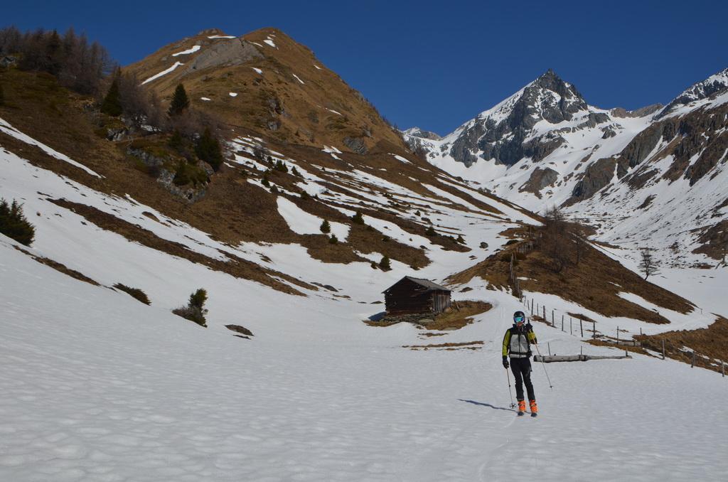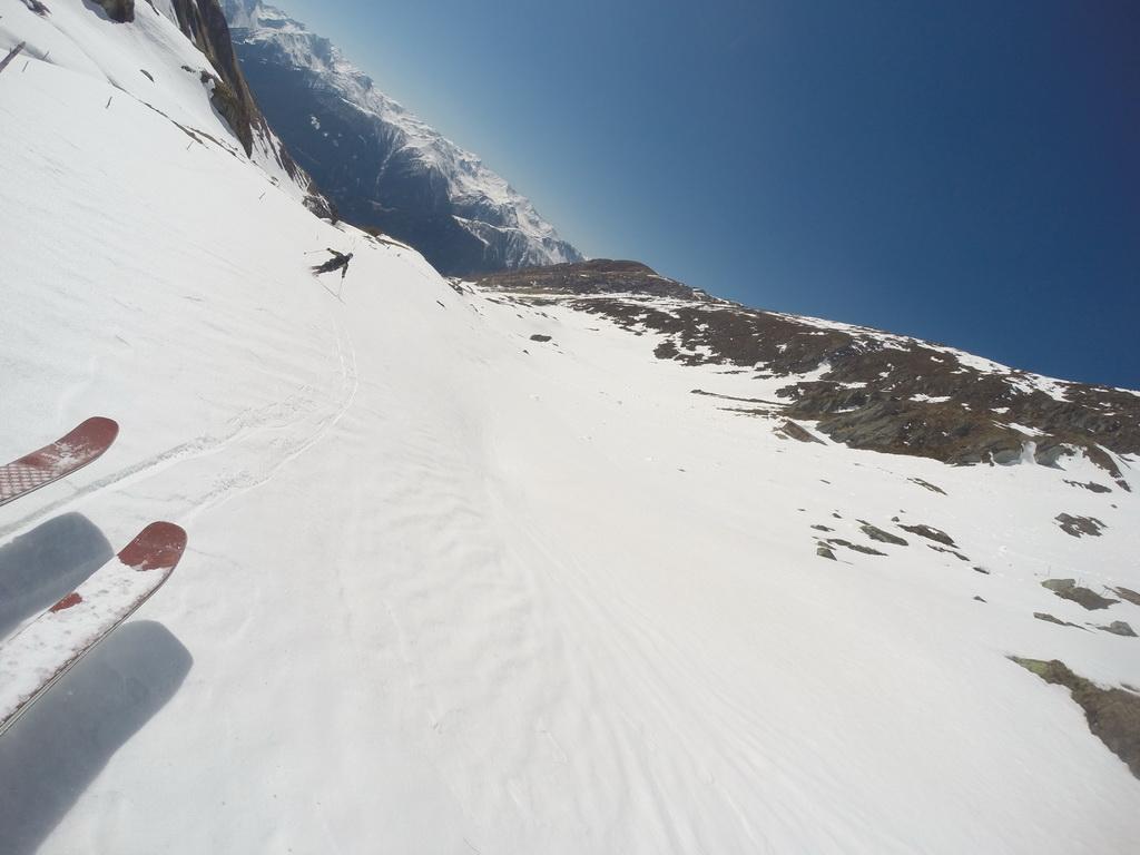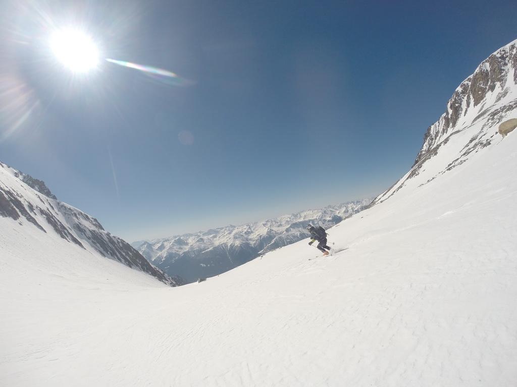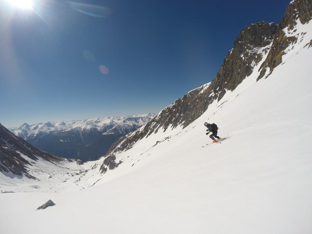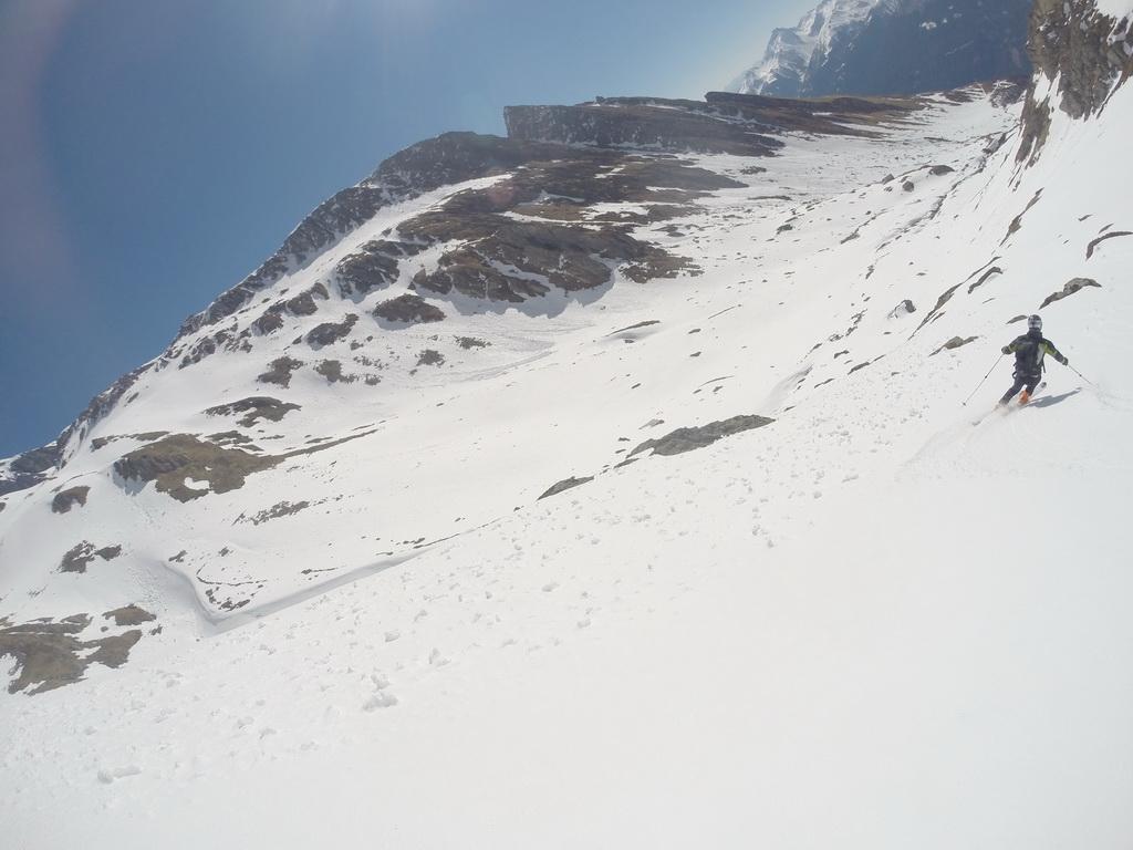 Leider war aufgrund der tiefen Temperaturen und dem späten Zeitpunkt der Sonneneinstrahlung die geplante Abfahrt entlang der Aufstiegsspur heute nicht wirklich sinnvoll. Die alternative Abfahrt über die schönen Südhänge hat sich als richtige Entscheidung herausgestellt und wir hatten eine perfekte Firnabfahrt.