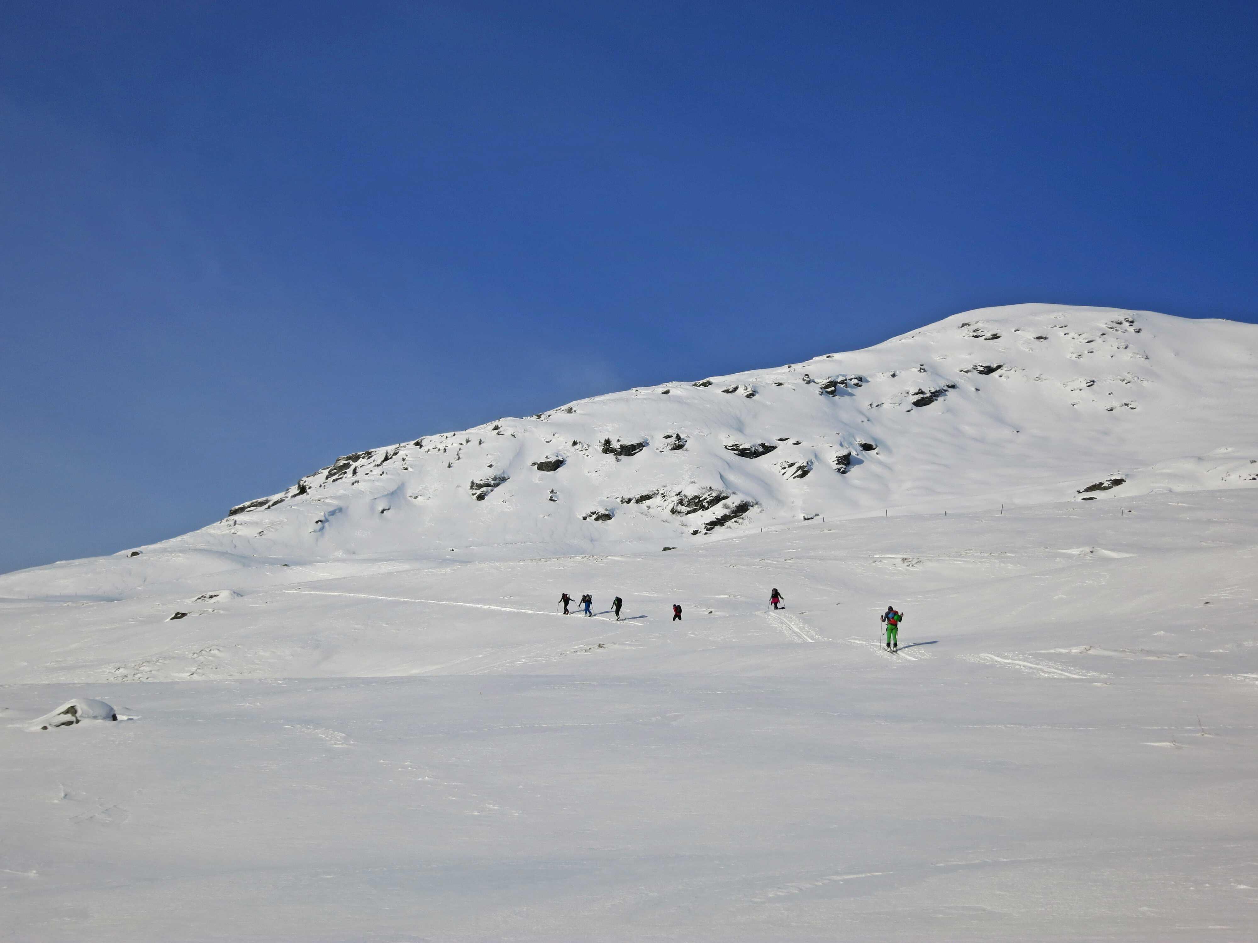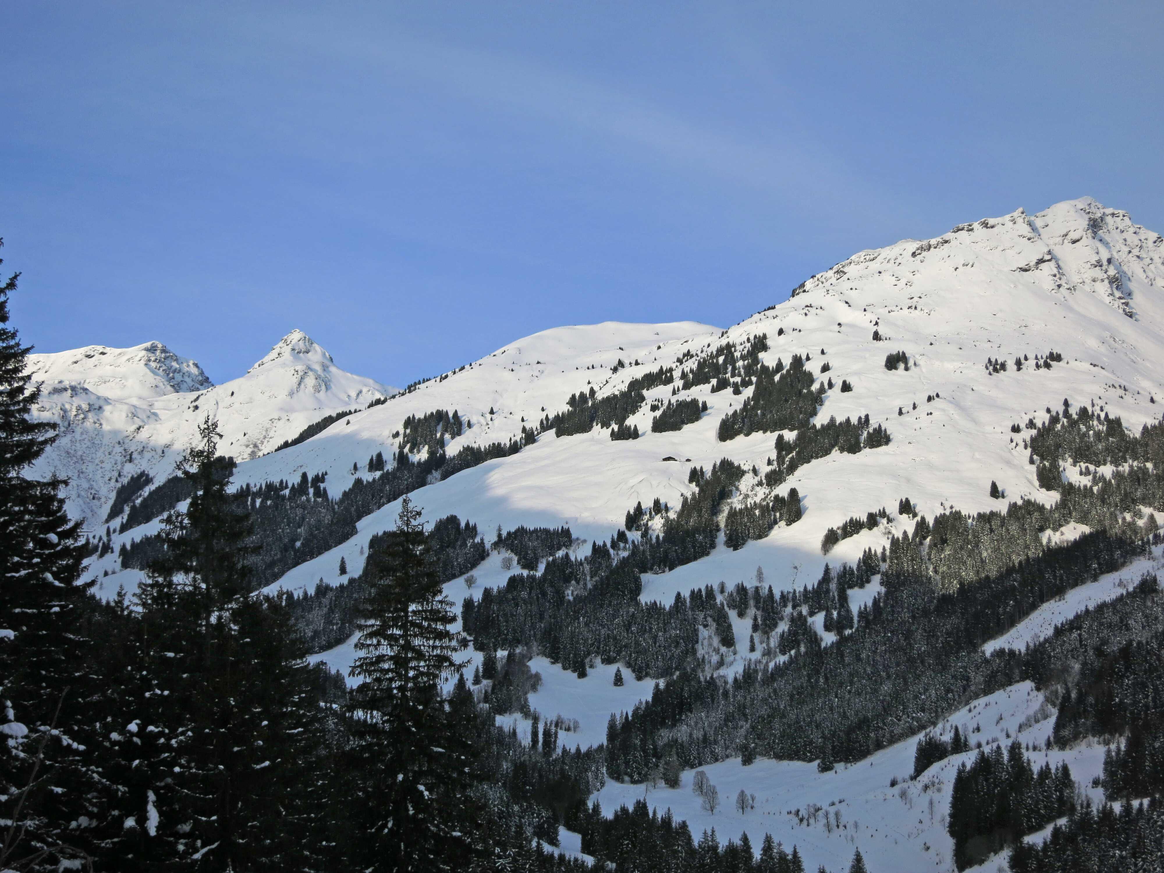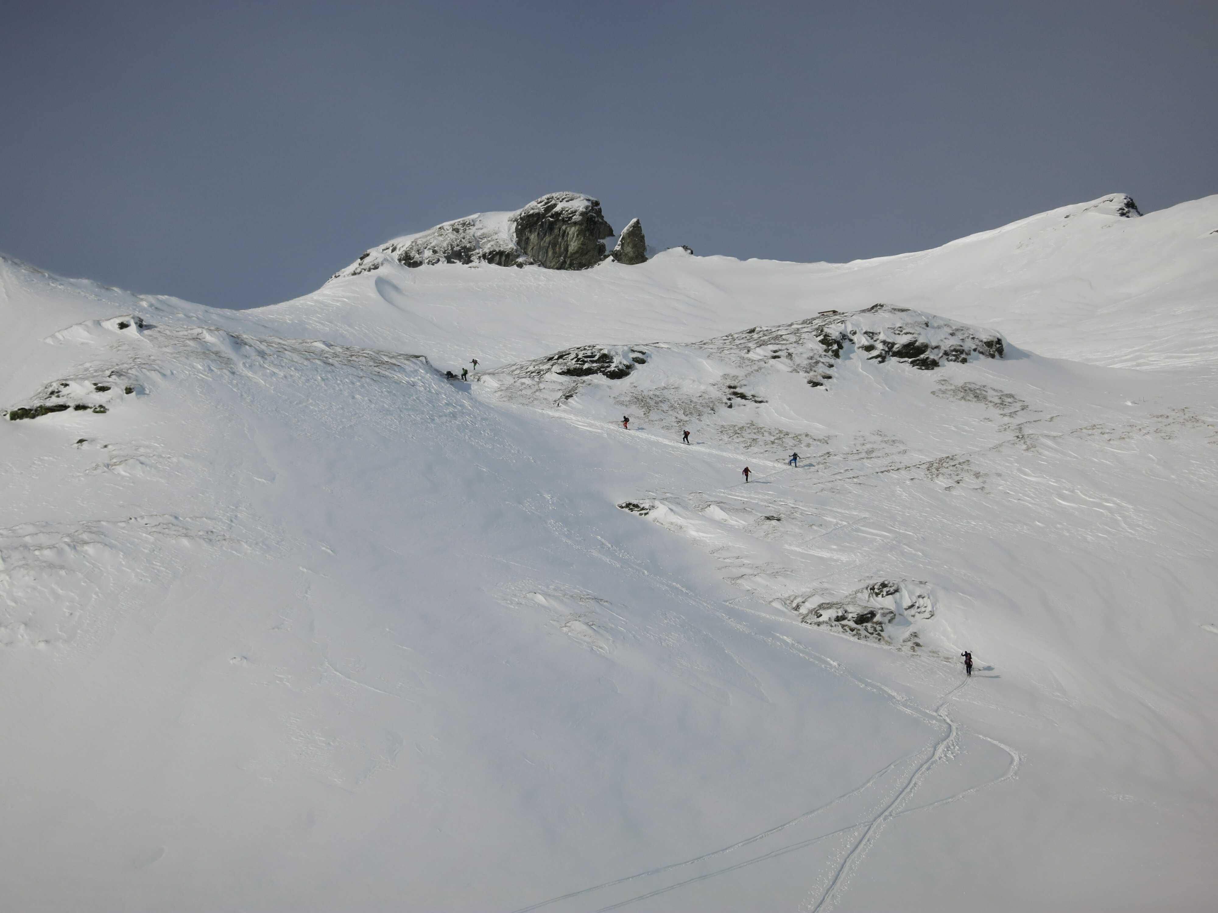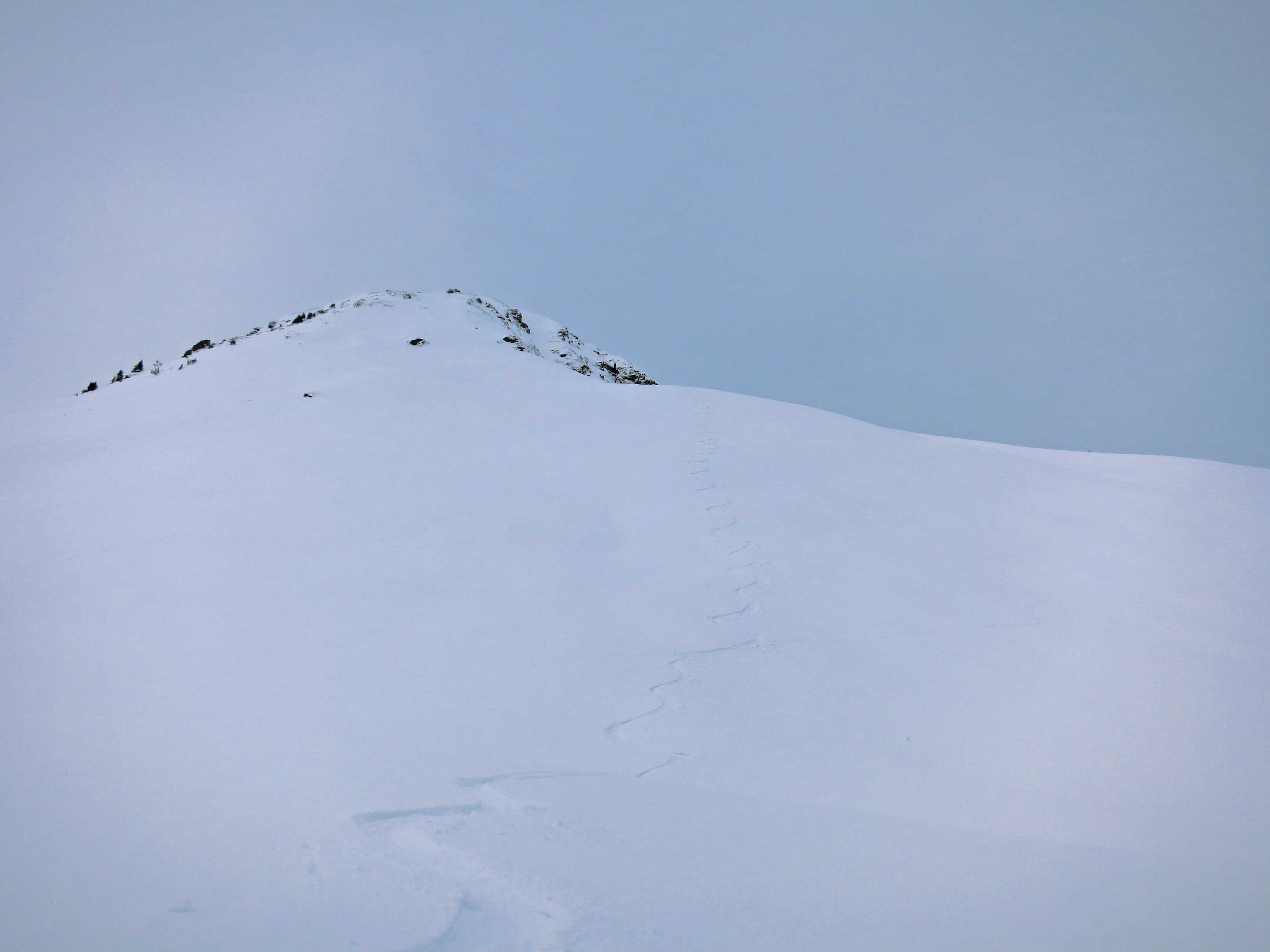 Wetter: Der Wetterbericht hat nicht ganz recht gehabt ! Es war nur in der ersten Vormittagshälfte sonnig, dann überzog es sich und das Licht wurde teils diffus, für die Abfahrt weniger optimal. Oberhalb 1800m z.T. starker Wind aus westl Richtung mit stürmischen Böen (deutliche Schneeverfrachtung); die Gipfelpause fiel dementsprechend kurz aus. Starttemperatur im Tal ca. -8°C, bei Rückkunft am Mittag ca. -2°C.