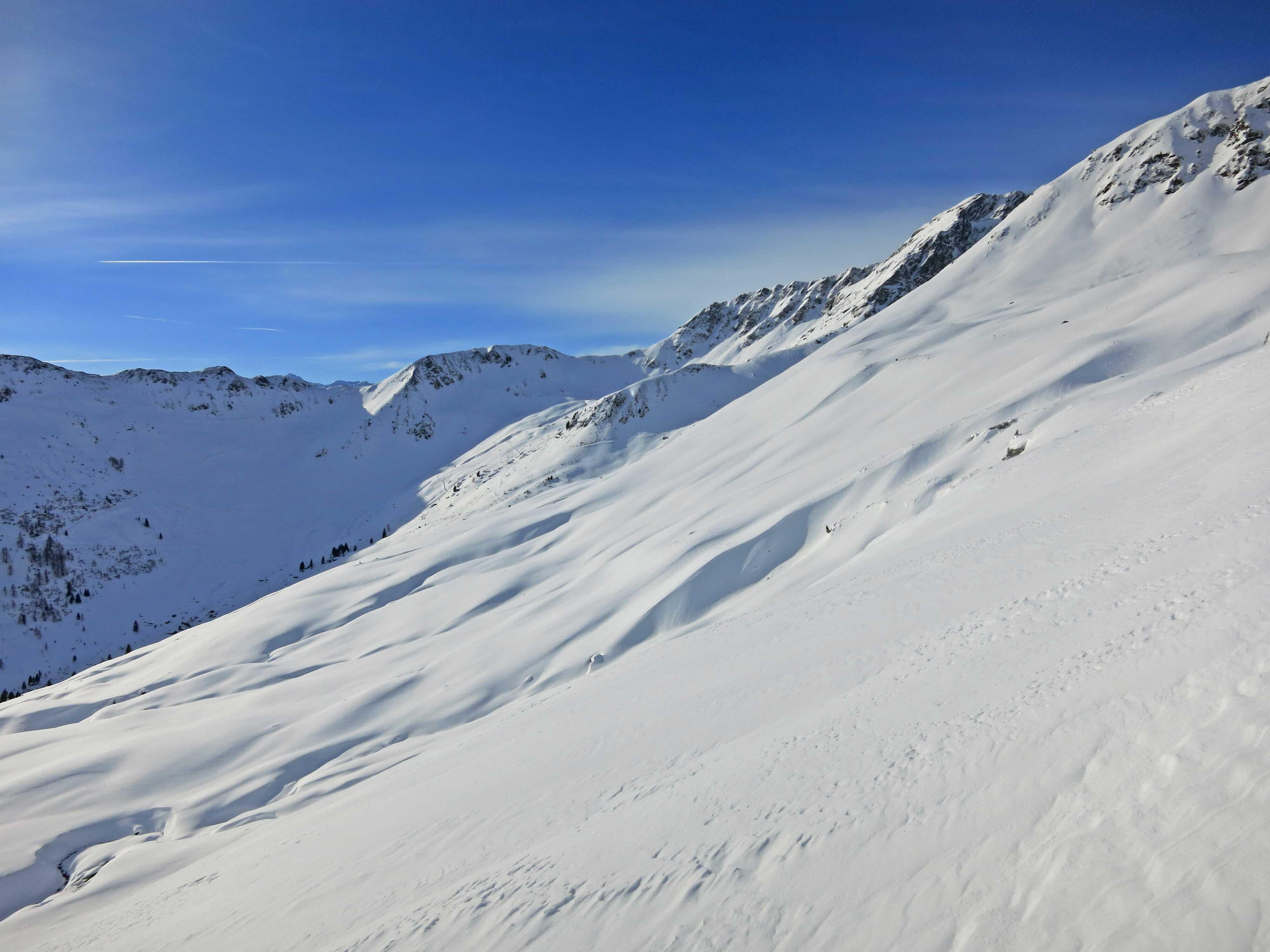Schneelage: Im Tal liegen ca. 30-40cm pulvriger Schnee, oberhalb der Saalhofalm recht ungleichmäßige Schneehöhe durch Windeinfluss, Gipfelhang stark windbeeinflusst/verblasen und meist Pressschnee; Abfahrt in den hinteren Vogelalmgraben zur Zehetneralm in schönstem Pulver ohne nennenswerte Untergrundkontakte.