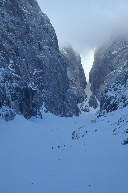 Finaly a short tour at home. According to the weather forecast, Jalovcev ozebnik (couloir) was a good choice. It never has sun anyway. Prking in Planica valey was full of workers. They are getting it ready for Final Ski Flying 2015 nex weekend. In the morning there was even some sun above Jalovec, but soon drowned in clouds. Icy frozen road to Tamar and a snowy path through the forest. Lots of ski tourers ahead, but mostly rather slow. Most of them turned to Kotovo sedlo. Snow was hard but not frozen. Under the couloir I put skis on my rucksack and crampones on my shoes. Exit was totaly cloudy, there were two Croatians (friends of Anita from Sonnblick) and a Slovenian guy. Skiing down was great. No ice on the entrance, no stones in the channel. Only hard griffig snow. After couloir I have decided to go and check conditions on Kotovo sedlo. Well, it would be better not to. The terain was exposed to the sun in the last days, but yesterday it remained cloudy and frozen. Skiing was a mixture of all difficult snow types. But only until I reached couloirs line. Down to the valey pure joy again.