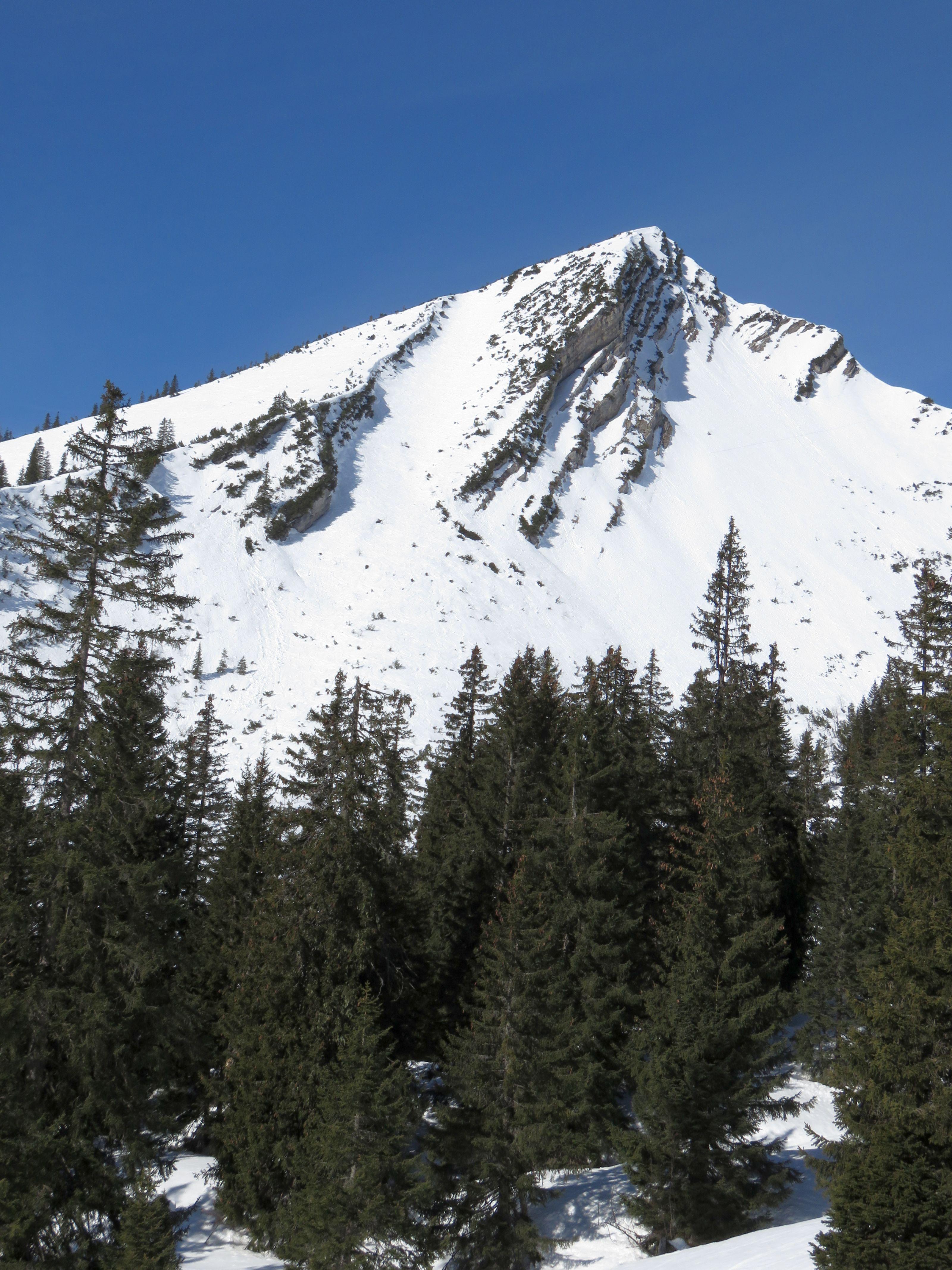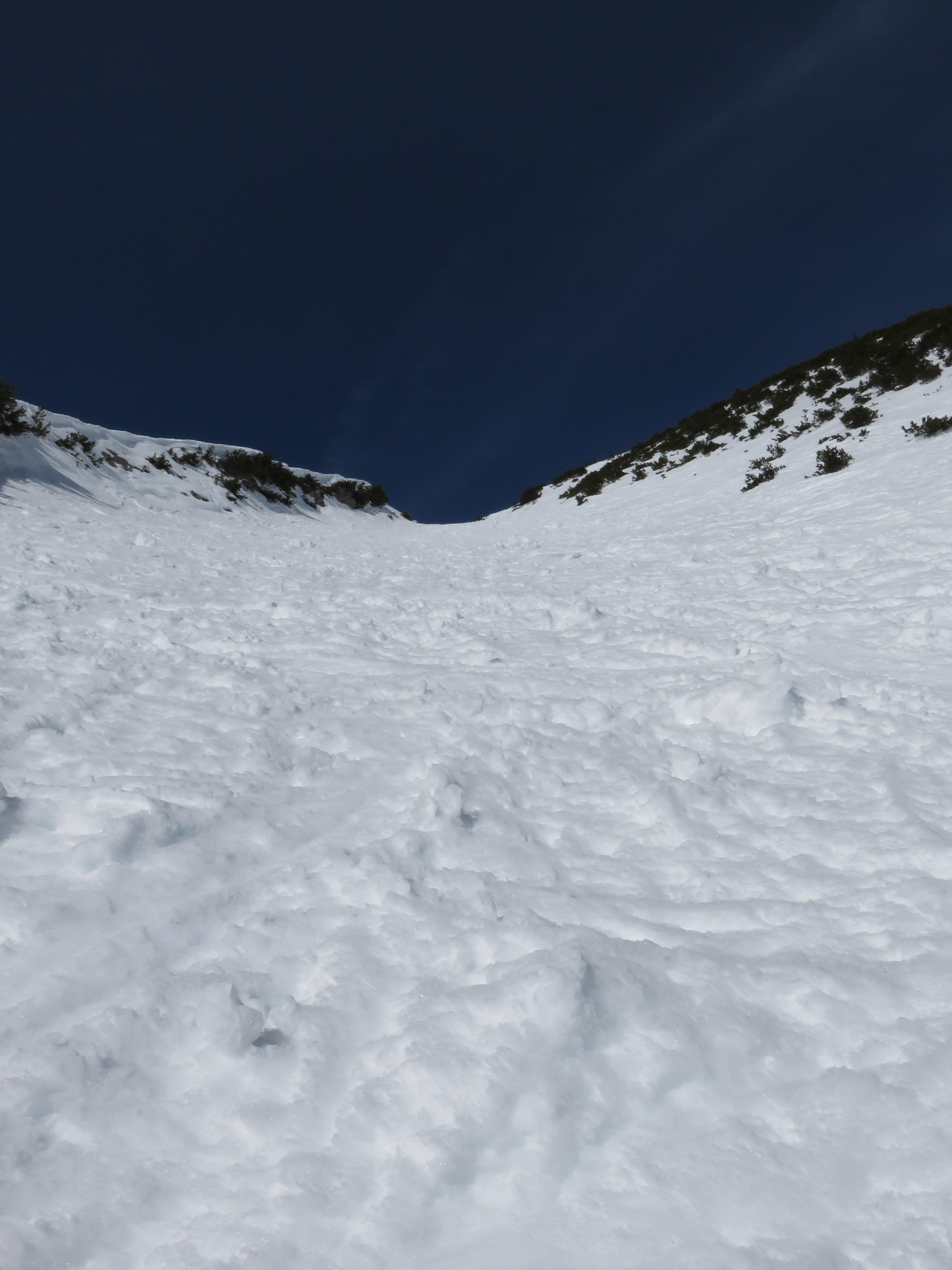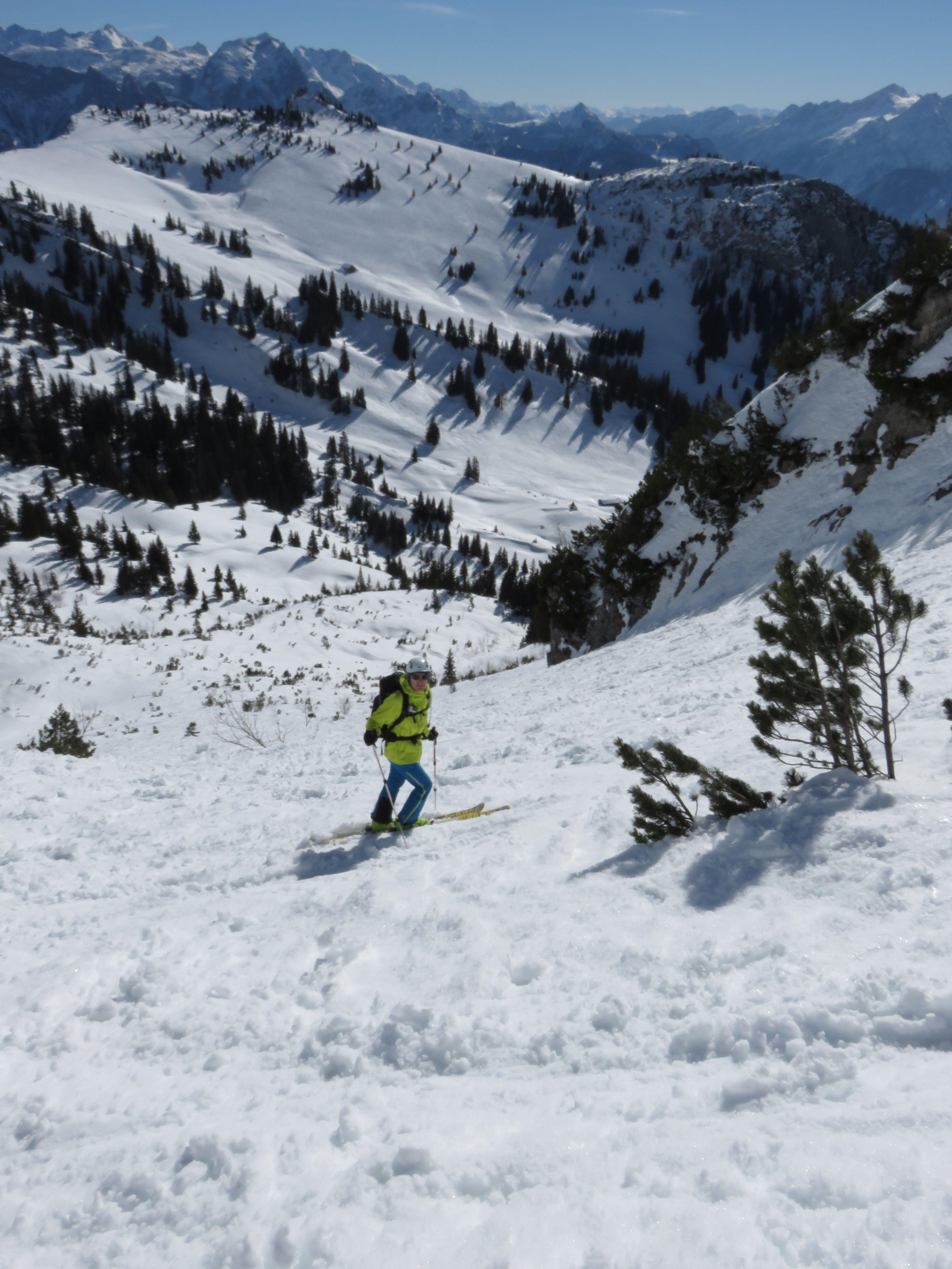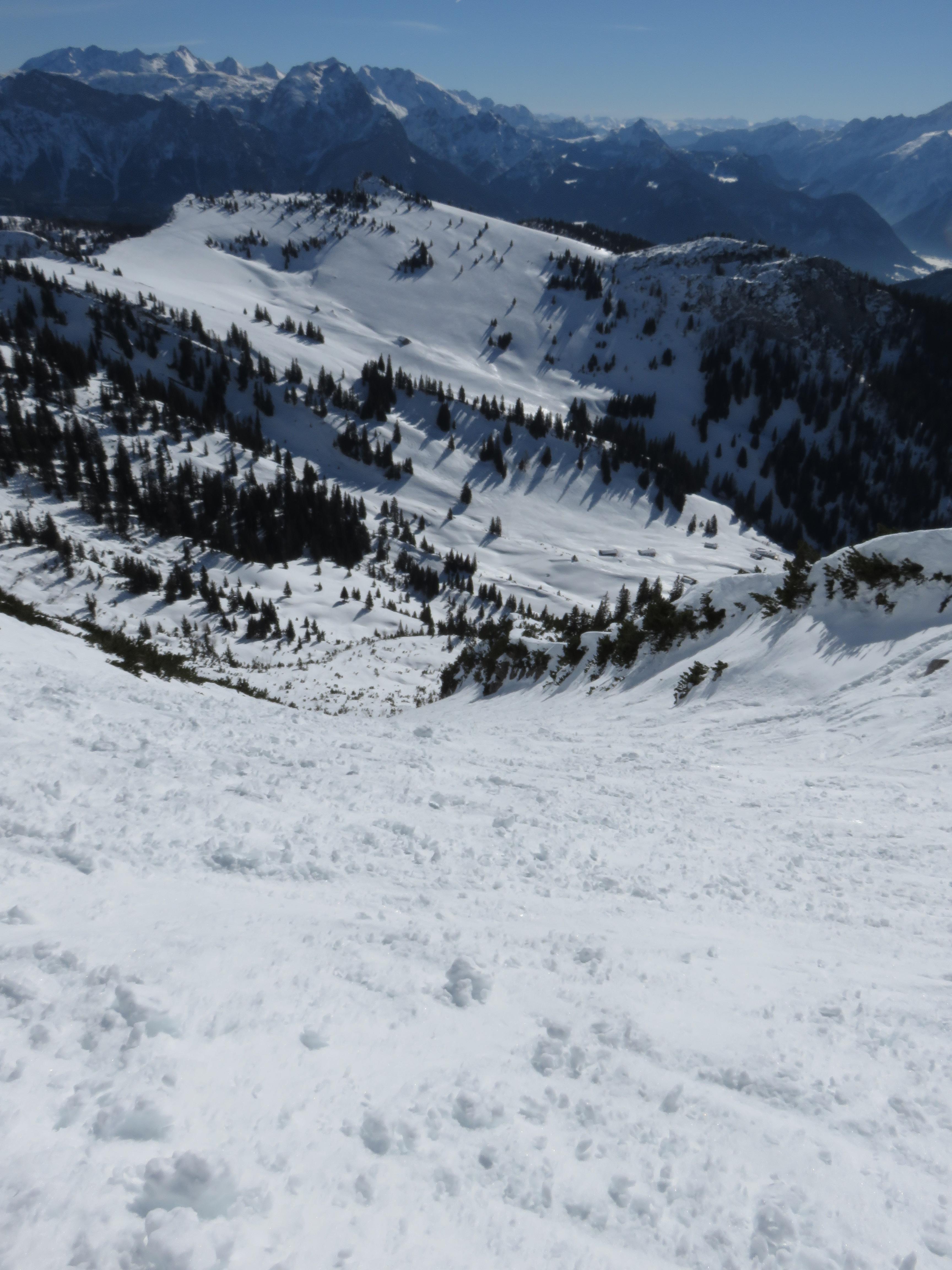 Vom Heutalbauern über die Hochalm aufs Hirscheck. Abfahrt durch die Reifelrinne um 12 Uhr Schnee weich die alten Spuren und Knollen störten nicht.