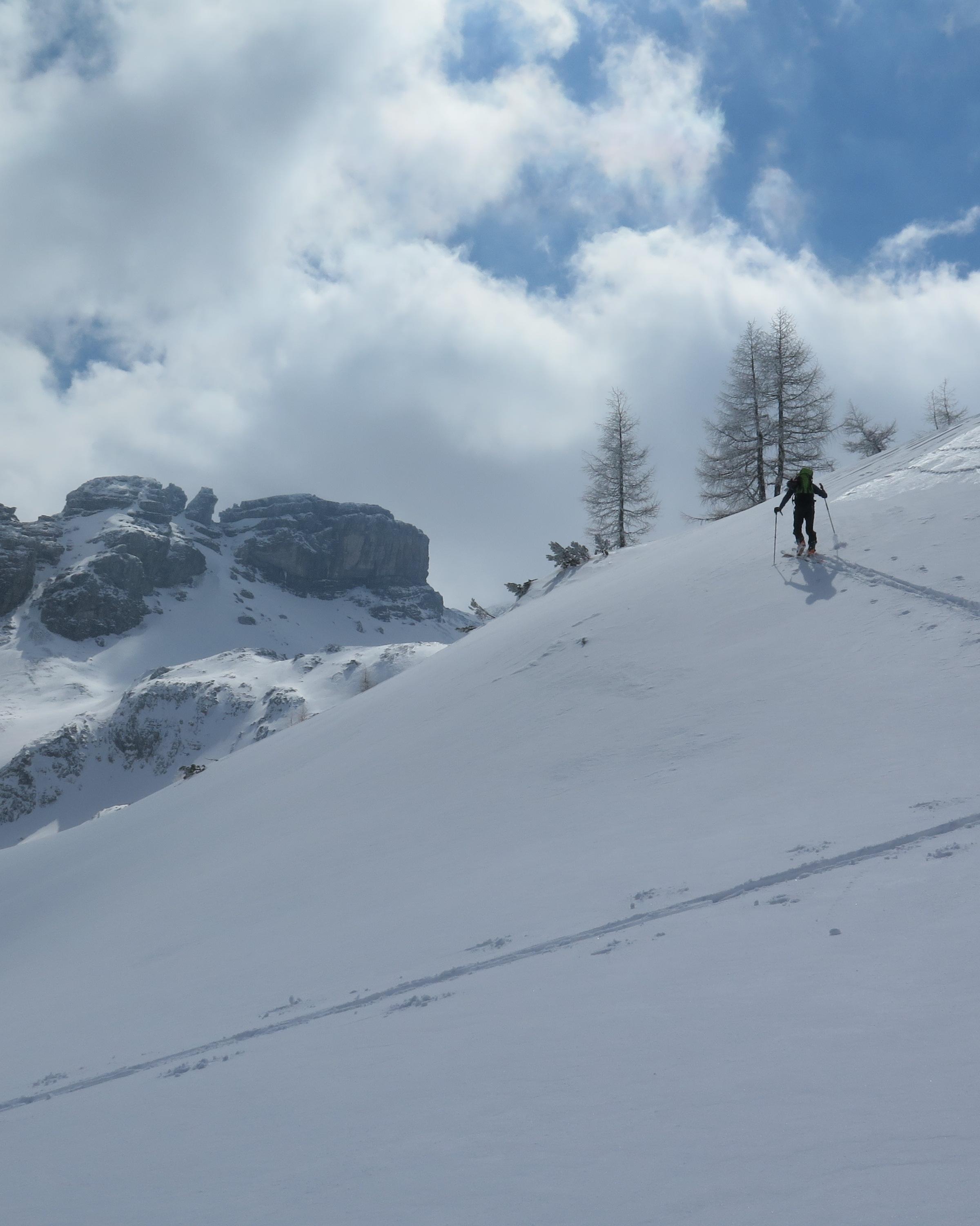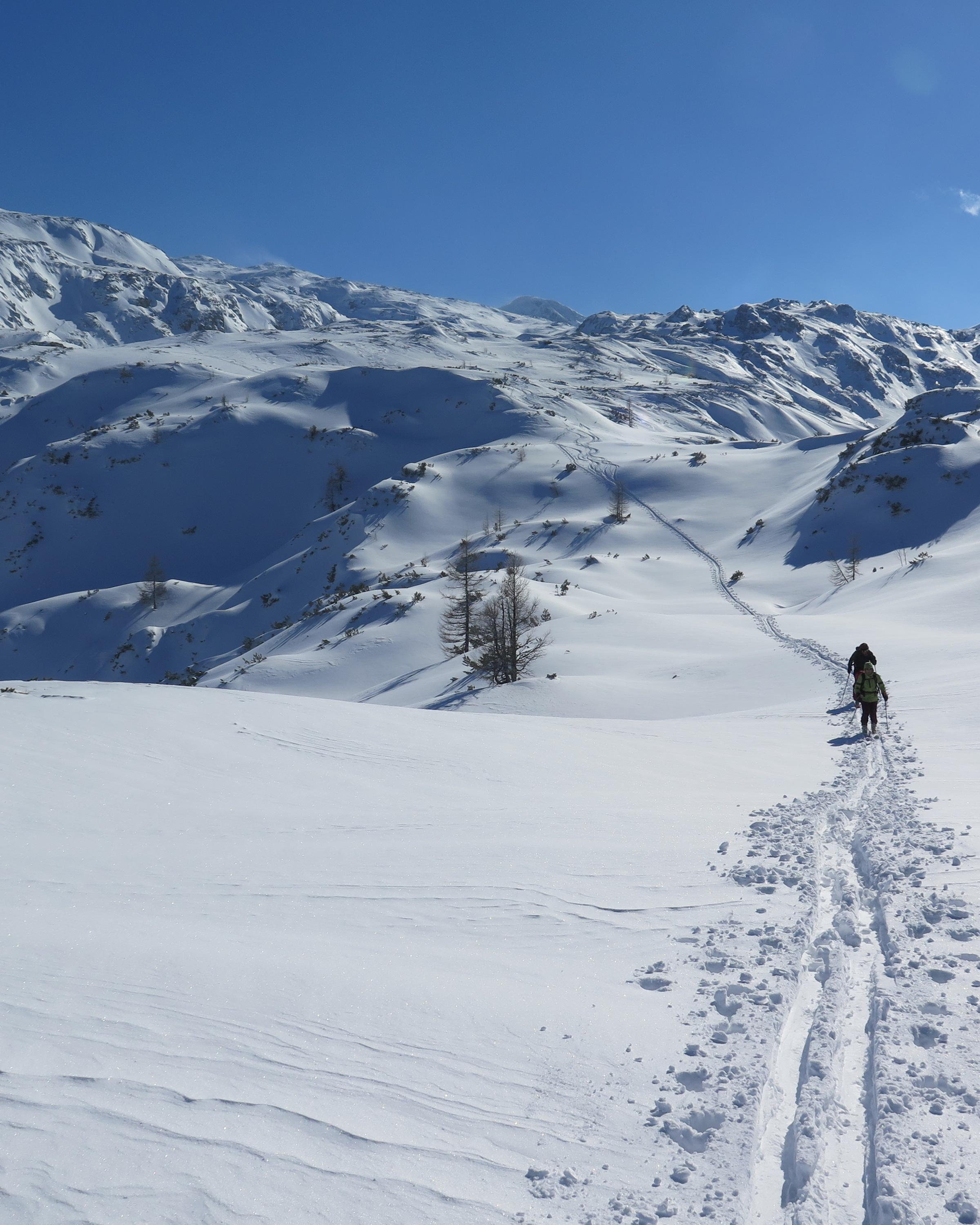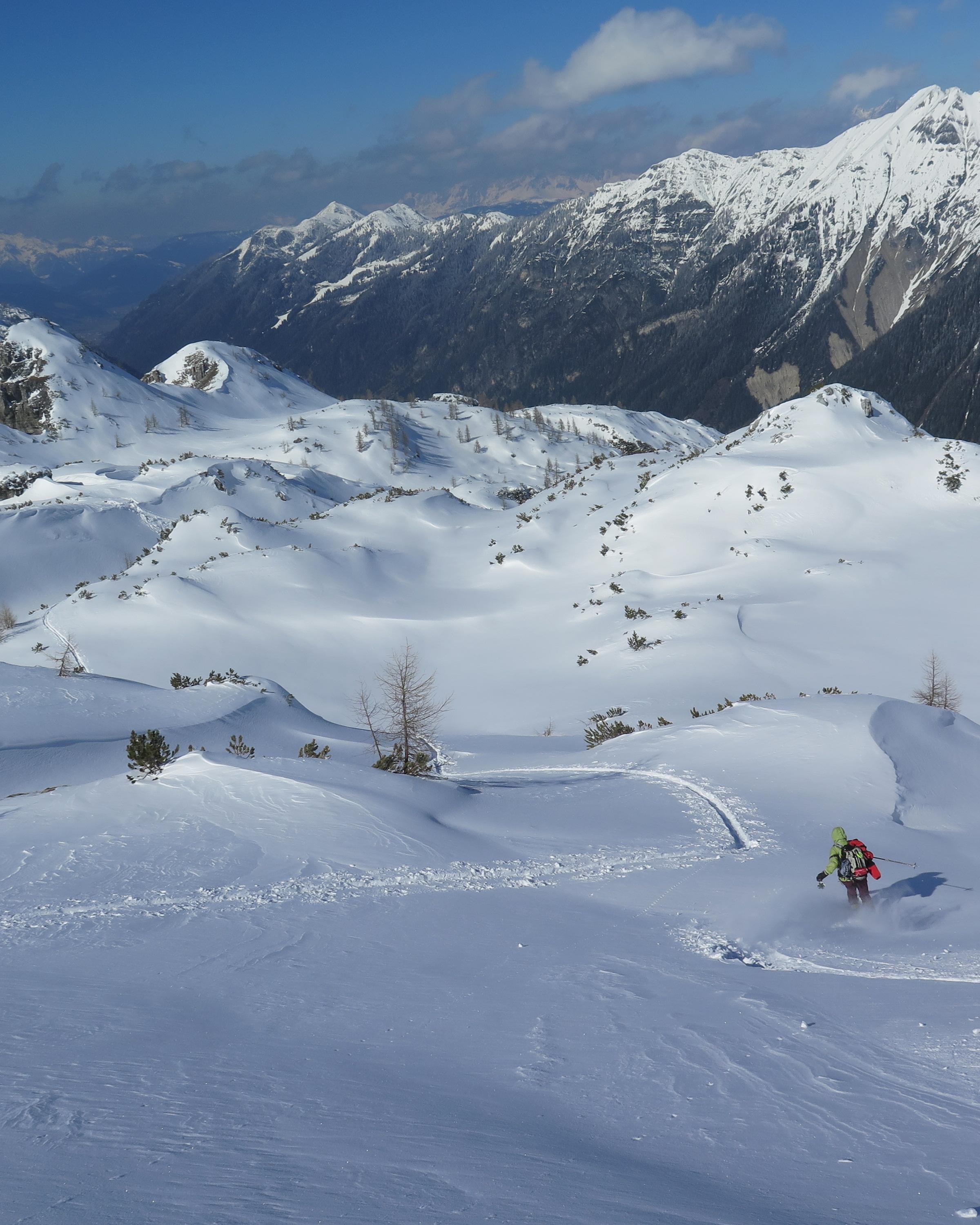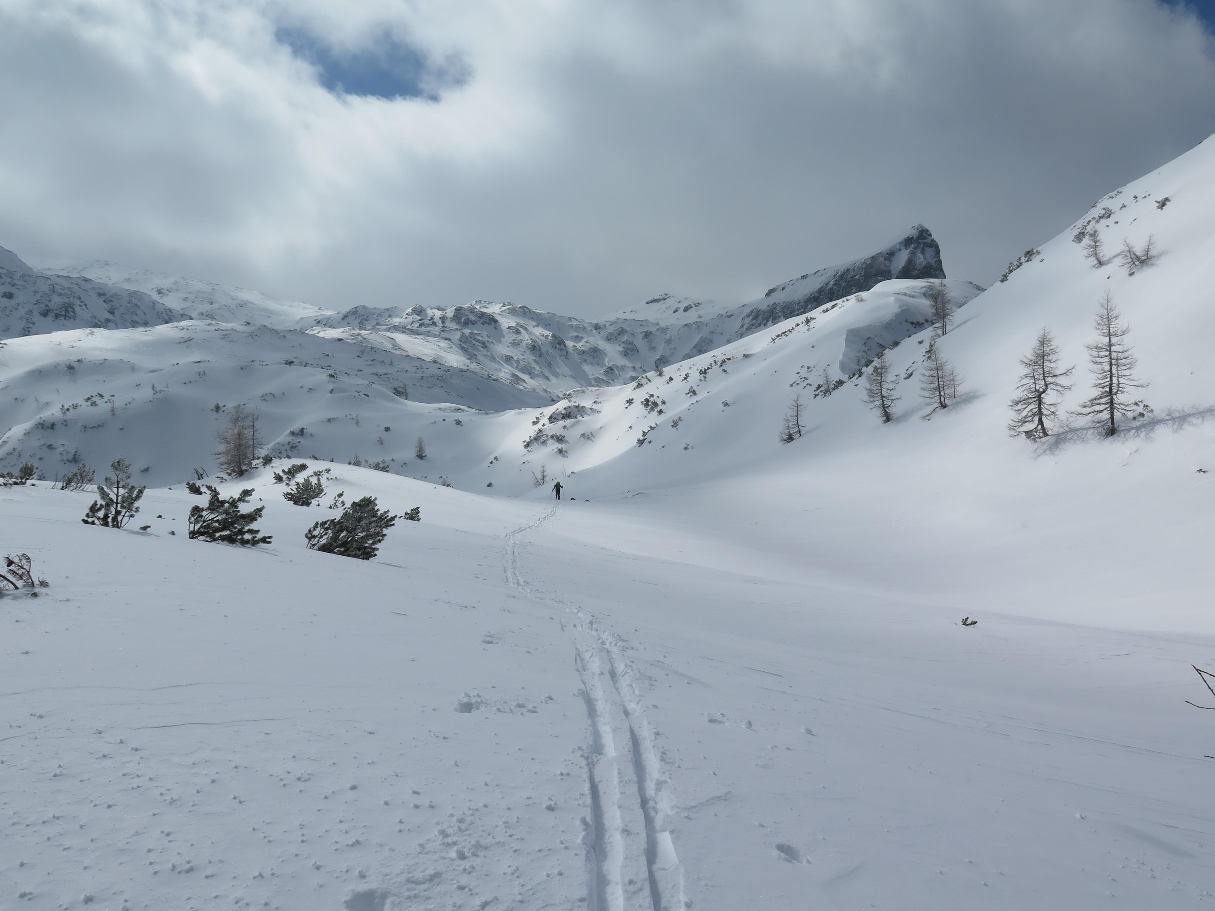 Radstädter Tauern.Aufstieg vom Tauern N-Portal über obere Gasthofalm und weiter über das Gasthofkar.Wetter zunehmend sonnig,Neuschnee ca 15-20cm,im Waldbereich angefeuchtet,oberhalb Pulvrig,auf der Hochfläche des Gasthofkares teilweise Windgepresst,bis zur Waldgrenze schöne Pulverschneeabfahrt, im Gipfelbereich lebhafter Wind.