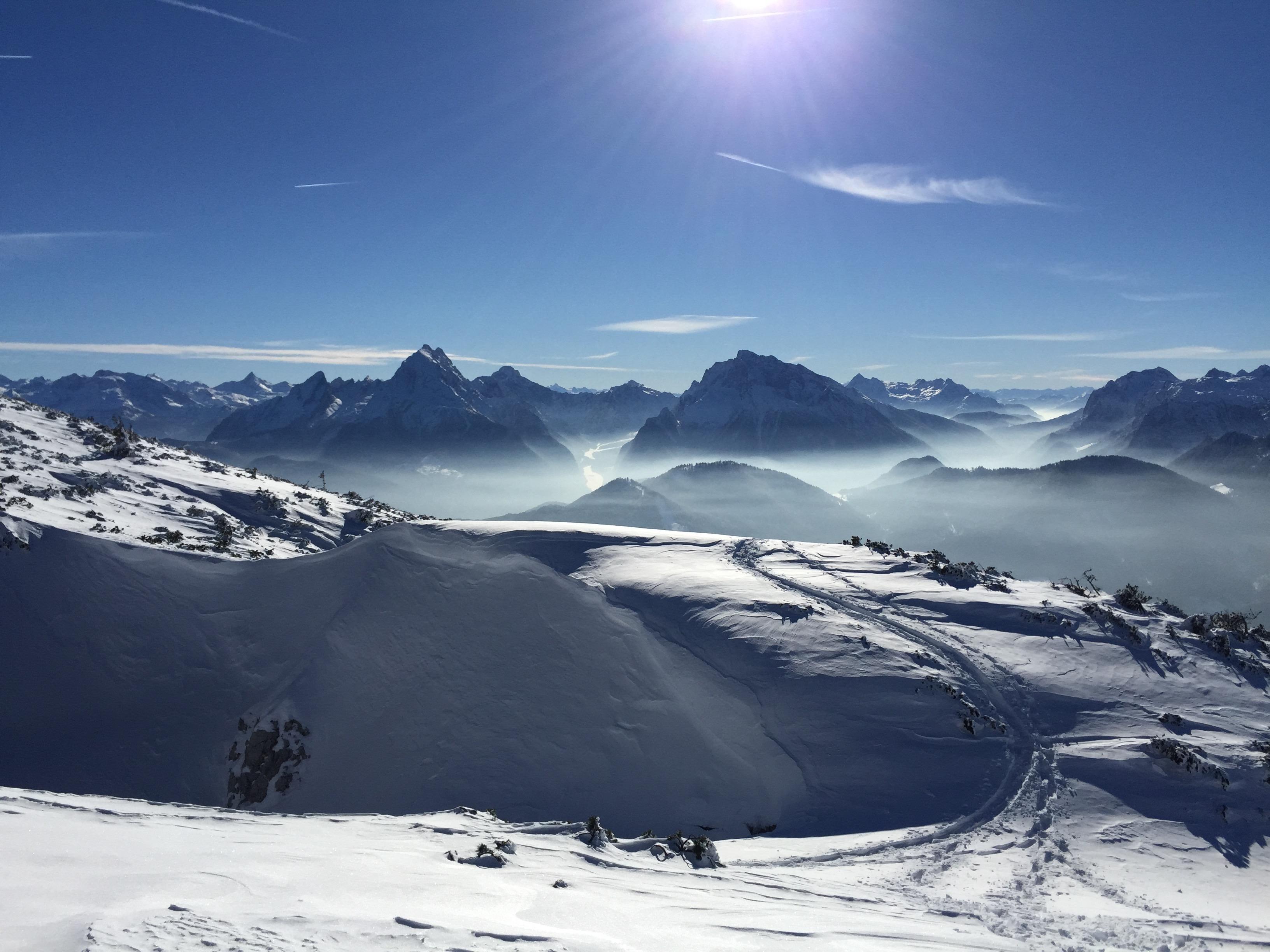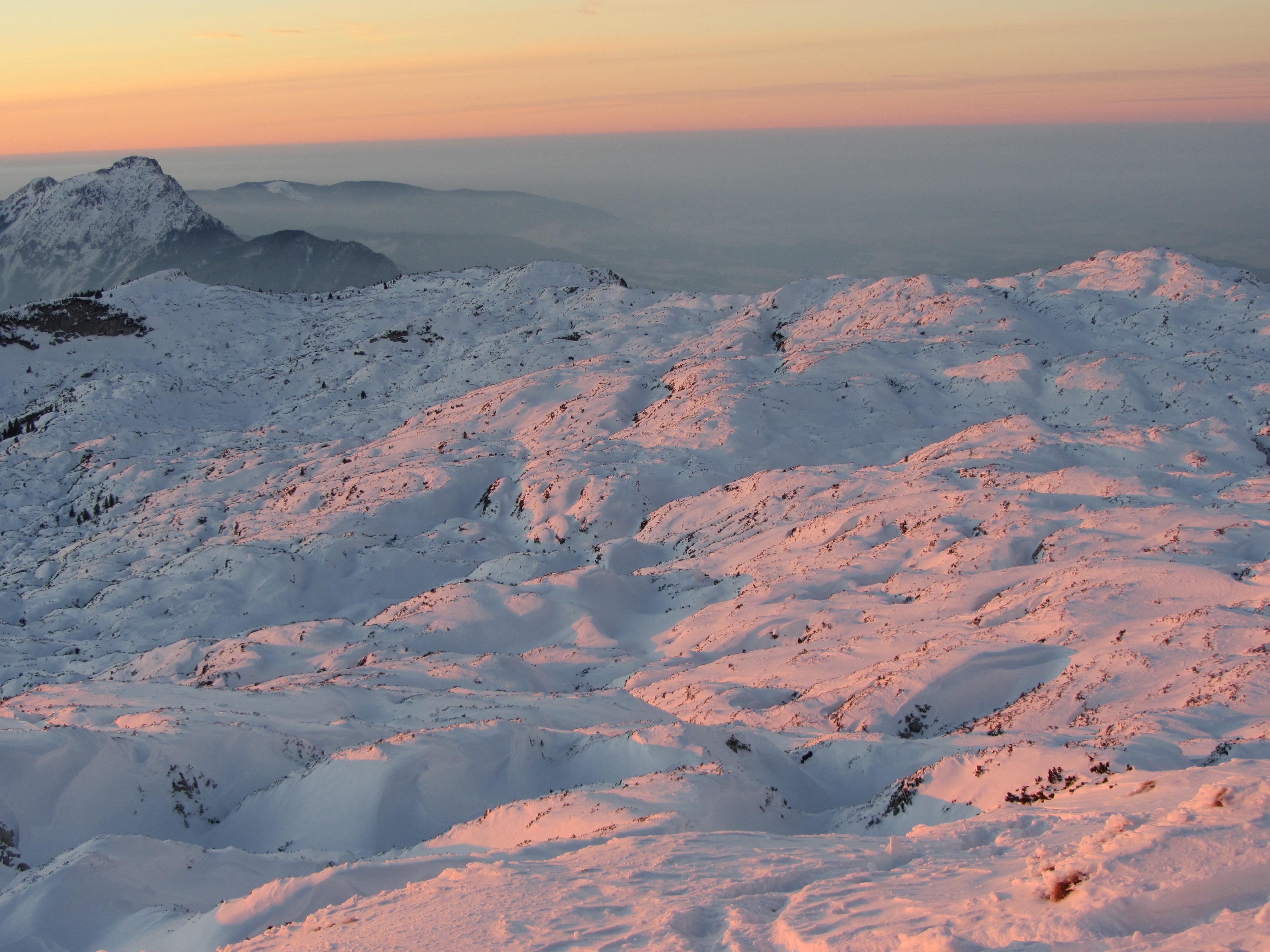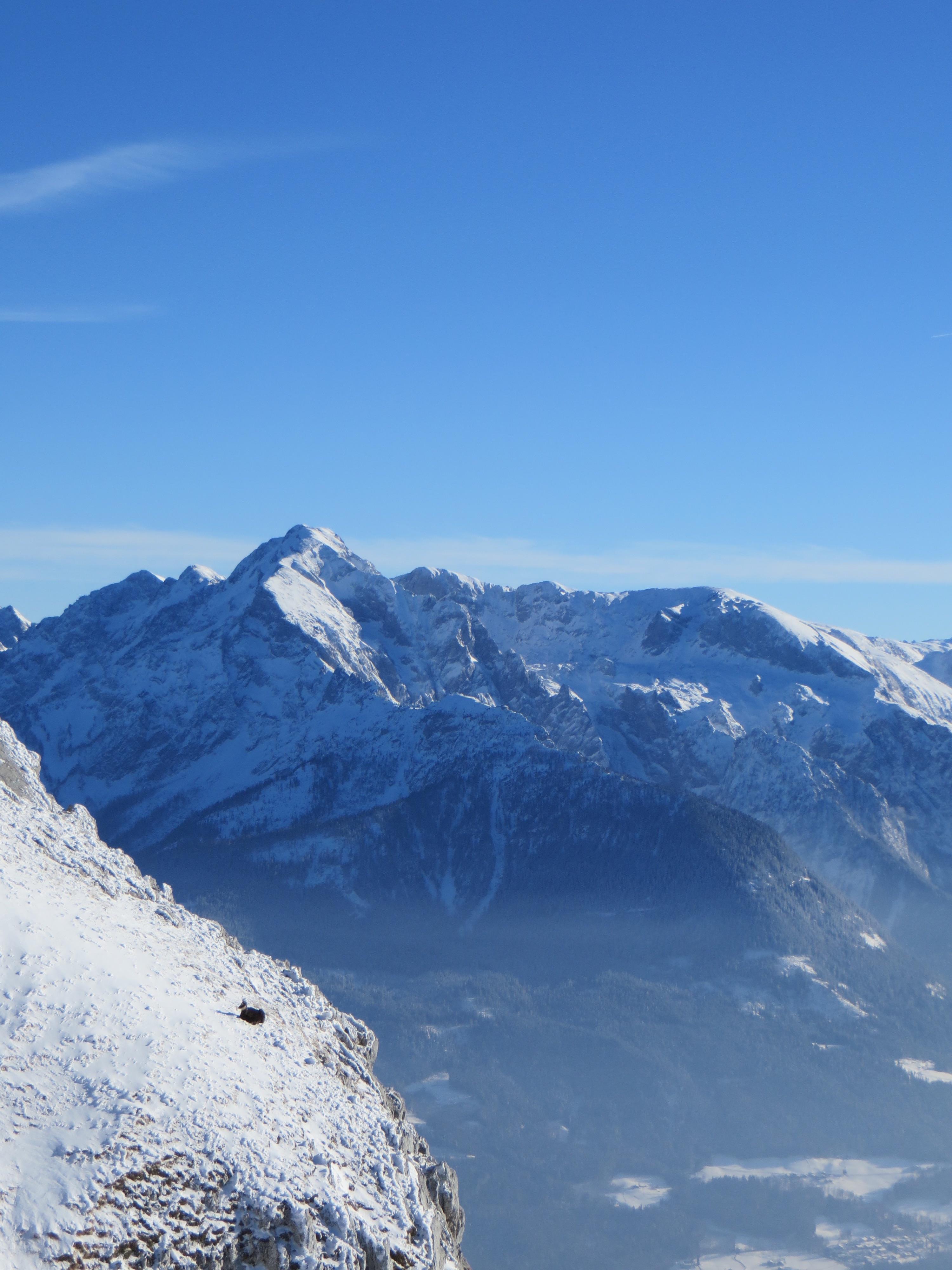 Von Hallthurm über Gamsgericht, Reisenkaser und Stöhrhaus der von Vor-Gehern offenbar mühsam angelegten Schneeschuhspur dem Sommerweg folgend auf den Berchtesgadener Hochthron. Nach dem Start in Wolken dann prächtig-sonniges Wetter bei Temperaturen durchwegs ein paar Grad unter 0 mit bestem Blick in alle Richtungen und wahrhaft phänomenaler Aussicht, der Schnee überall pulvrig und am Plateau oben besonders im Bereich der Latschen eher von geringerer Mächtigkeit. Keine Beobachtungen zu Lawinen oder irgendwelchen Gefahrenzeichen.